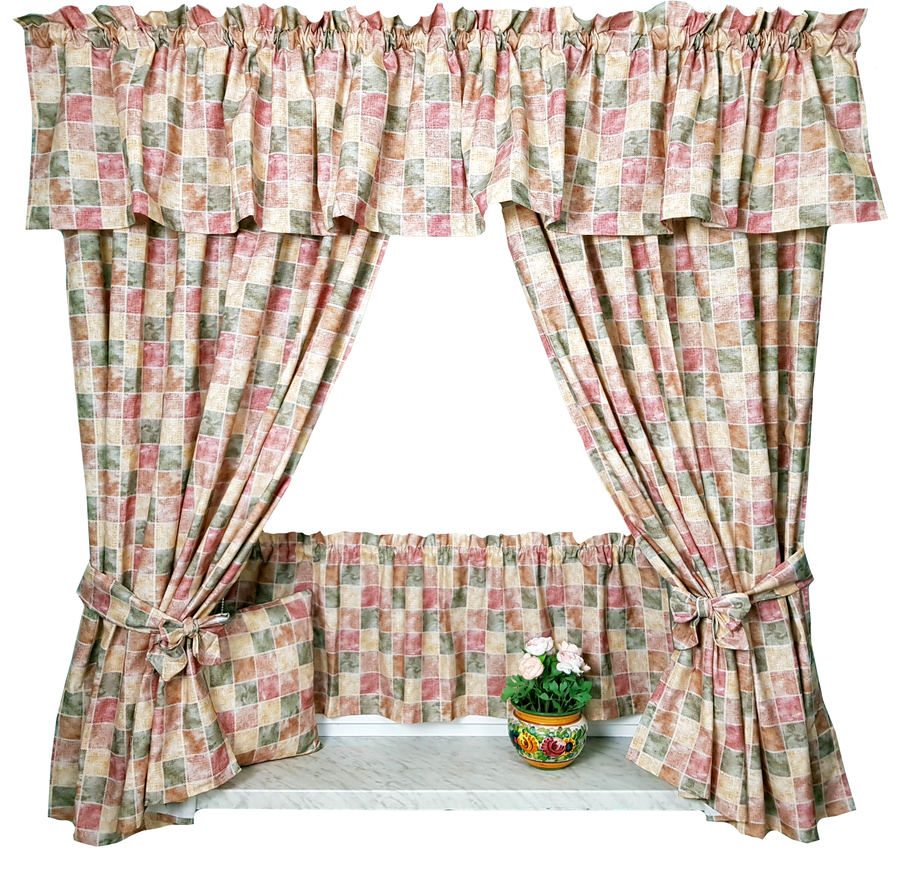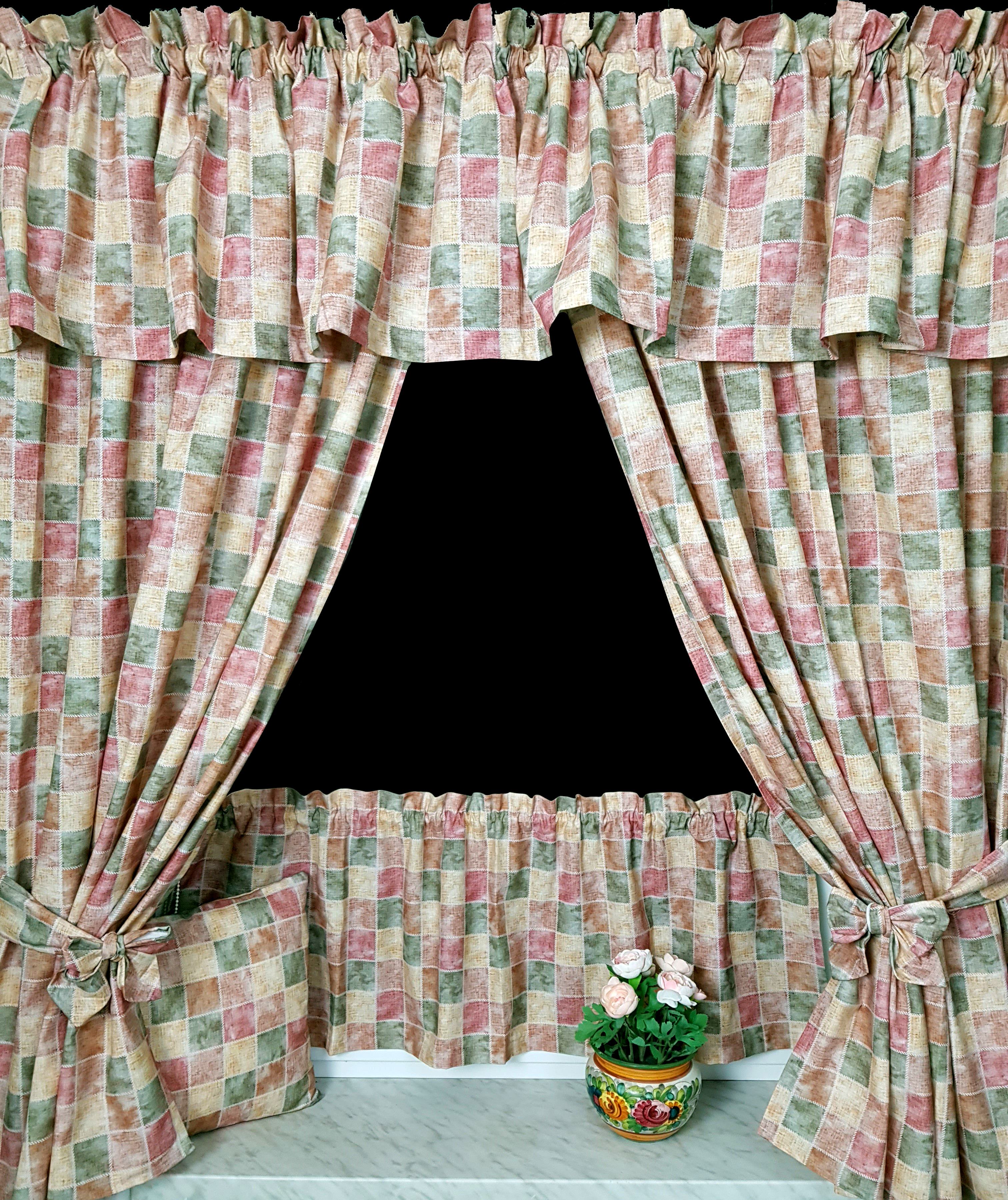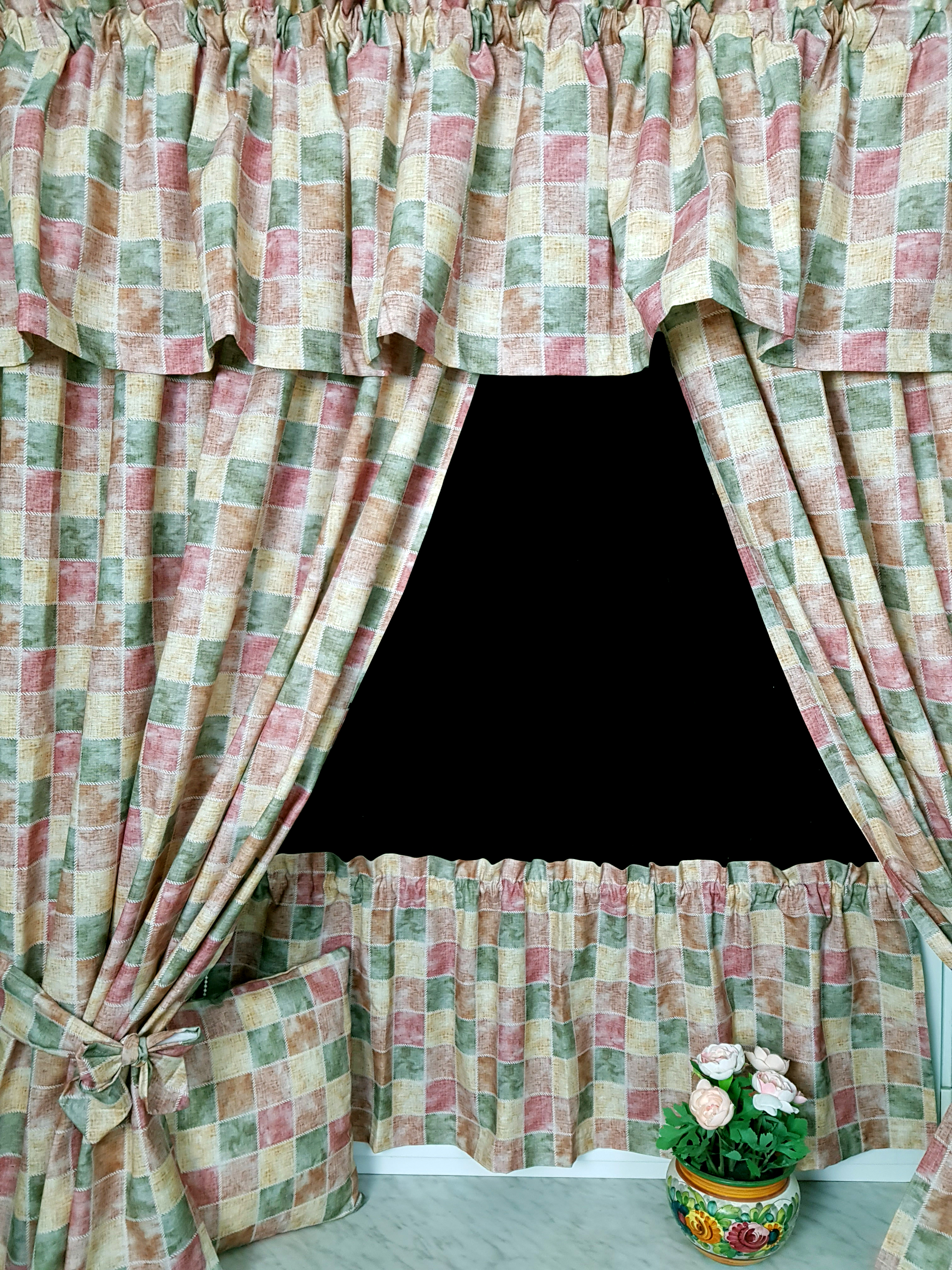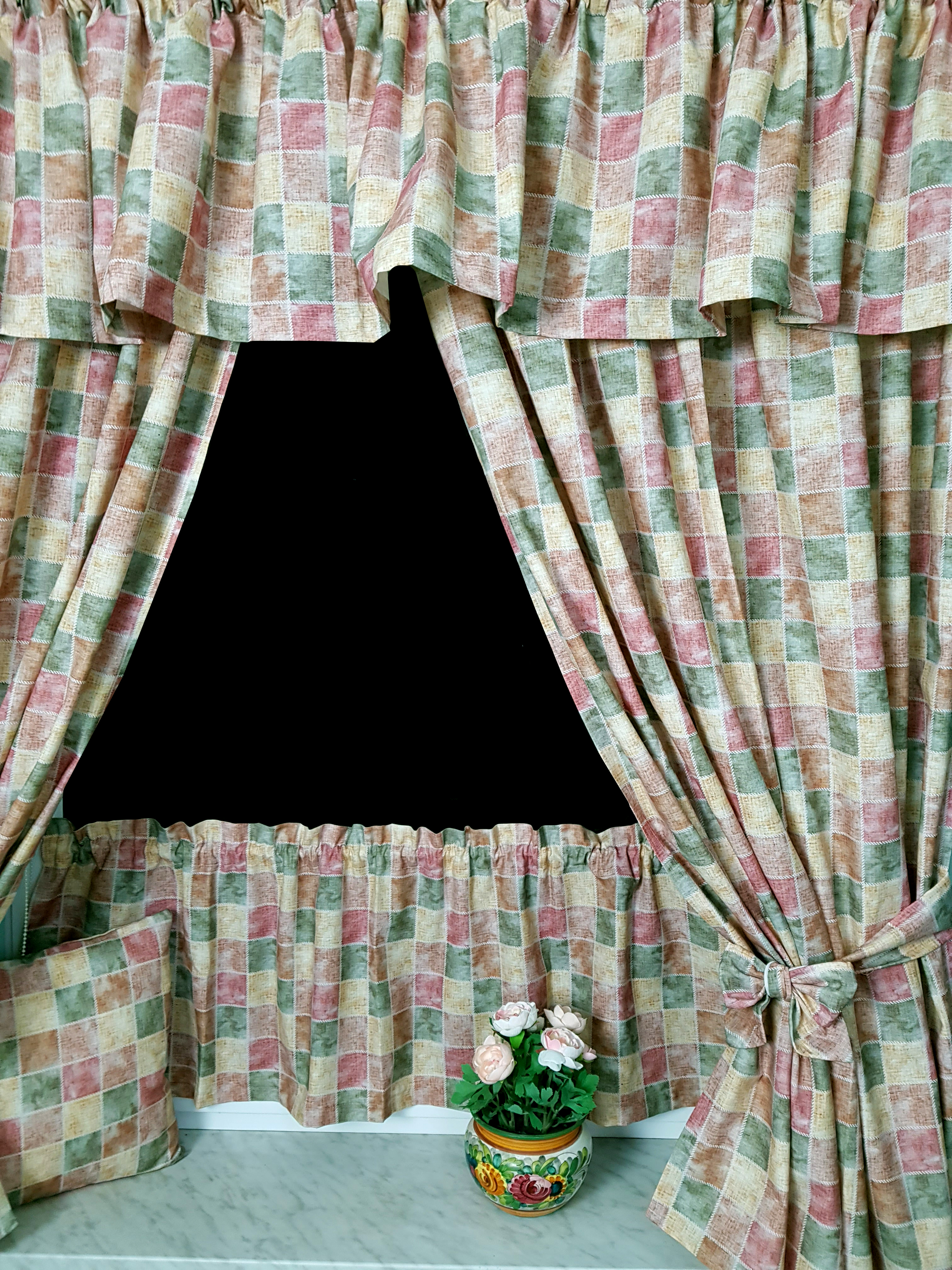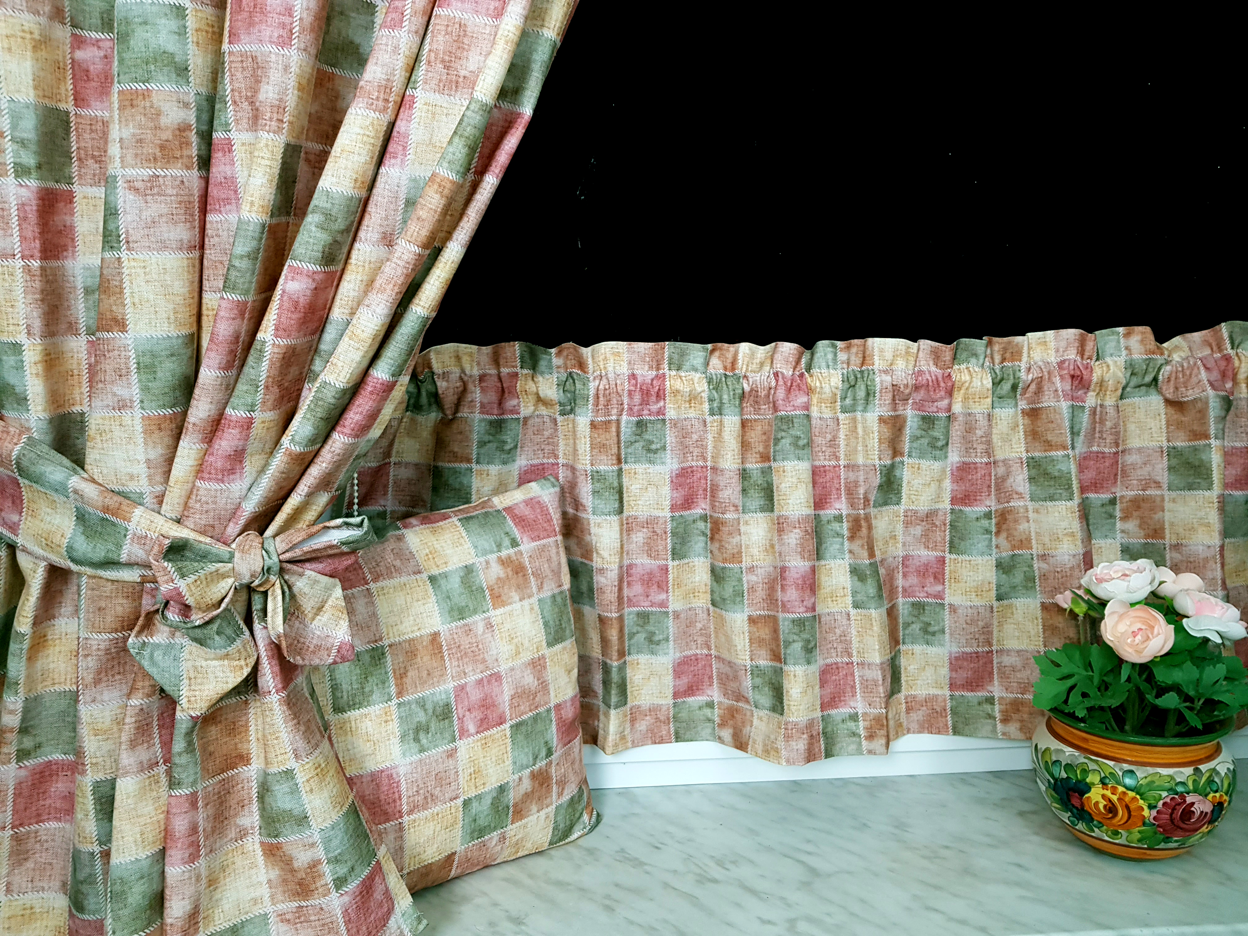 Komplet to 2 sztuki zasłonek oraz wstążki do wiązania zasłonek plus lambrekin i zazdrostka.