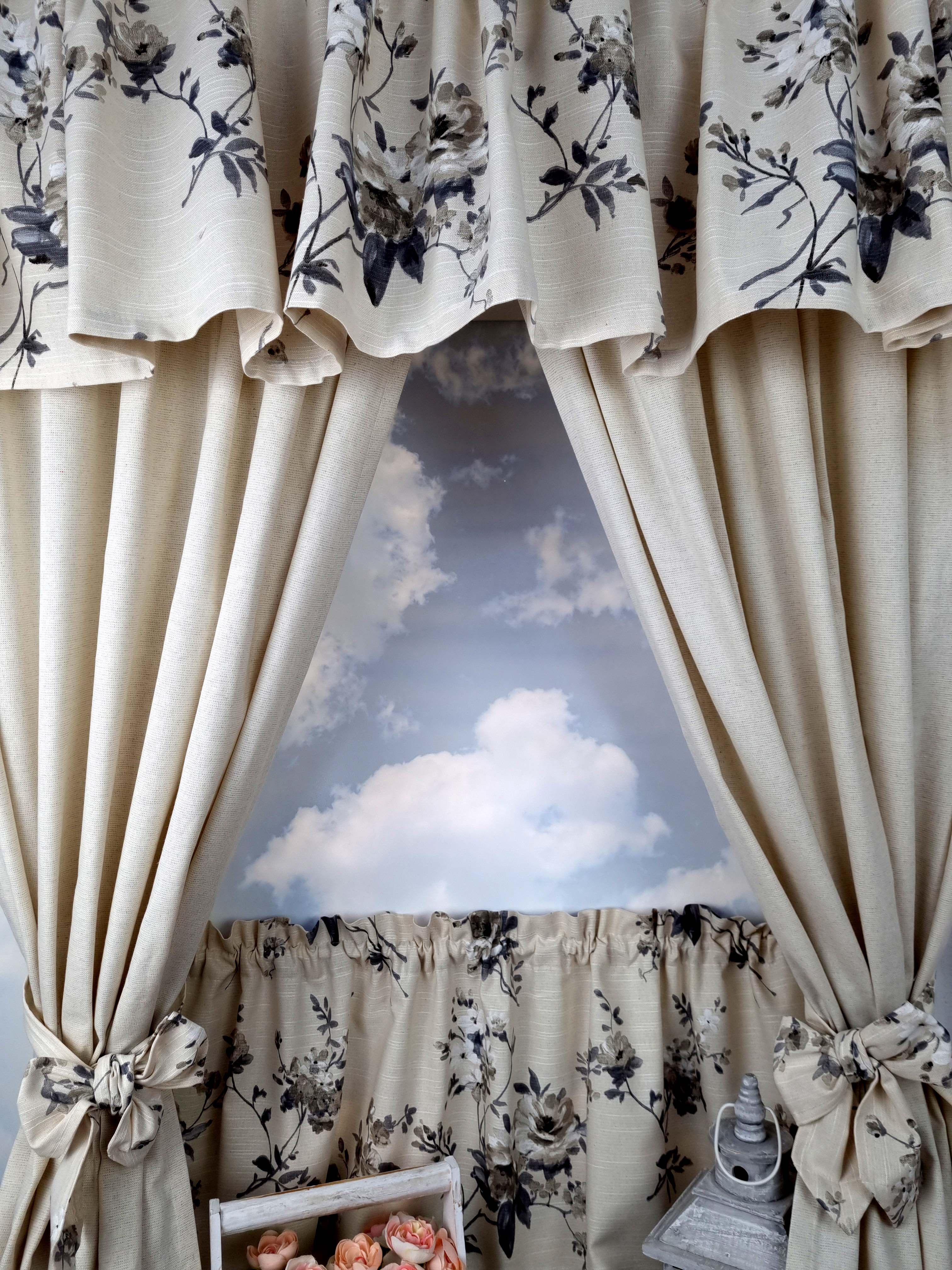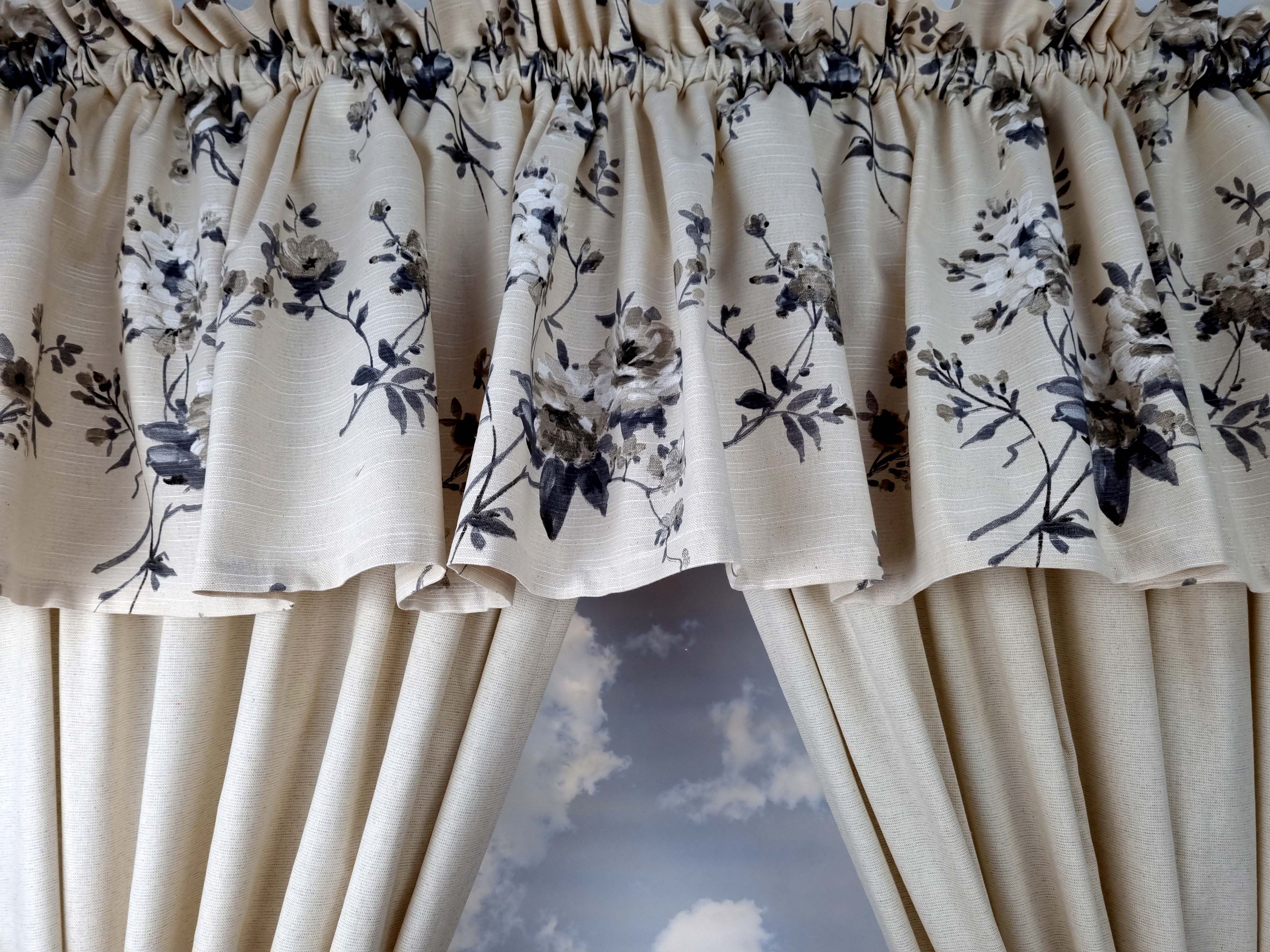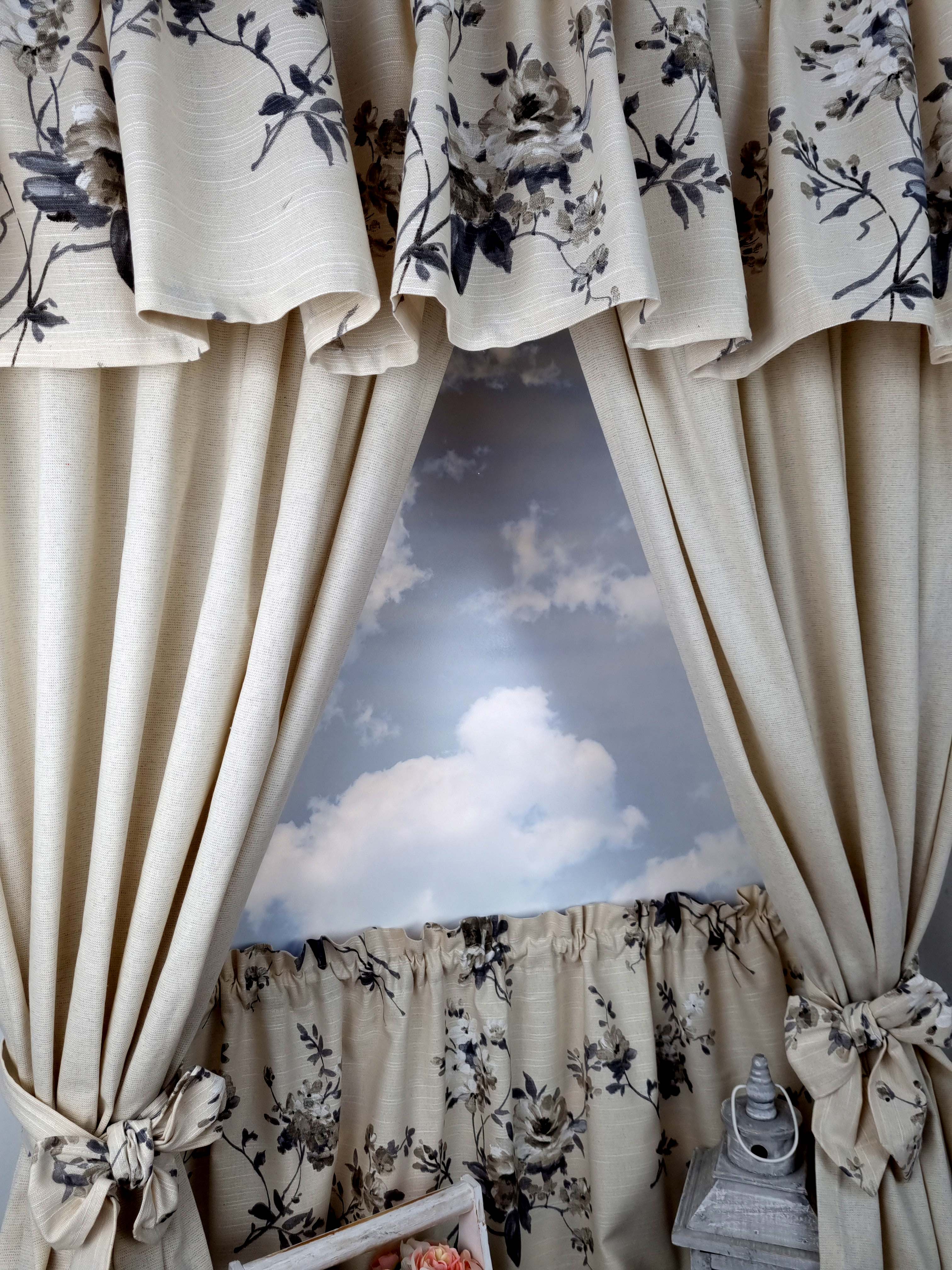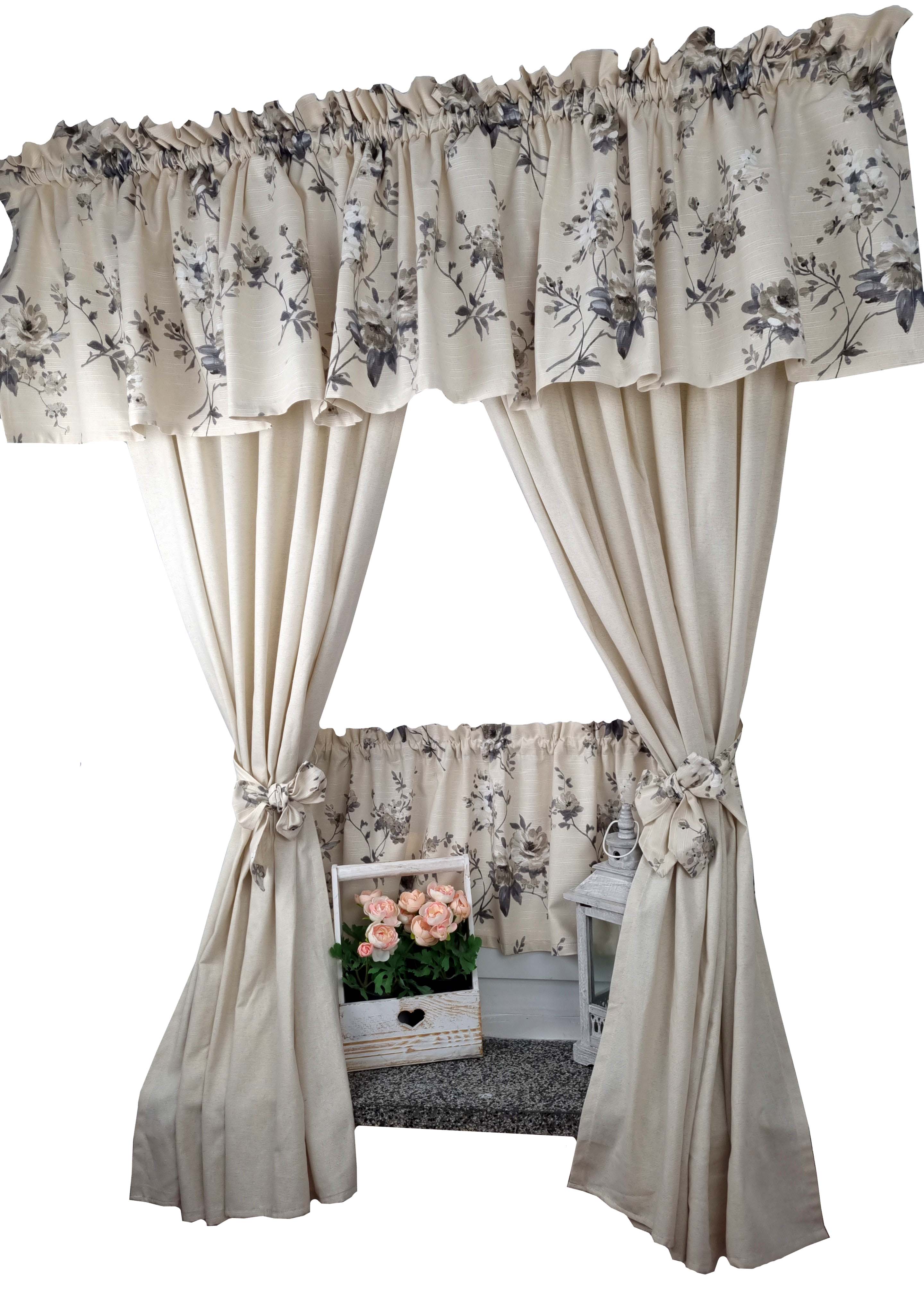 Komplet to 2 sztuki zasłonek oraz wstążki do wiązania zasłonek plus lambrekin i zazdrostka.