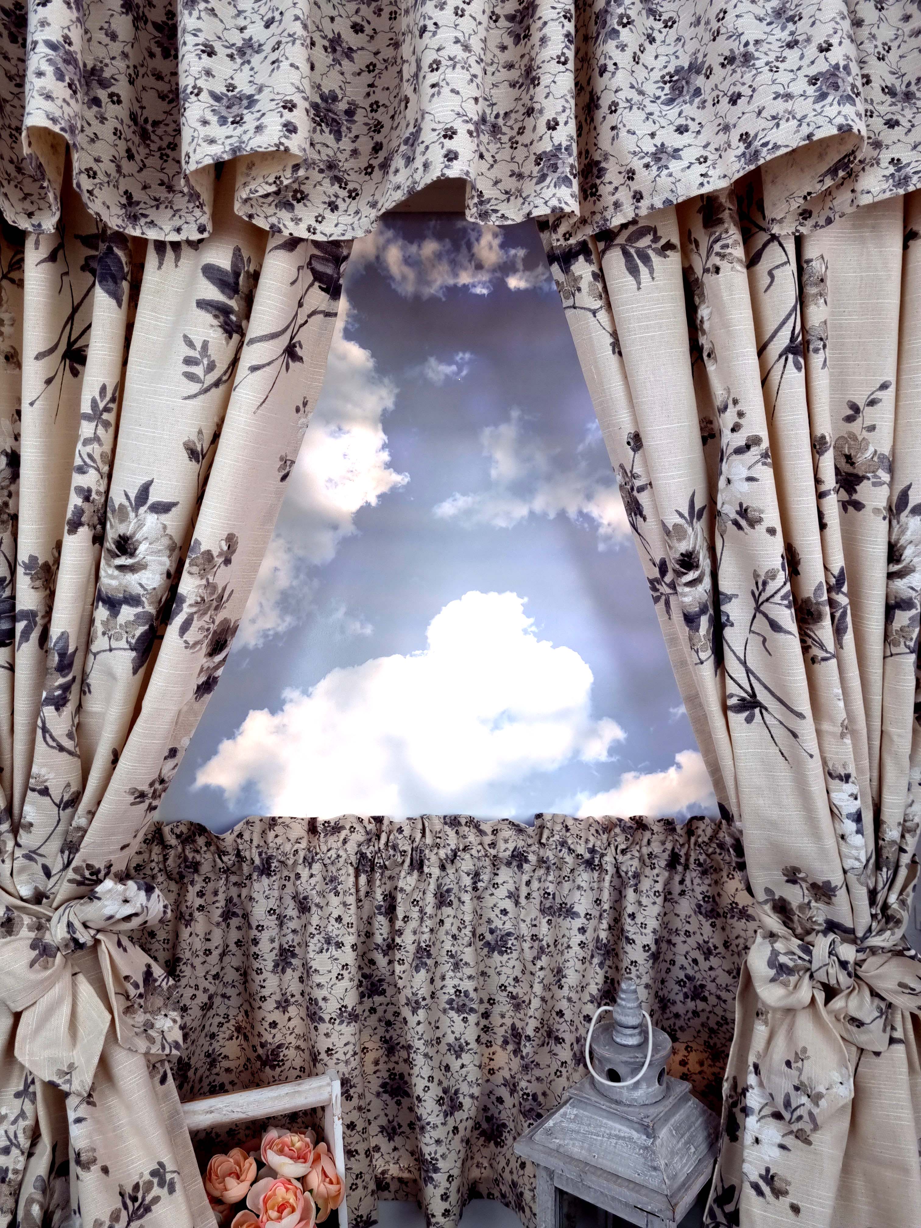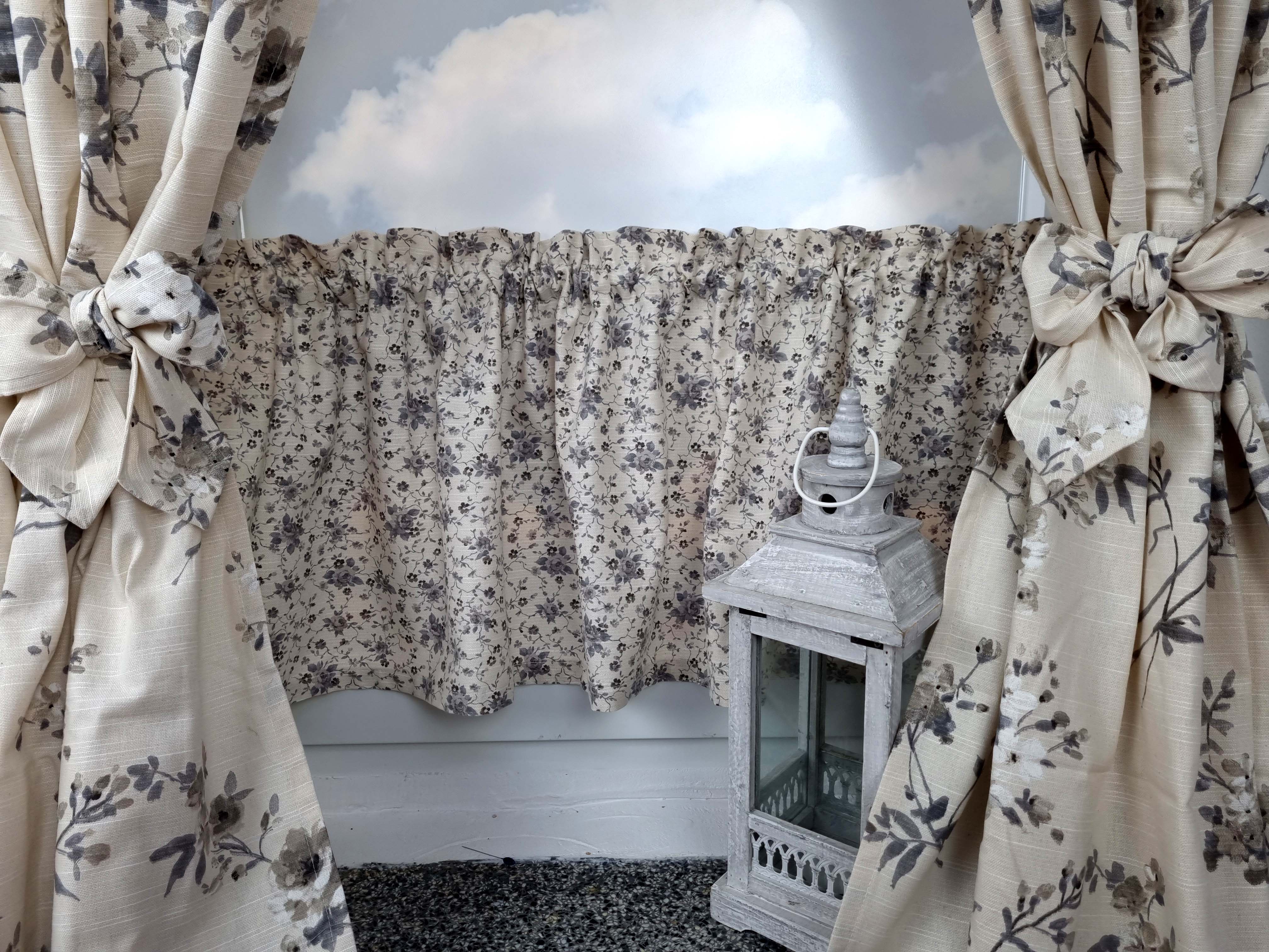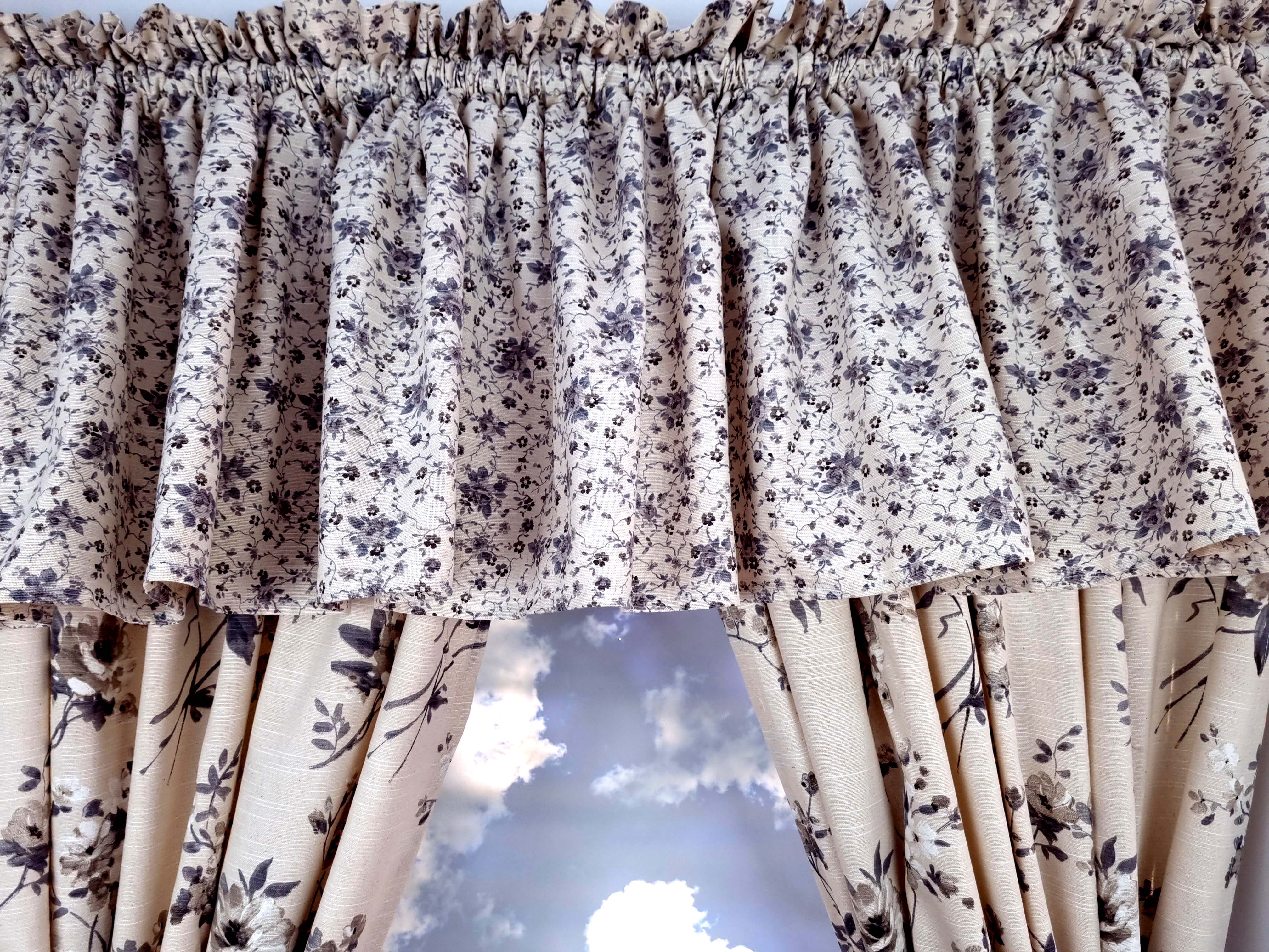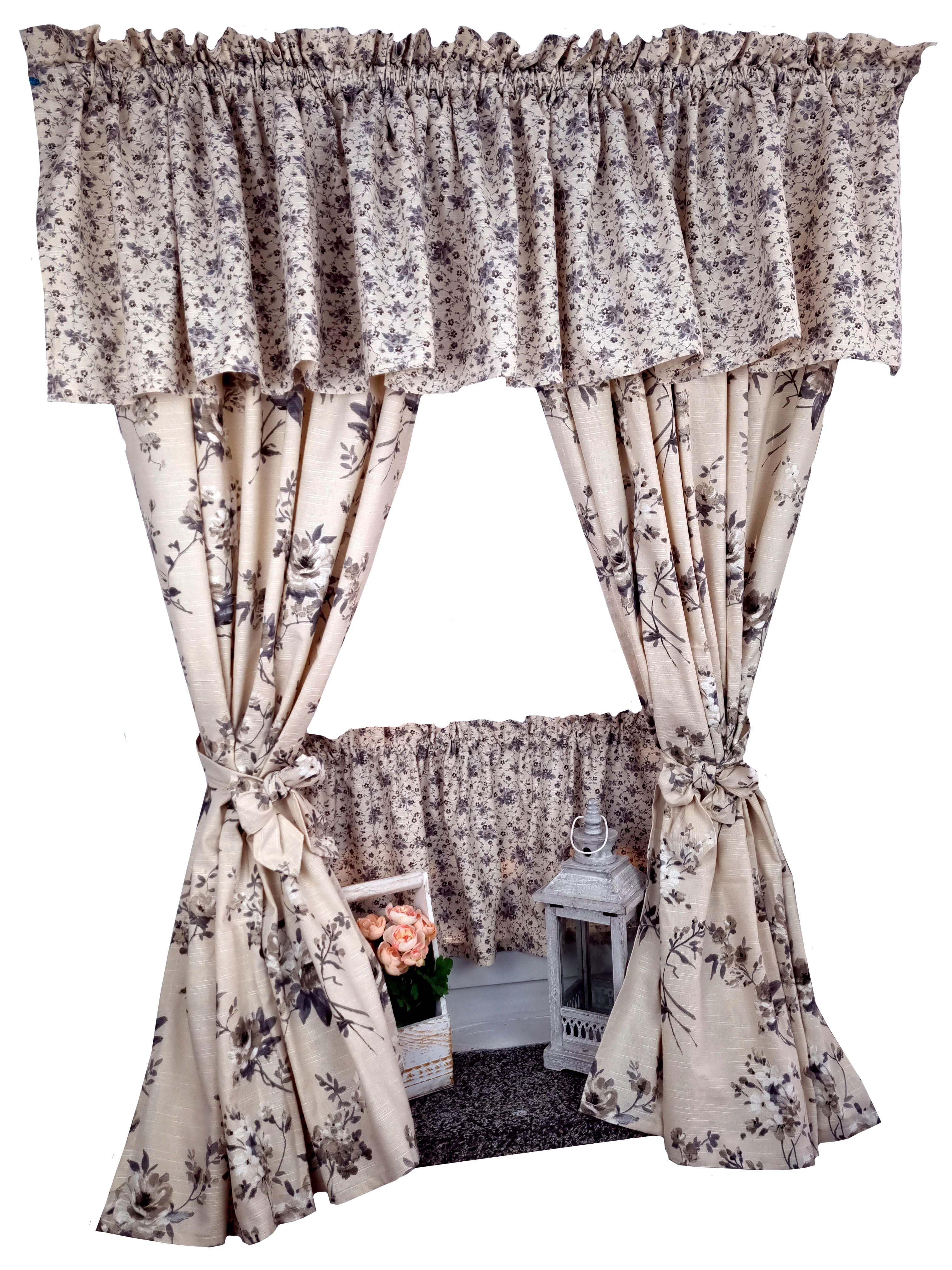 Komplet to 2 sztuki zasłonek oraz wstążki do wiązania zasłonek plus lambrekin i zazdrostka.