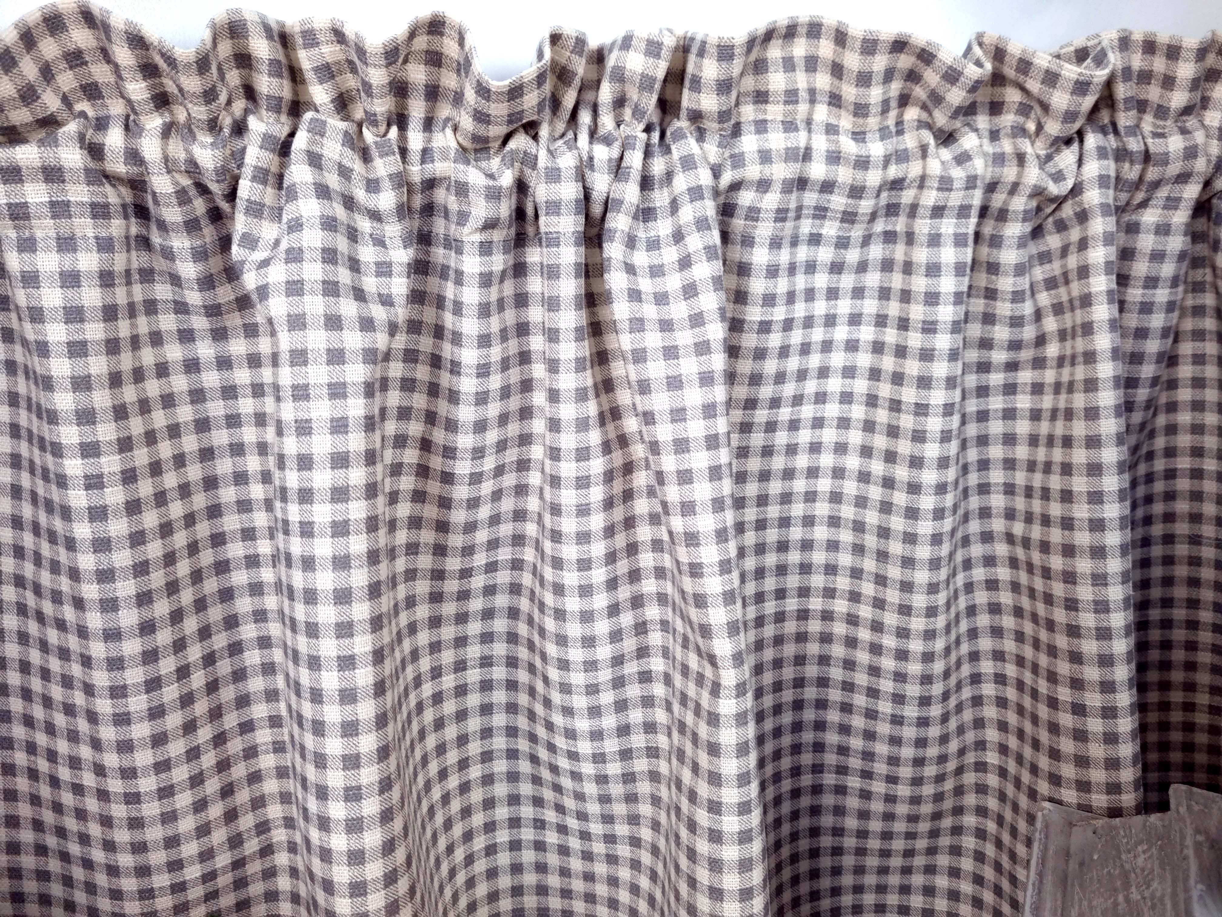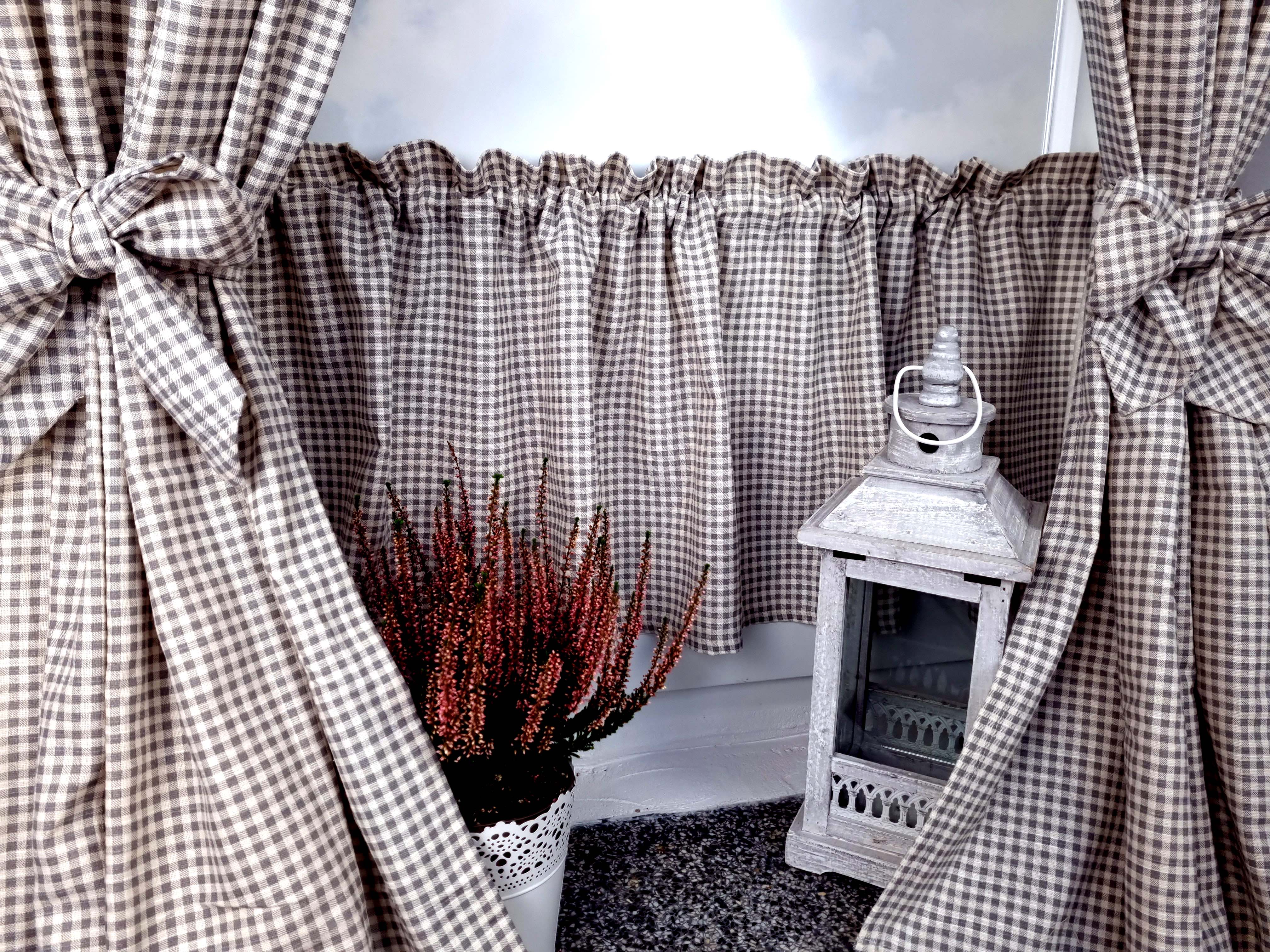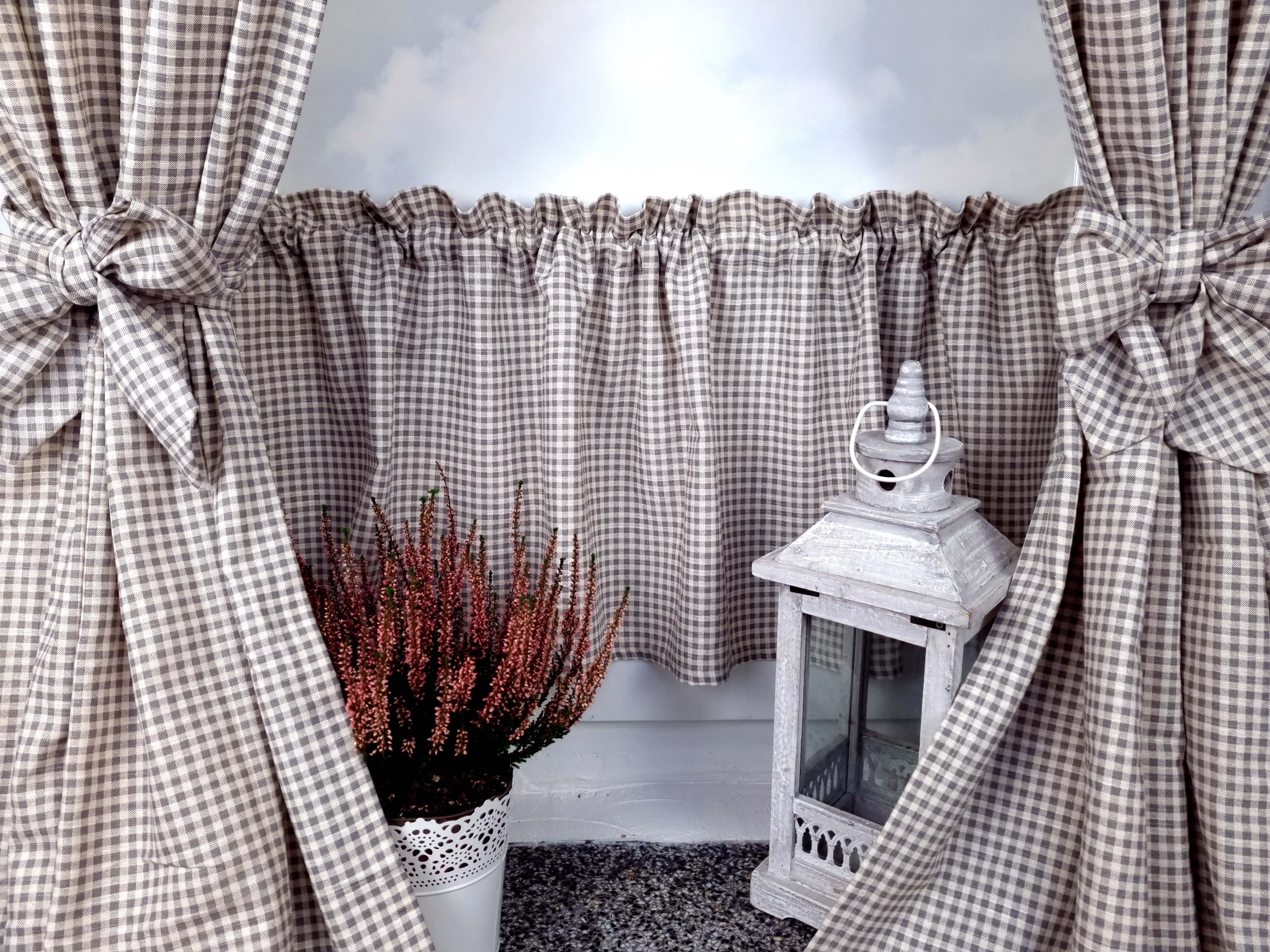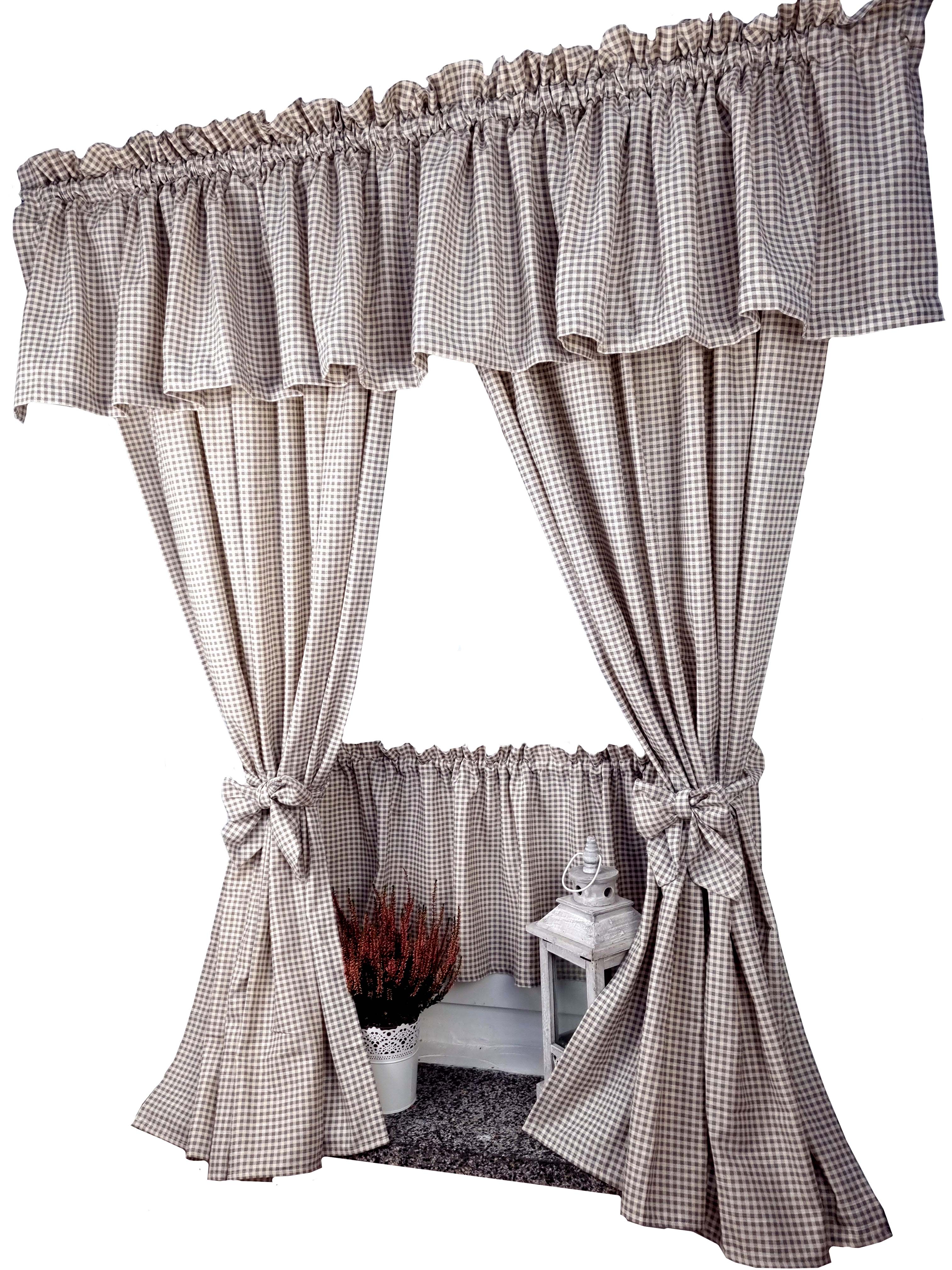 Komplet to 2 sztuki zasłonek oraz wstążki do wiązania zasłonek plus lambrekin i zazdrostka.