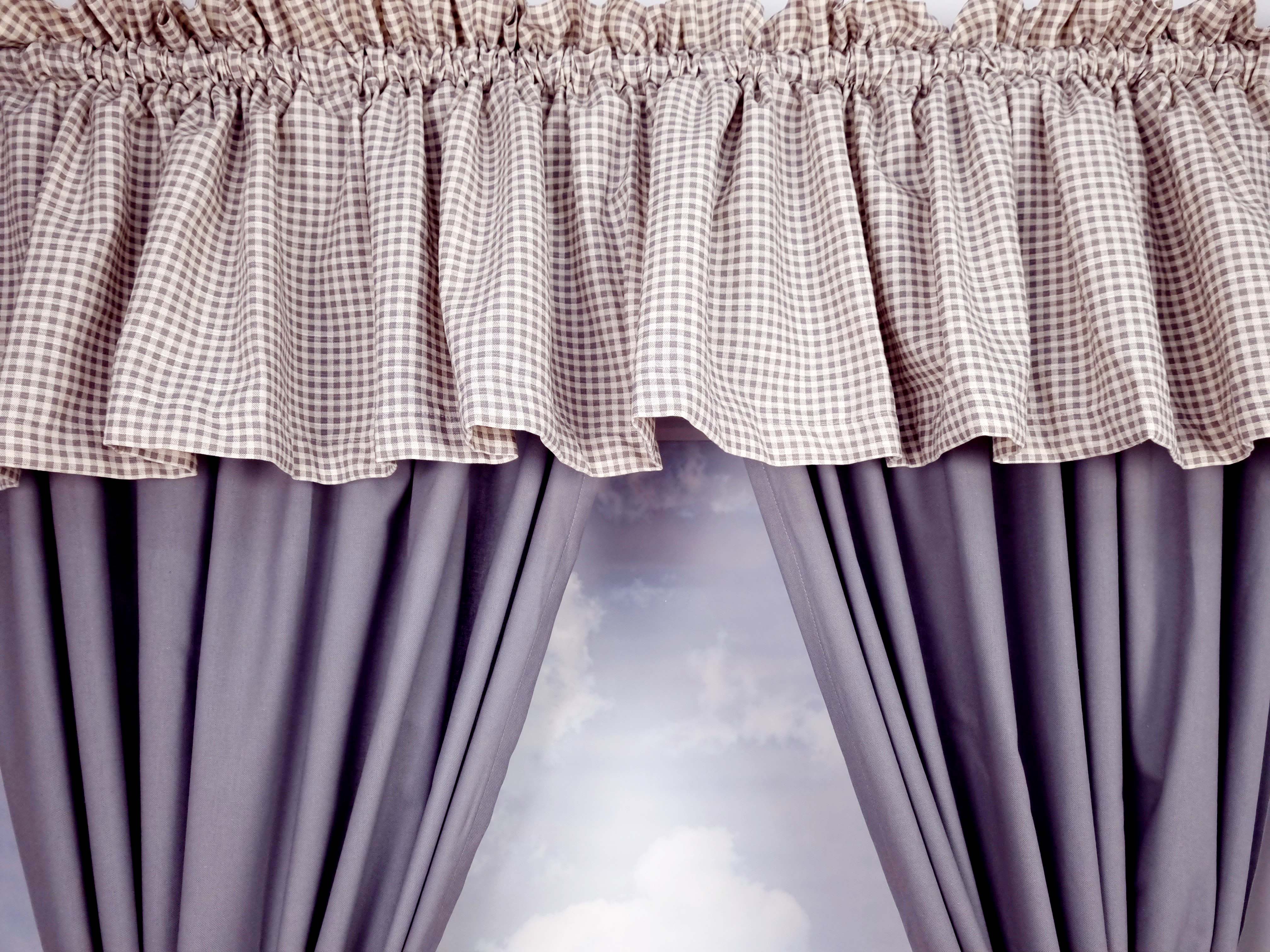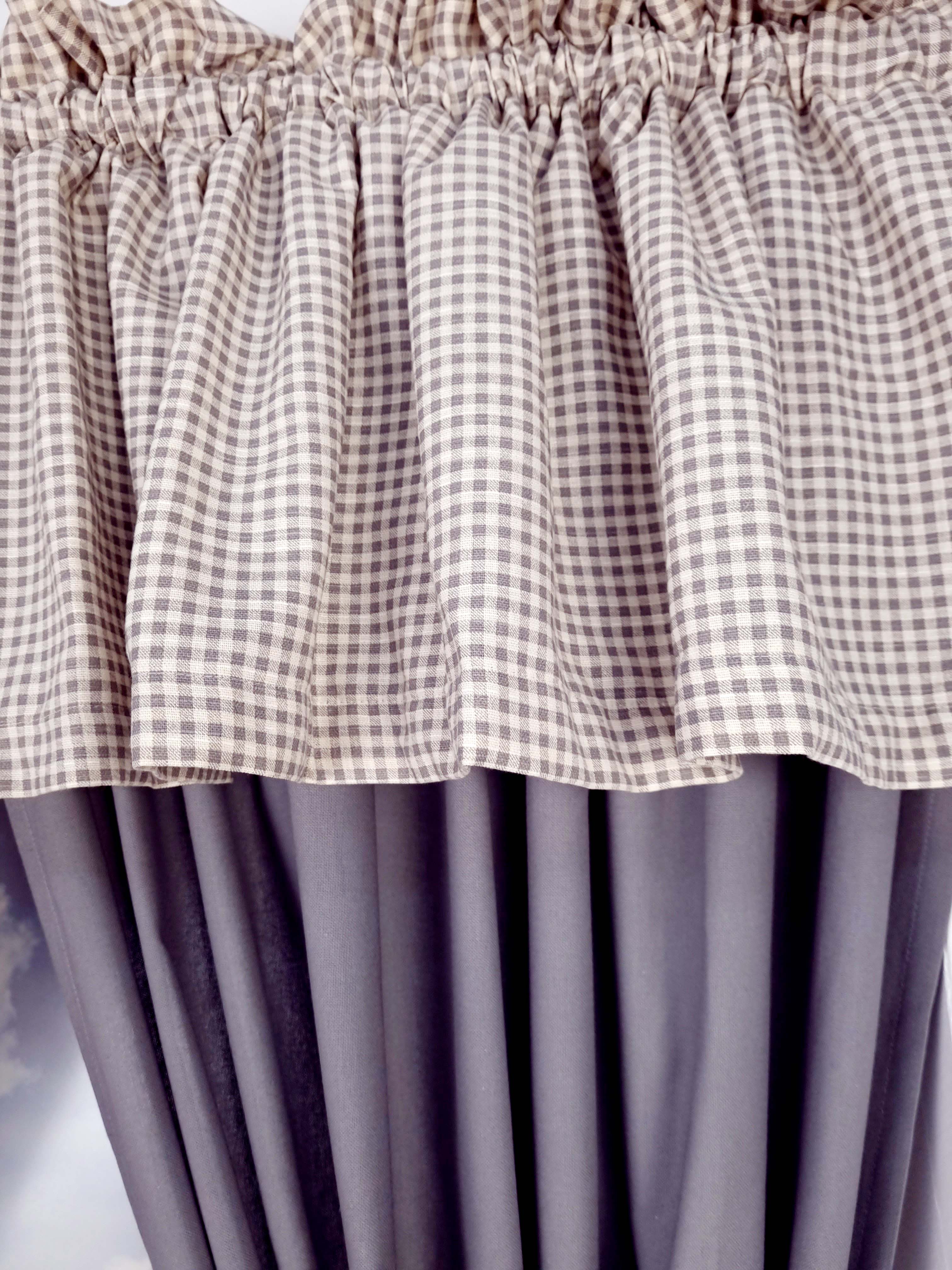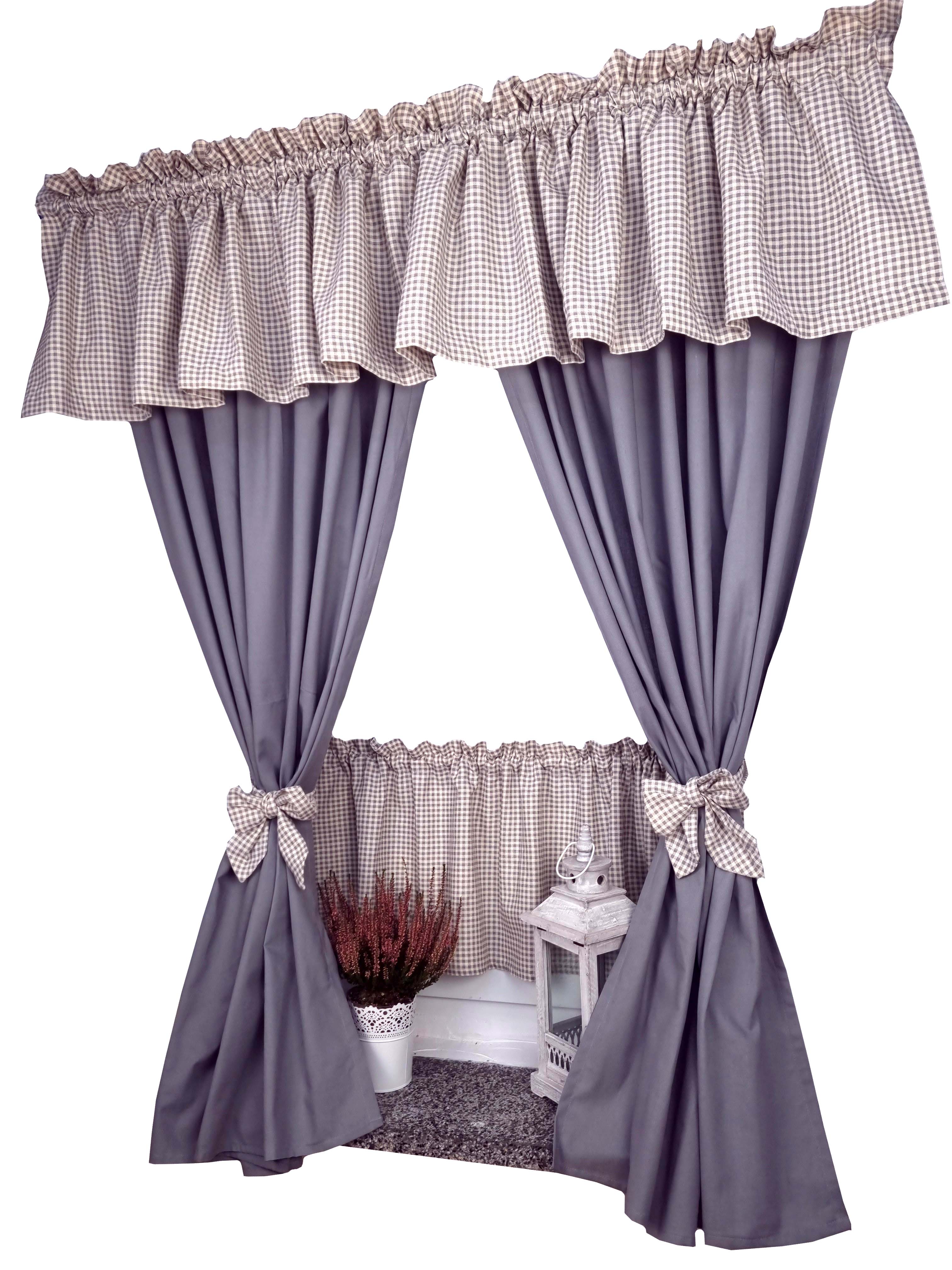 Komplet to 2 sztuki zasłonek oraz wstążki do wiązania zasłonek plus lambrekin i zazdrostka.