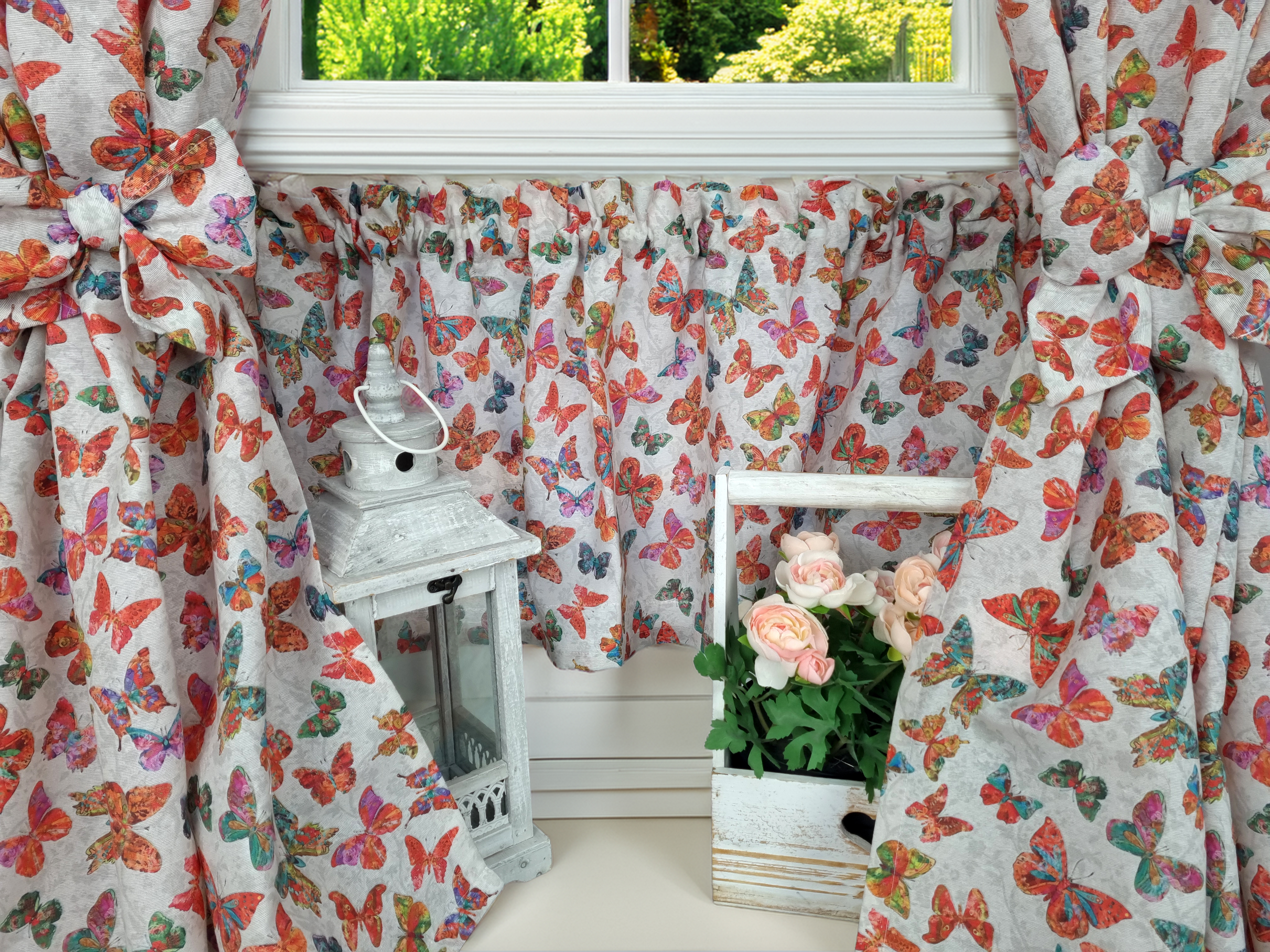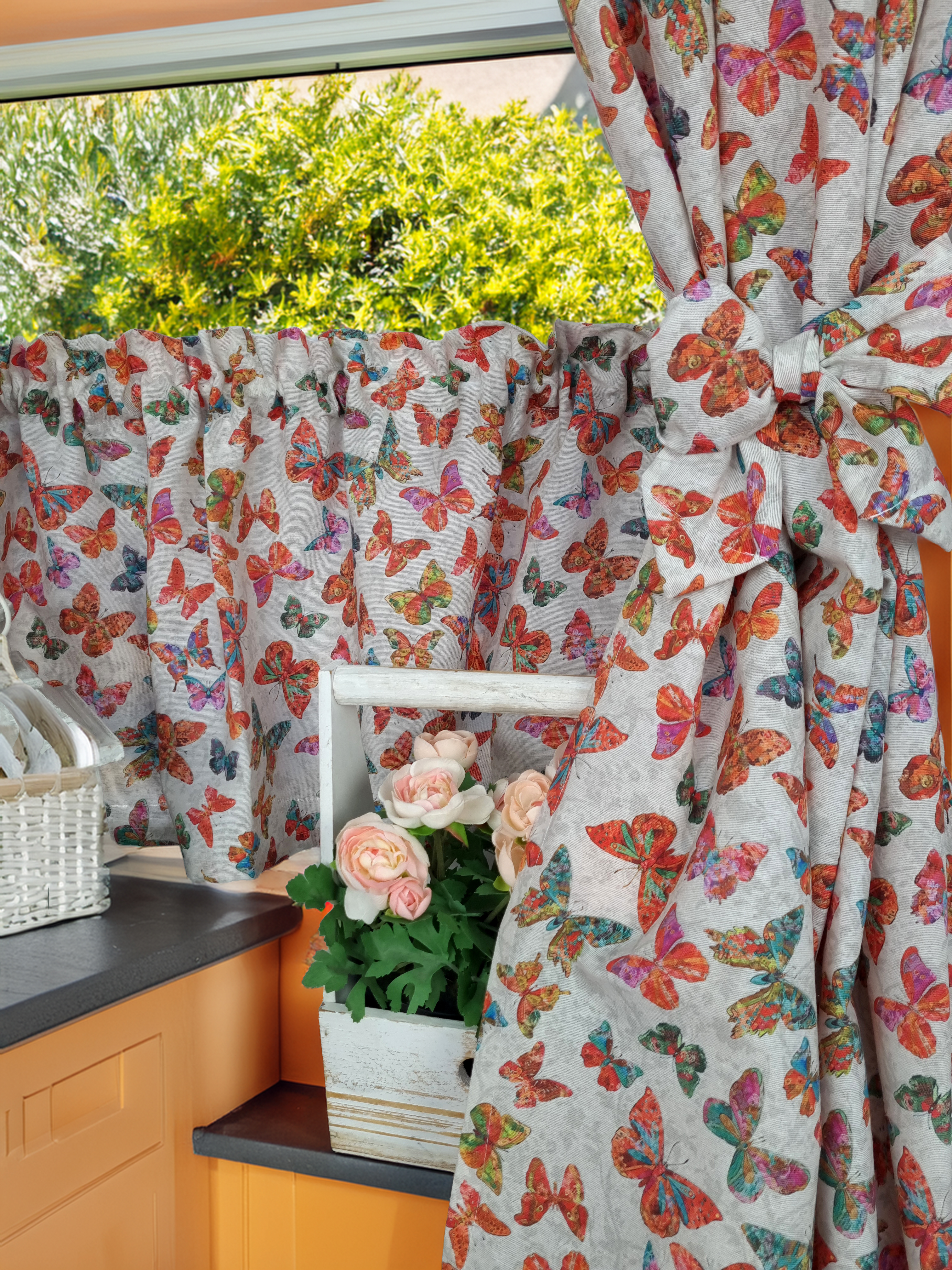 Zapraszam Państwa do zakupu kompletu do kuchni w pięknym wzorze. Kolory motyli żywe na szarym tle.