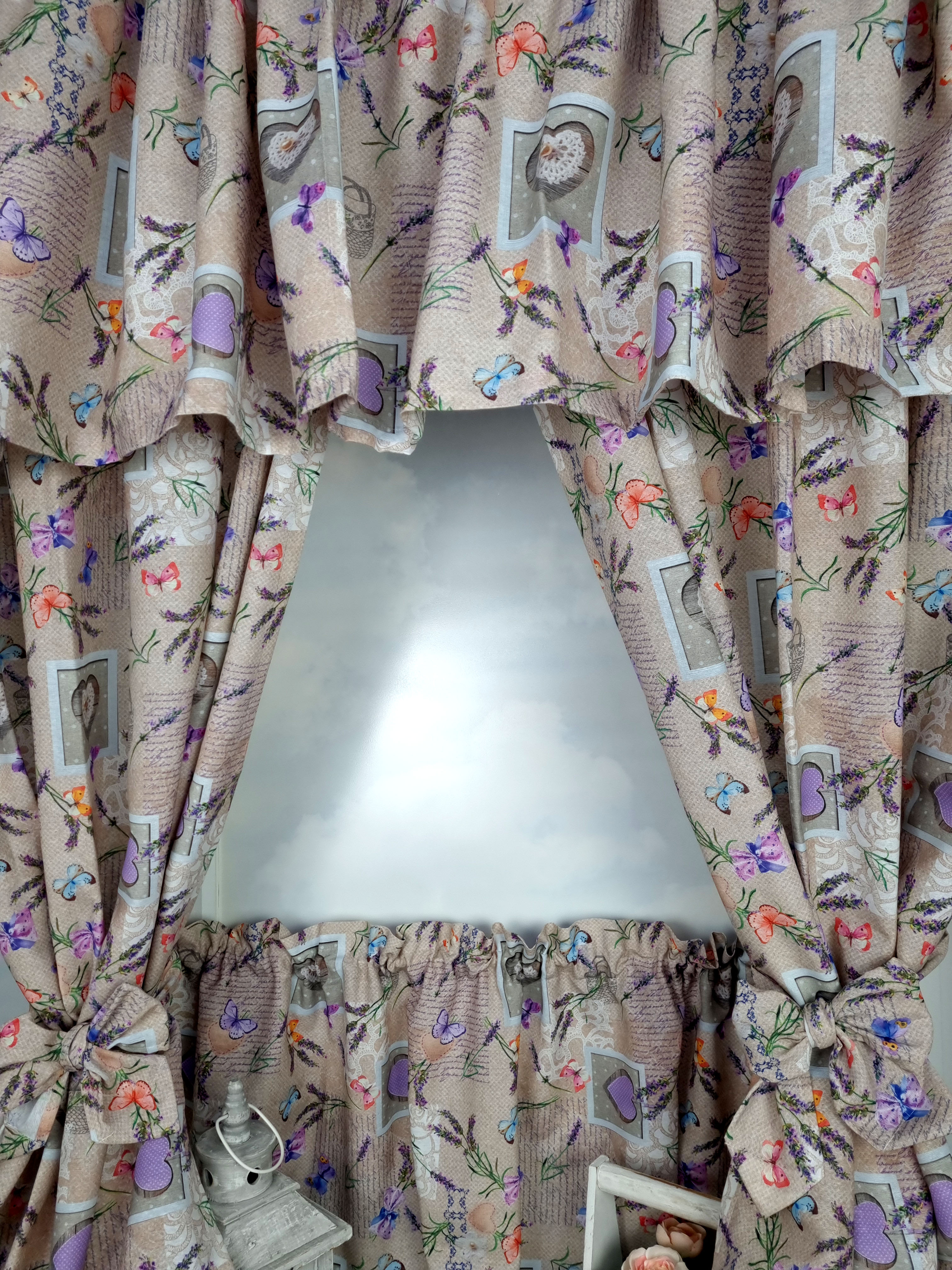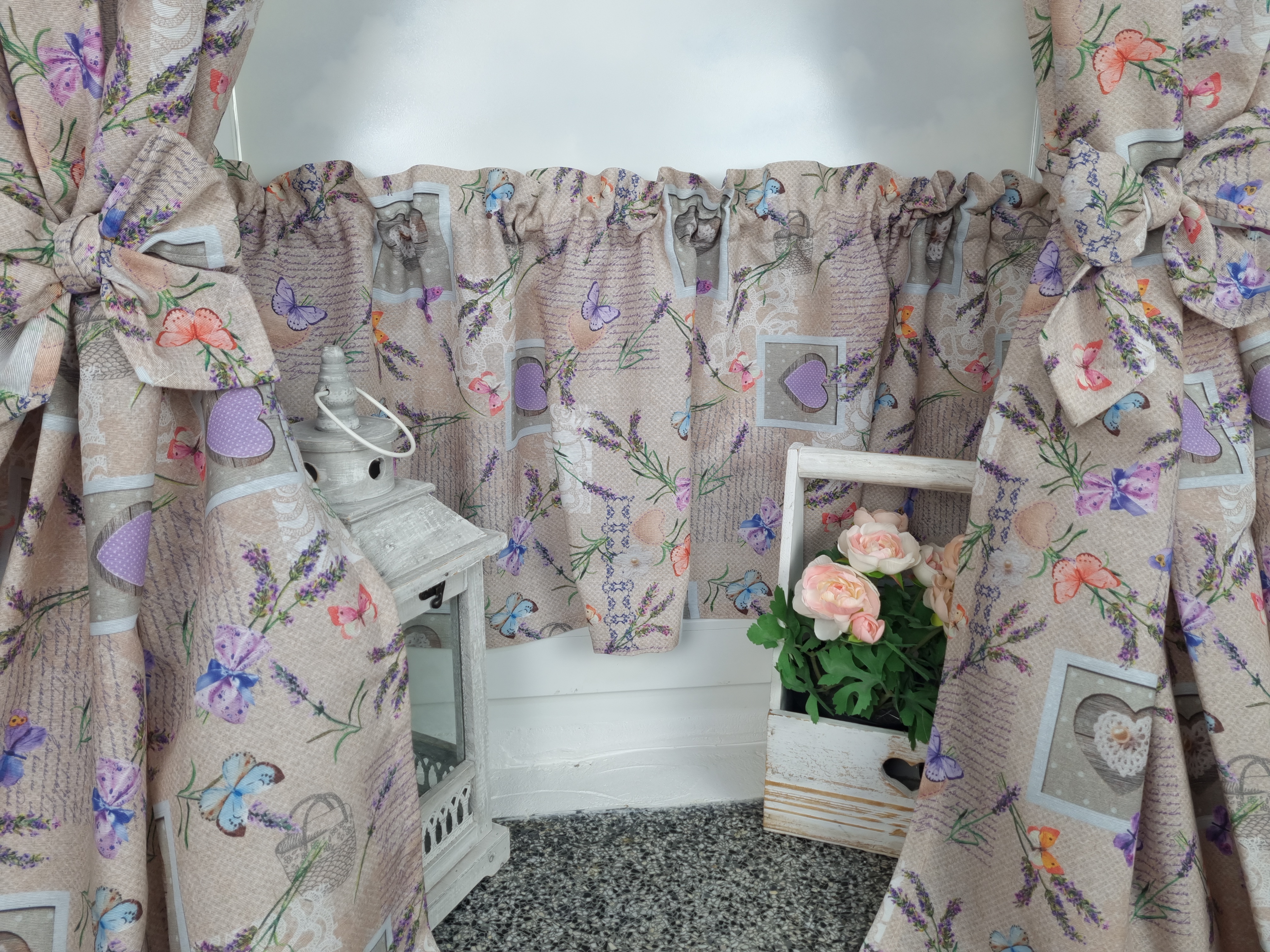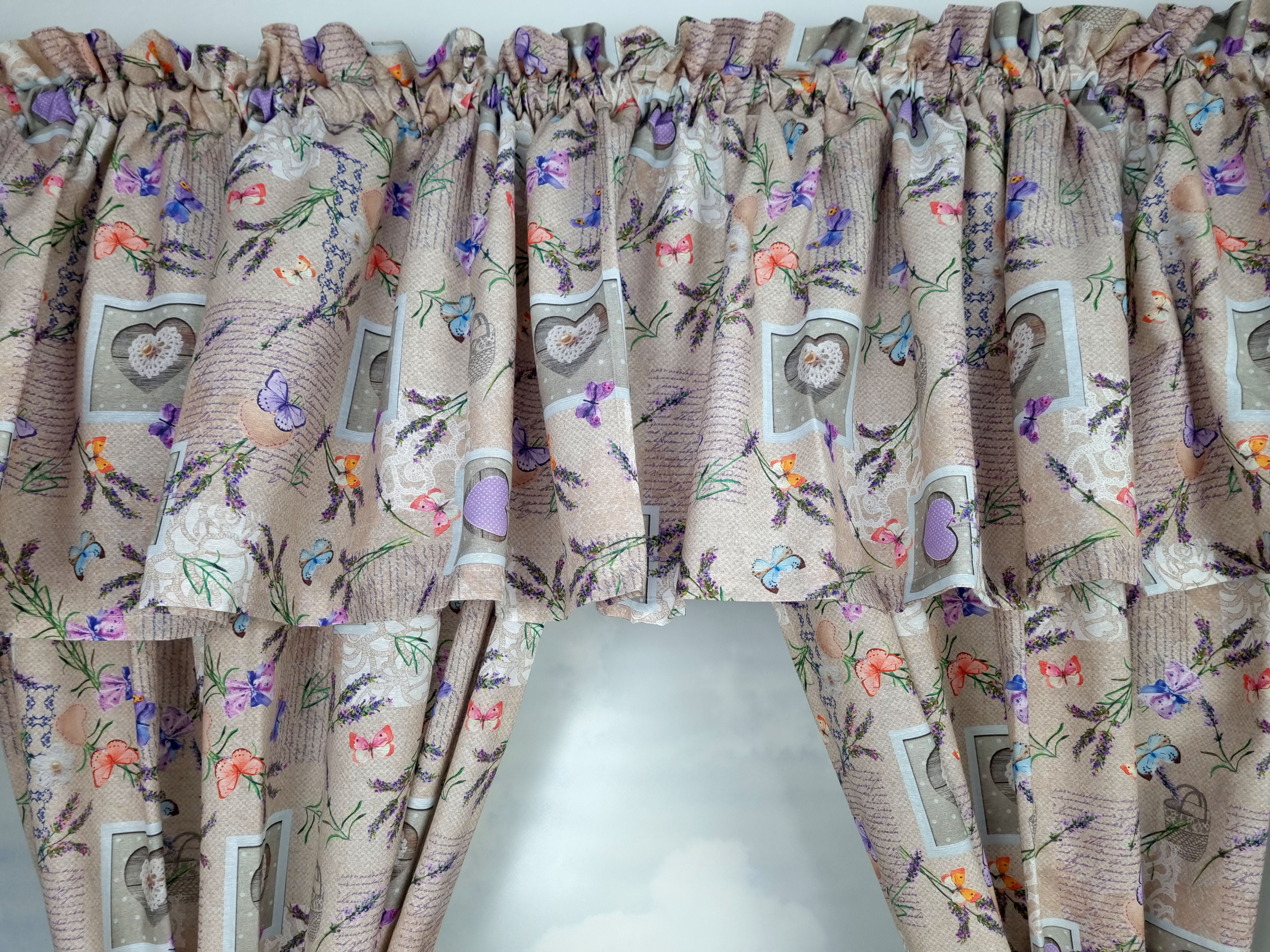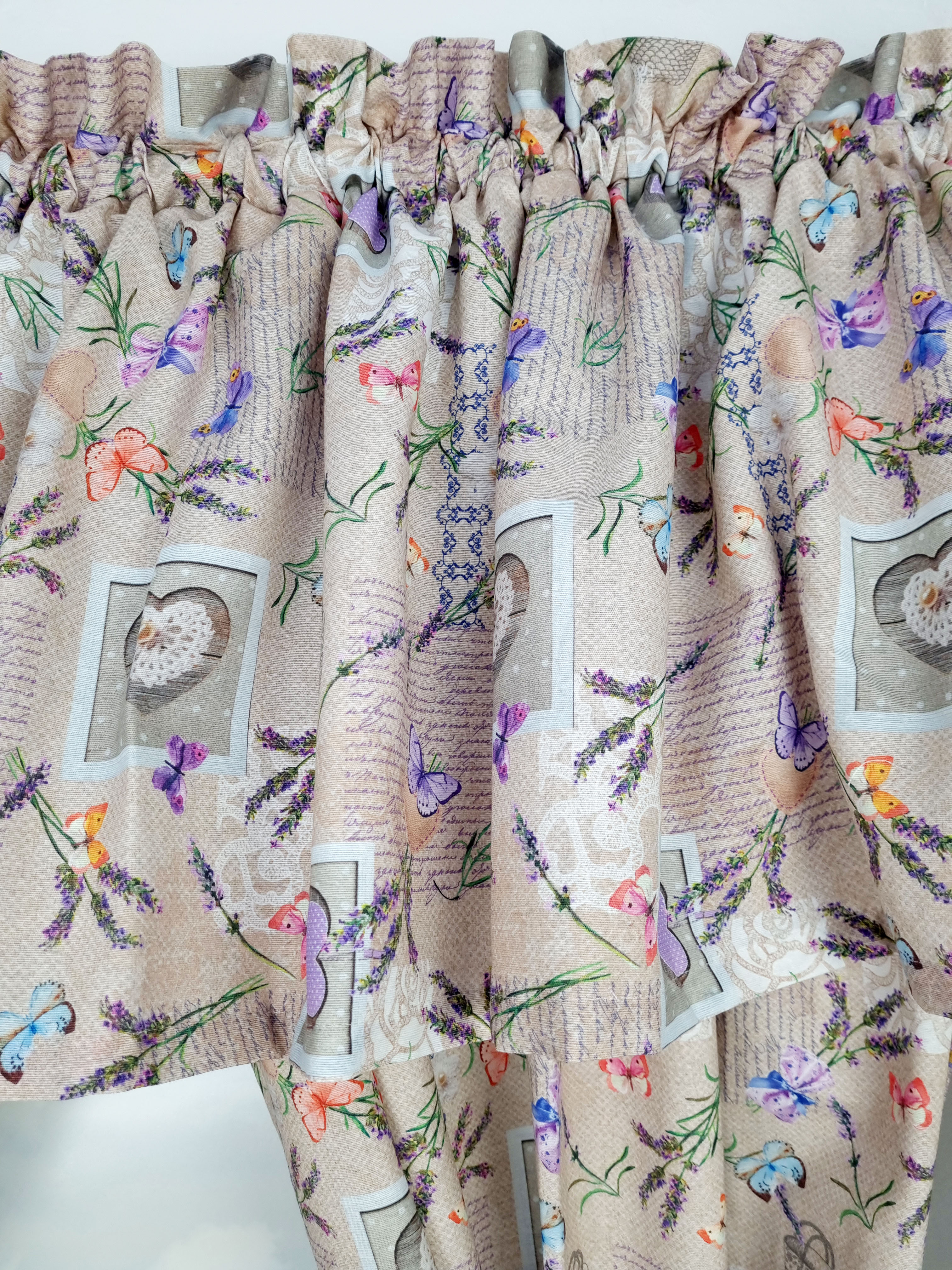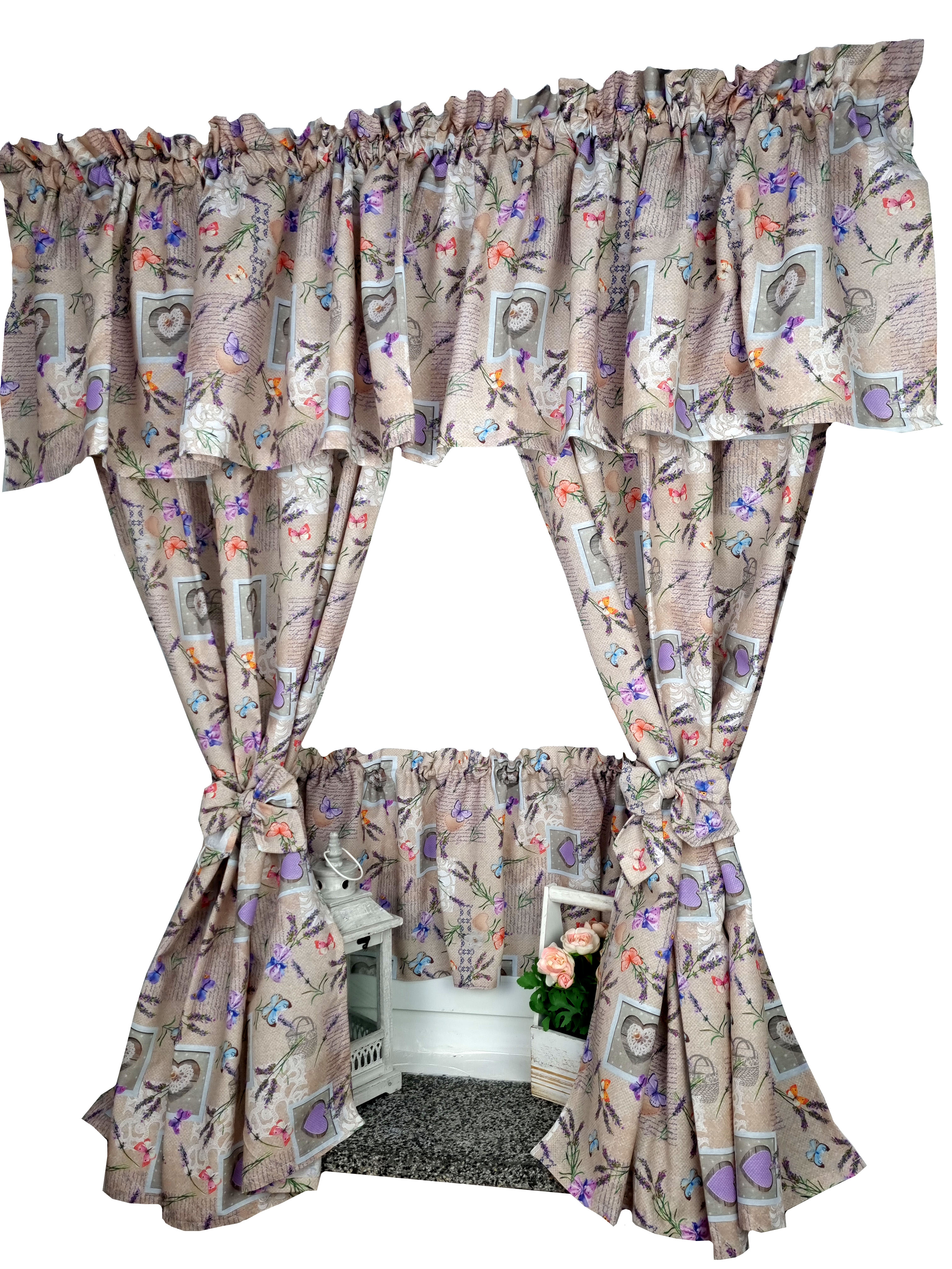 Komplet to 2 sztuki zasłonek oraz wstążki do wiązania zasłonek plus lambrekin i zazdrostka. Zasłony i lambrekin mają wszytą taśmę marszczącą na karnisz z górną 4cm ryzą - grzywką.