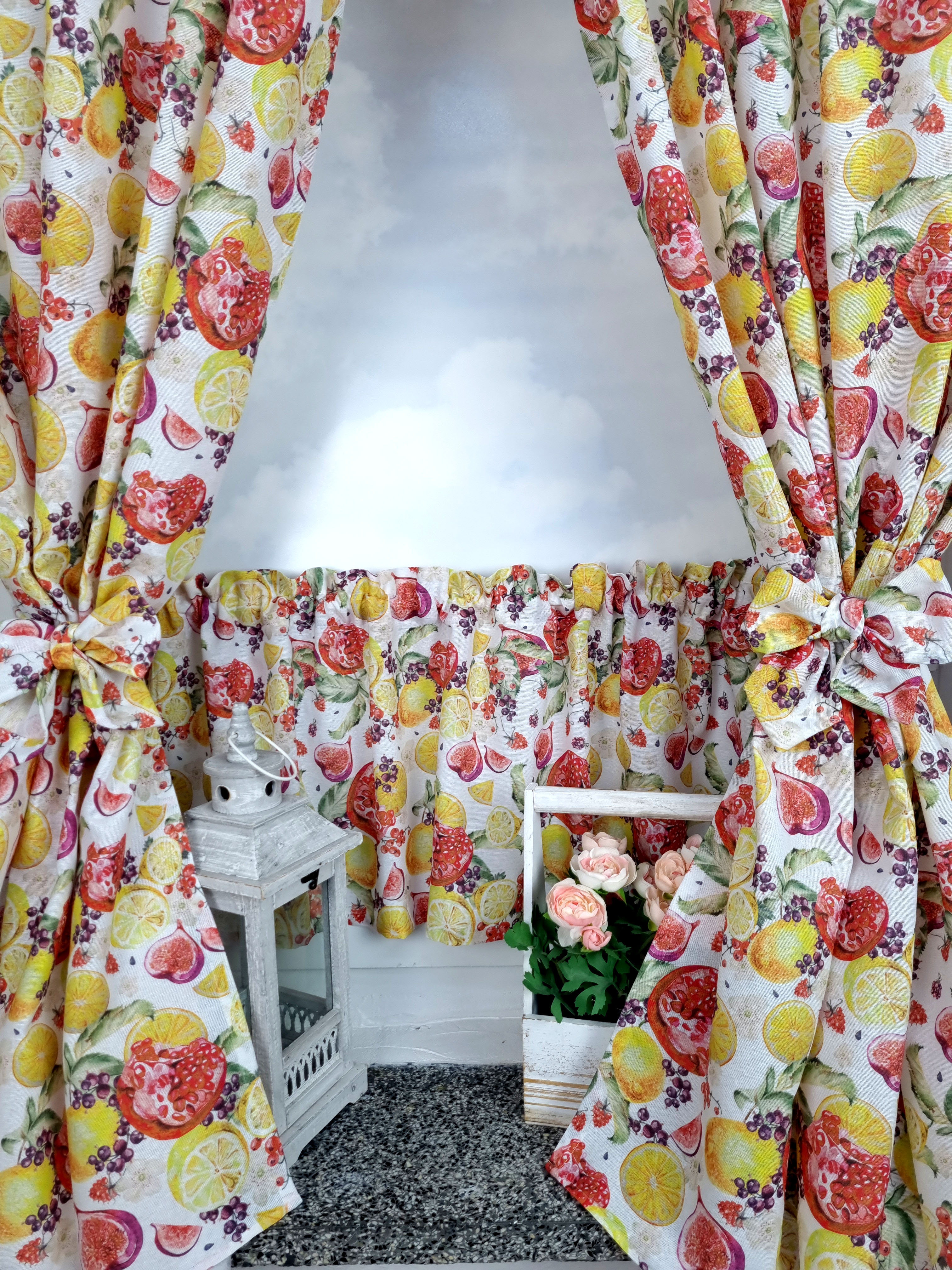 Komplet to dwie zasłonki na boki z wiązaniami oraz zazdrostka.