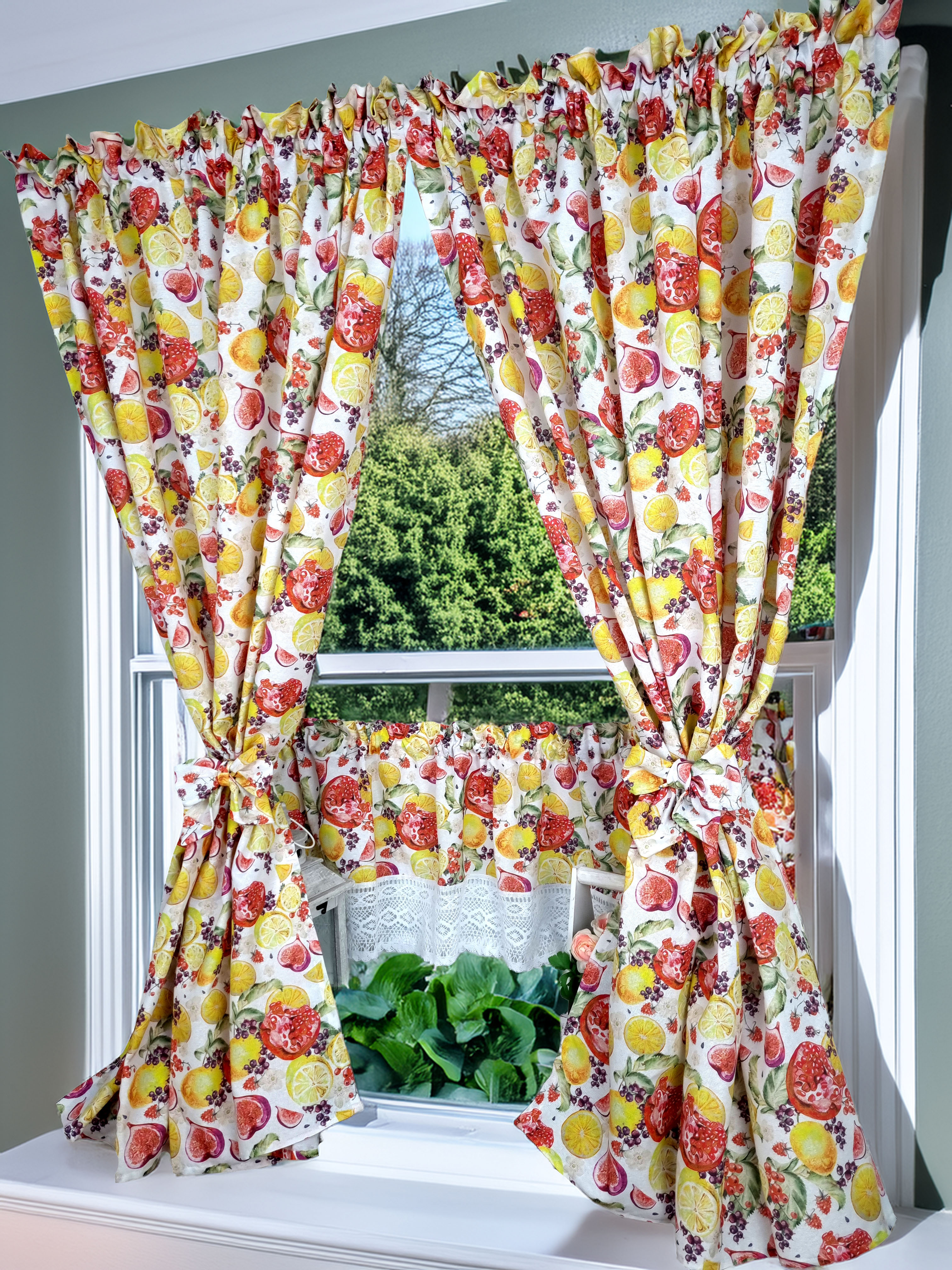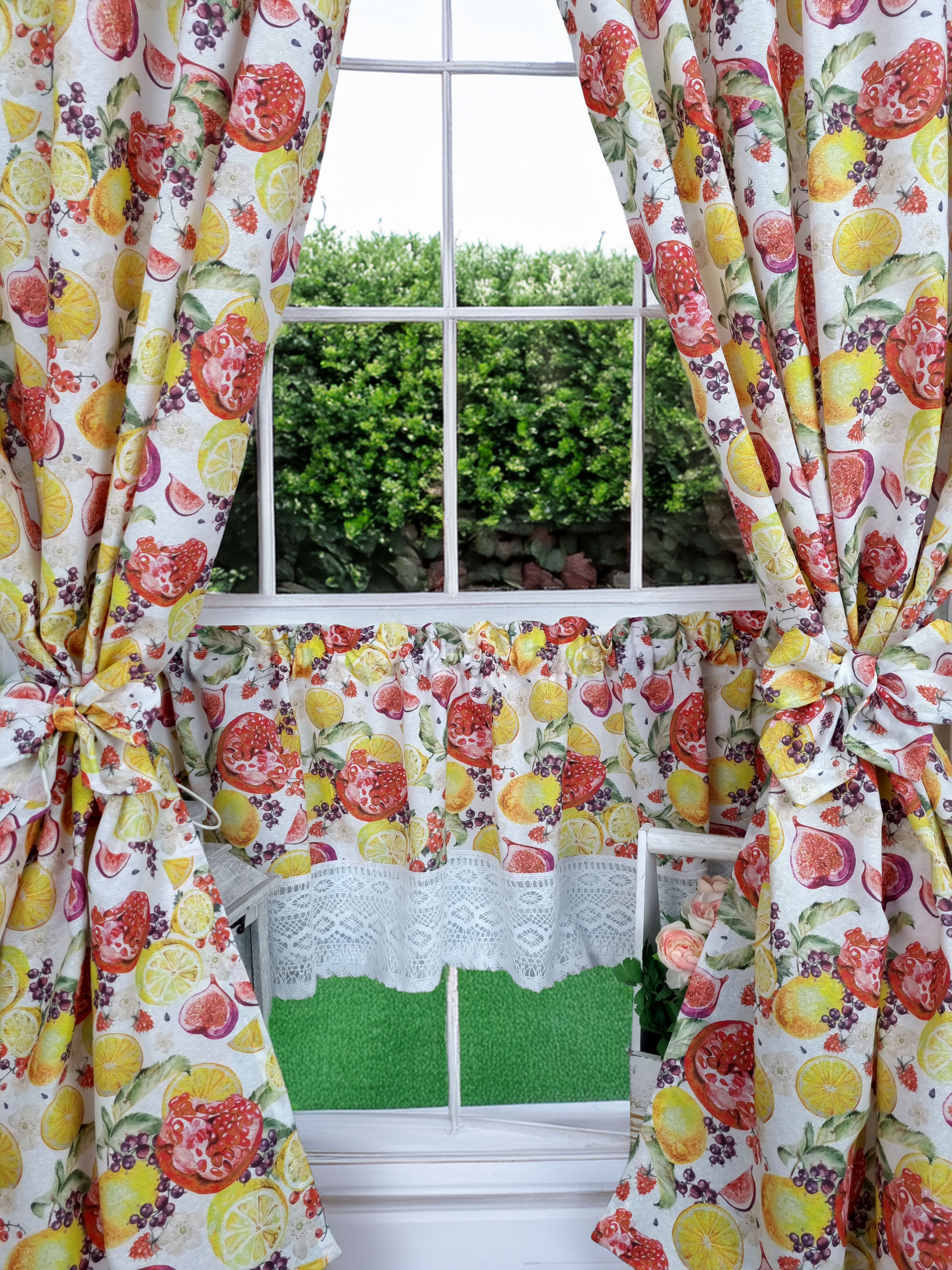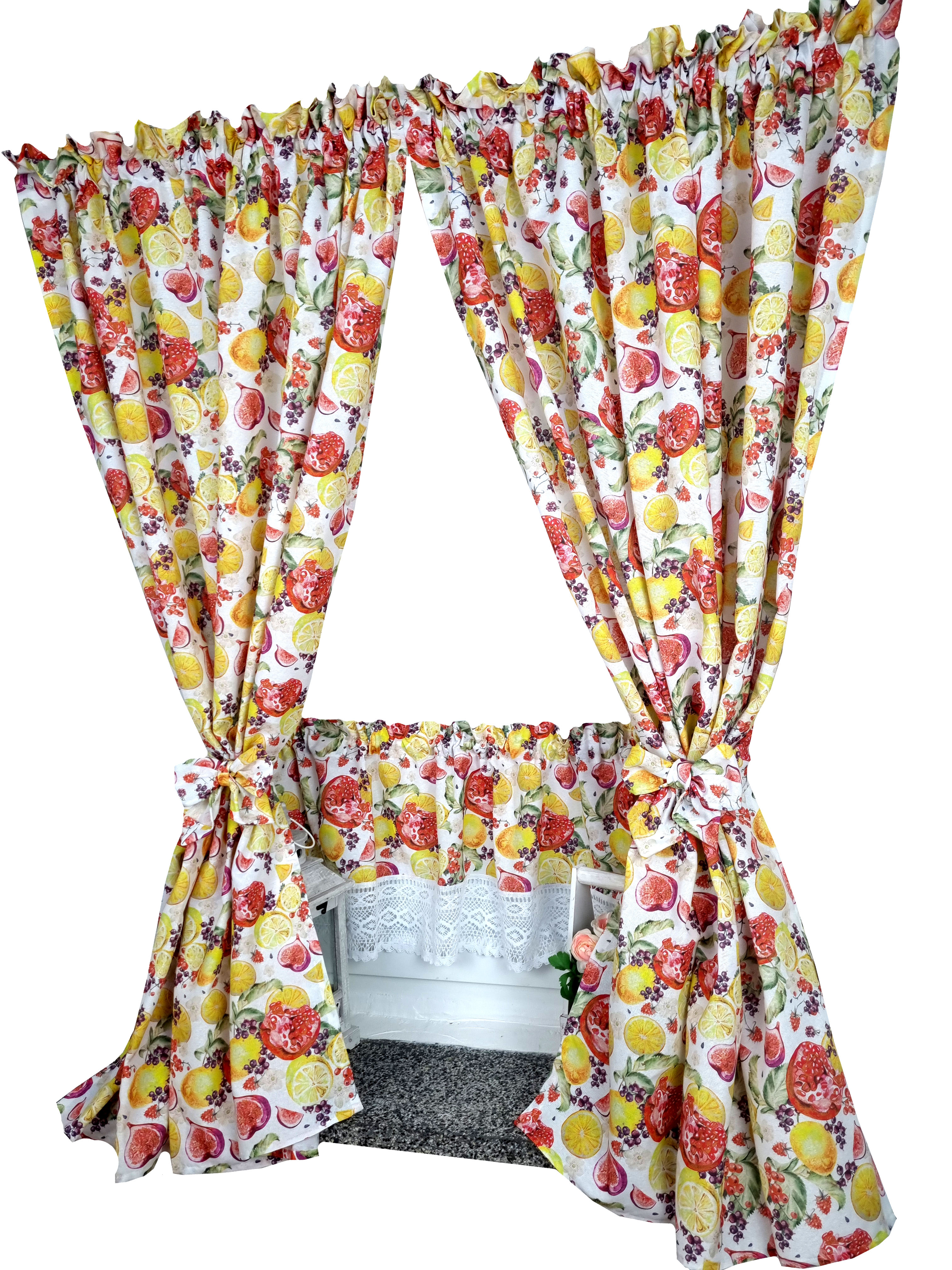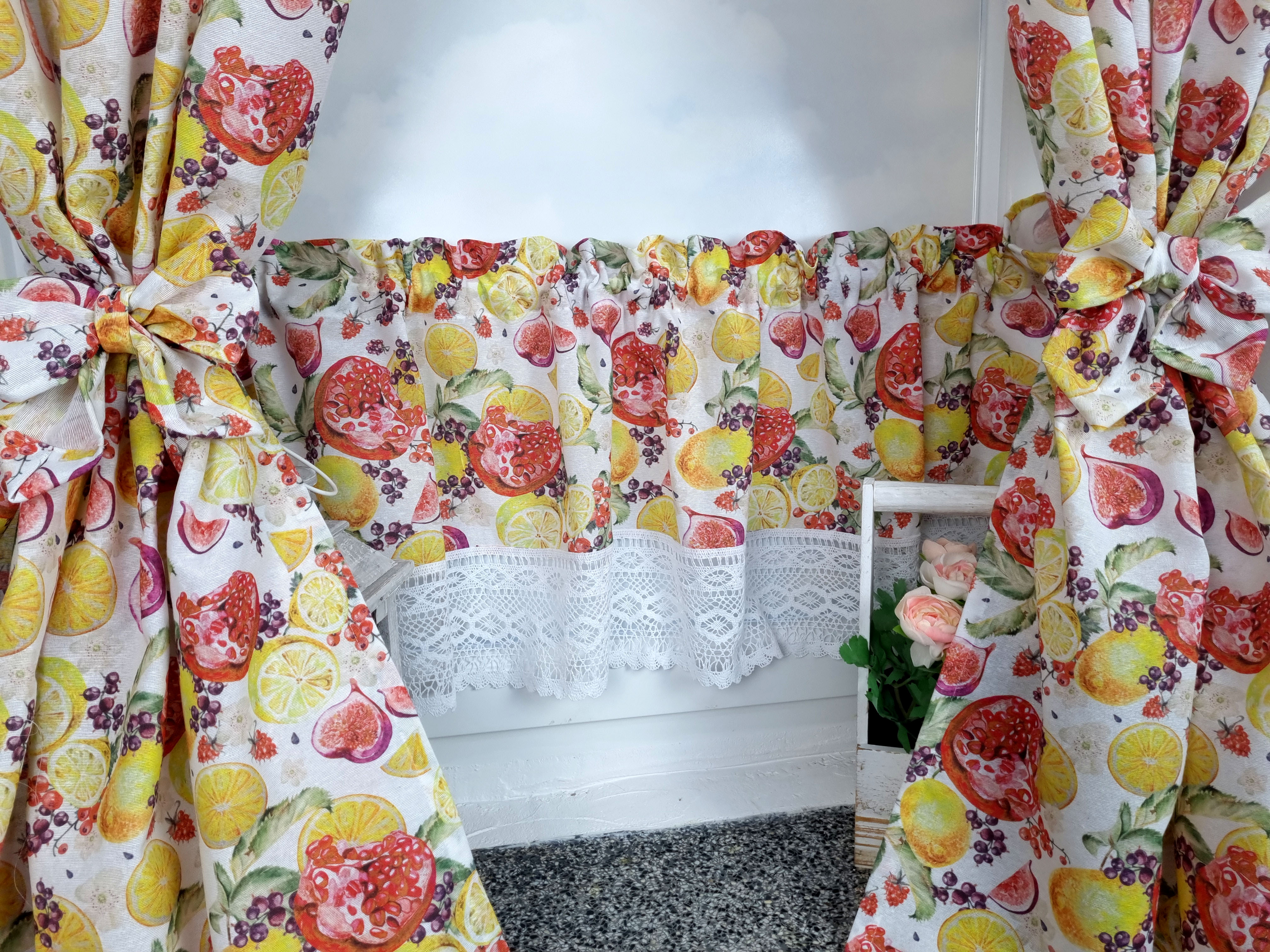 Komplet to dwie zasłonki na boki z wiązaniami oraz zazdrostka.
