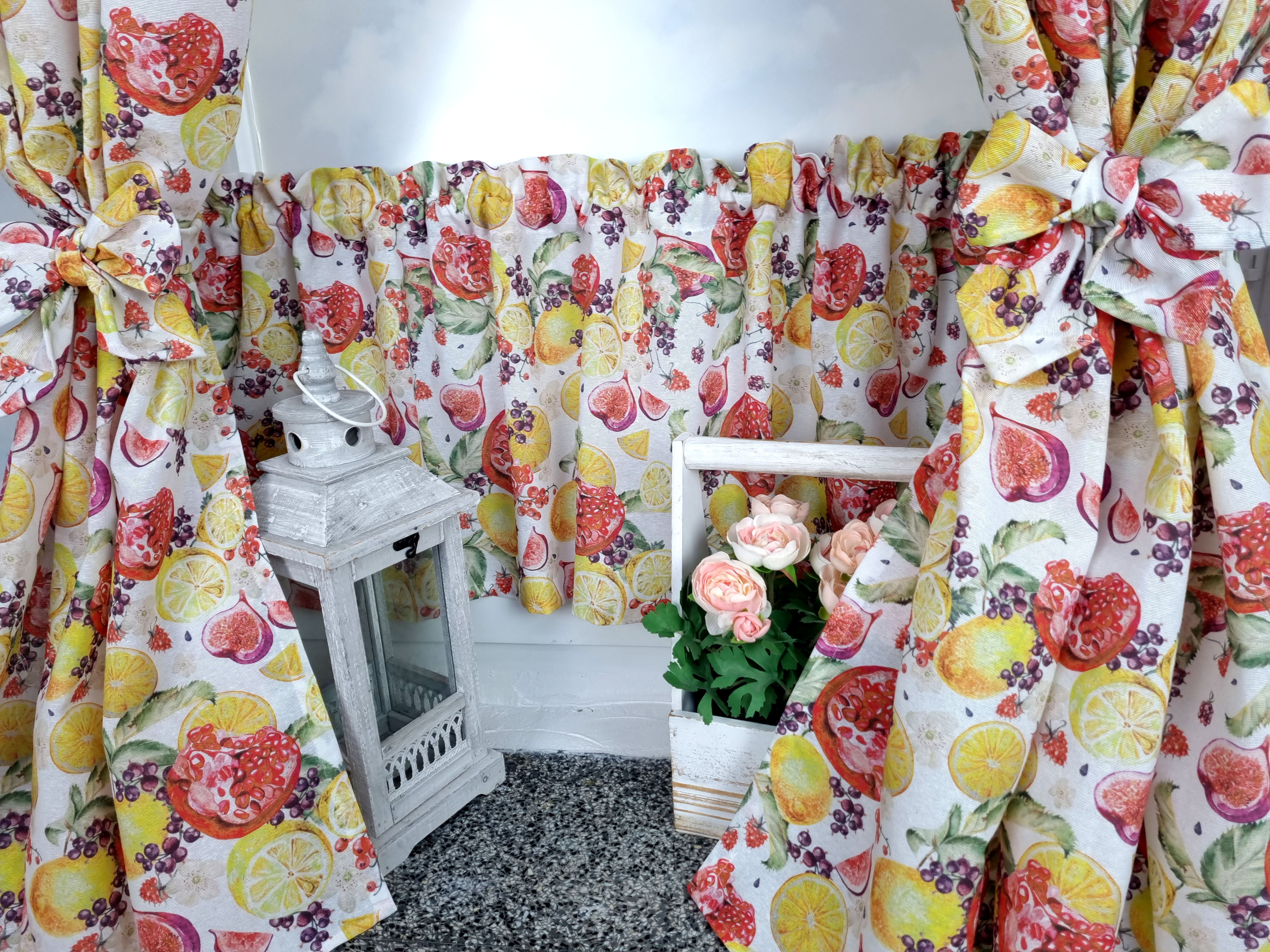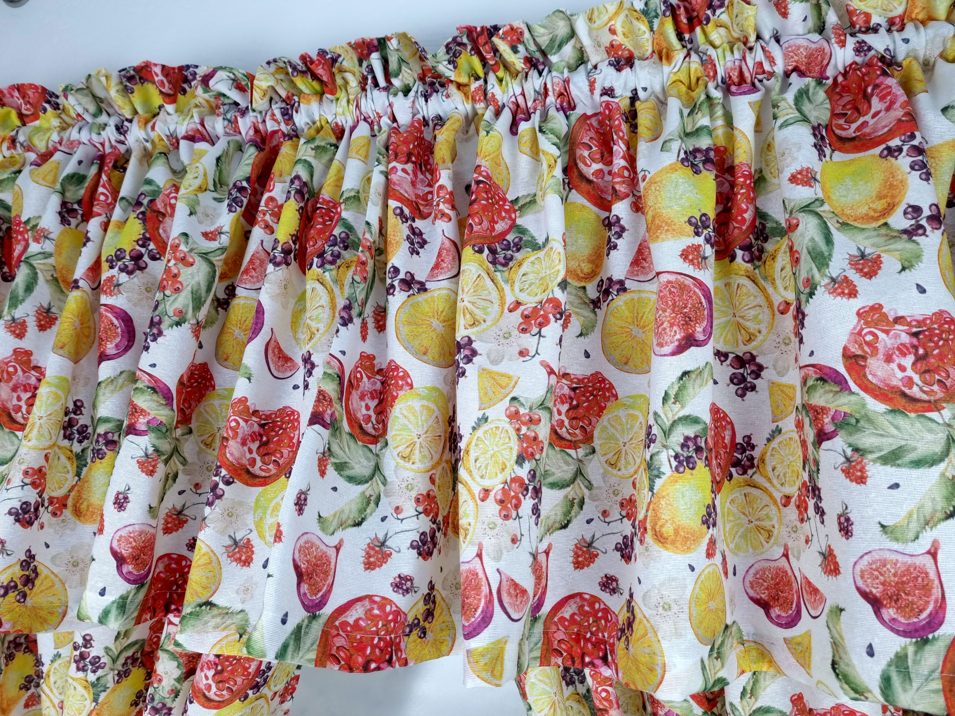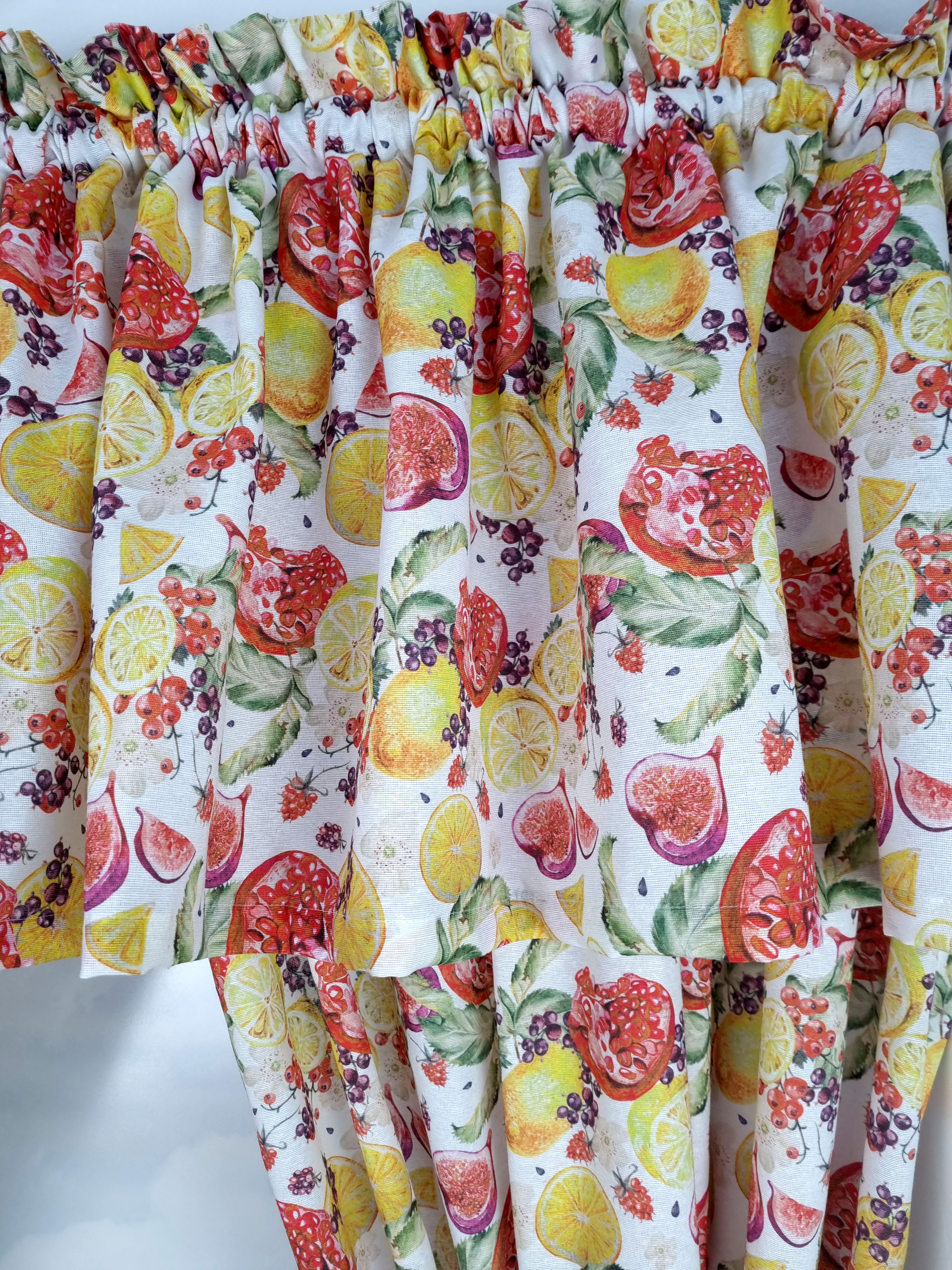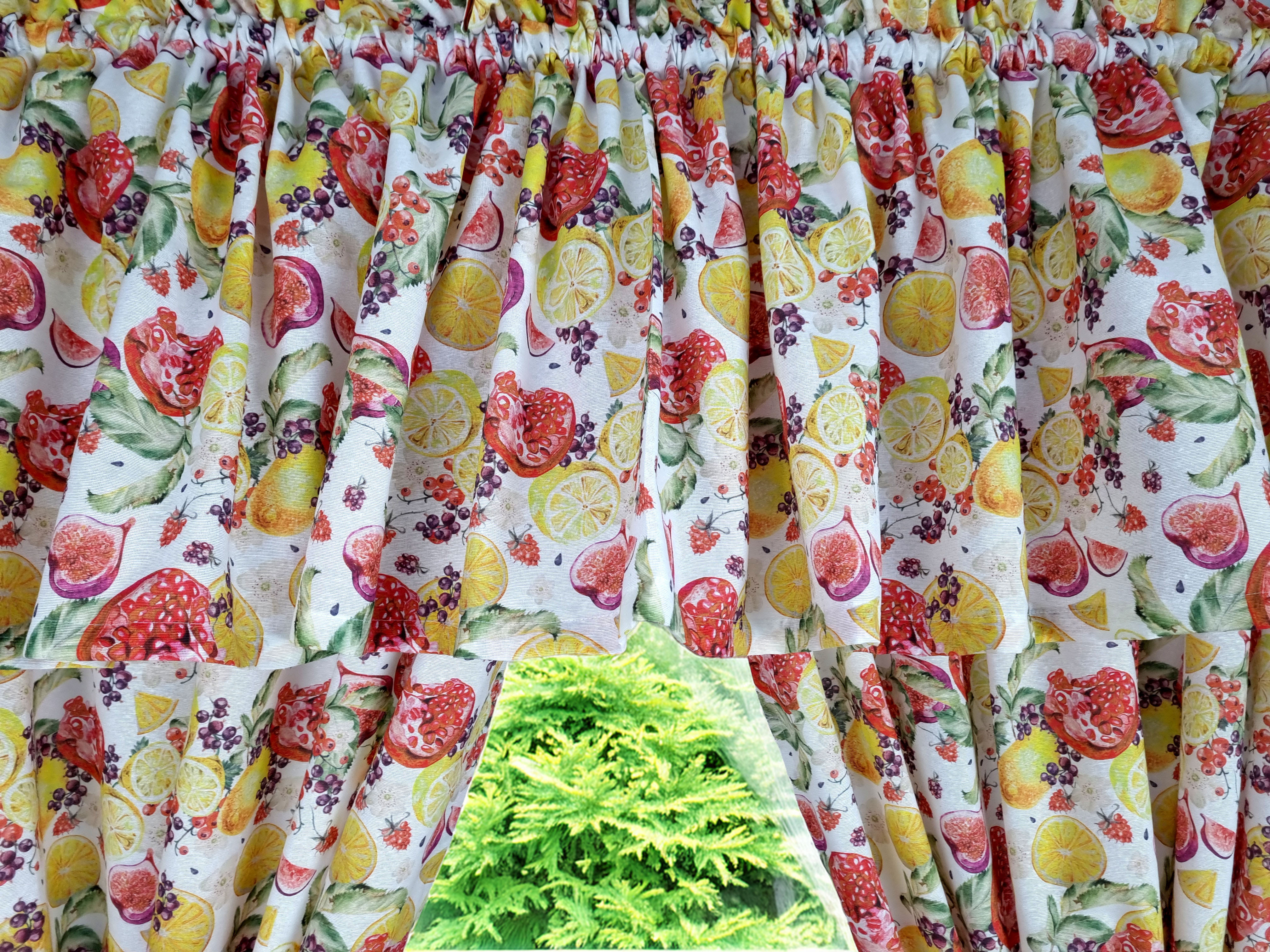Zapraszam Państwa do zakupu kompletu w owocowy wzór cytryny granaty. Wzór tkaniny jednostronny. Komplet to 2 sztuki zasłonek oraz wstążki do wiązania zasłonek plus lambrekin i zazdrostka. Zasłony i lambrekin mają wszytą taśmę marszczącą na karnisz z górną 4cm ryzą - grzywką.