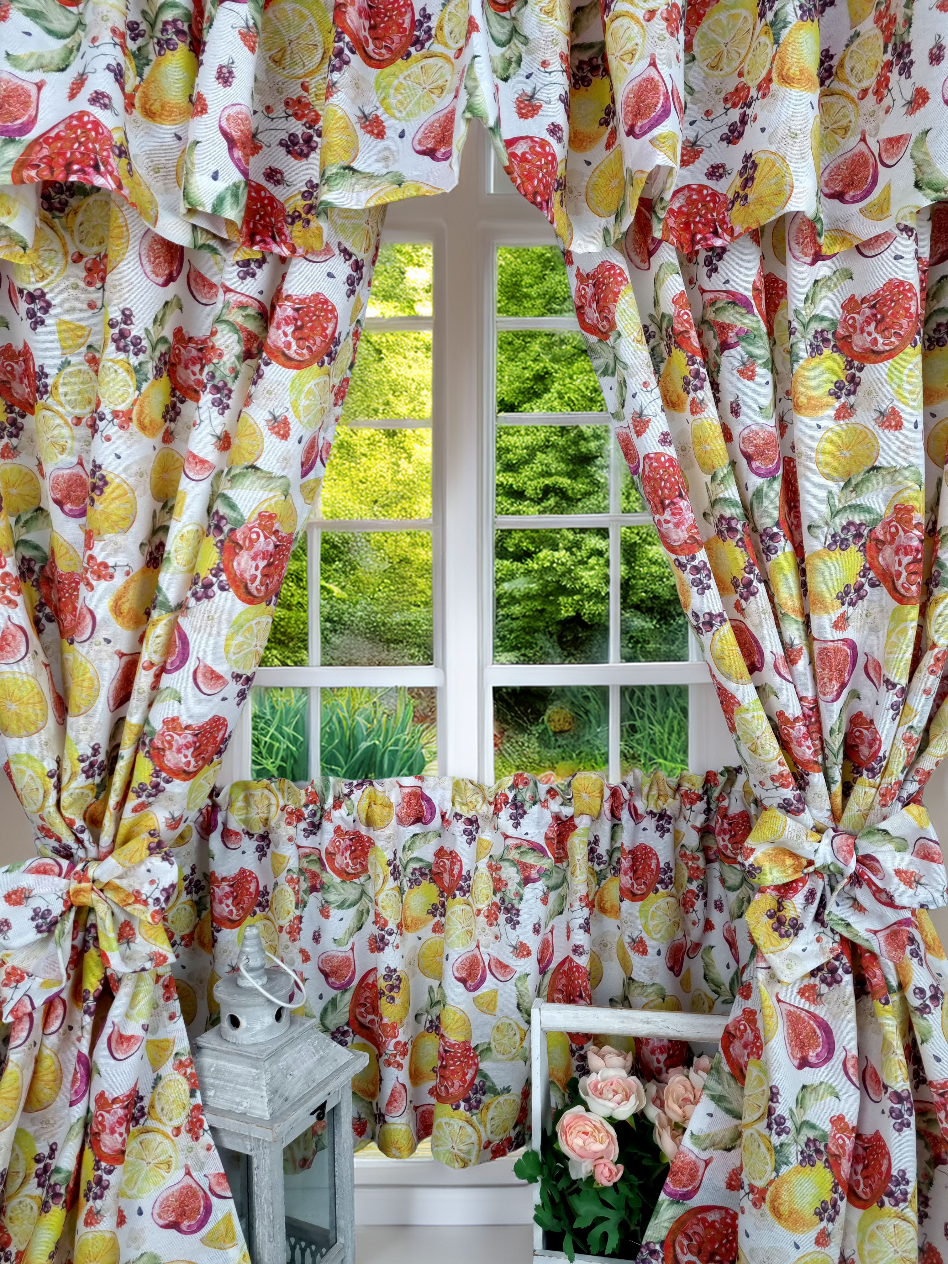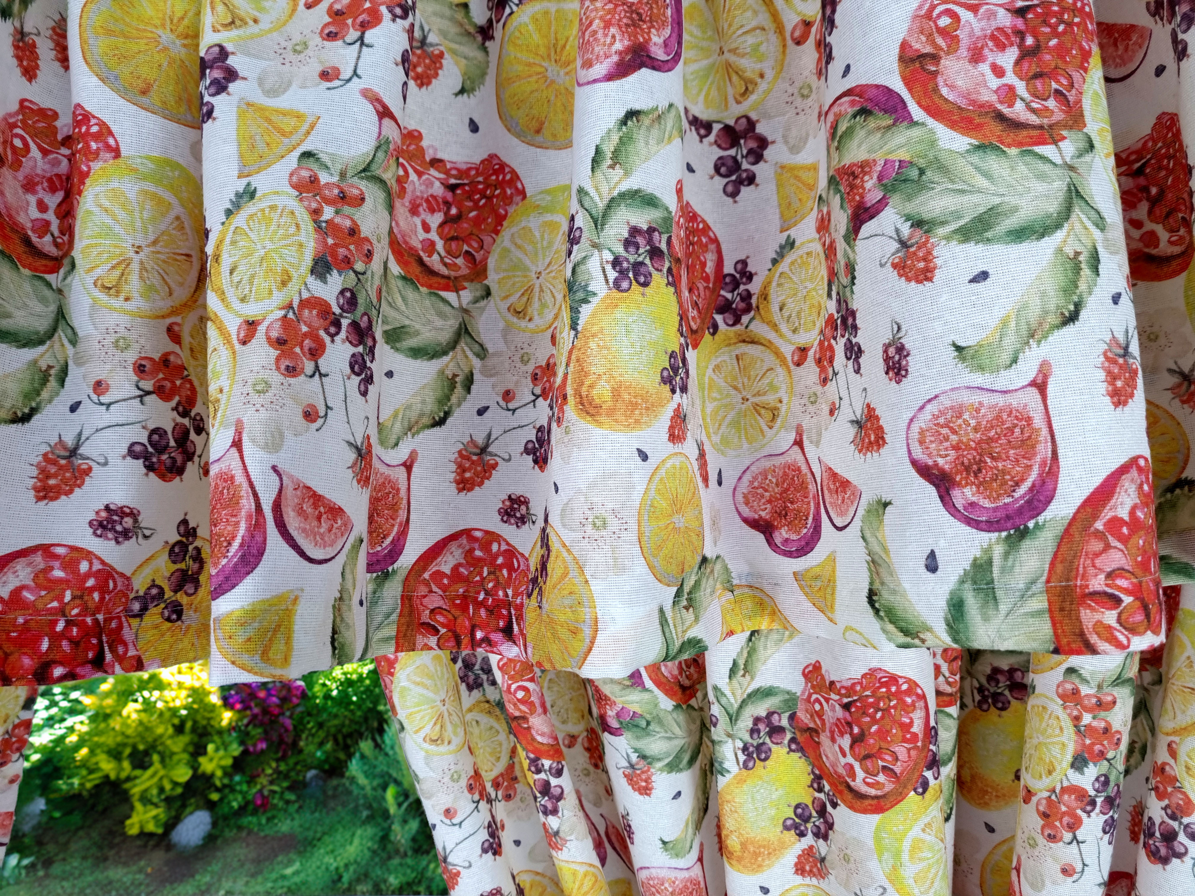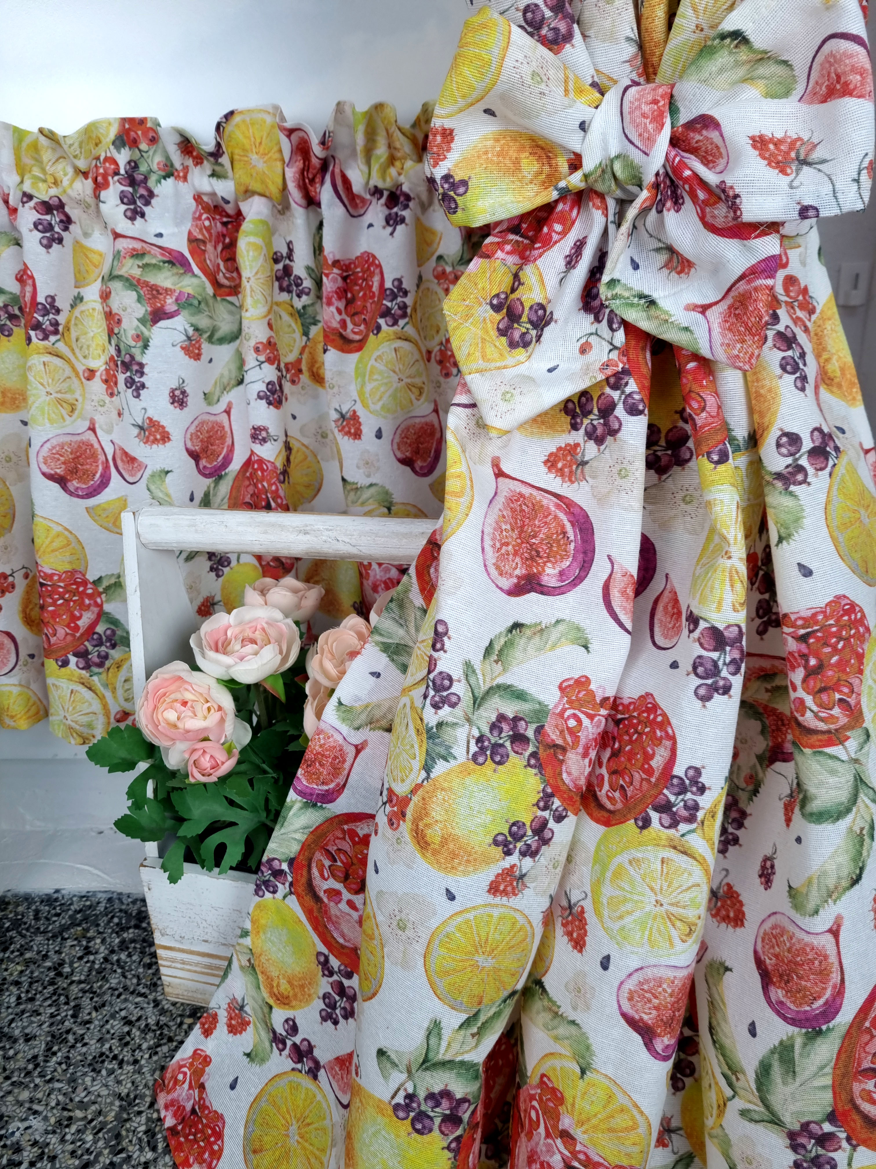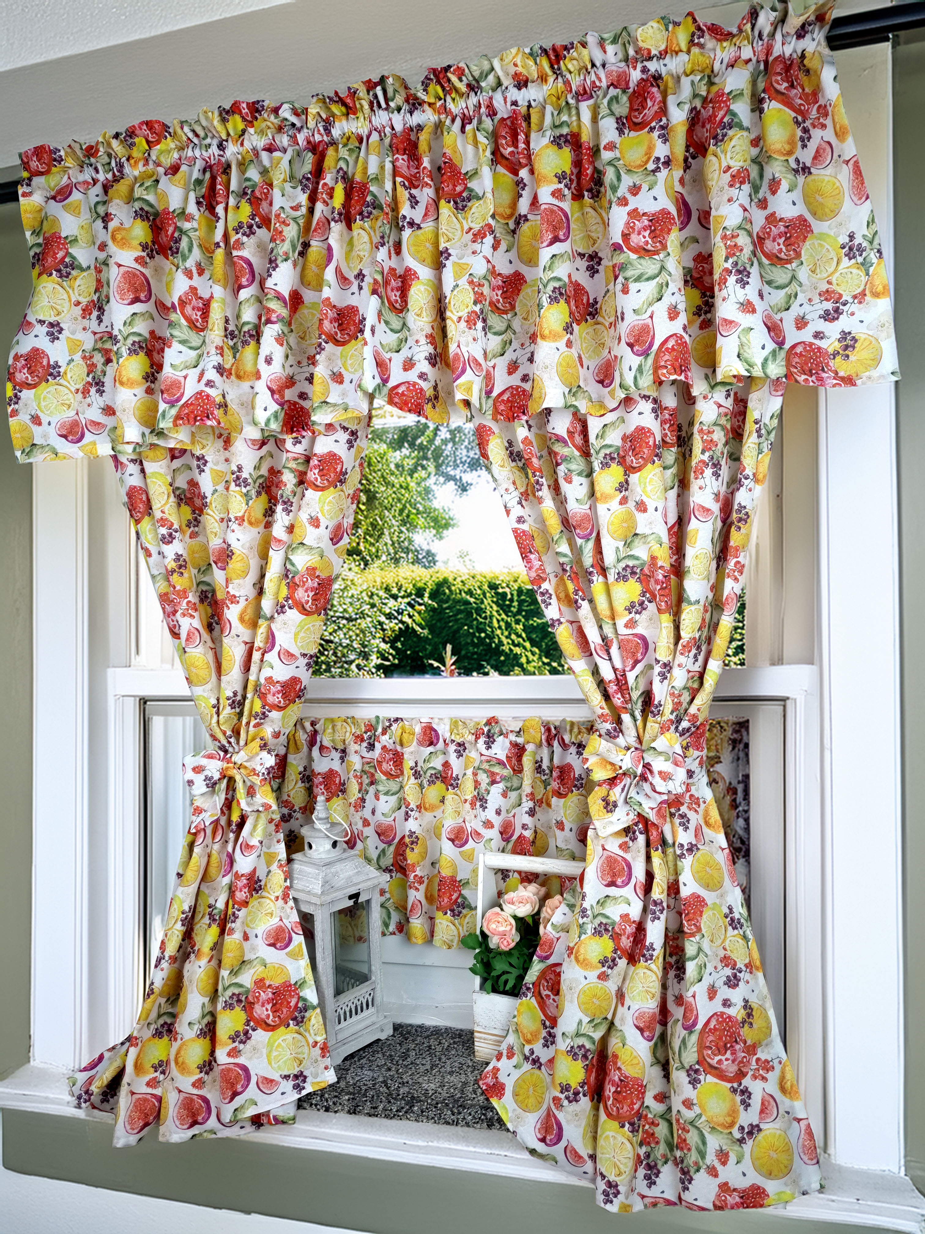 Zapraszam Państwa do zakupu kompletu w owocowy wzór cytryny granaty. Wzór tkaniny jednostronny. Komplet to 2 sztuki zasłonek oraz wstążki do wiązania zasłonek plus lambrekin i zazdrostka. Zasłony i lambrekin mają wszytą taśmę marszczącą na karnisz z górną 4cm ryzą - grzywką.