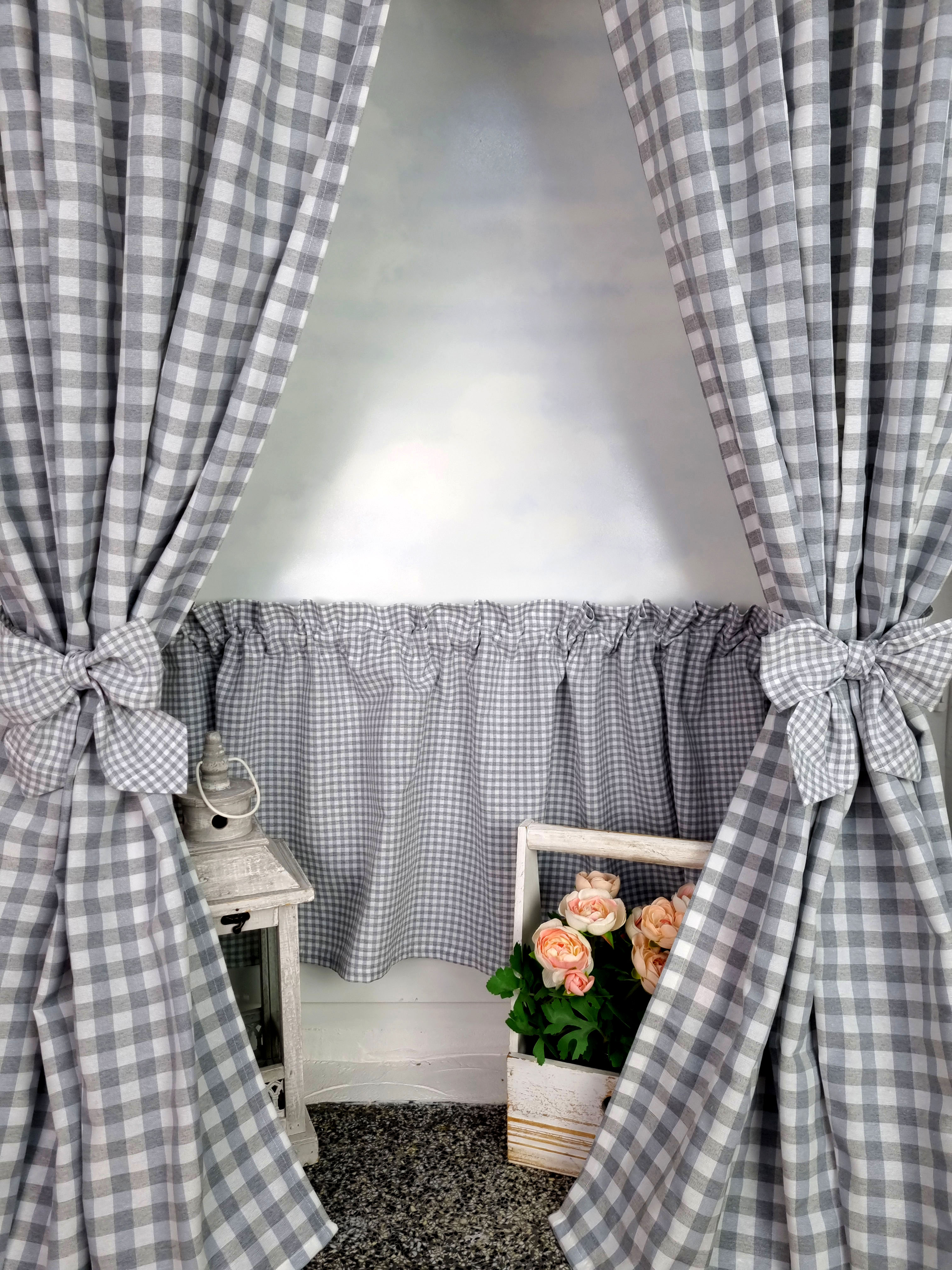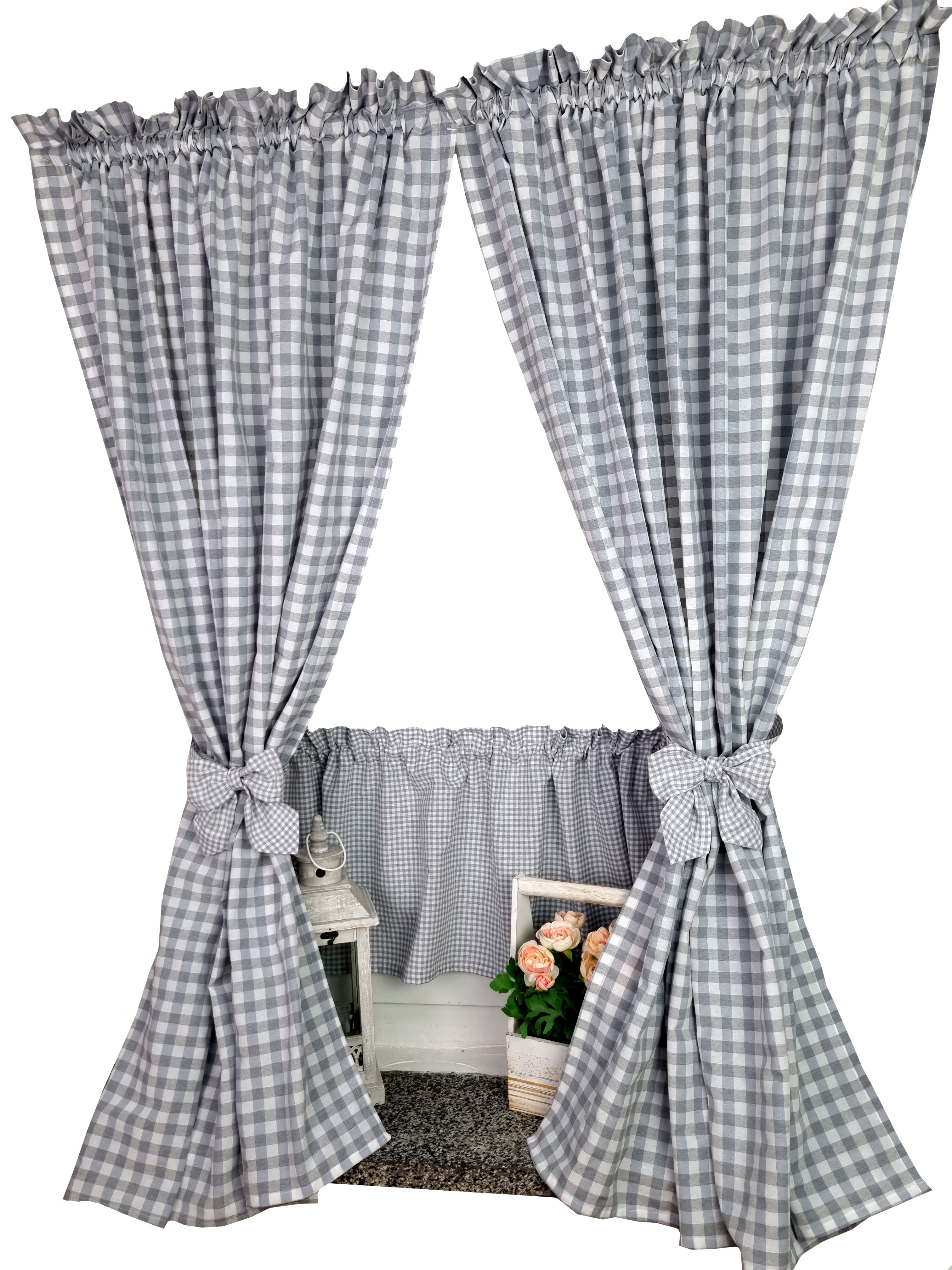 Komplet to dwie zasłonki na boki z wiązaniami oraz zazdrostka.