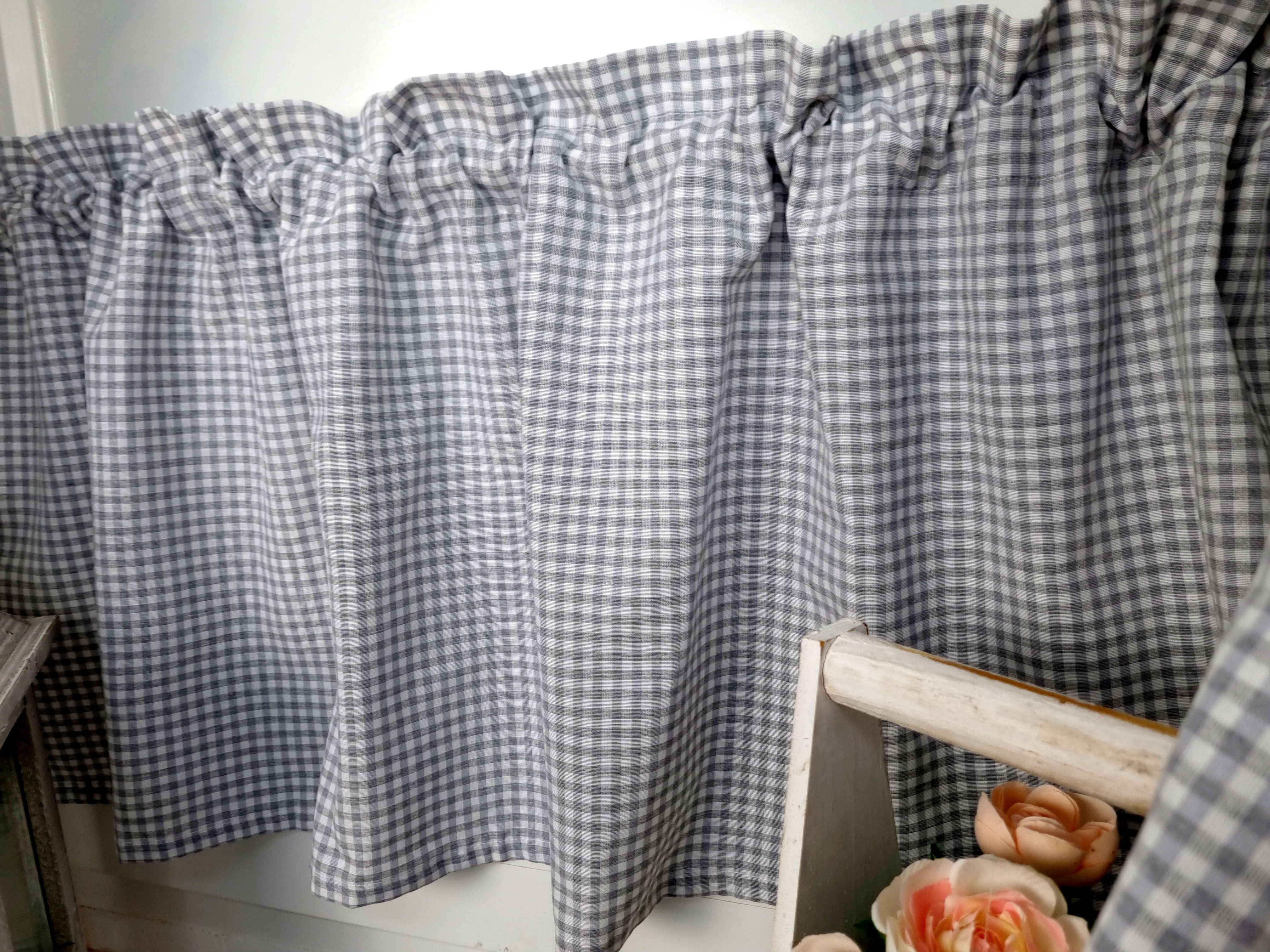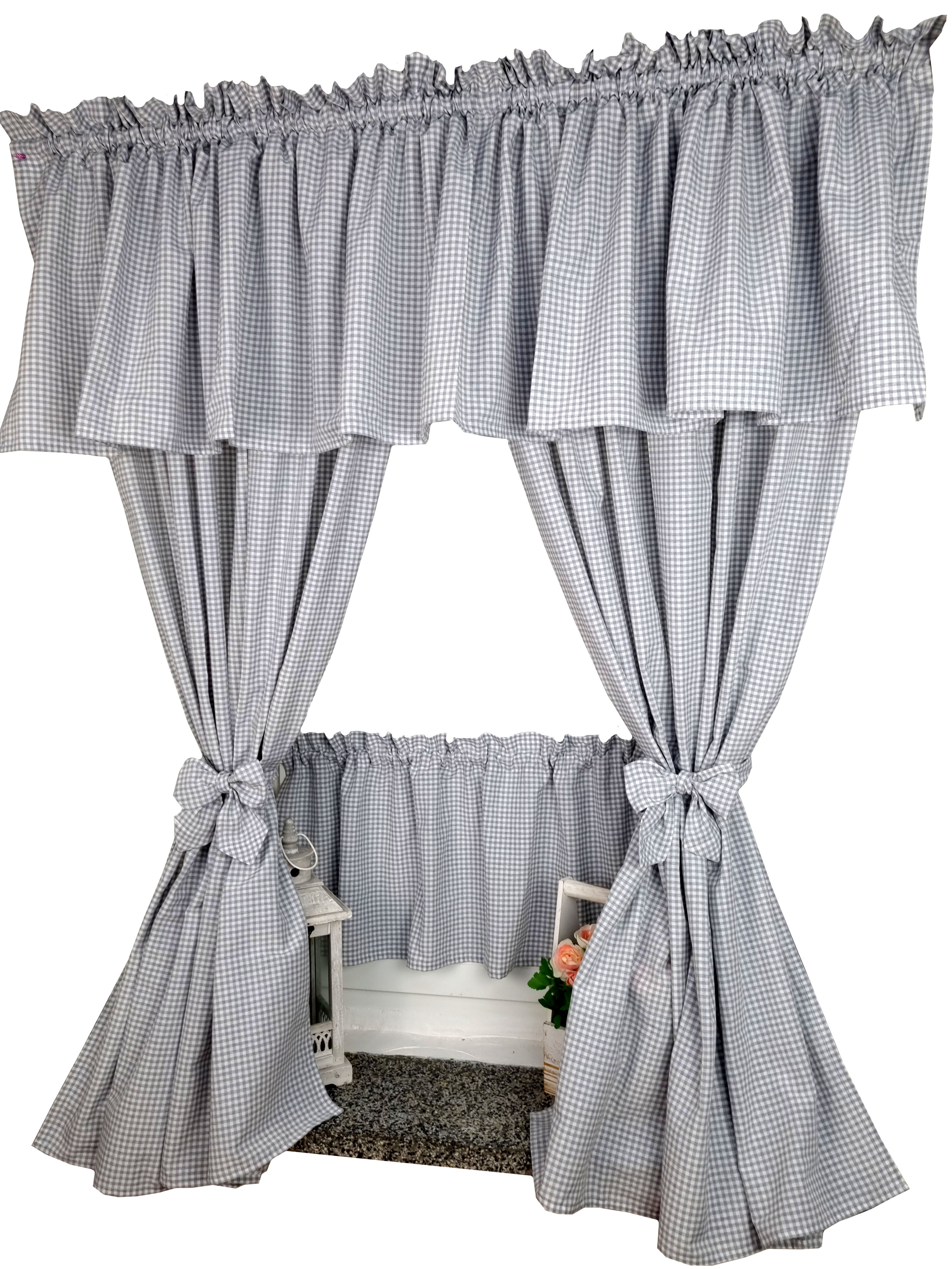 Zapraszam Państwa do zakupu kompletu w szarą krateczkę vichy. Wzór tkaniny obustronny. Komplet to 2 sztuki zasłonek oraz wstążki do wiązania zasłonek plus lambrekin i zazdrostka. Zasłony i lambrekin mają wszytą taśmę marszczącą na karnisz z górną 4cm ryzą - grzywką.