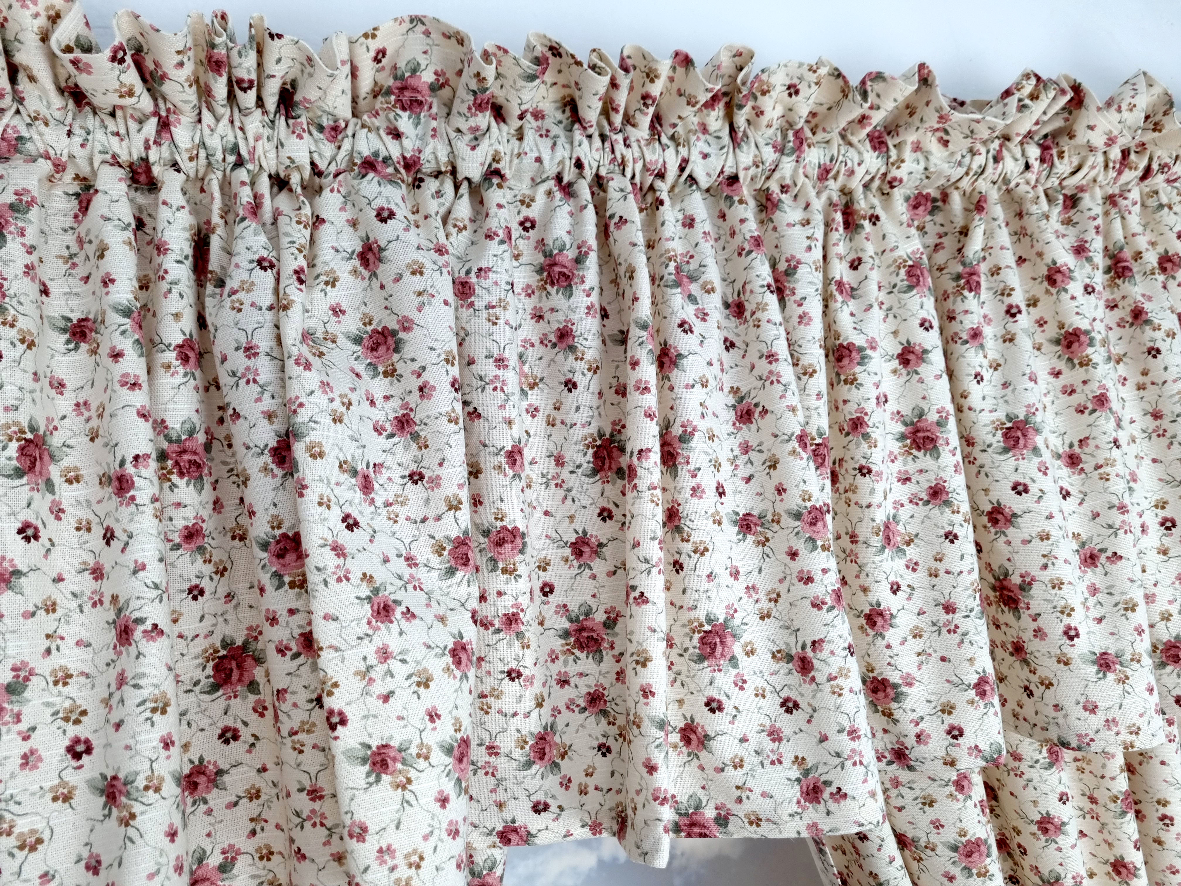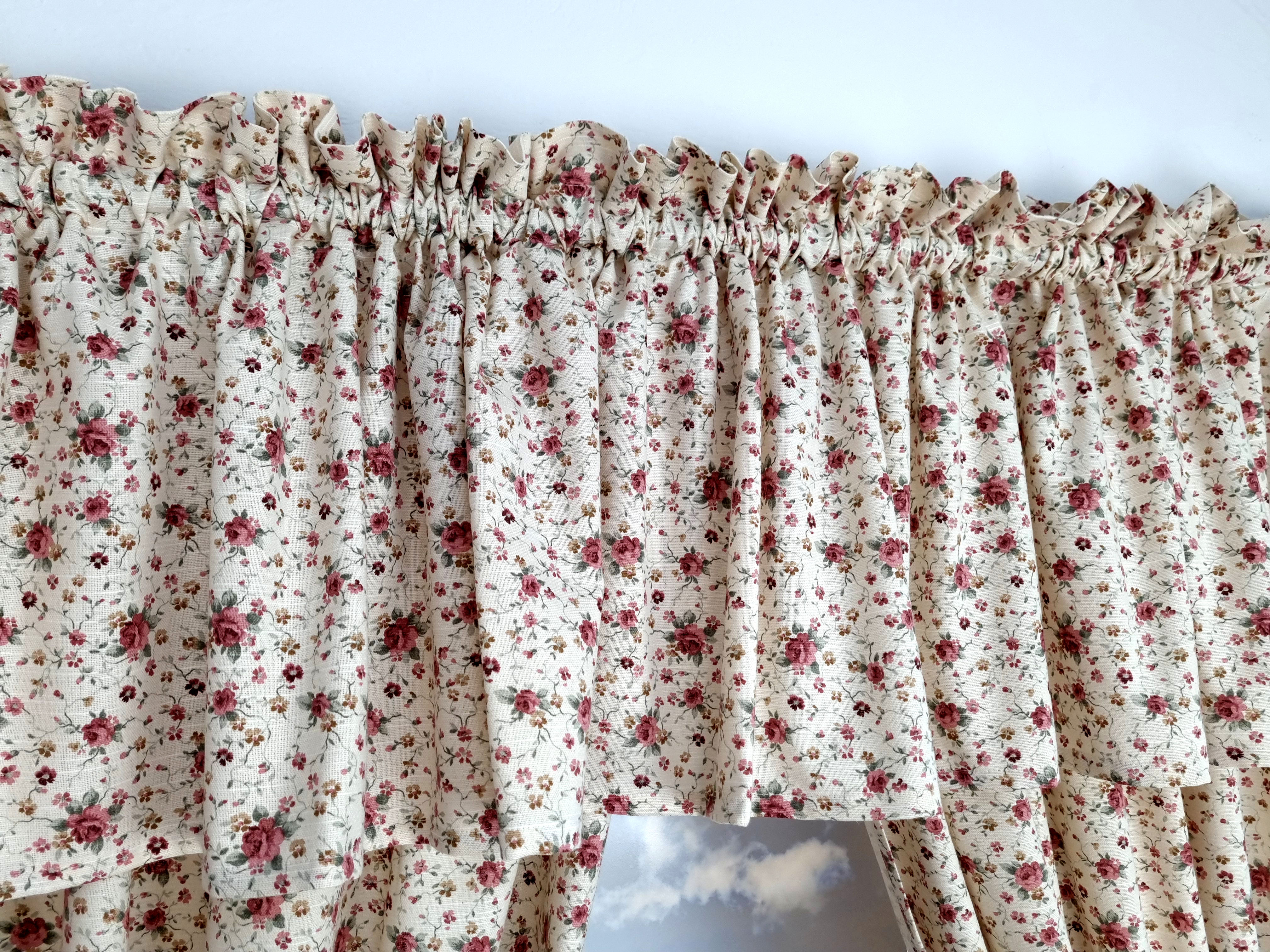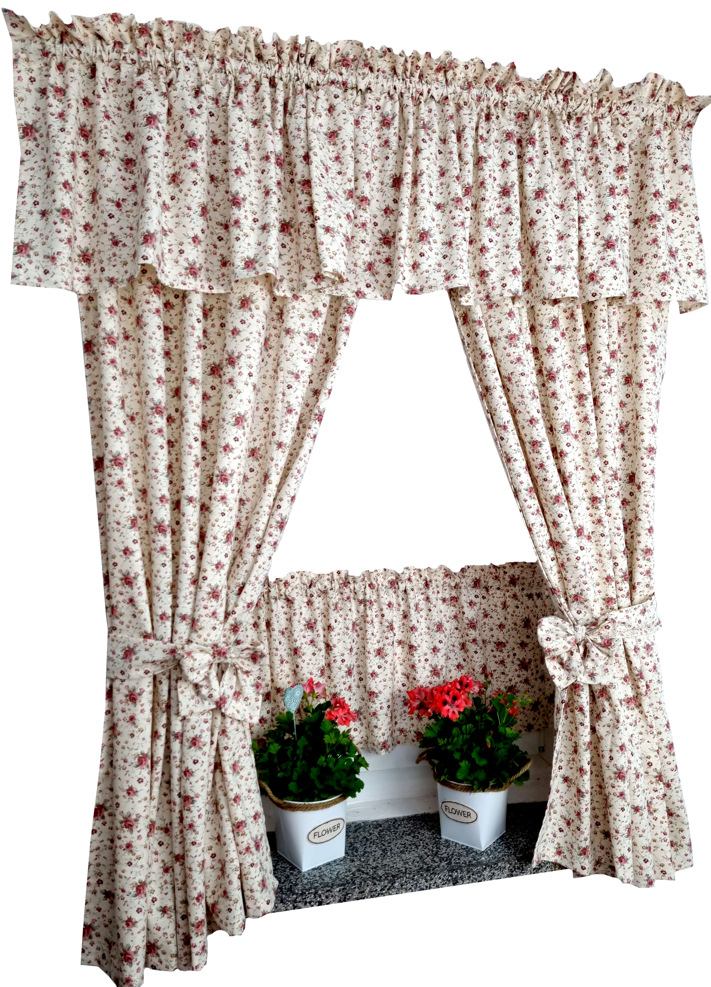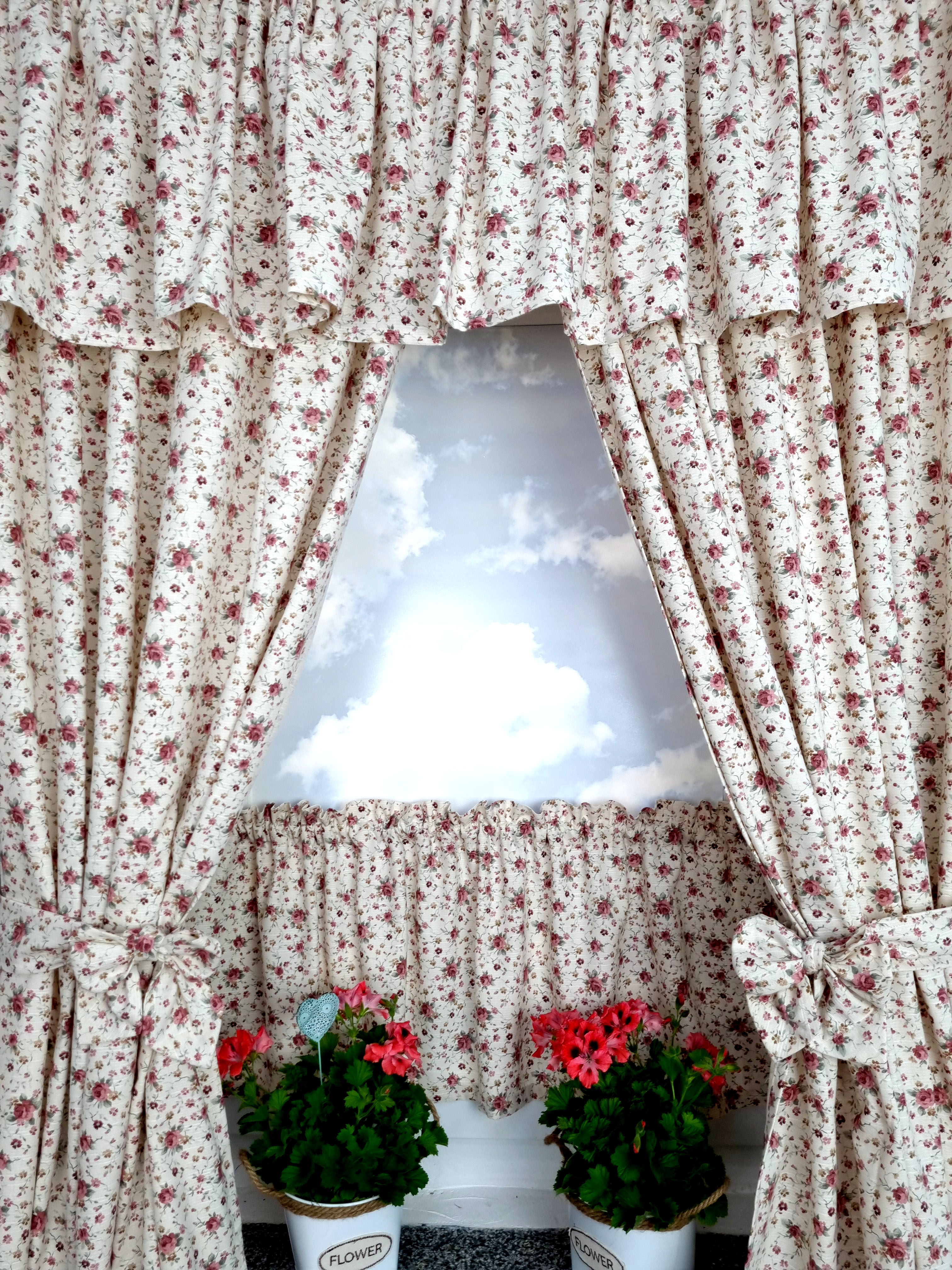 Zapraszam Państwa do zakupu kompletu w rustykalnym, prowansalskim stylu. Wzór tkaniny jednostronny, tkanina o lnianym splocie. Komplet to 2 sztuki zasłonek oraz wstążki do wiązania zasłonek plus lambrekin i zazdrostka. Zasłony i lambrekin mają wszytą taśmę marszczącą na karnisz z górną 4cm ryzą - grzywką.