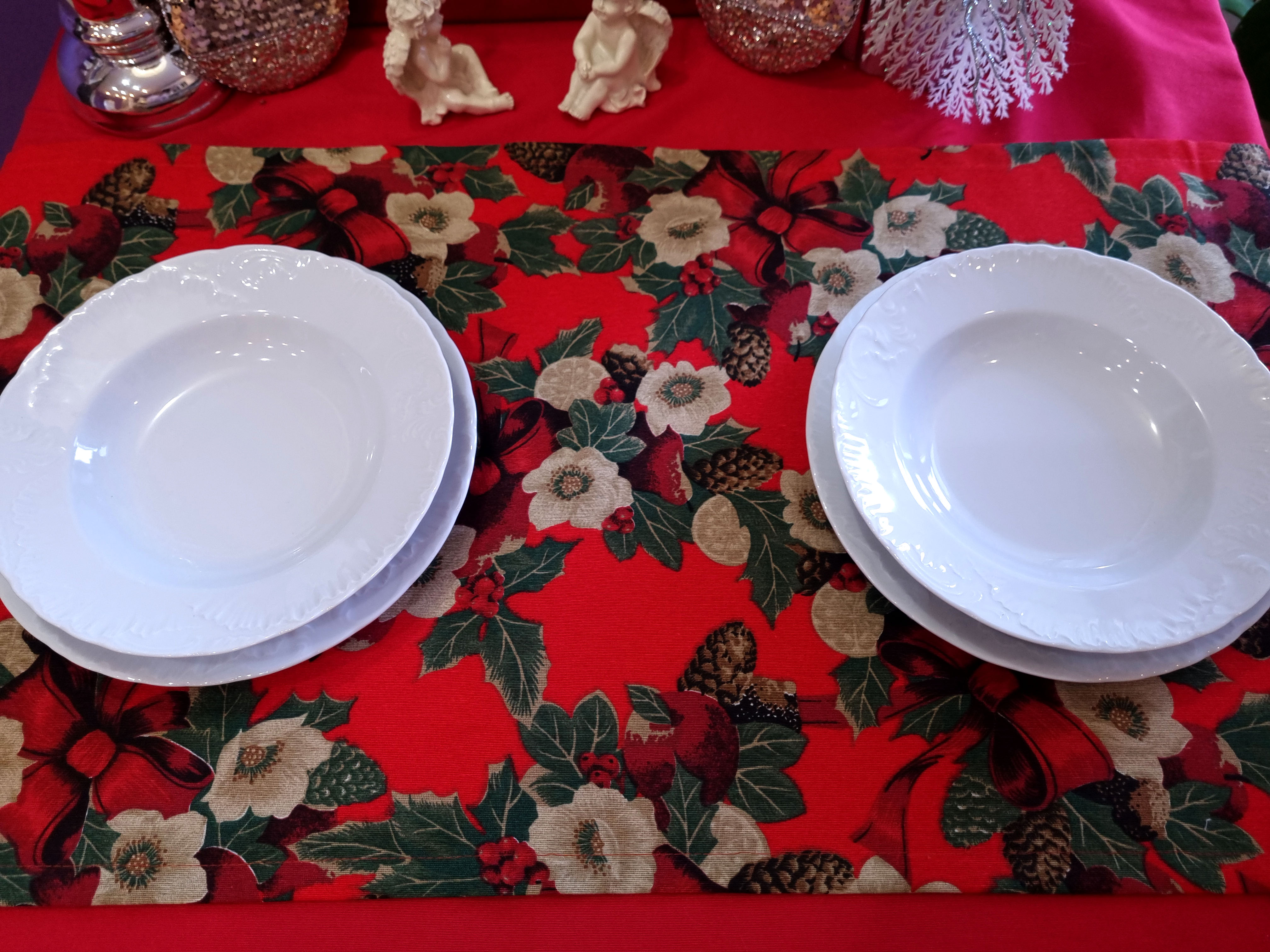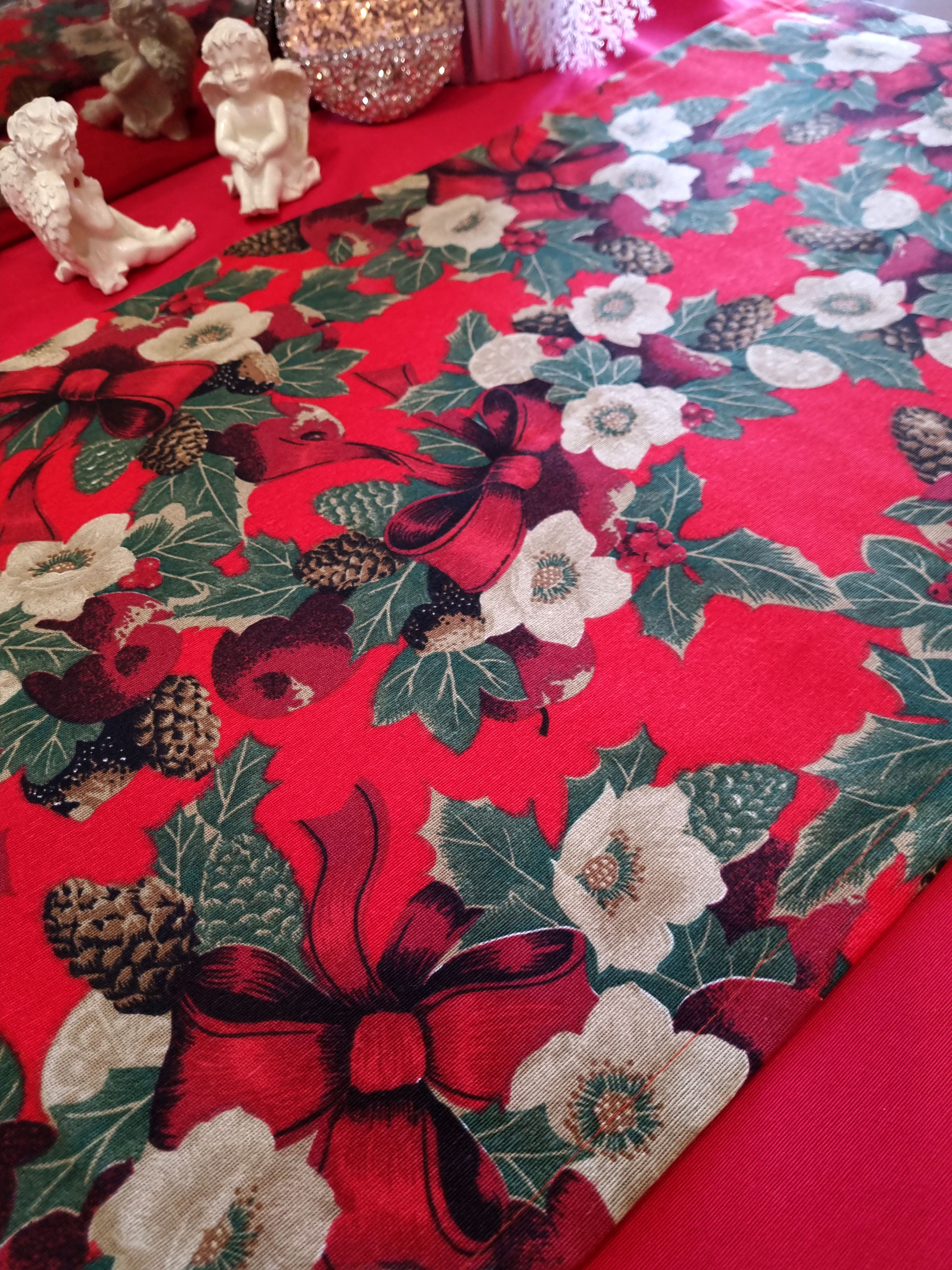 Mam Państwu do zaoferowania obrus z pięknym wzorem świątecznym w głębokim czerwonym kolorze.