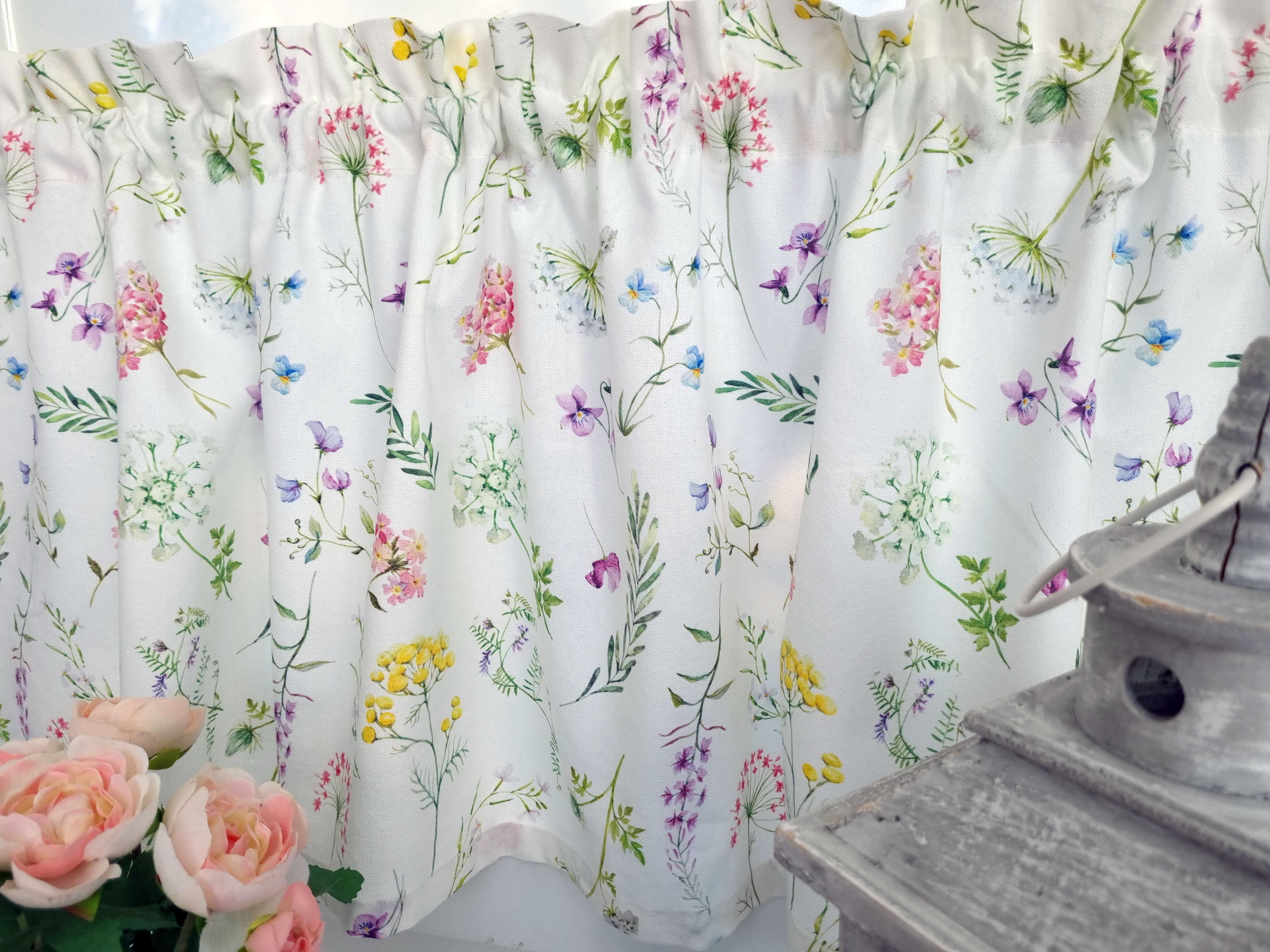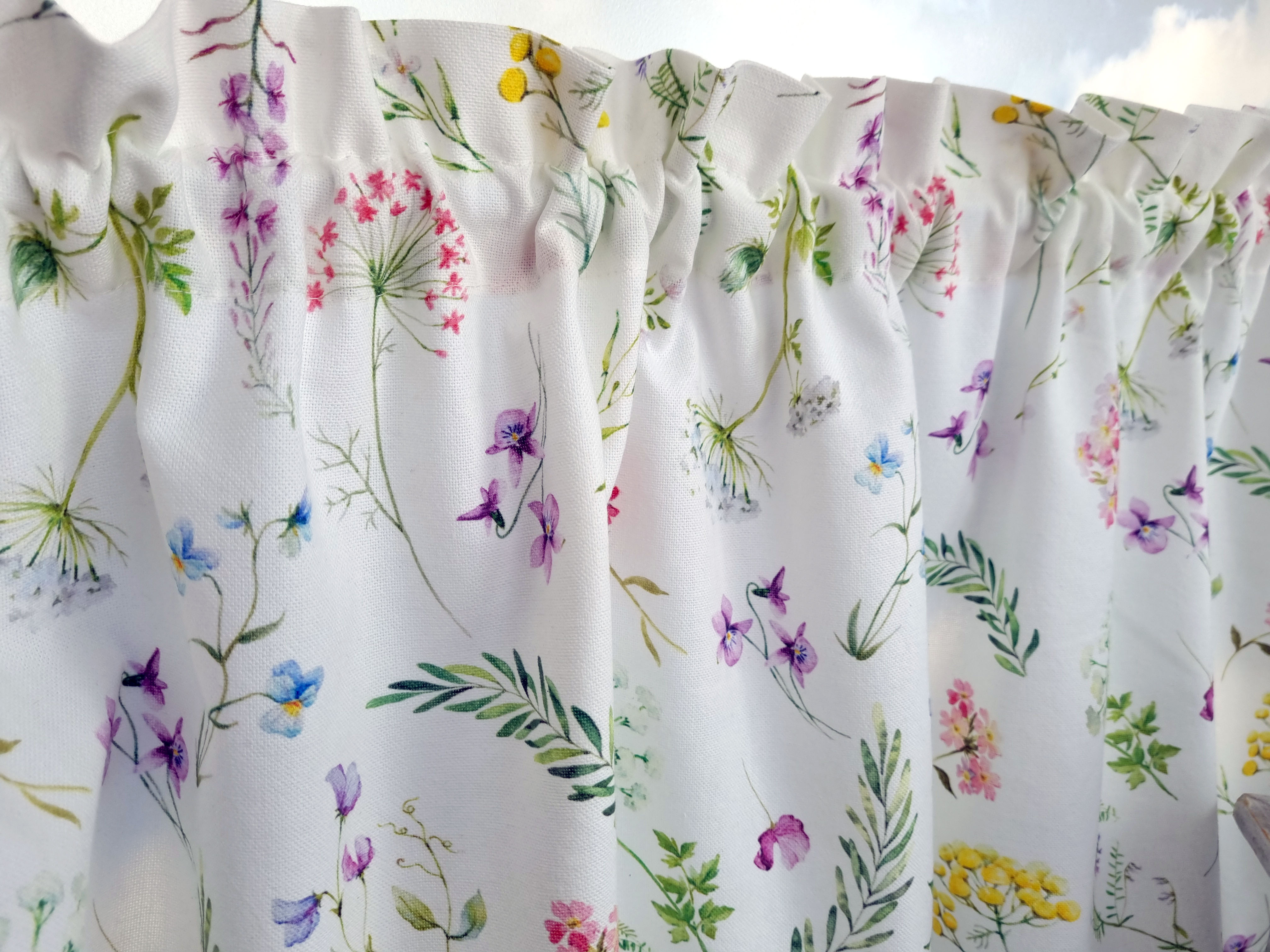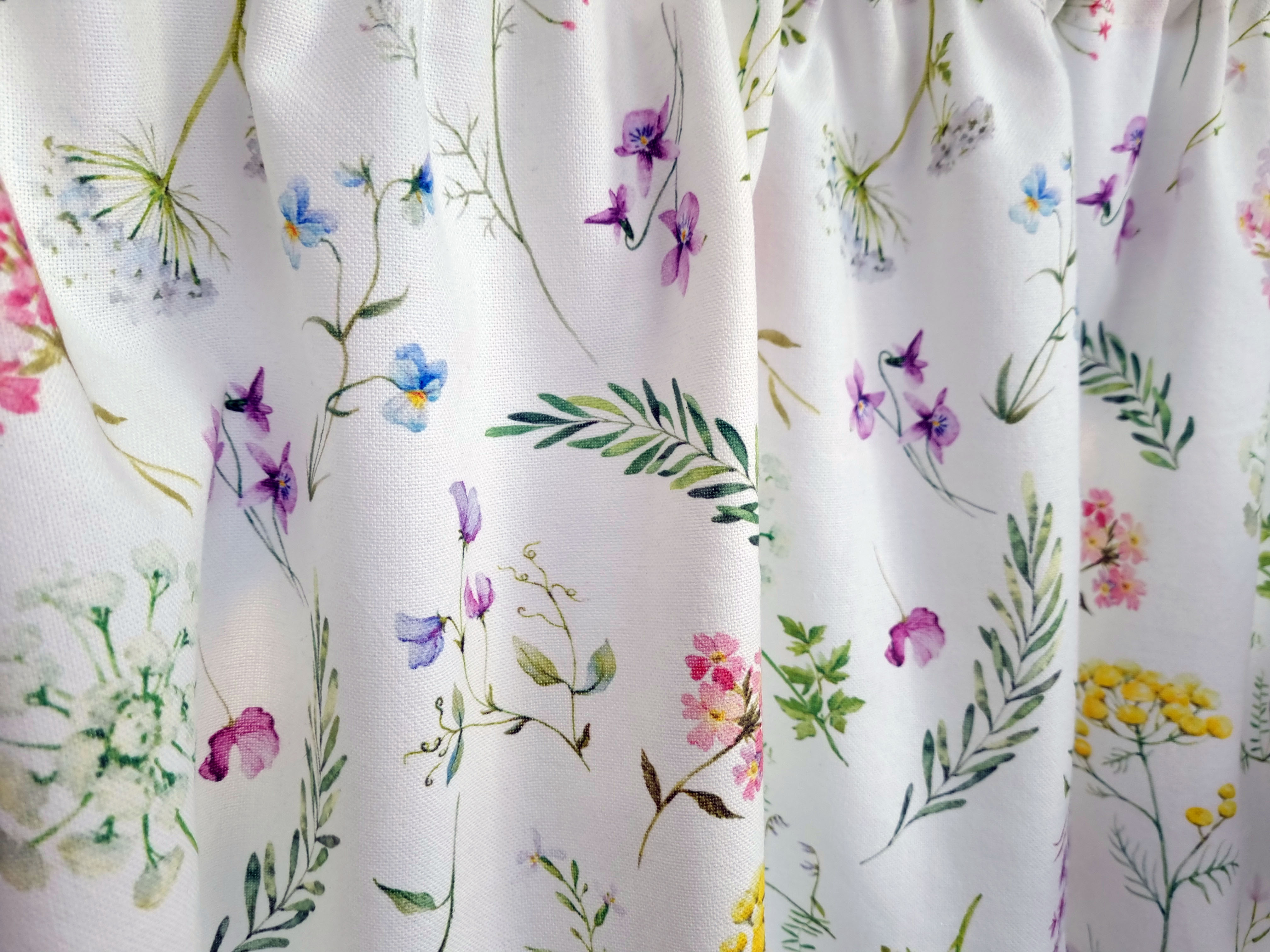 Zapraszam do zakupu zazdrostek pięknym wzorze wiosennych kwiatuszków na białym tle. Szyte z tunelem na patyczek. Bardzo wdzięczny wzór prowansalski. Wzór zazdrostki jednostronny.