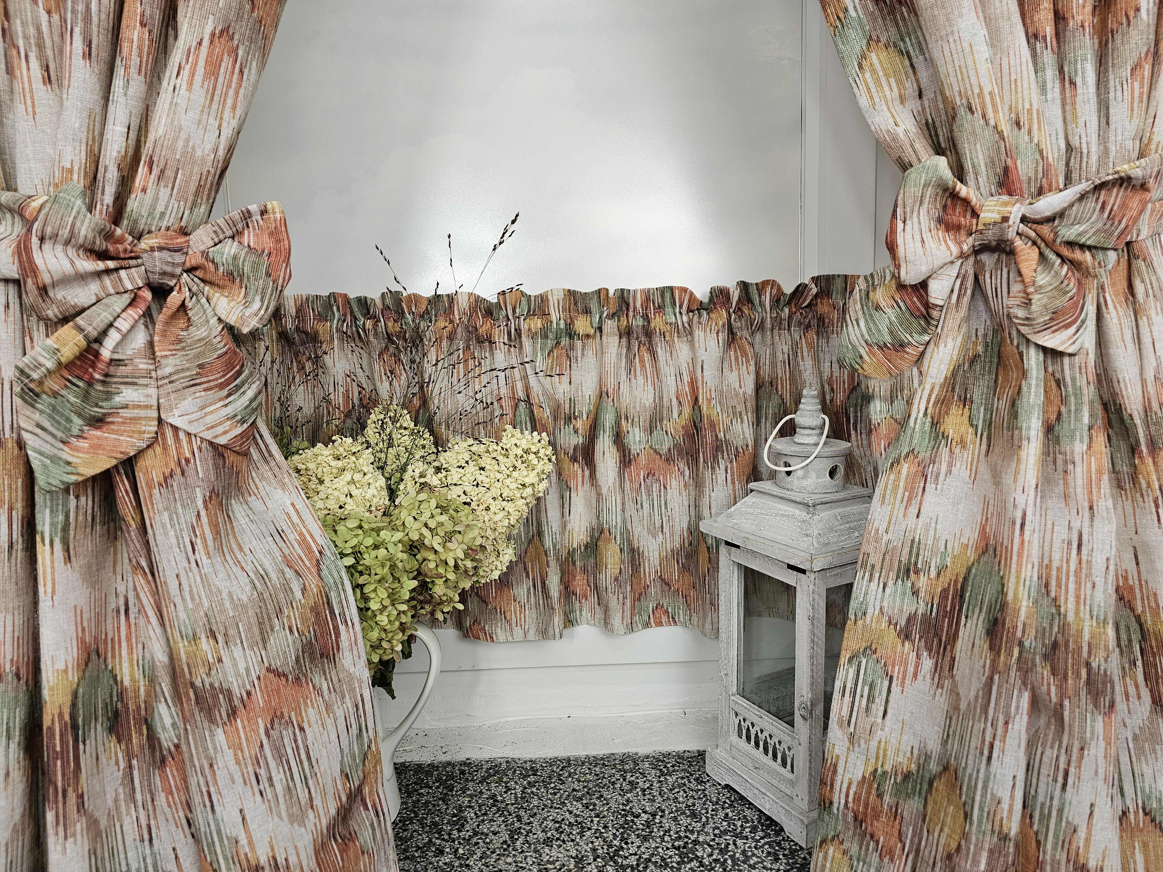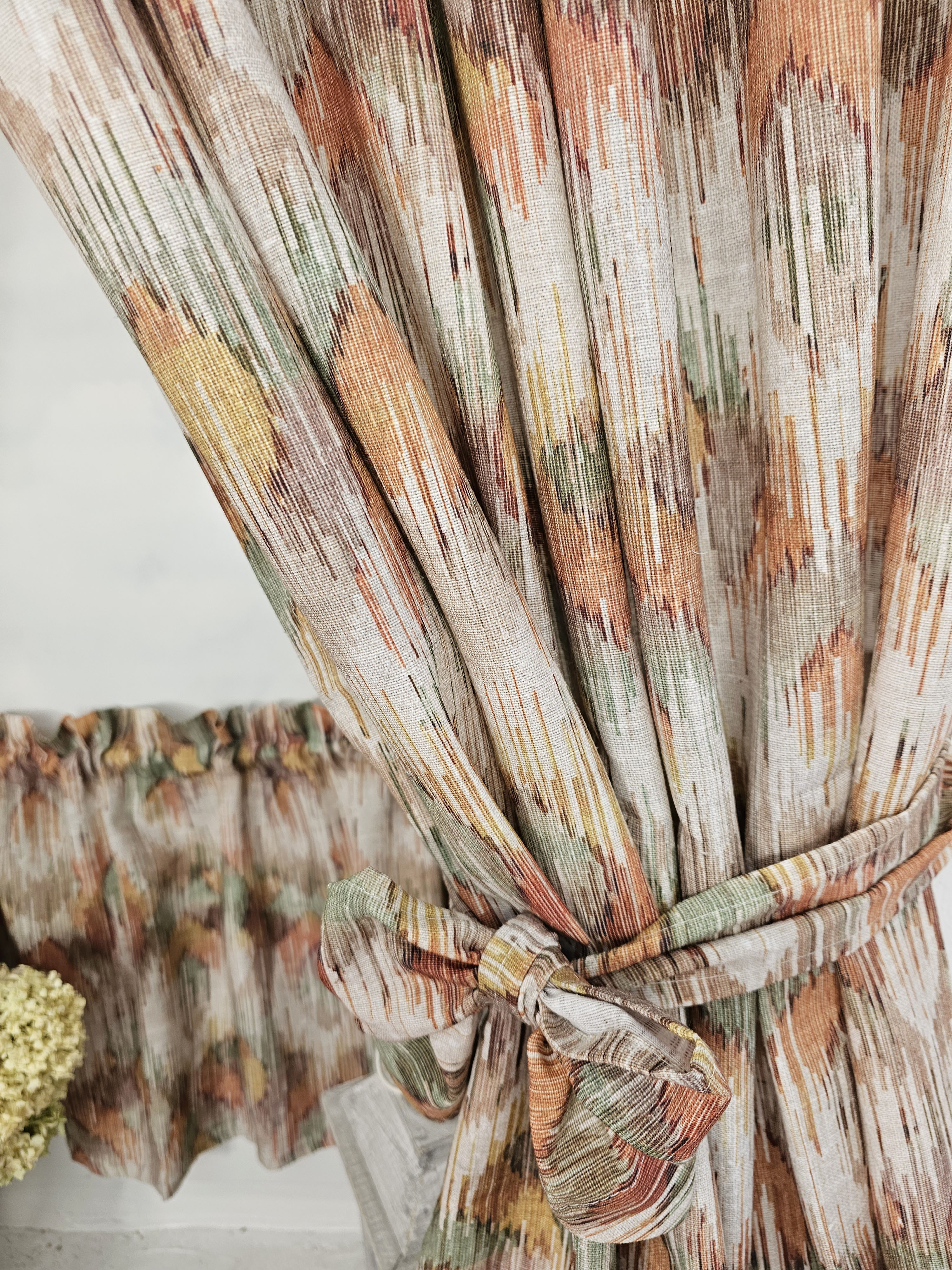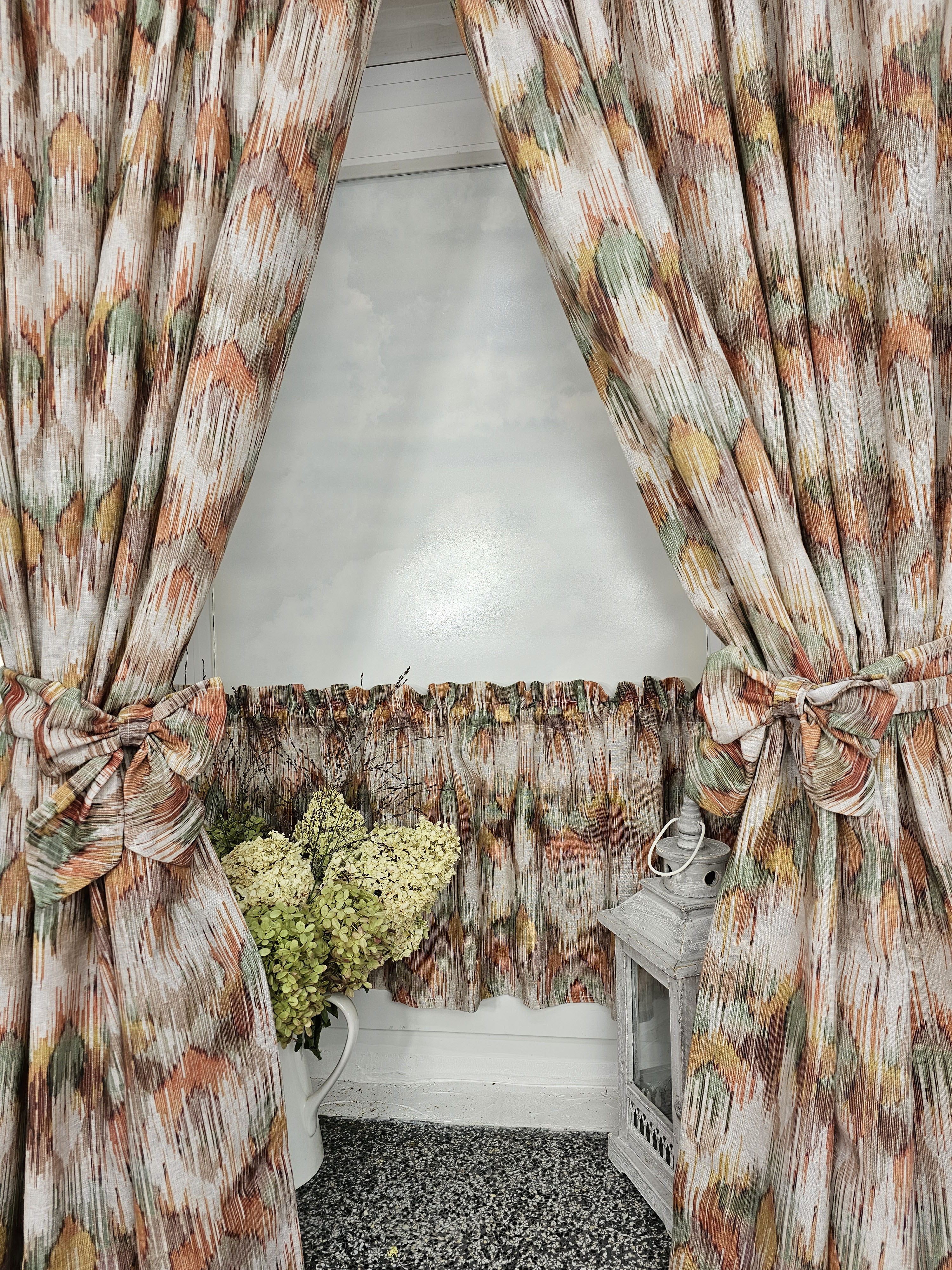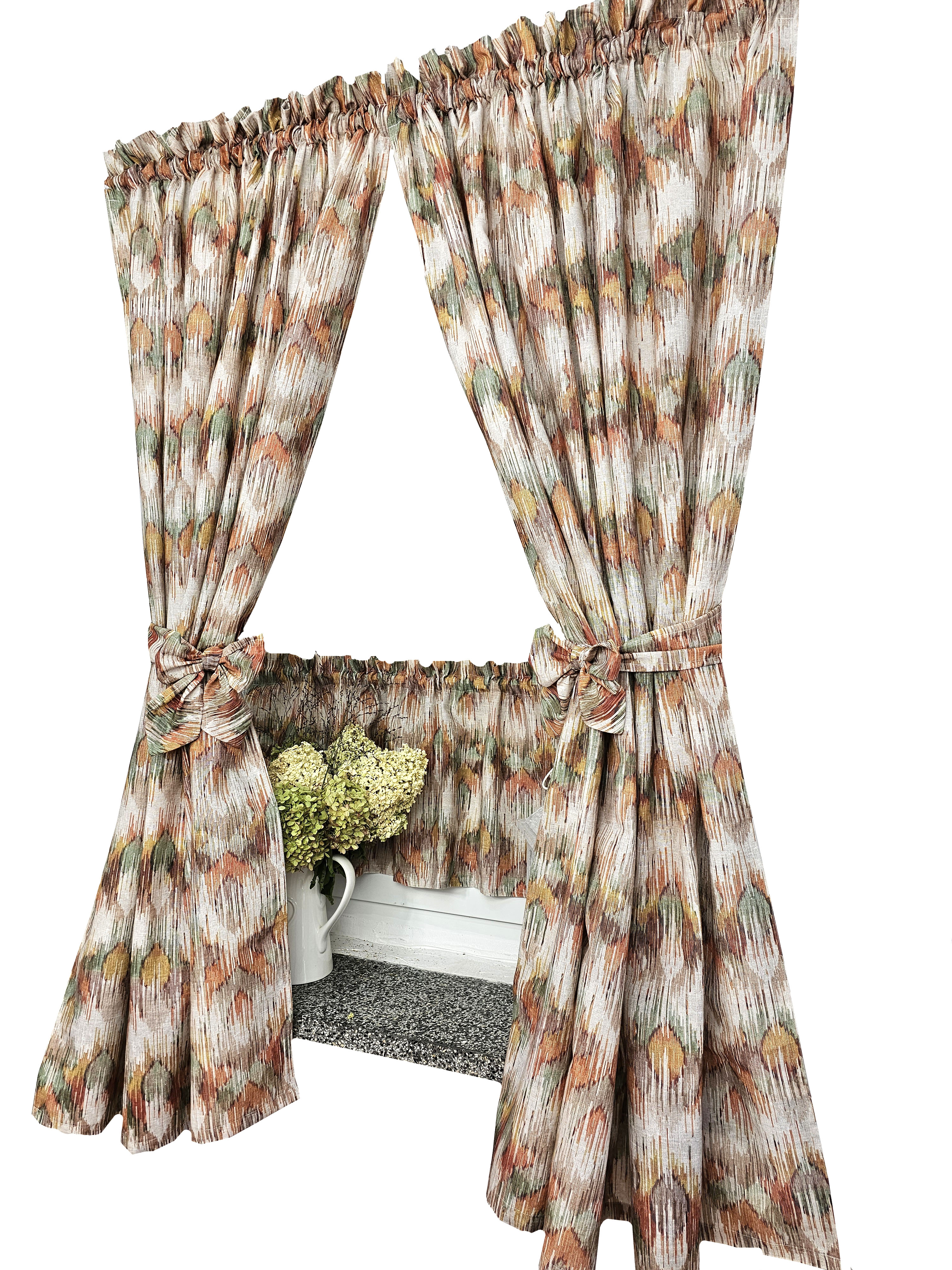 Komplet to dwie zasłonki na boki z wiązaniami oraz zazdrostka.