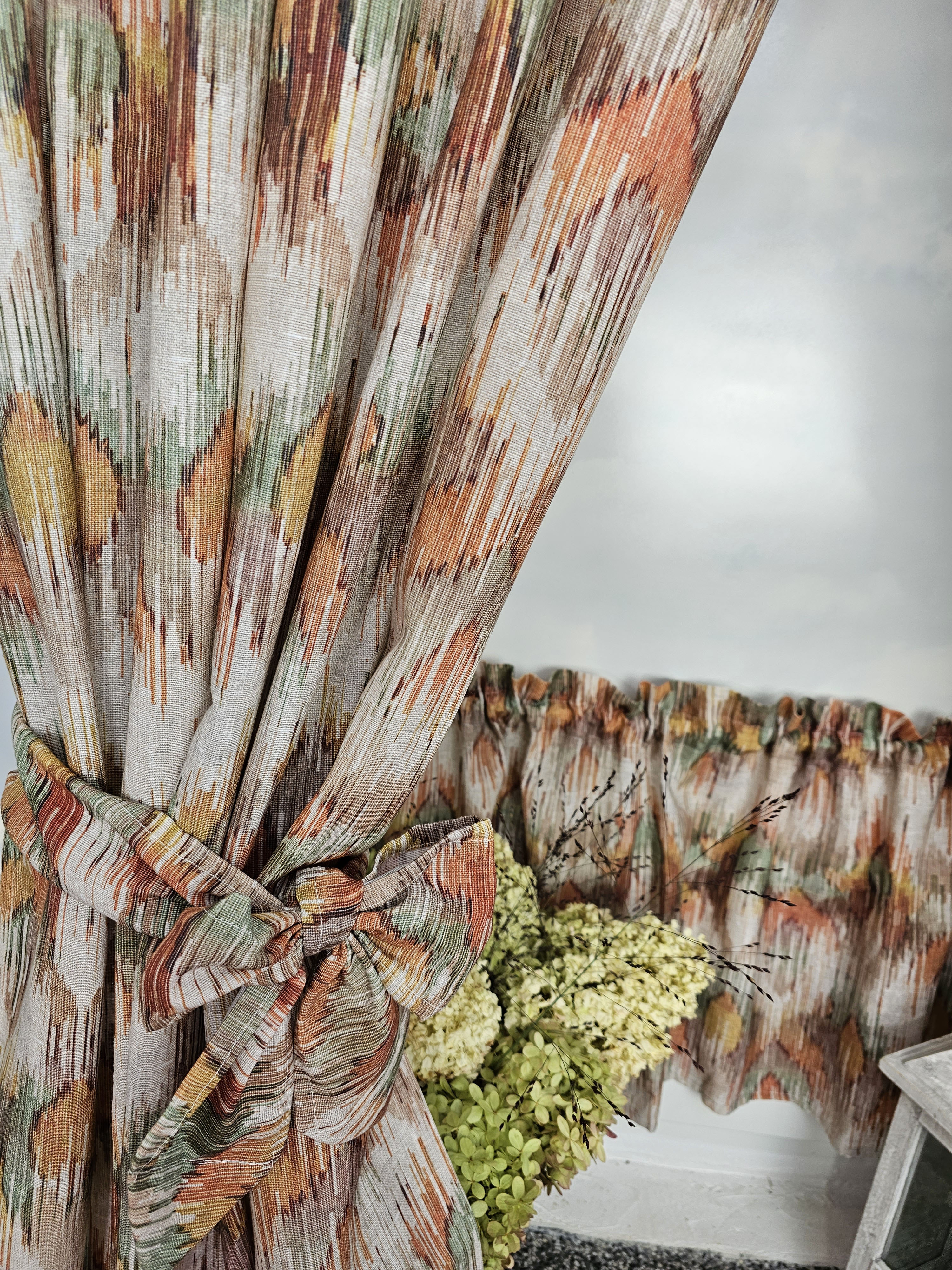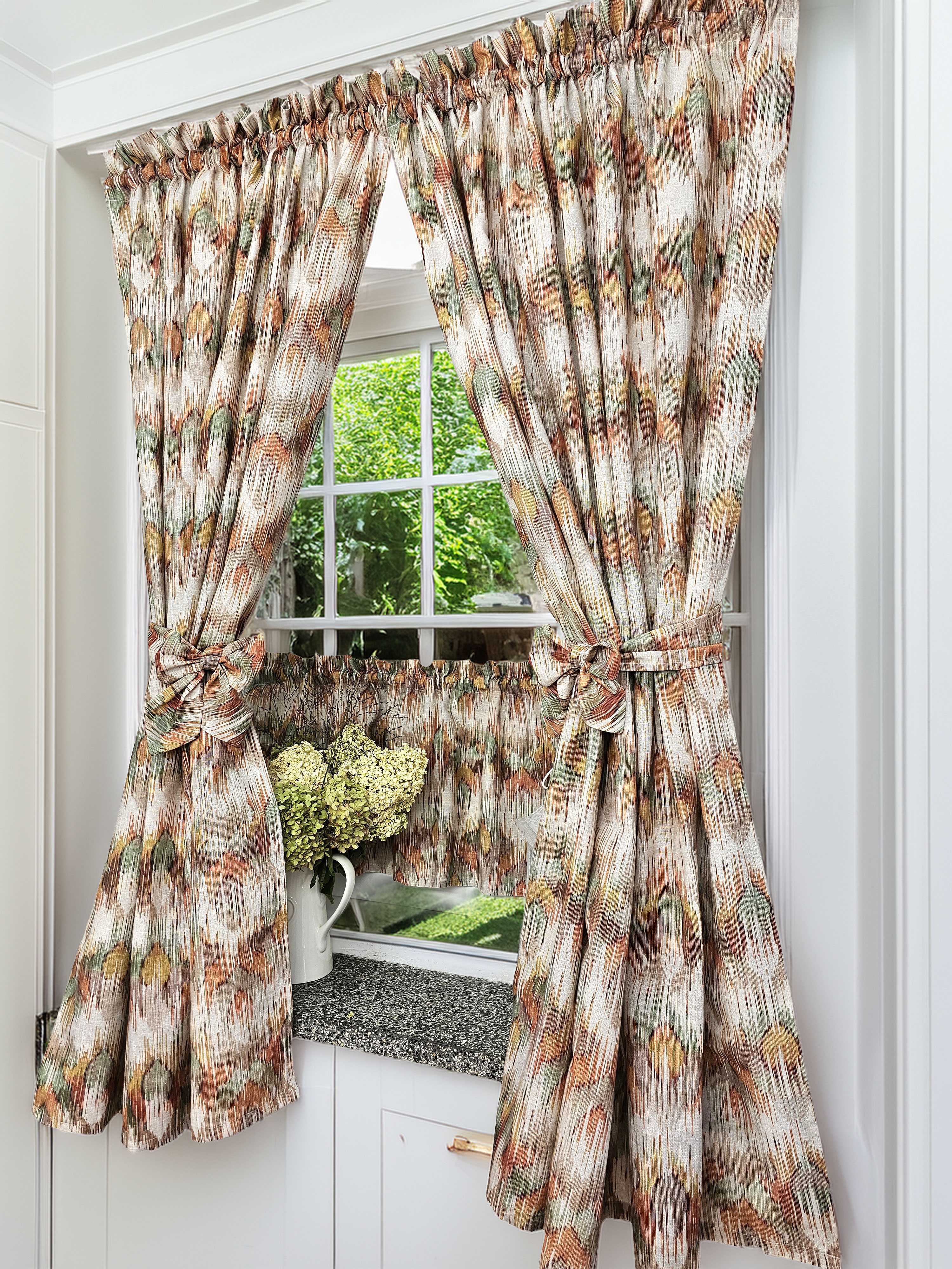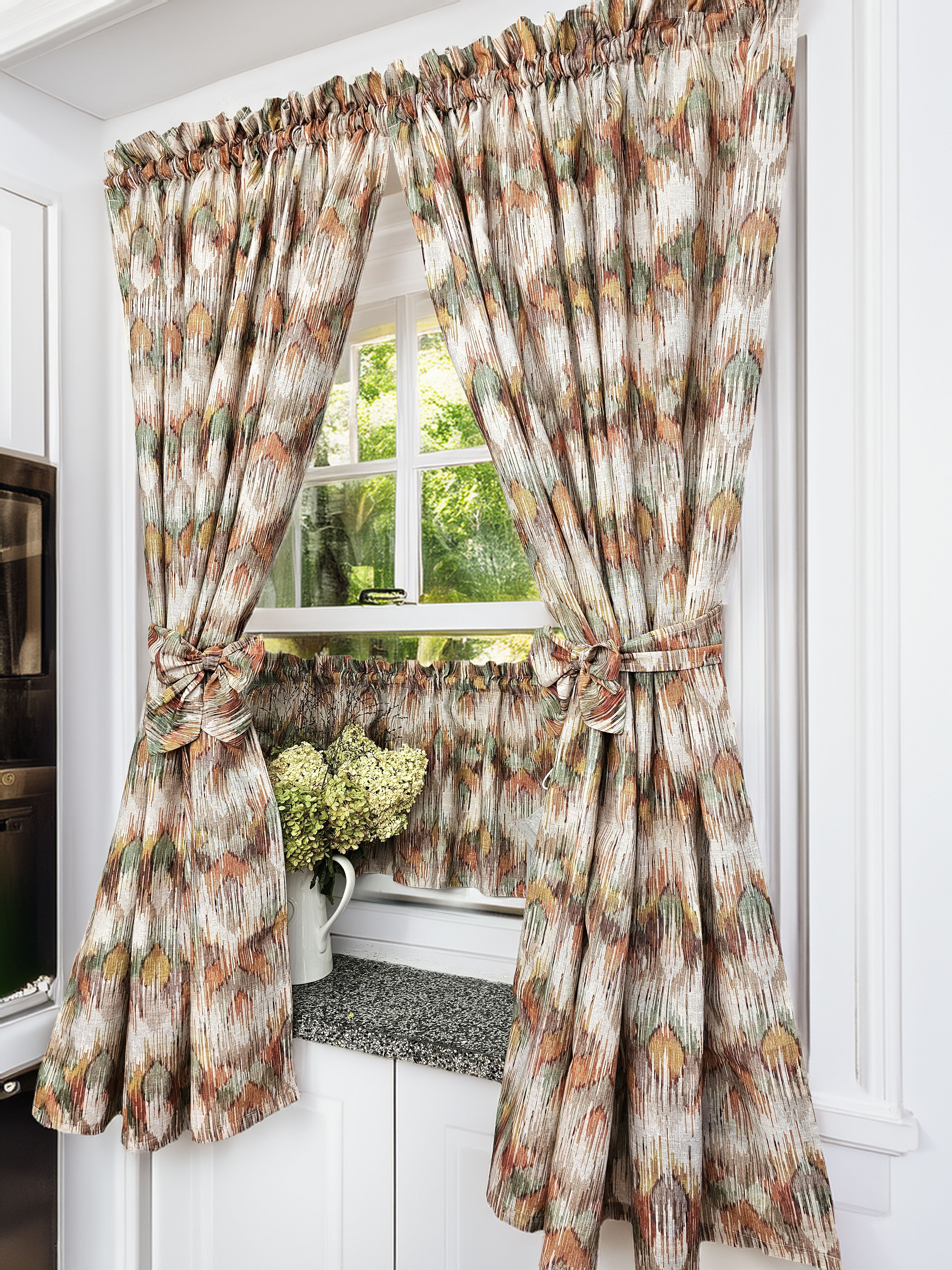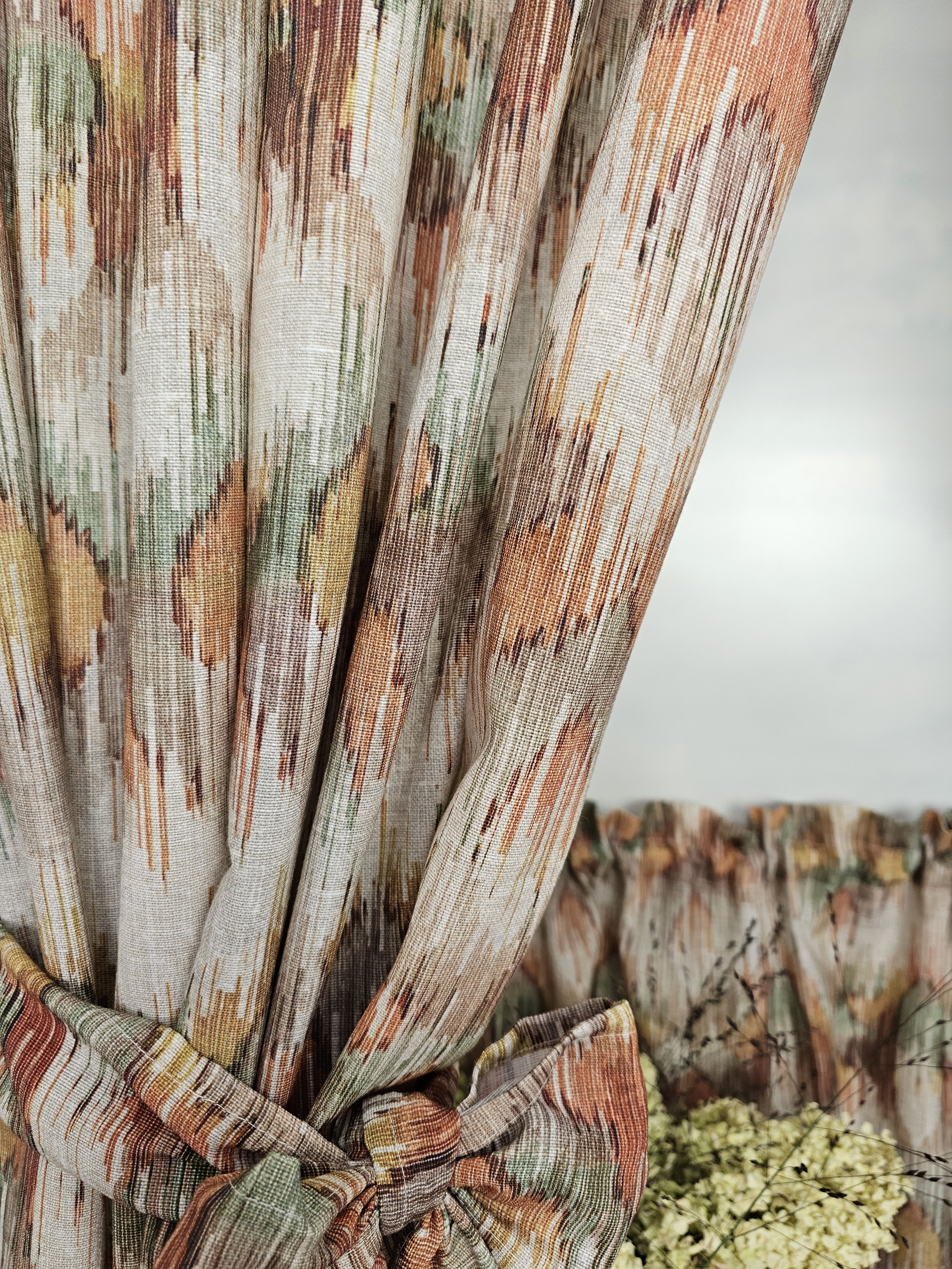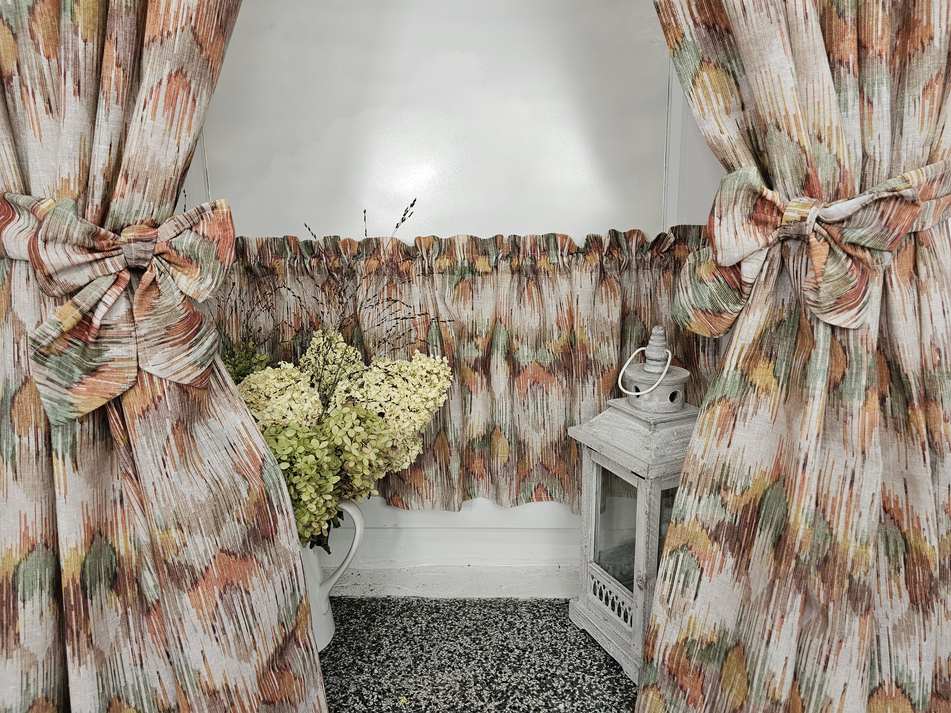 Komplet to dwie zasłonki na boki z wiązaniami oraz zazdrostka.