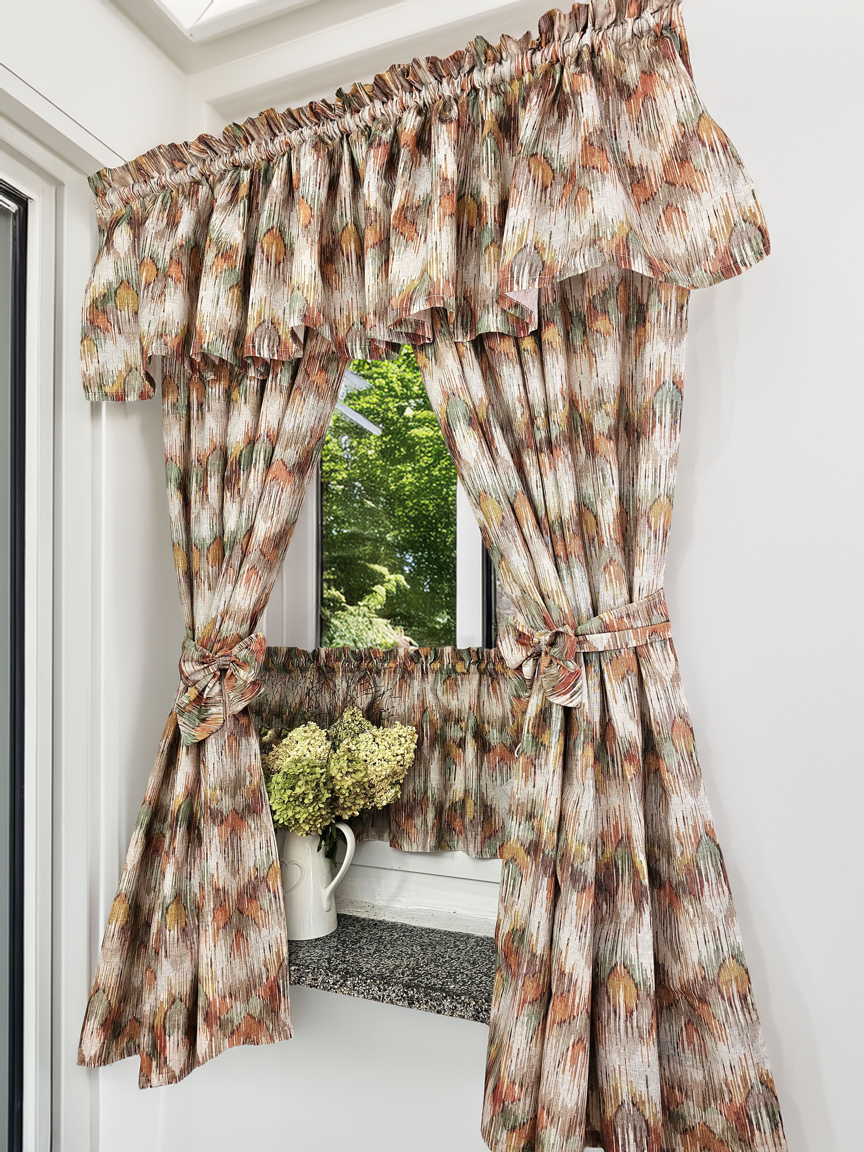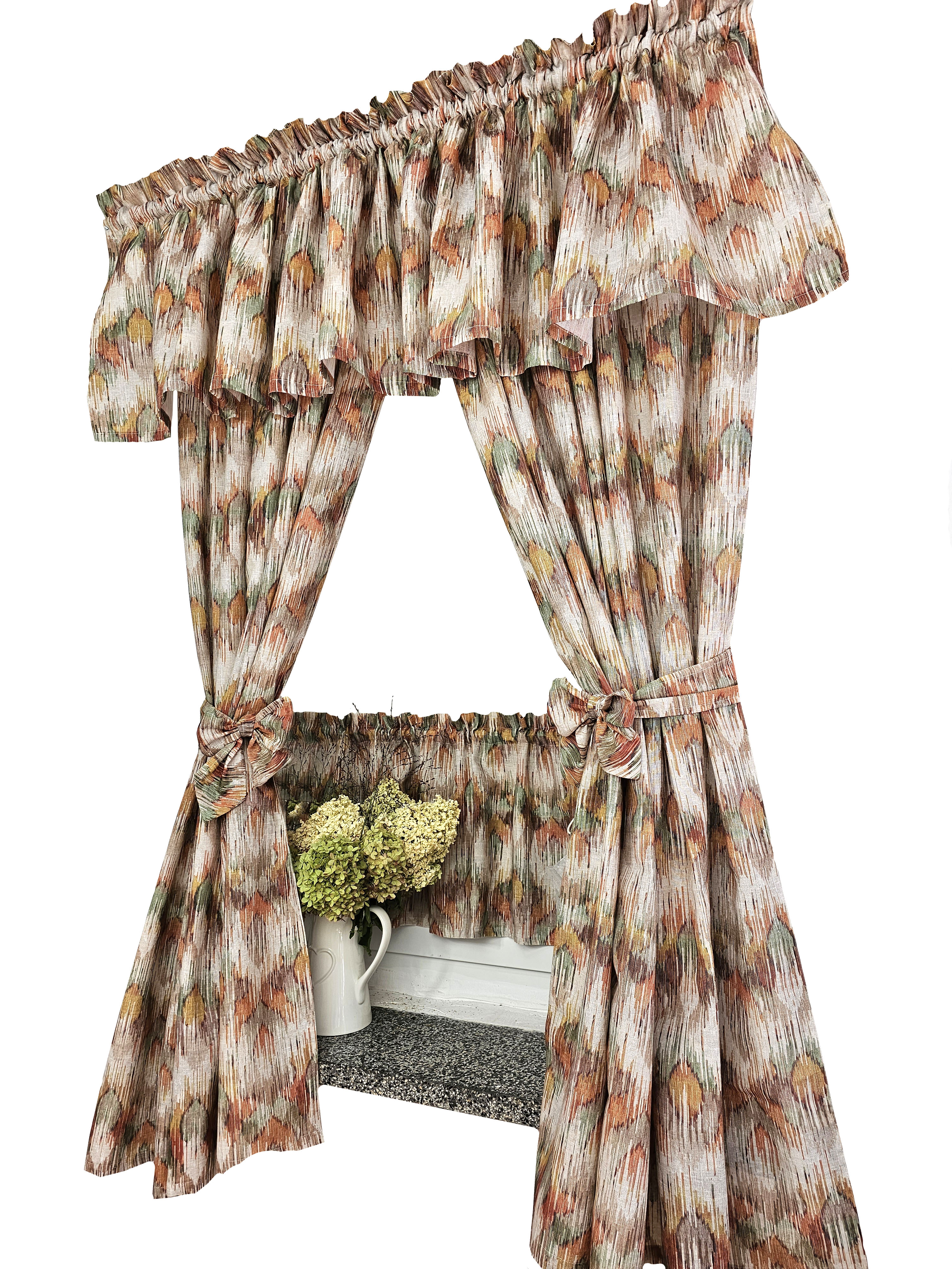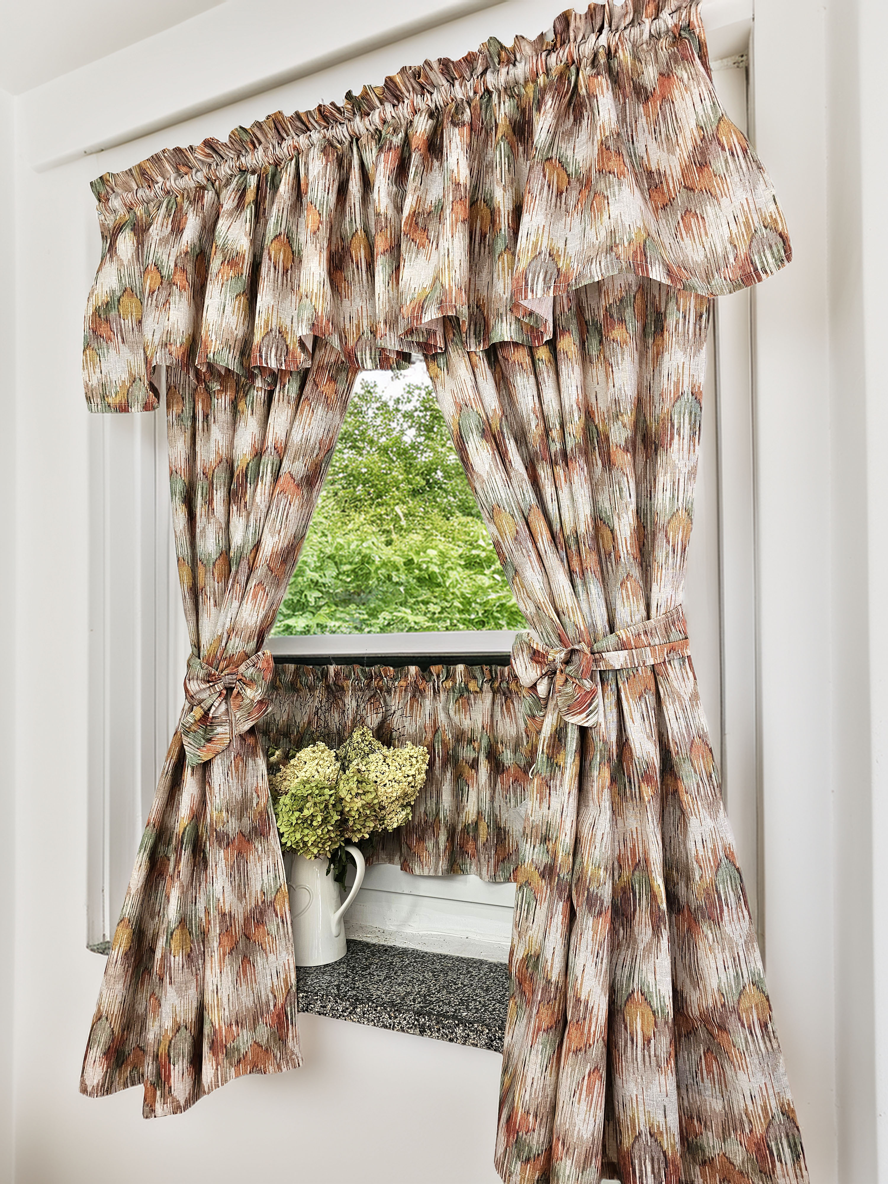 Zapraszam Państwa do zakupu kompletu w rustykalnym, prowansalskim stylu. Wzór tkaniny jednostronny . Komplet to 2 sztuki zasłonek oraz wstążki do wiązania zasłonek plus lambrekin i zazdrostka. Zasłony i lambrekin mają wszytą taśmę marszczącą na karnisz z górną 4cm ryzą - grzywką.