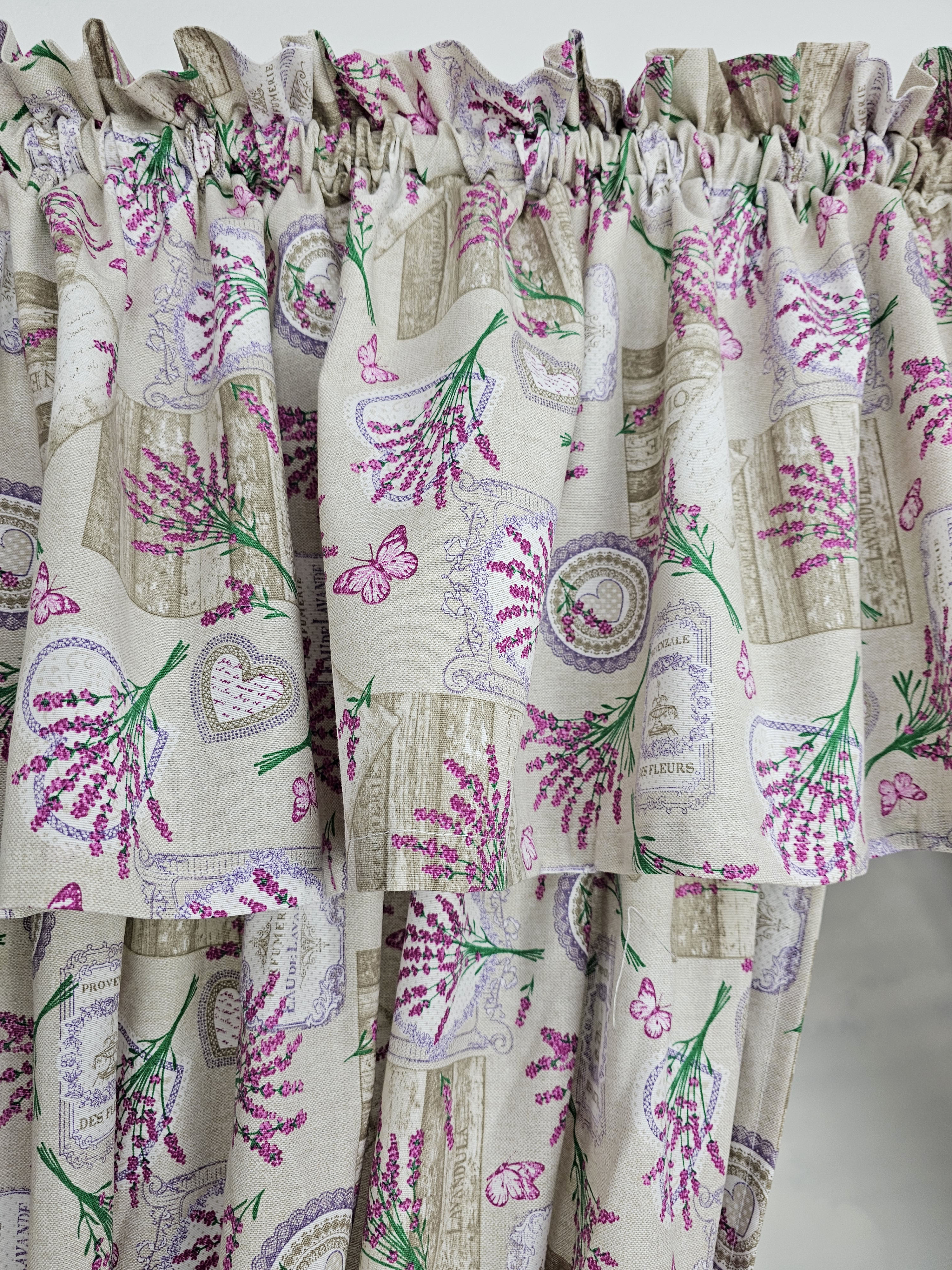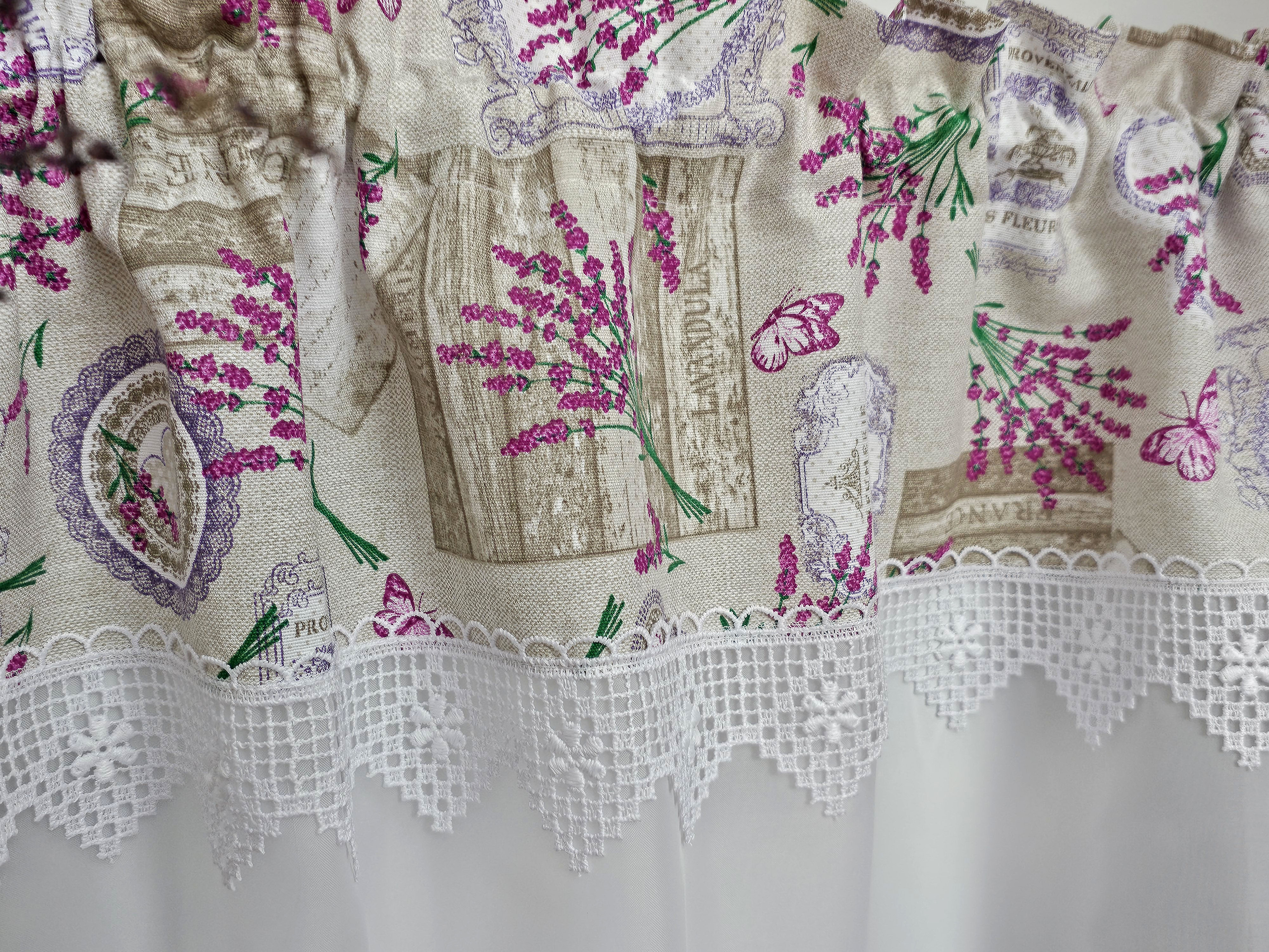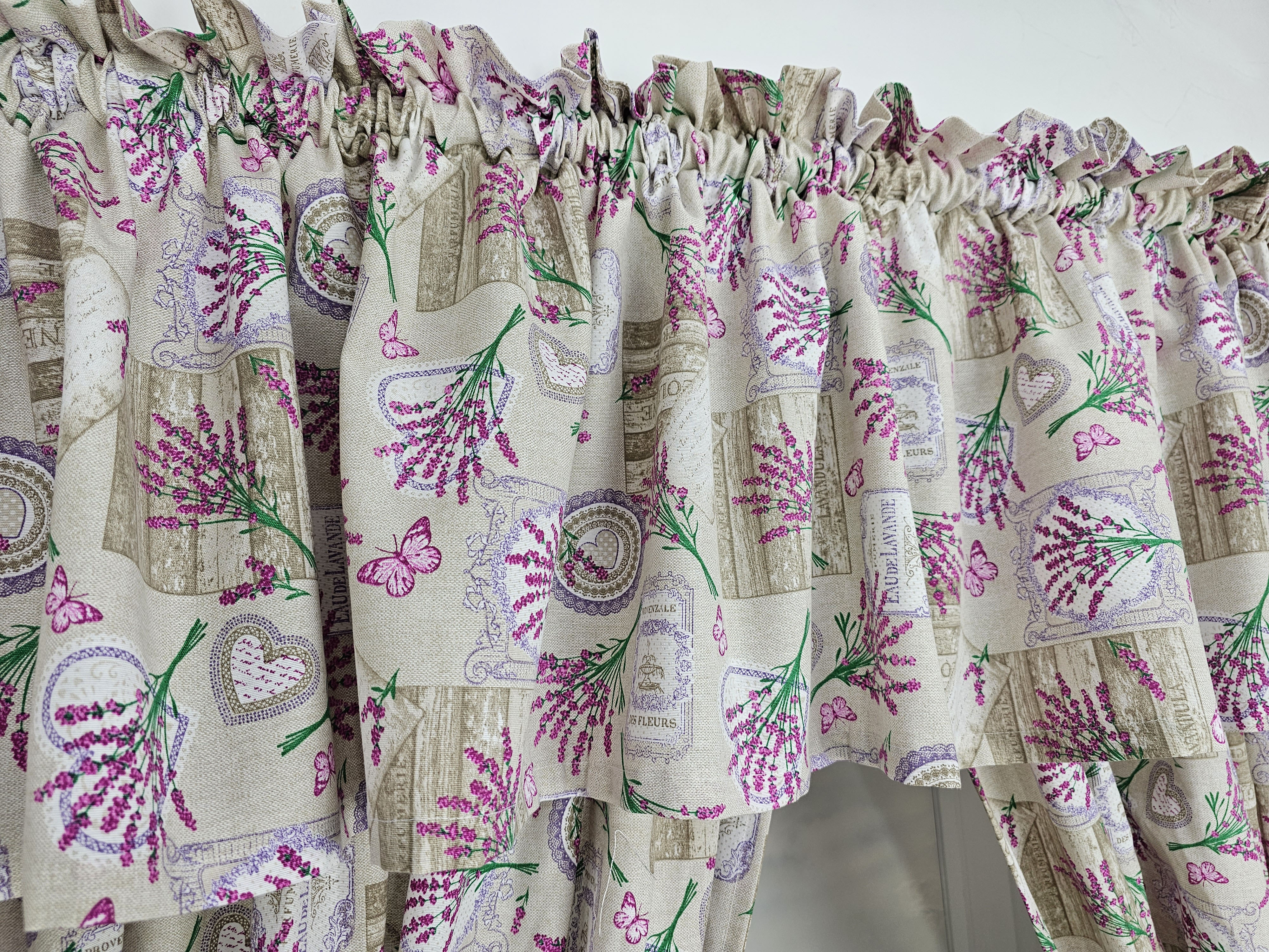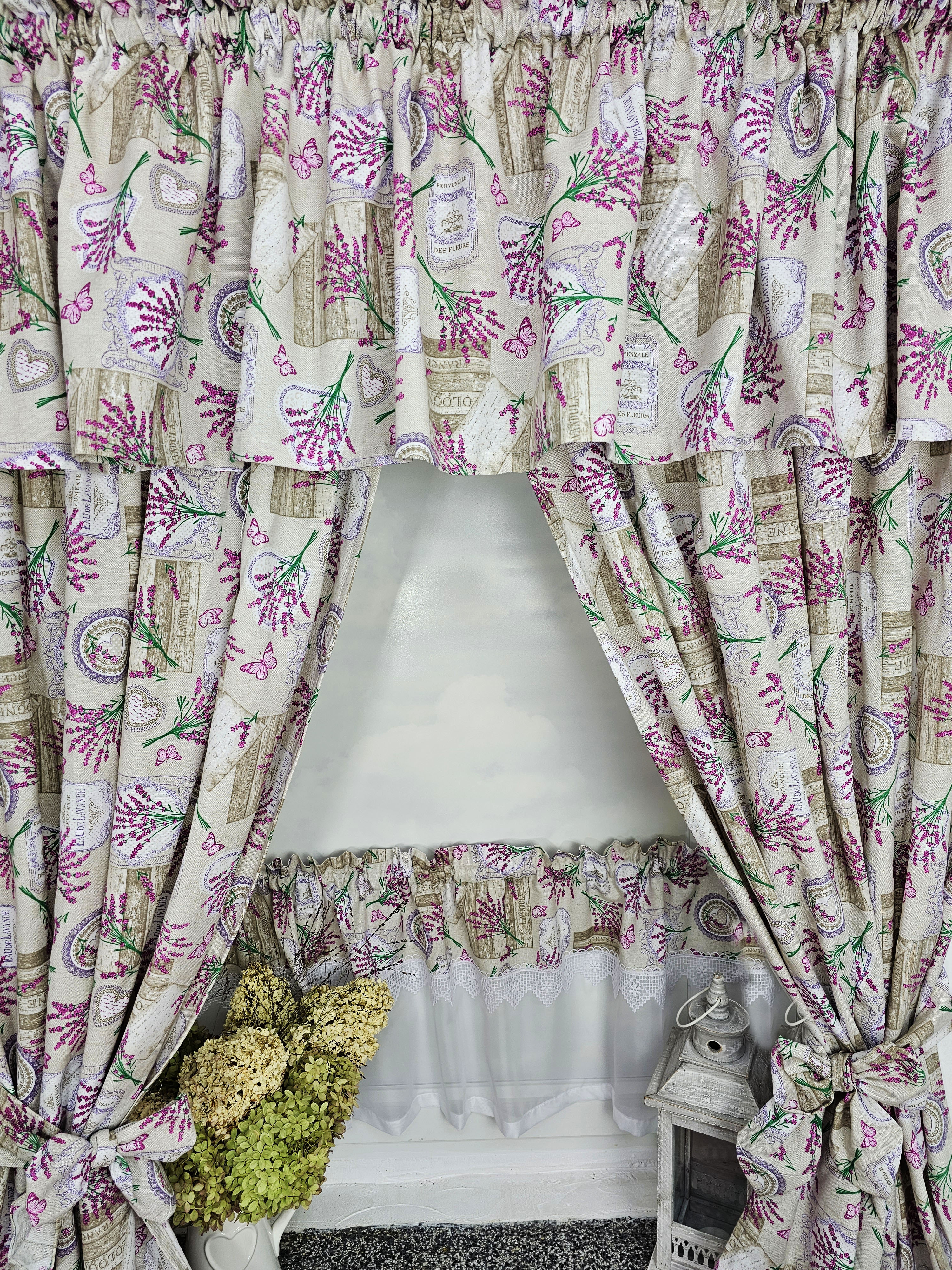 Zapraszam Państwa do zakupu kompletu w rustykalnym, prowansalskim stylu. Wzór tkaniny jednostronny . Komplet to 2 sztuki zasłonek oraz wstążki do wiązania zasłonek plus lambrekin i zazdrostka. Zasłony i lambrekin mają wszytą taśmę marszczącą na karnisz z górną 4cm ryzą - grzywką.