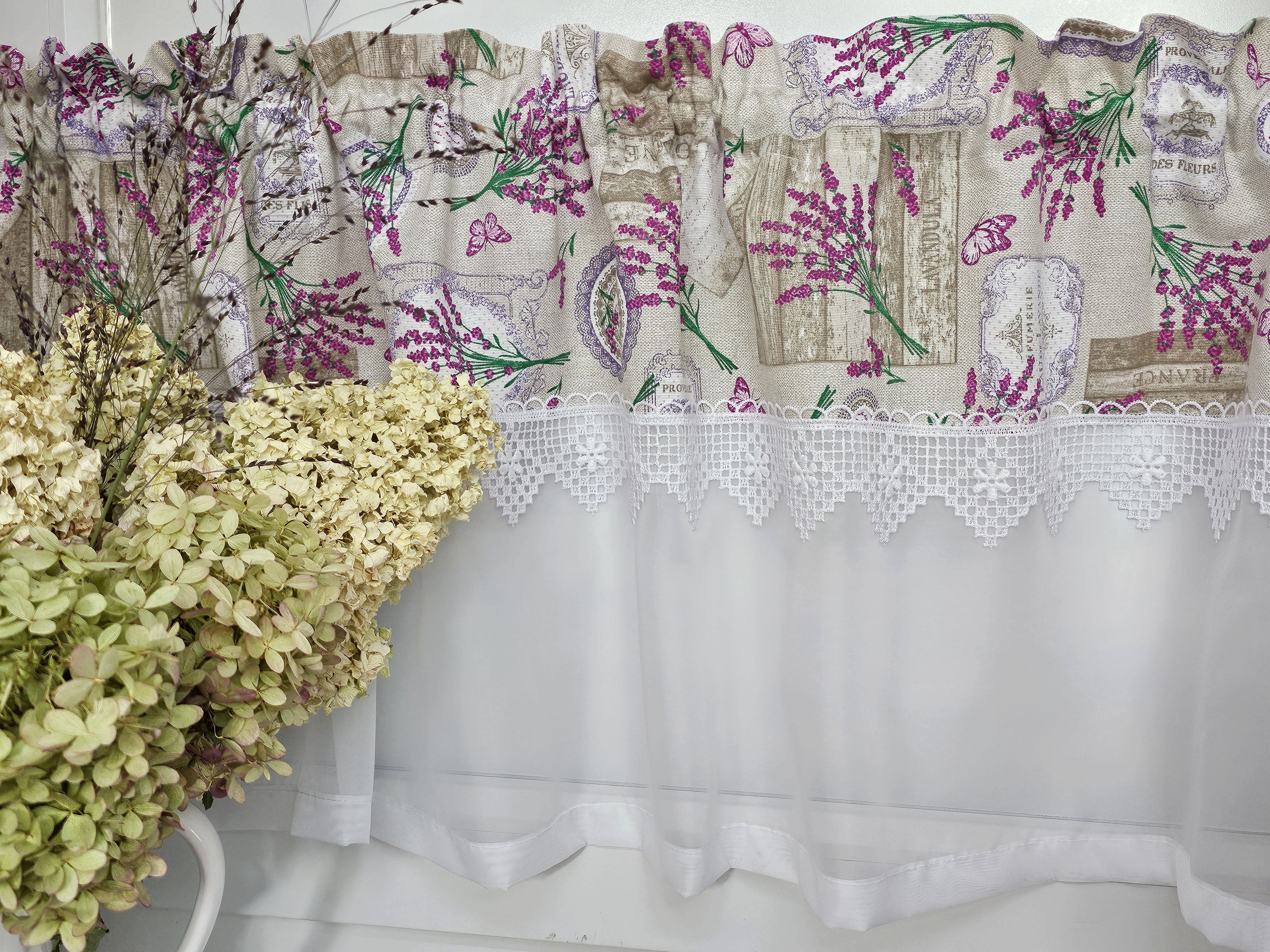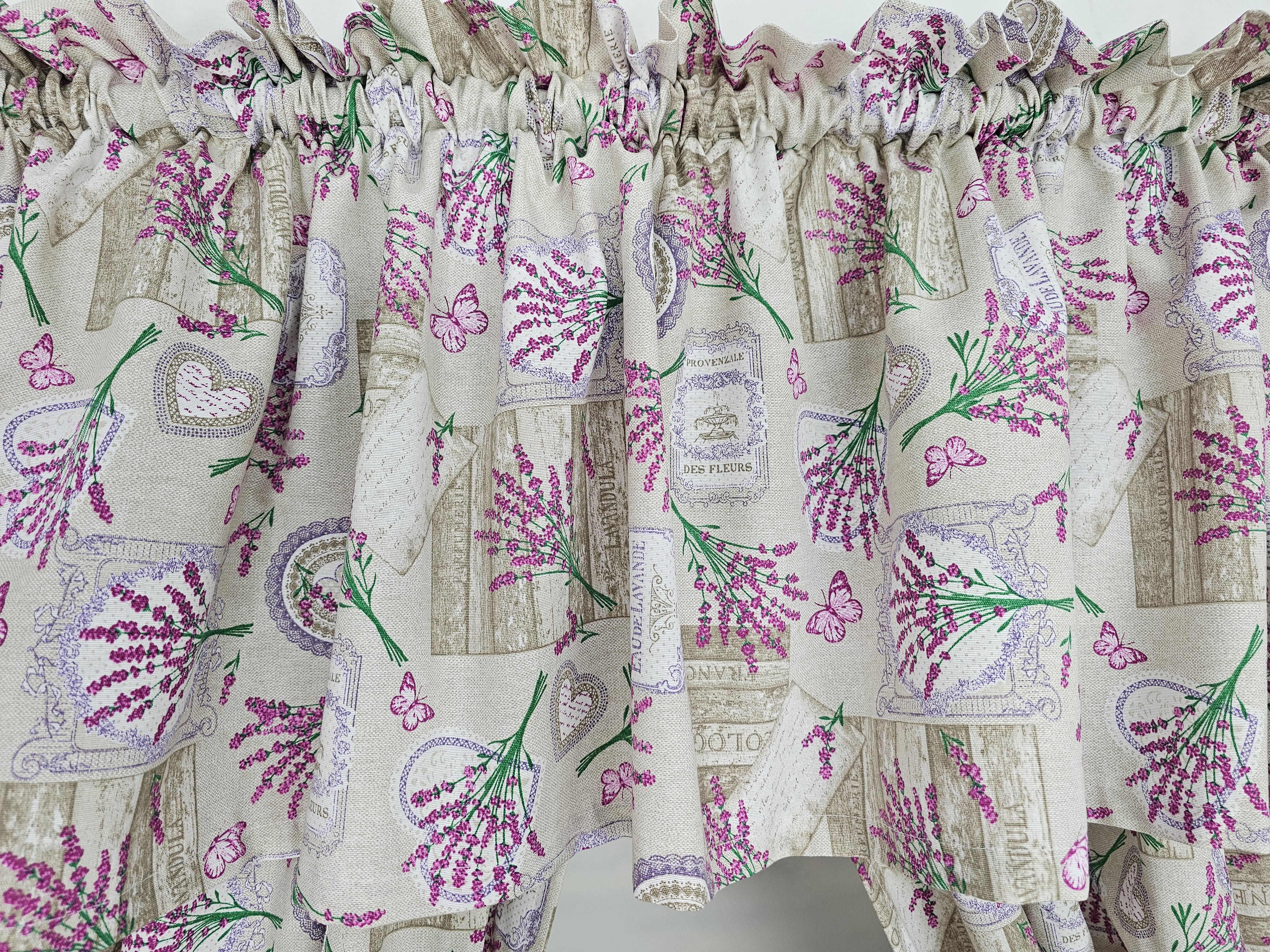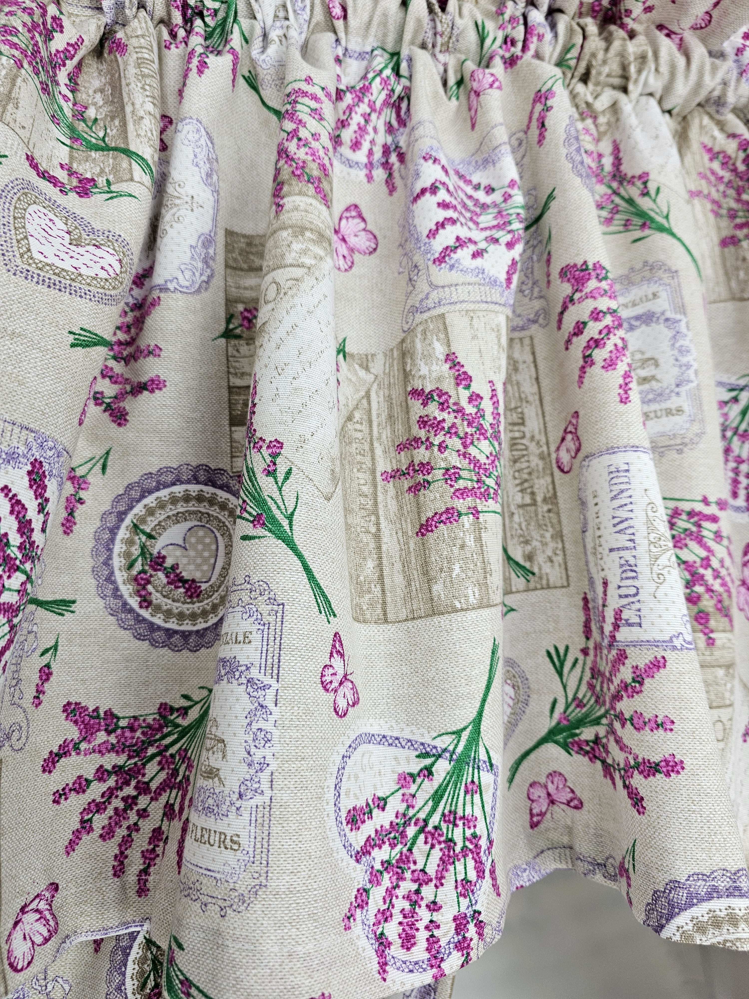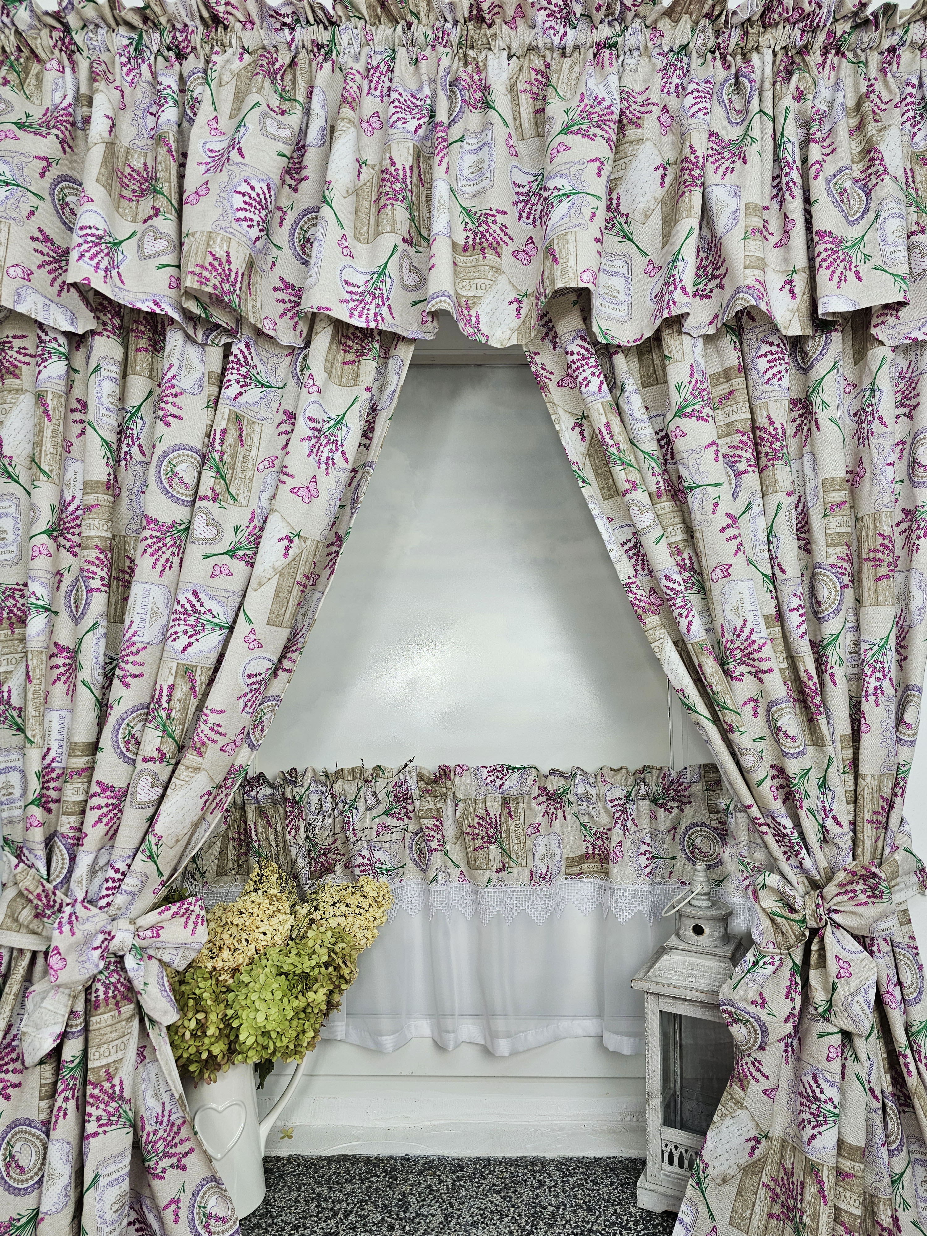 Zapraszam Państwa do zakupu kompletu w rustykalnym, prowansalskim stylu. Wzór tkaniny jednostronny . Komplet to 2 sztuki zasłonek oraz wstążki do wiązania zasłonek plus lambrekin i zazdrostka. Zasłony i lambrekin mają wszytą taśmę marszczącą na karnisz z górną 4cm ryzą - grzywką.