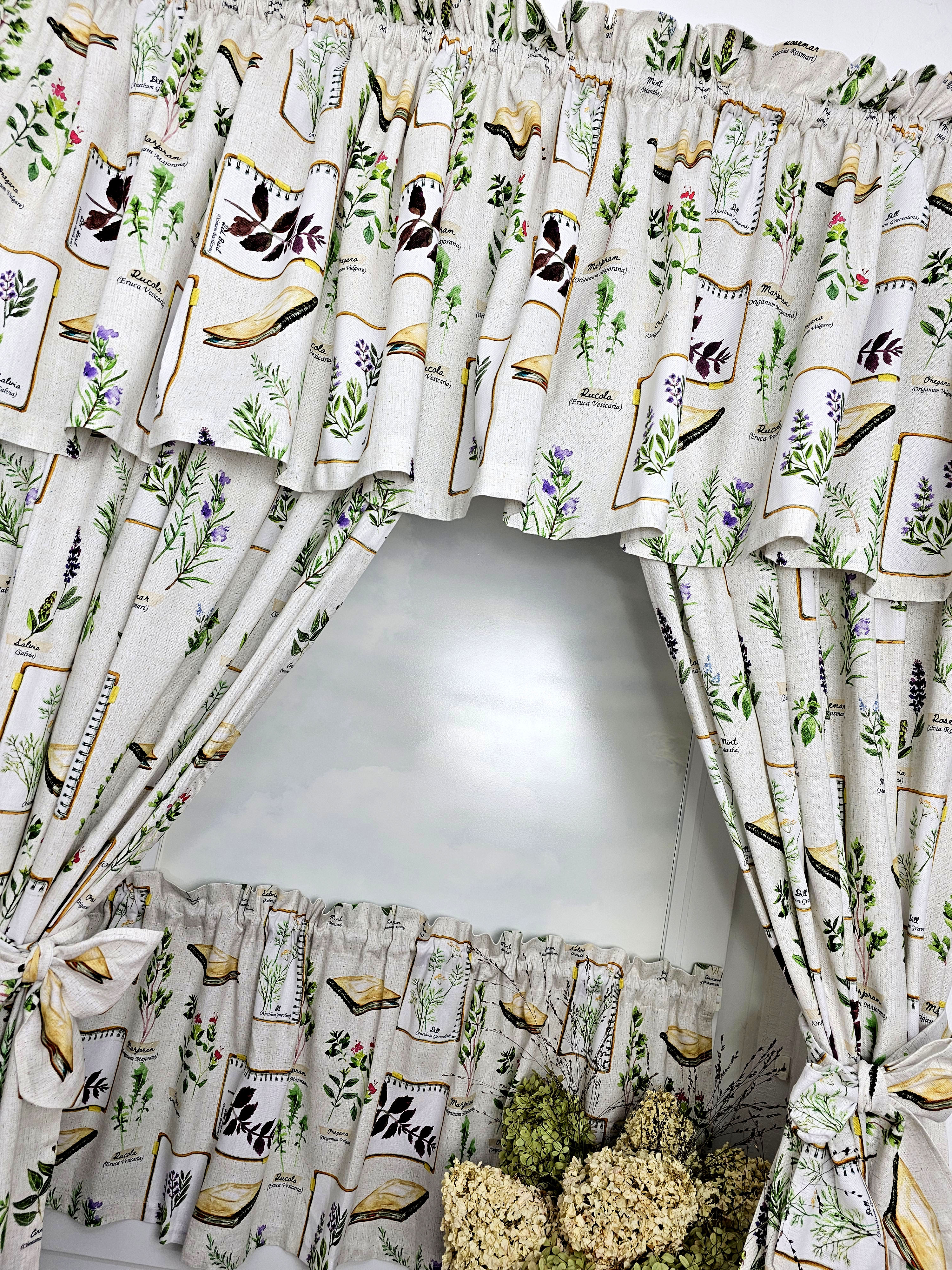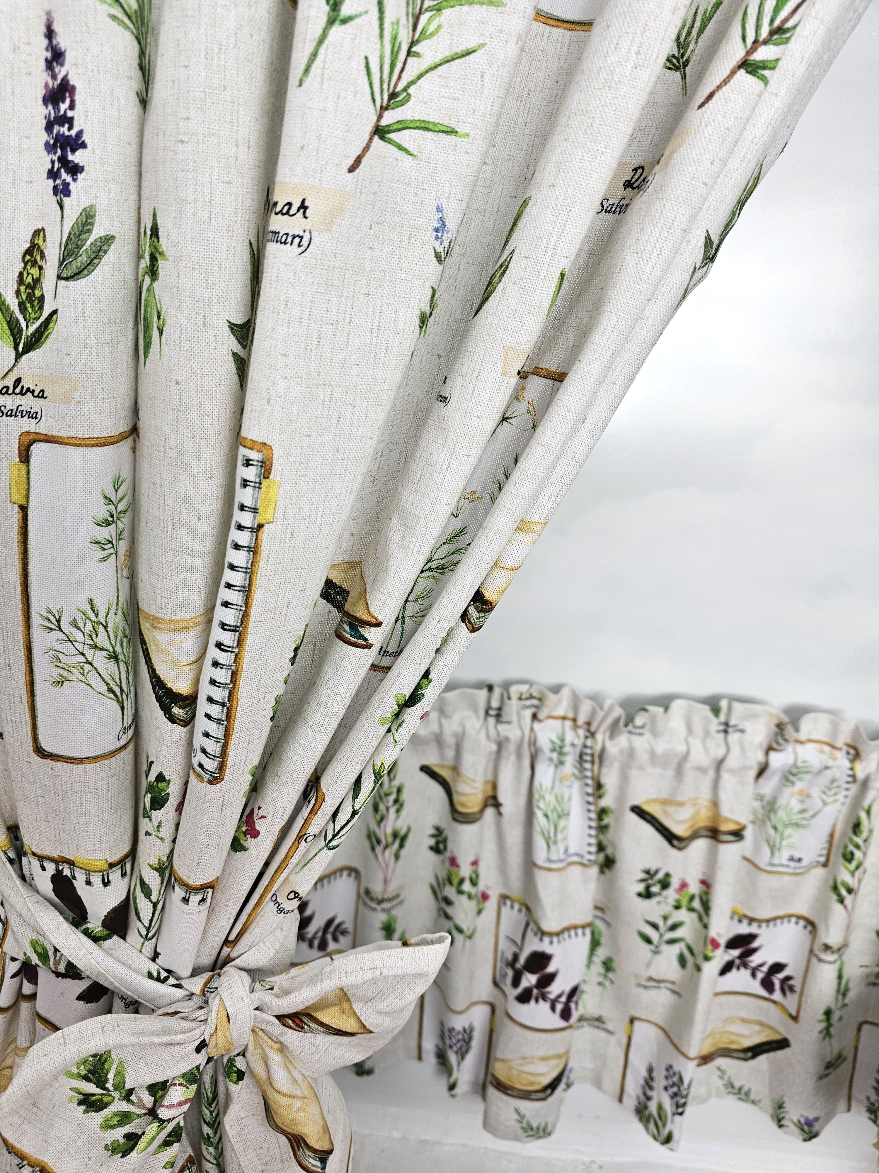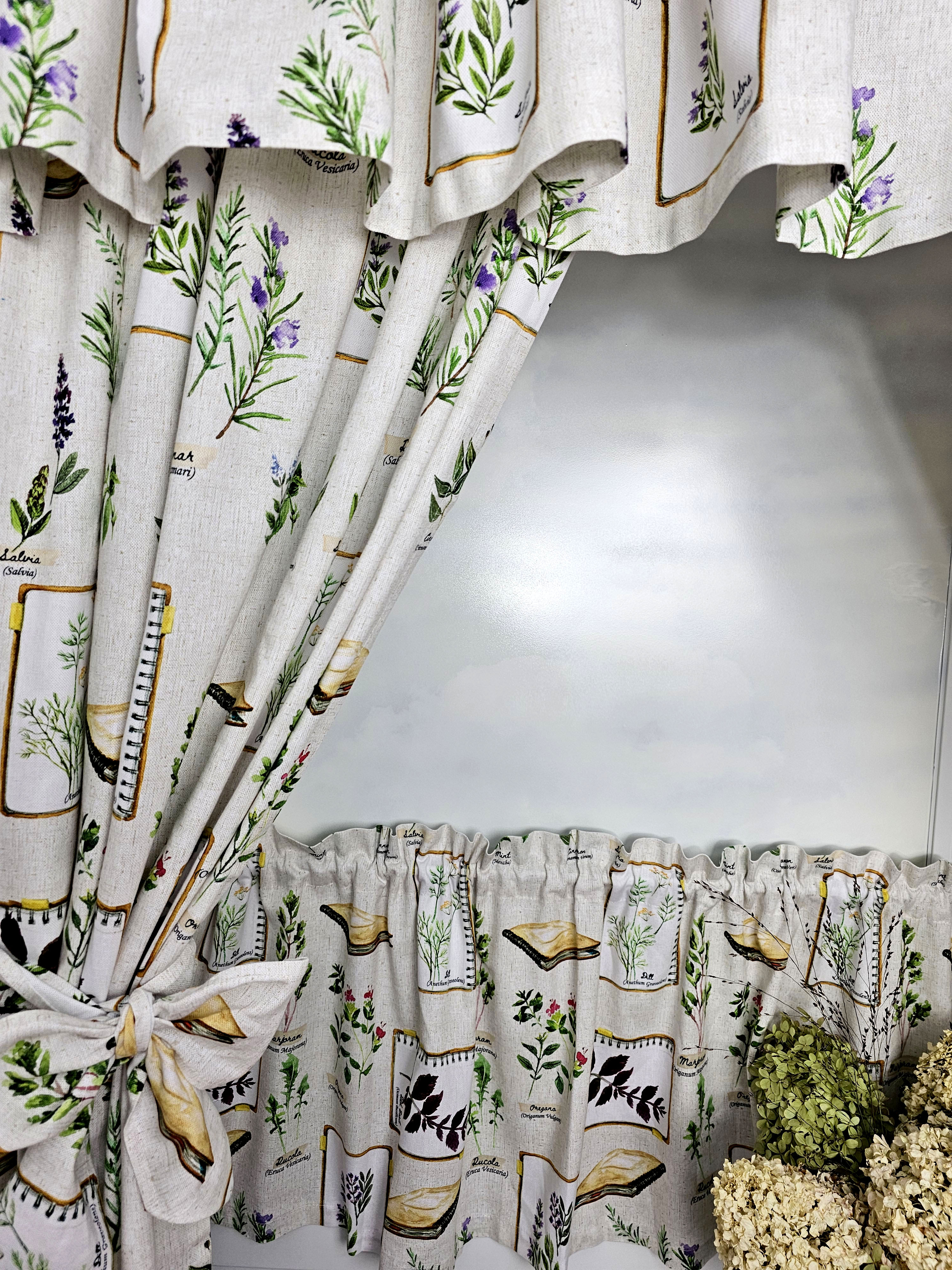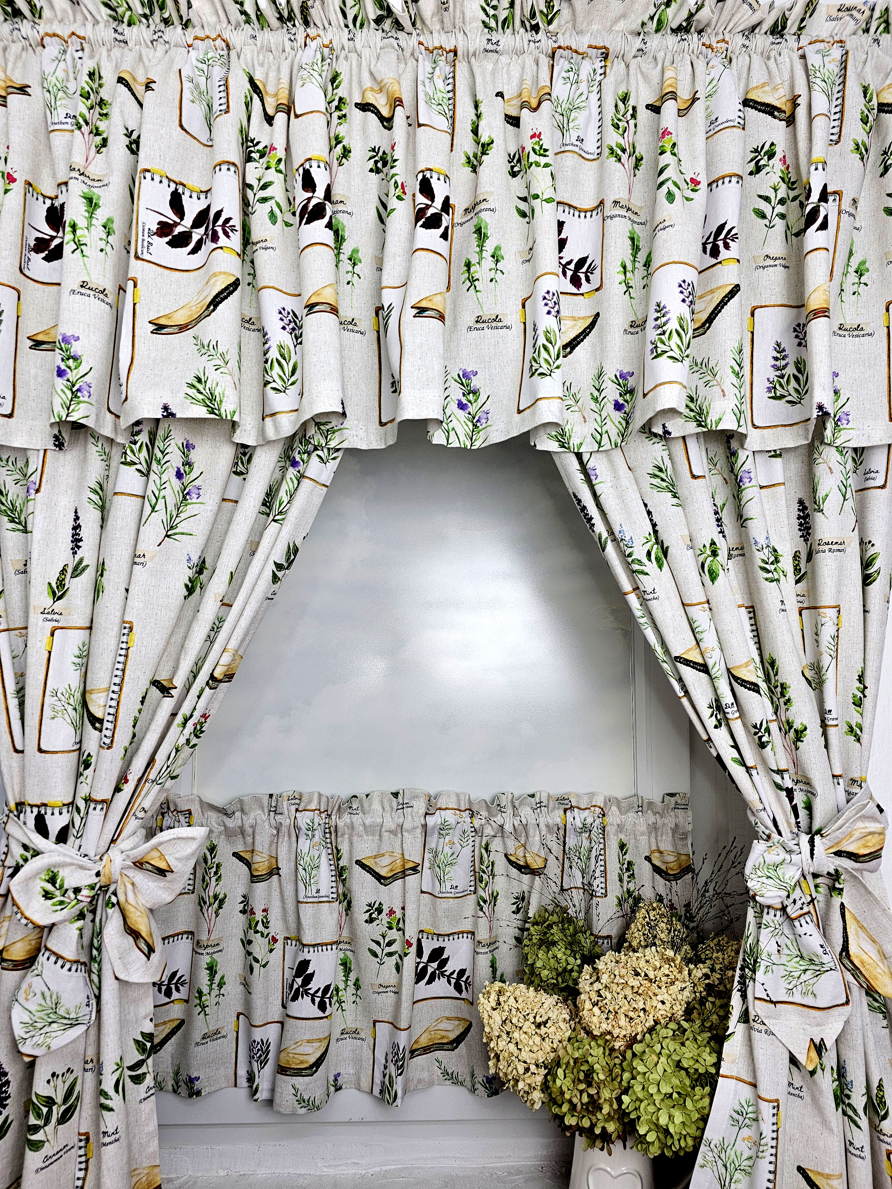 Komplet to 2 sztuki zasłonek oraz wstążki do wiązania zasłonek plus lambrekin i zazdrostka.