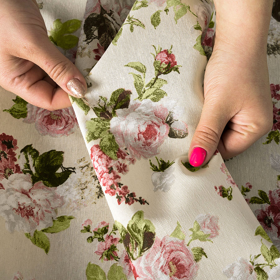 Prasowanie: Tkaninę prasujemy po lewej stronie materiału z podłożonym ręcznikiem, lekko rozgrzanym żelazkiem z użyciem pary.