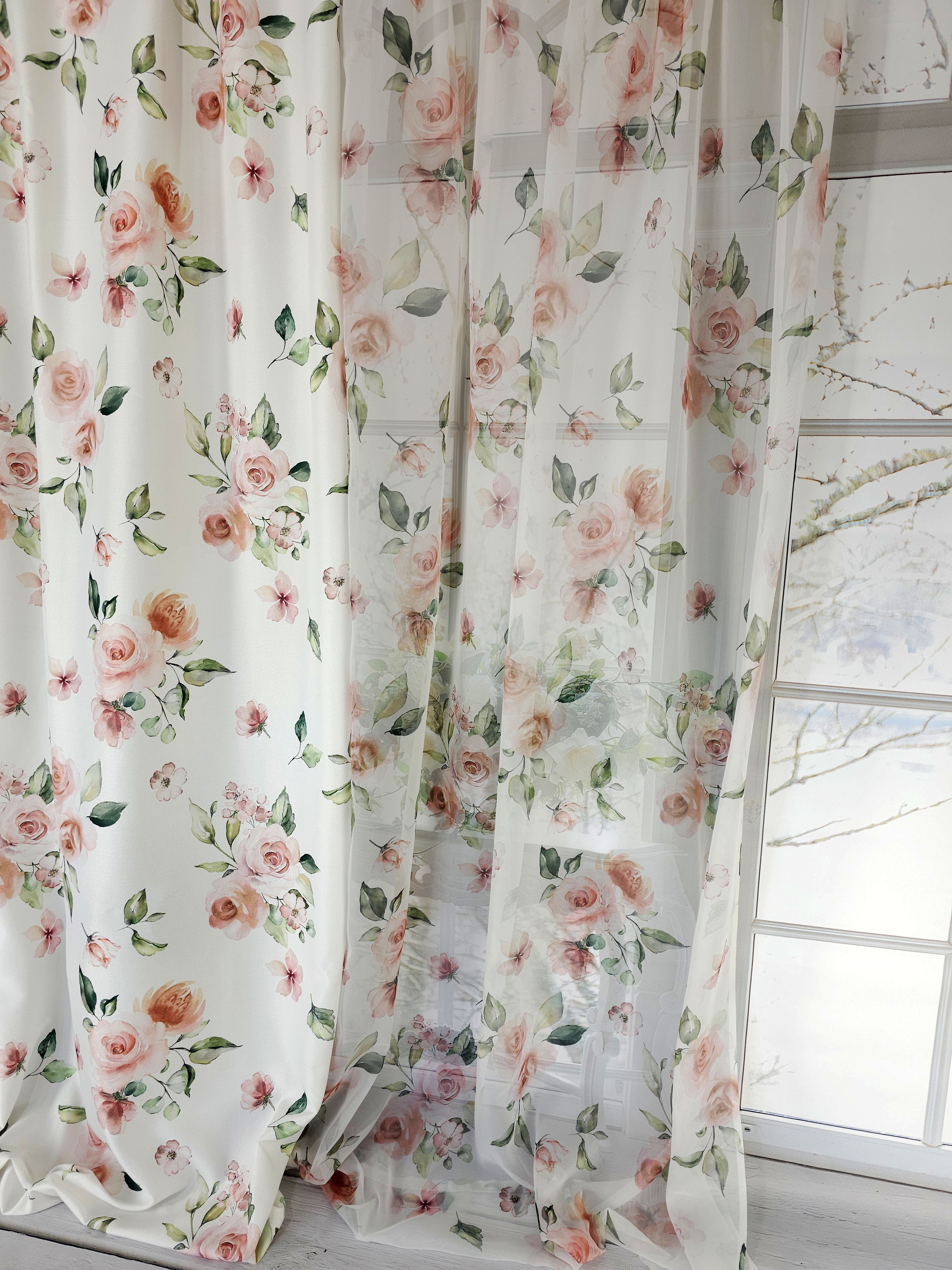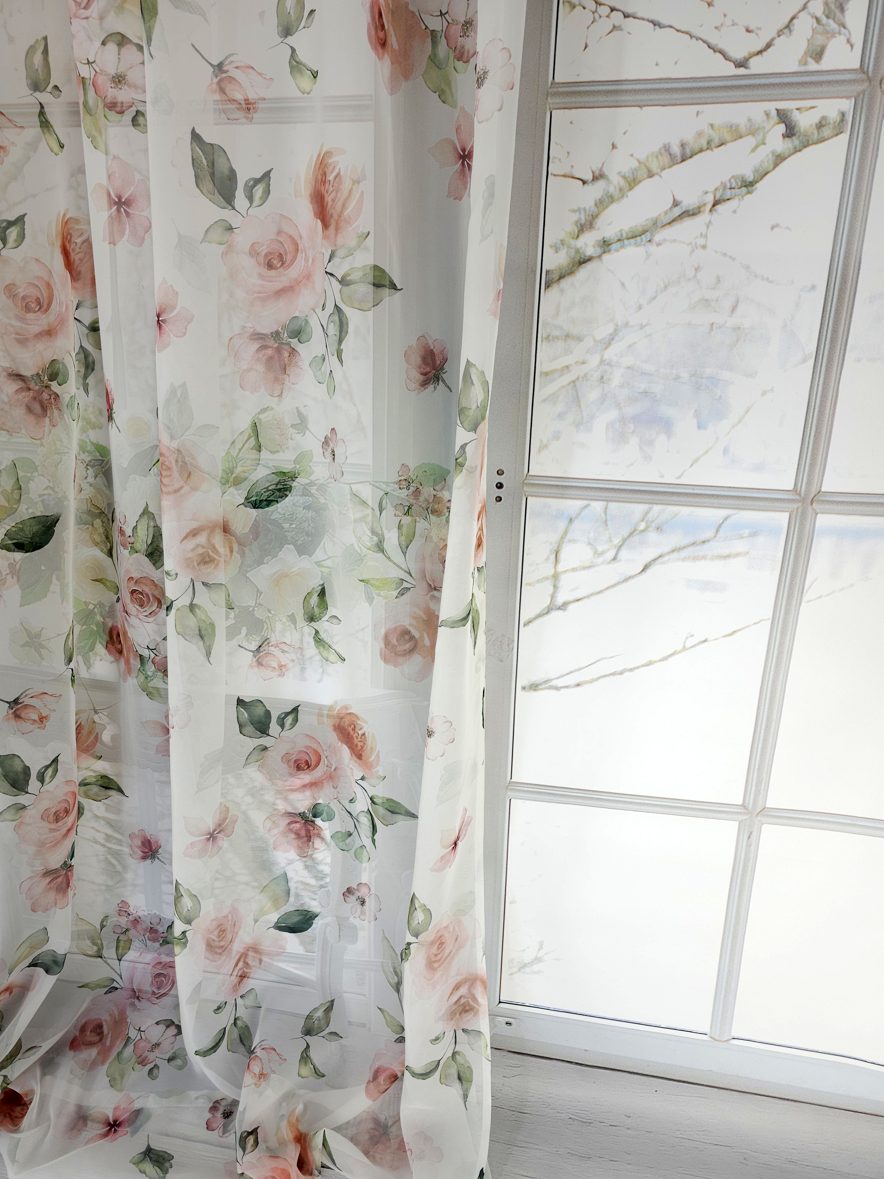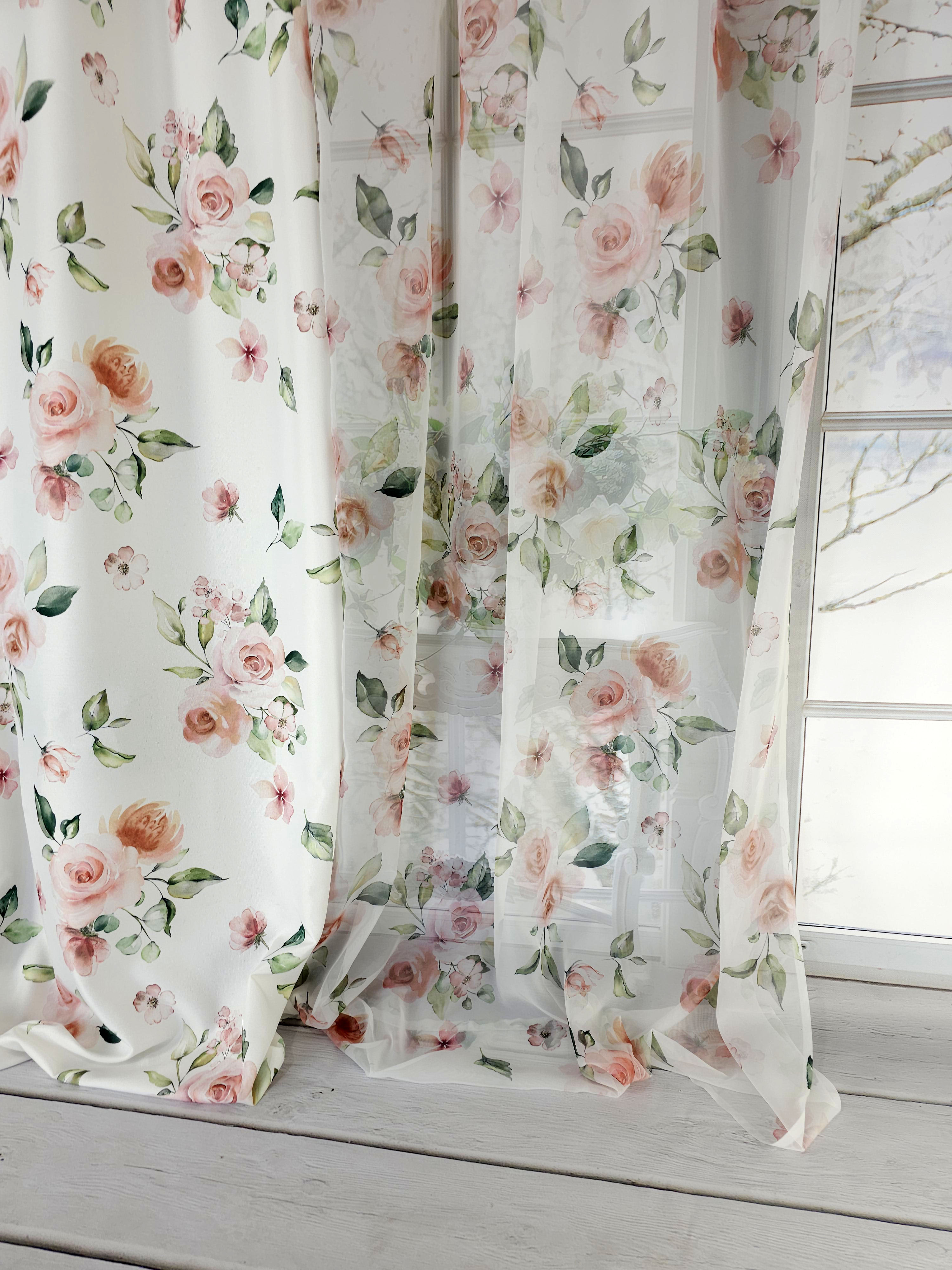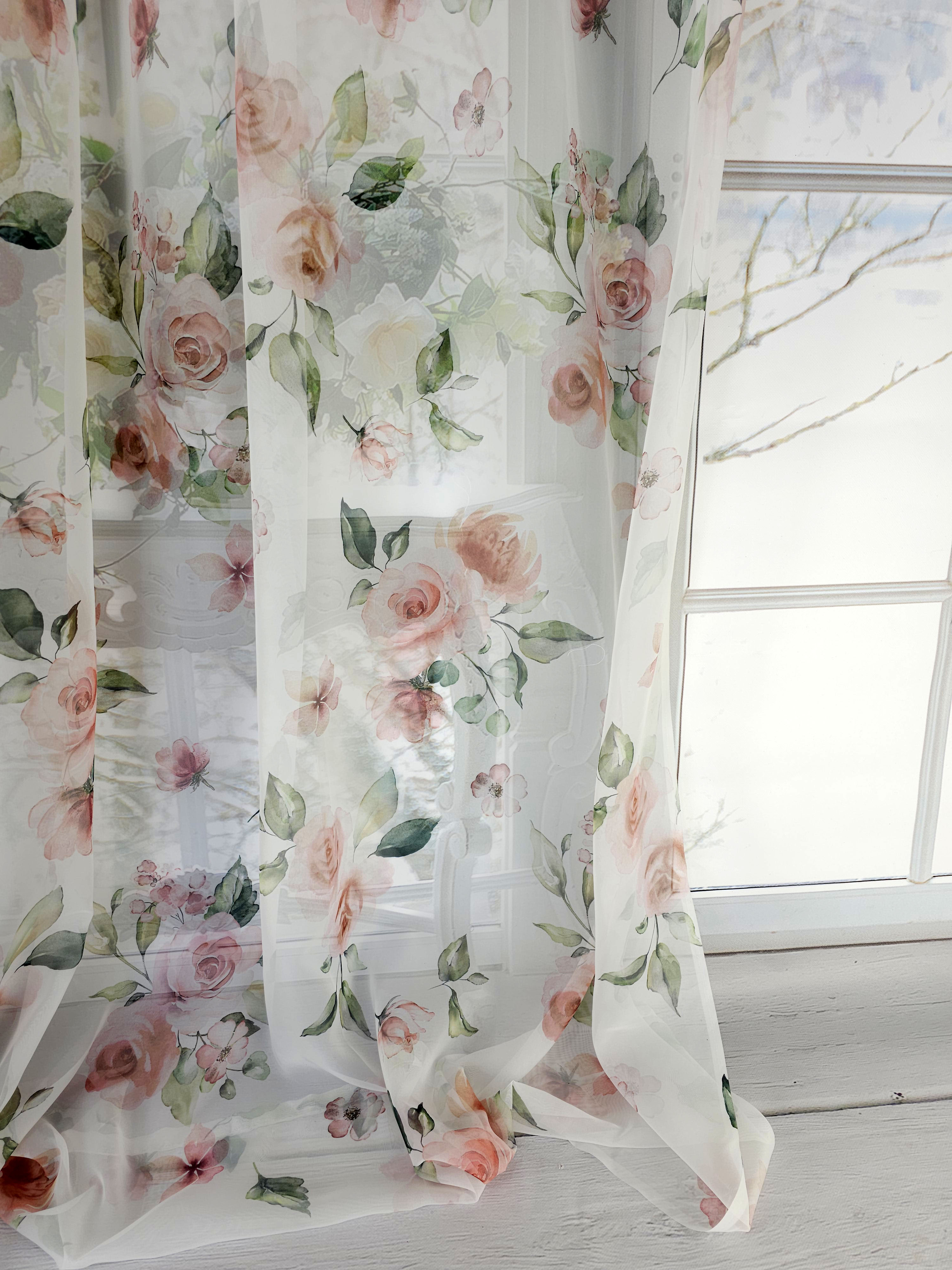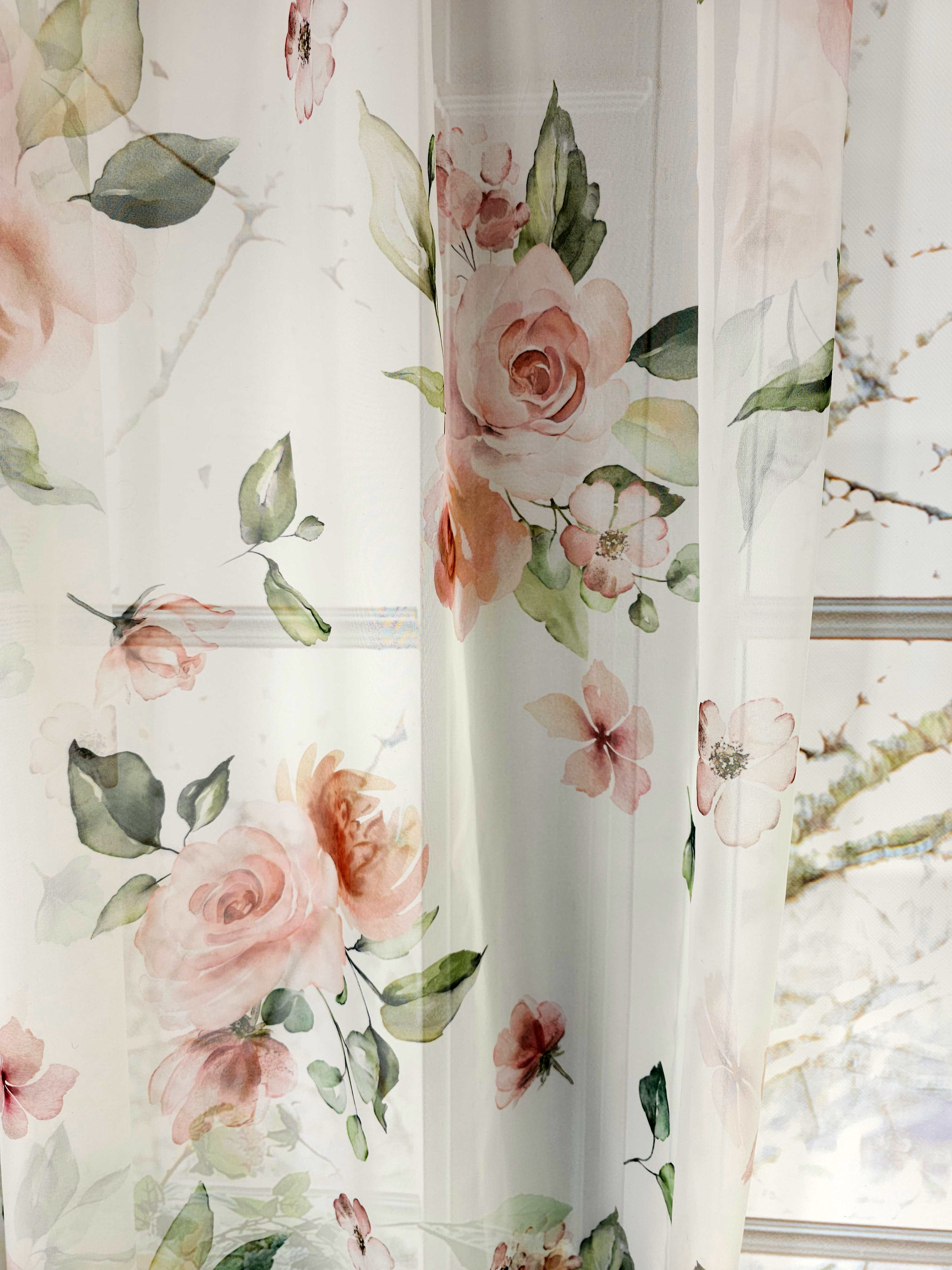 Firana przezroczysta woalowa z kwiatowym nadrukiem.