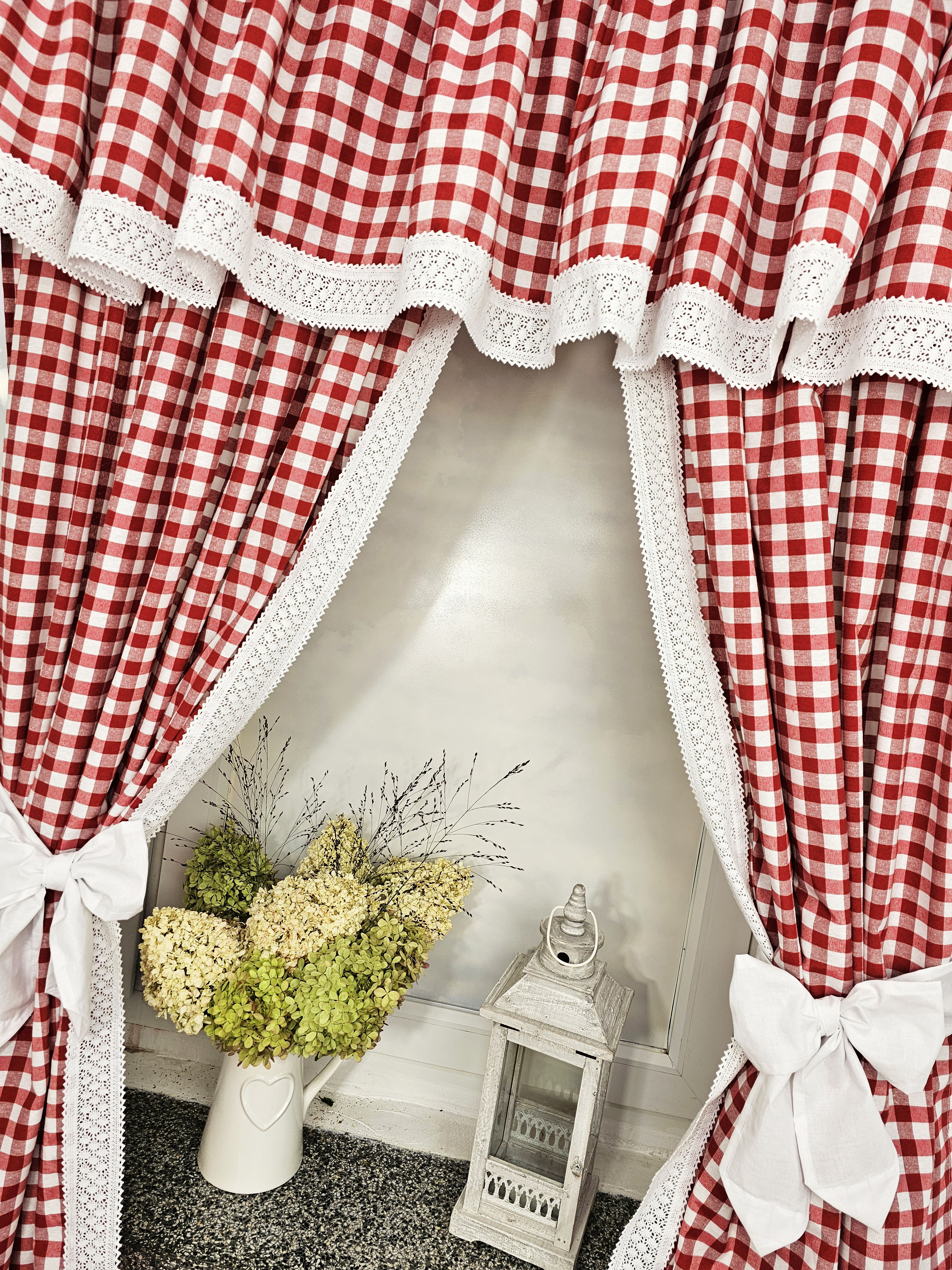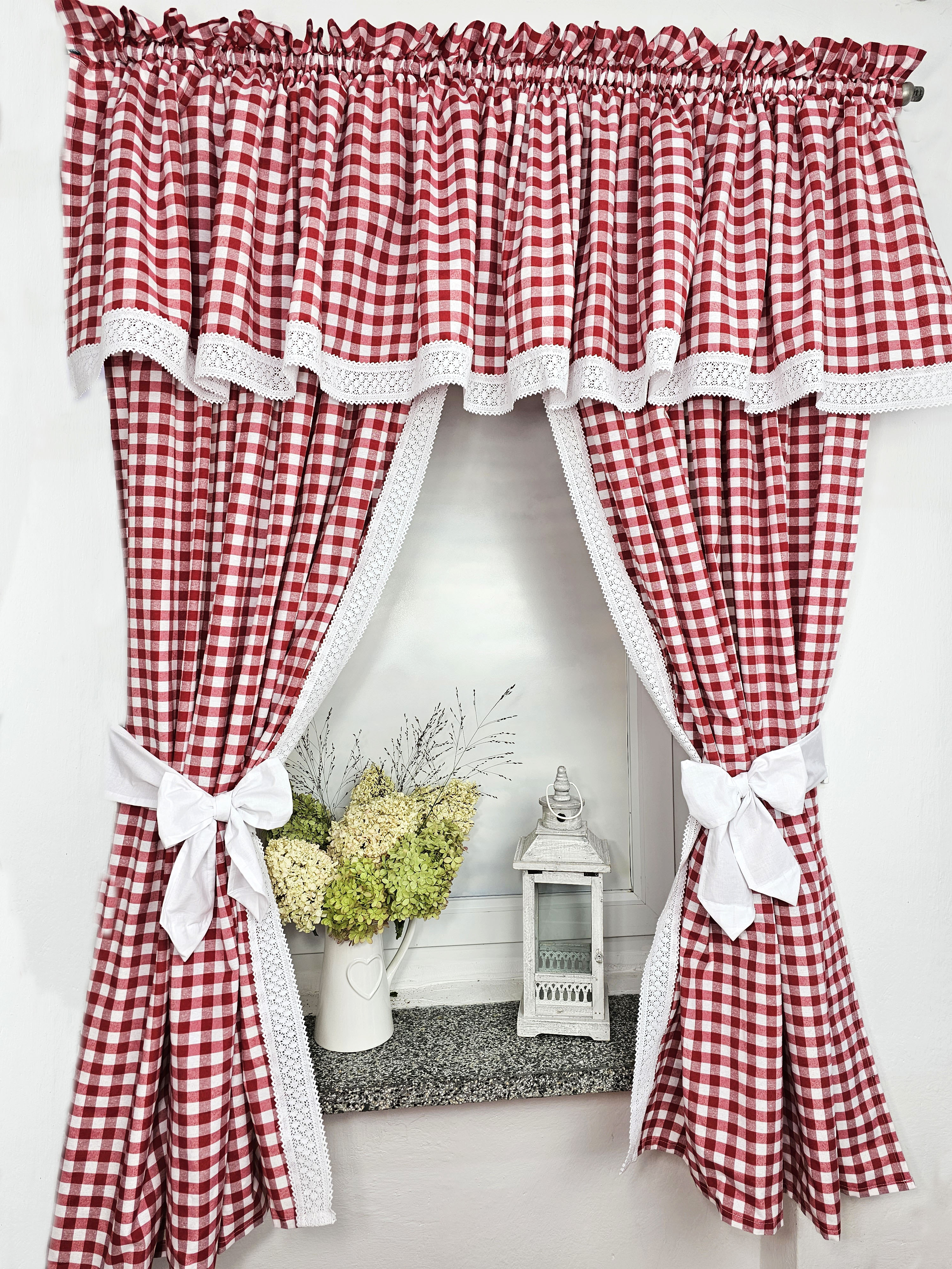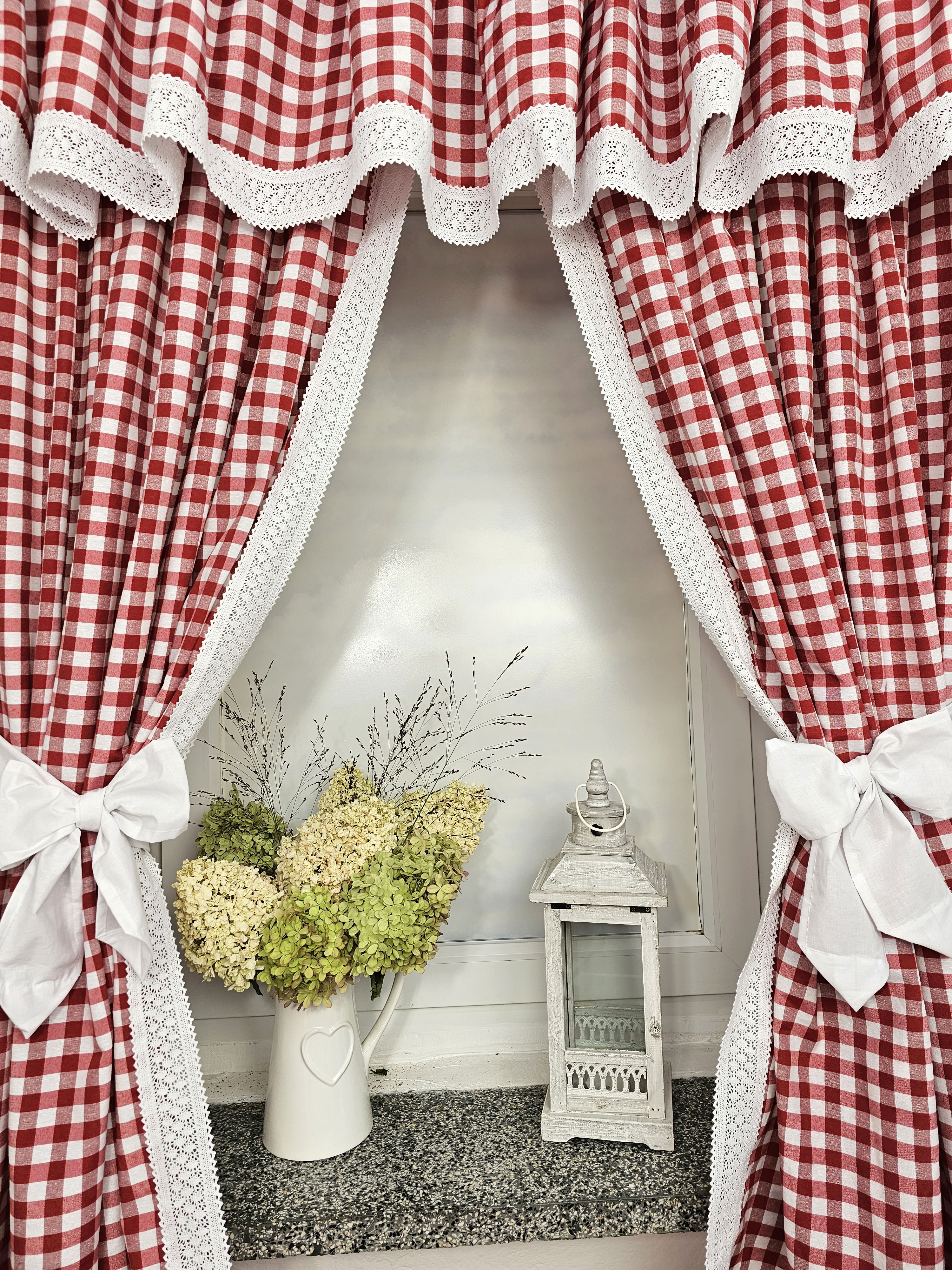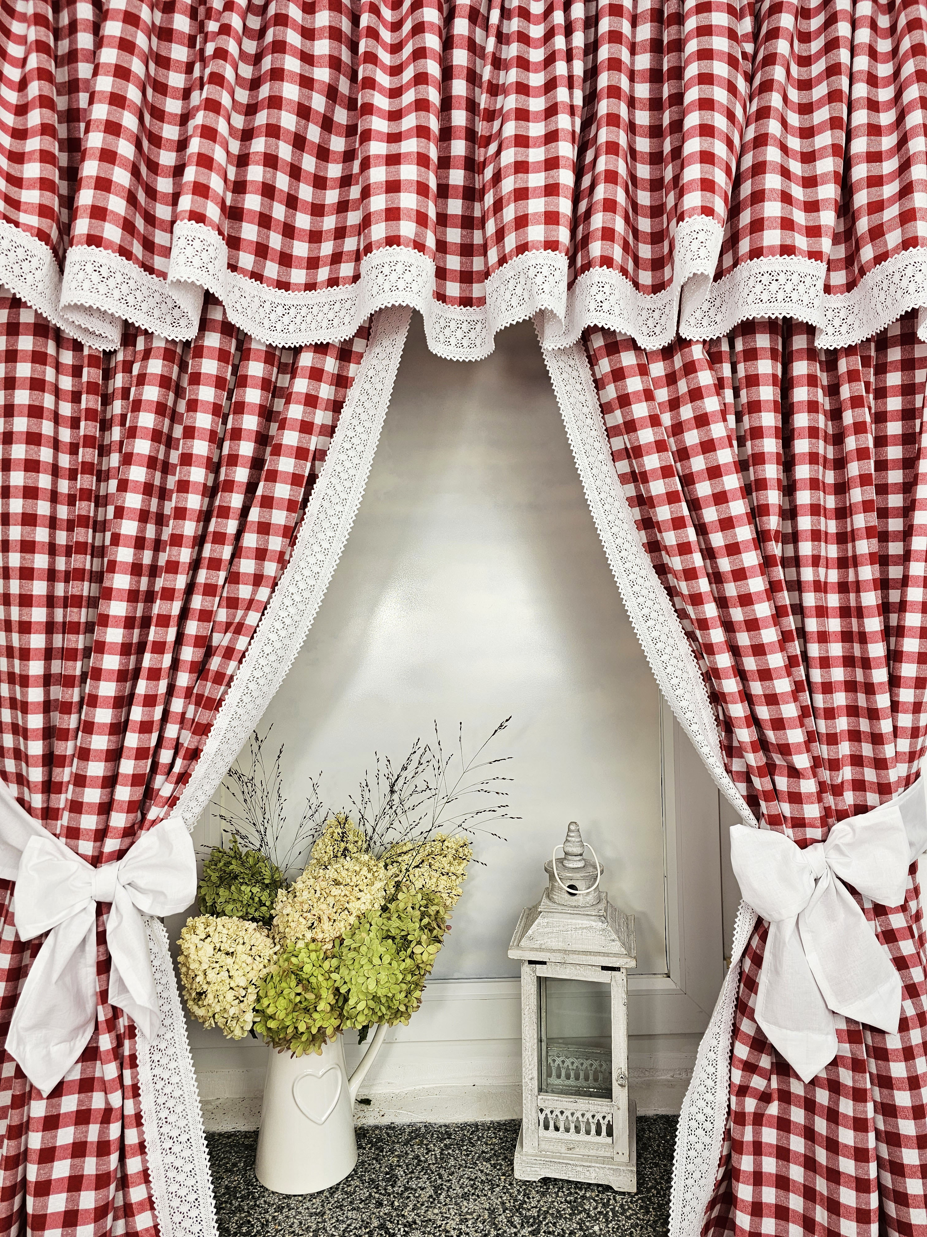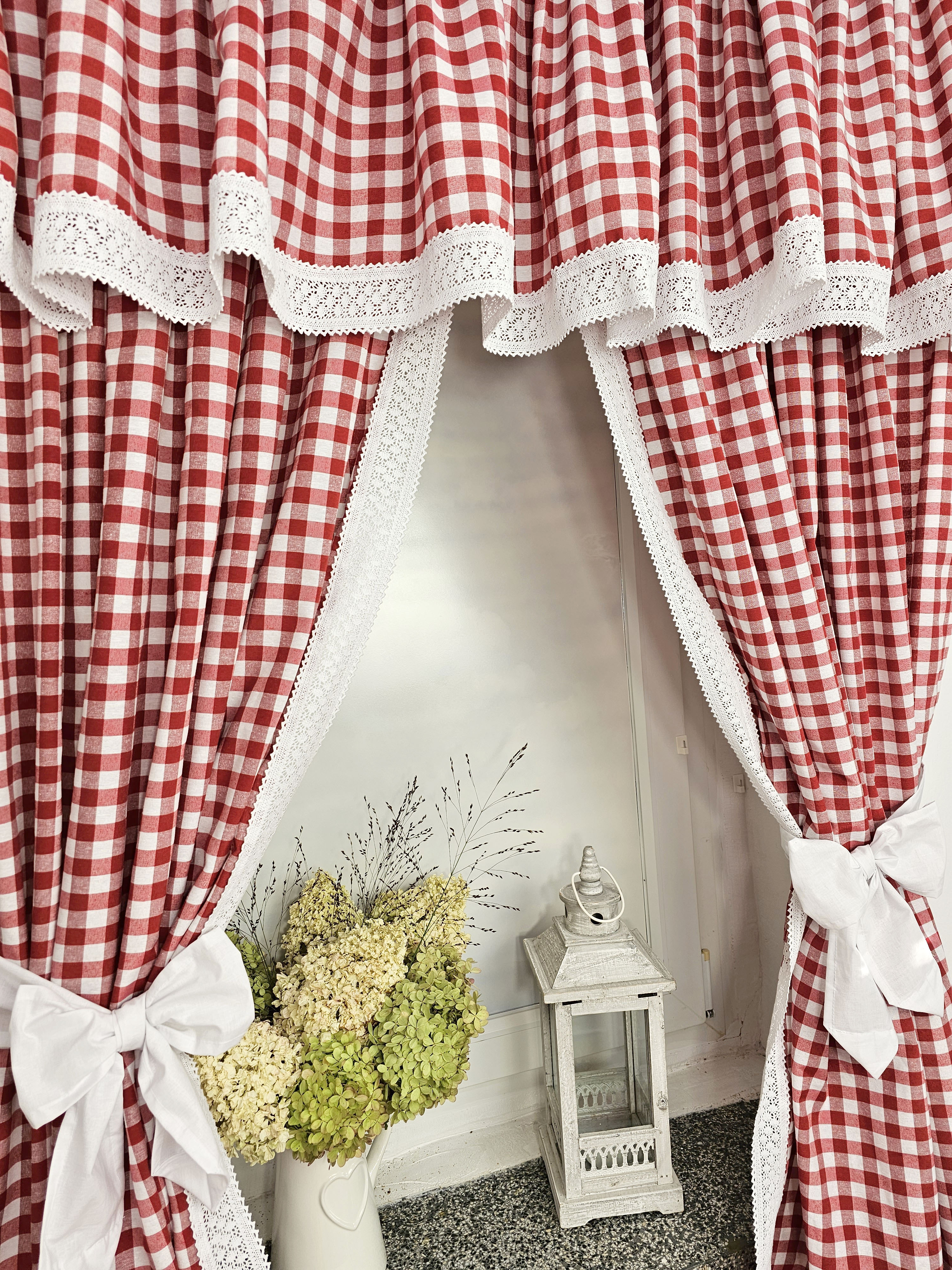 Komplet to 2 sztuki zasłonek oraz wstążki do wiązania zasłonek plus lambrekin.
