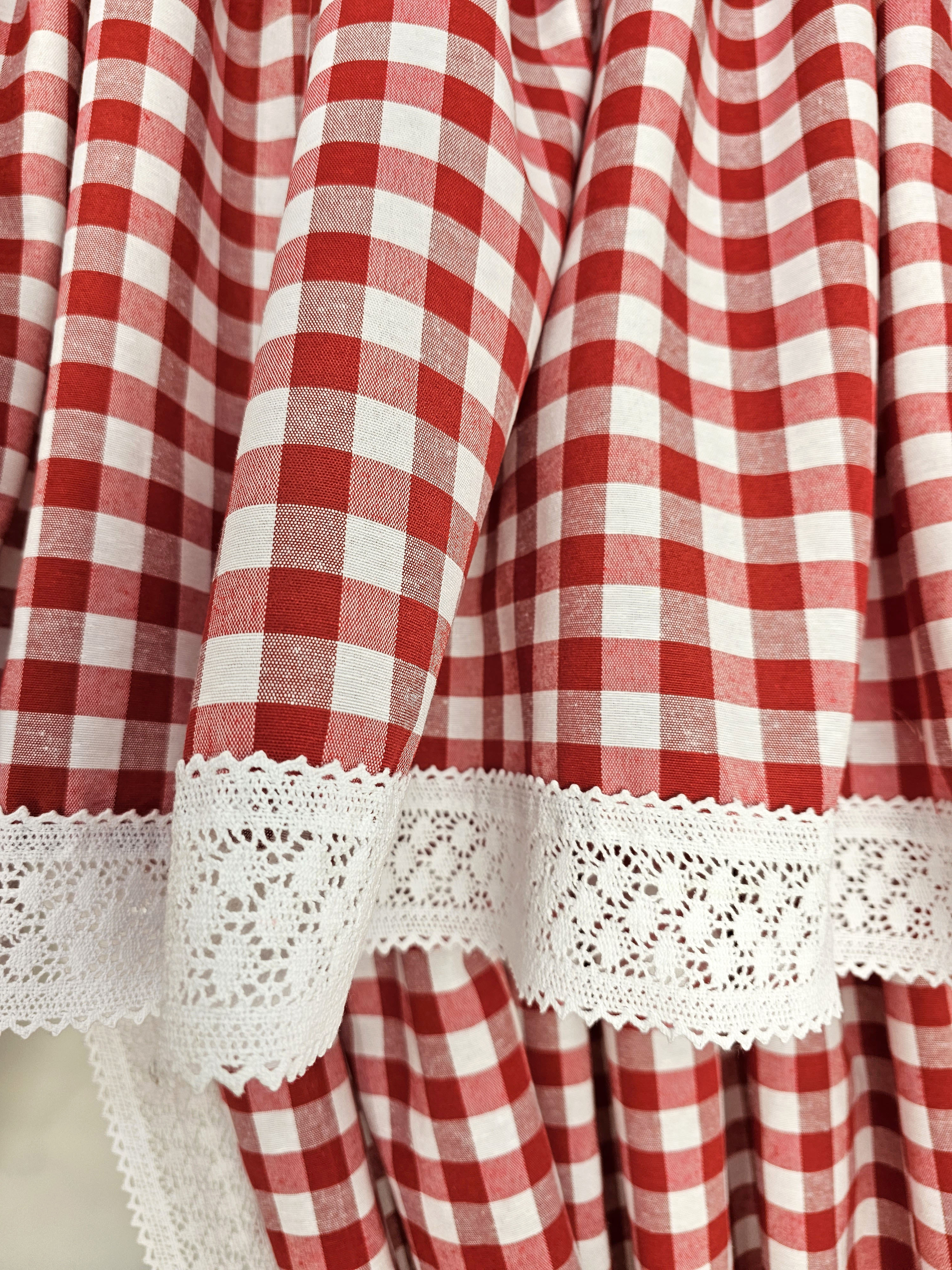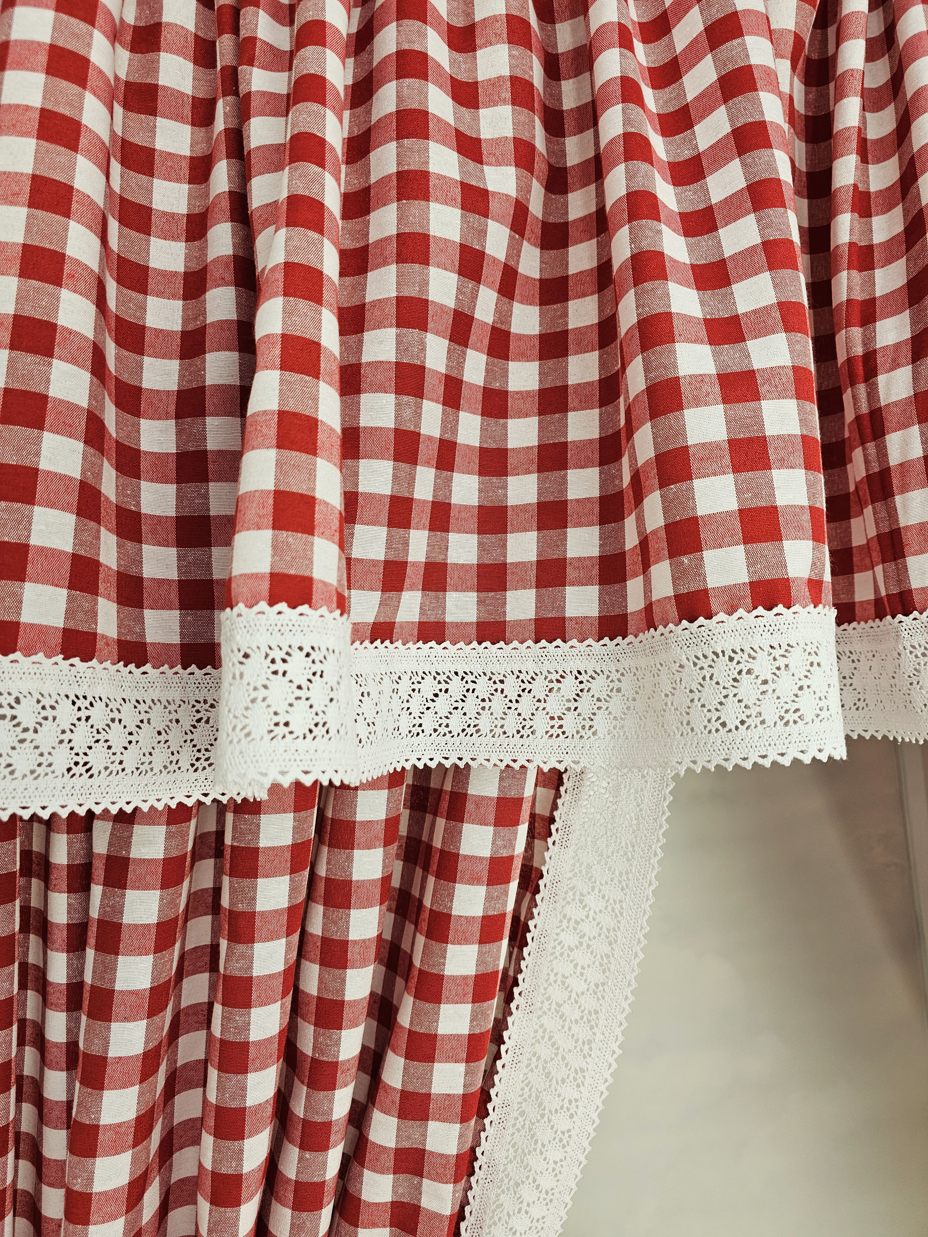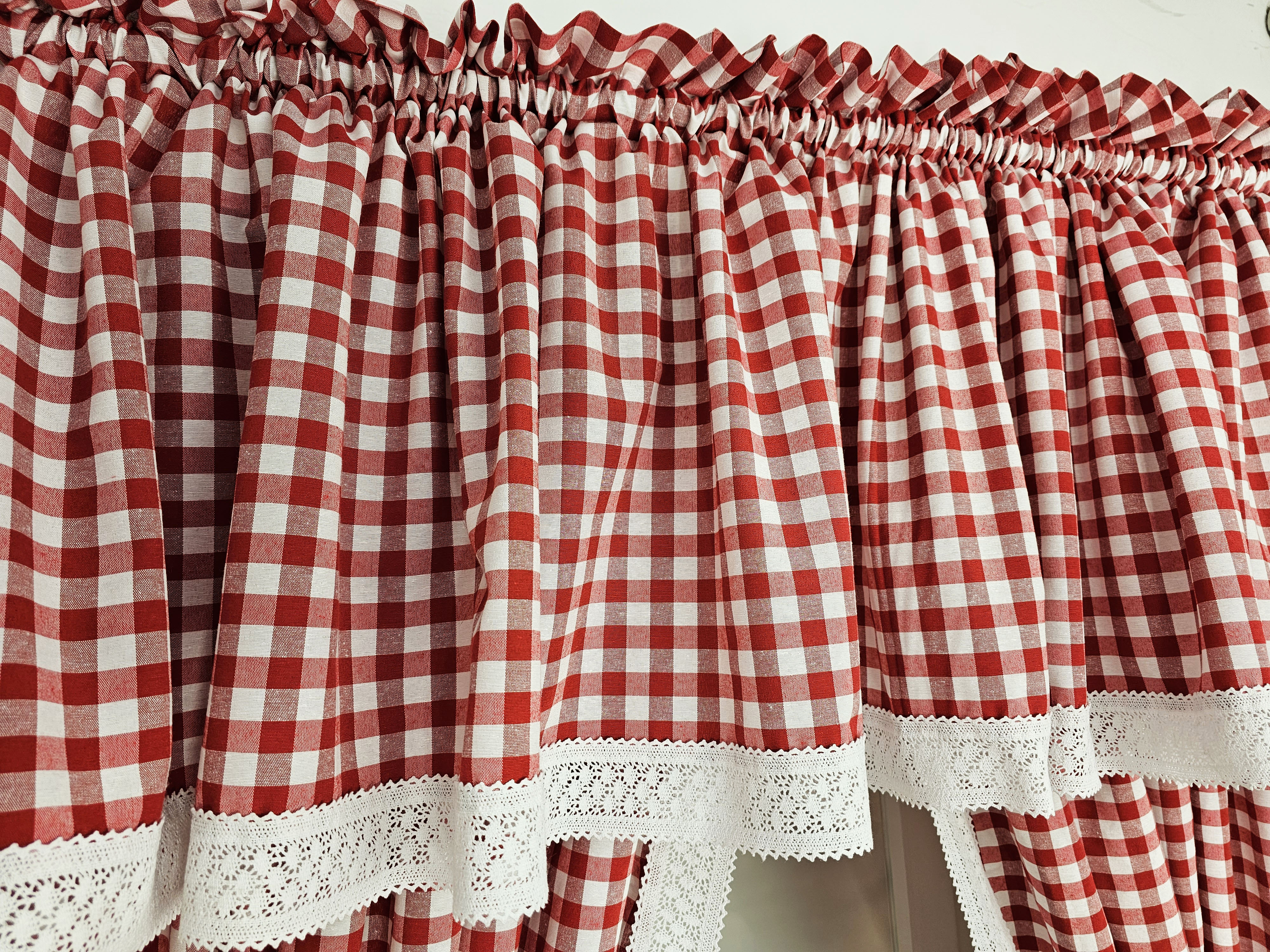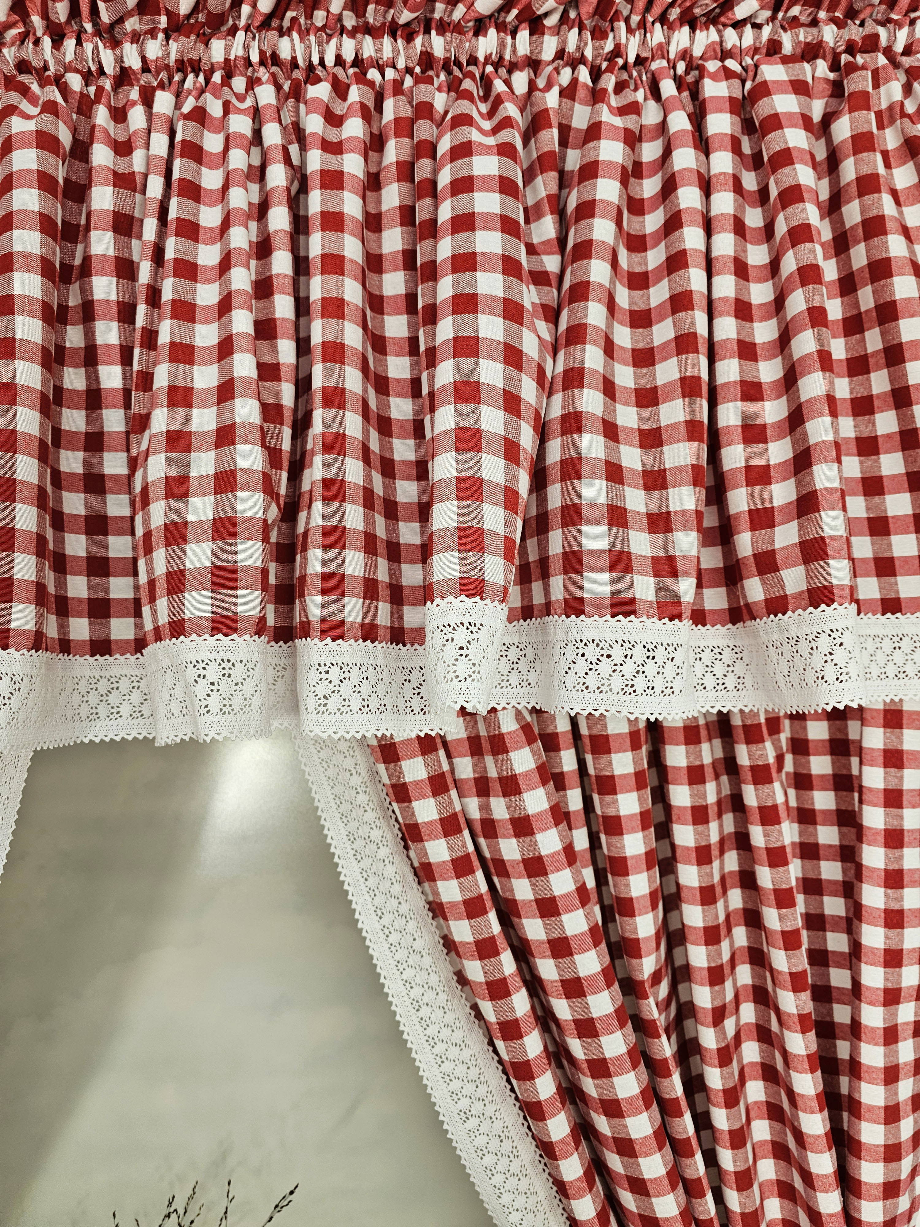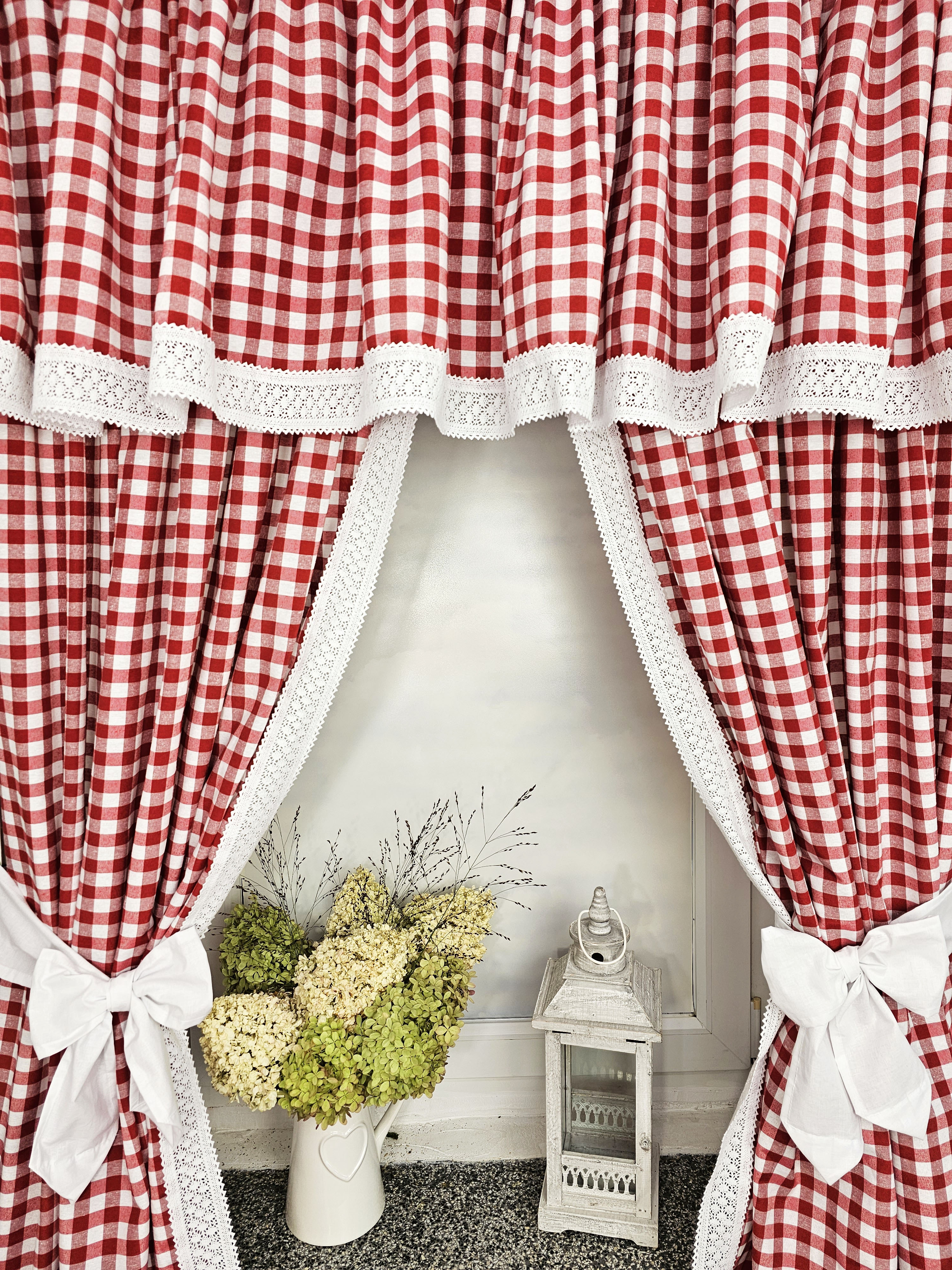 Komplet to 2 sztuki zasłonek oraz wstążki do wiązania zasłonek plus lambrekin.