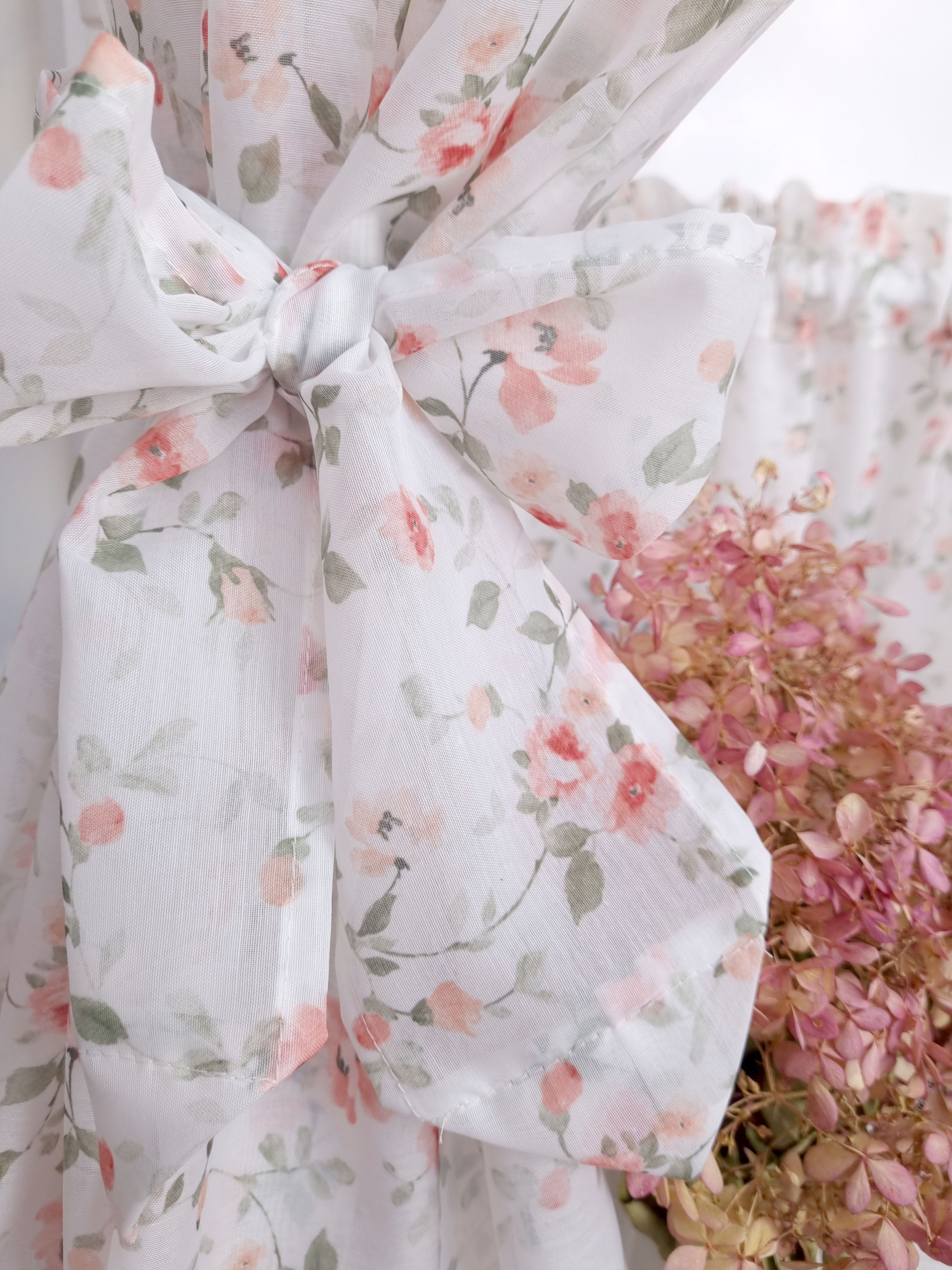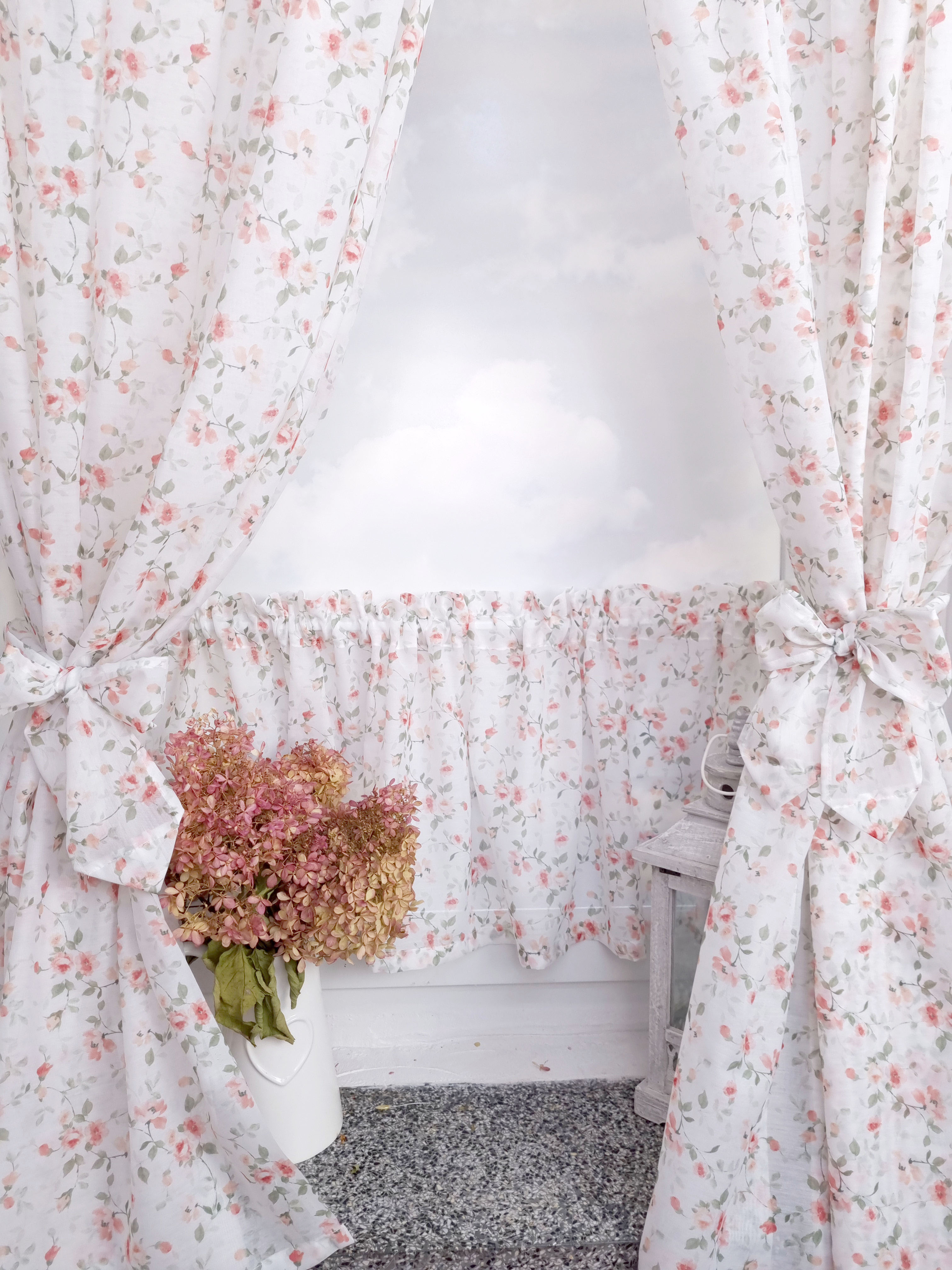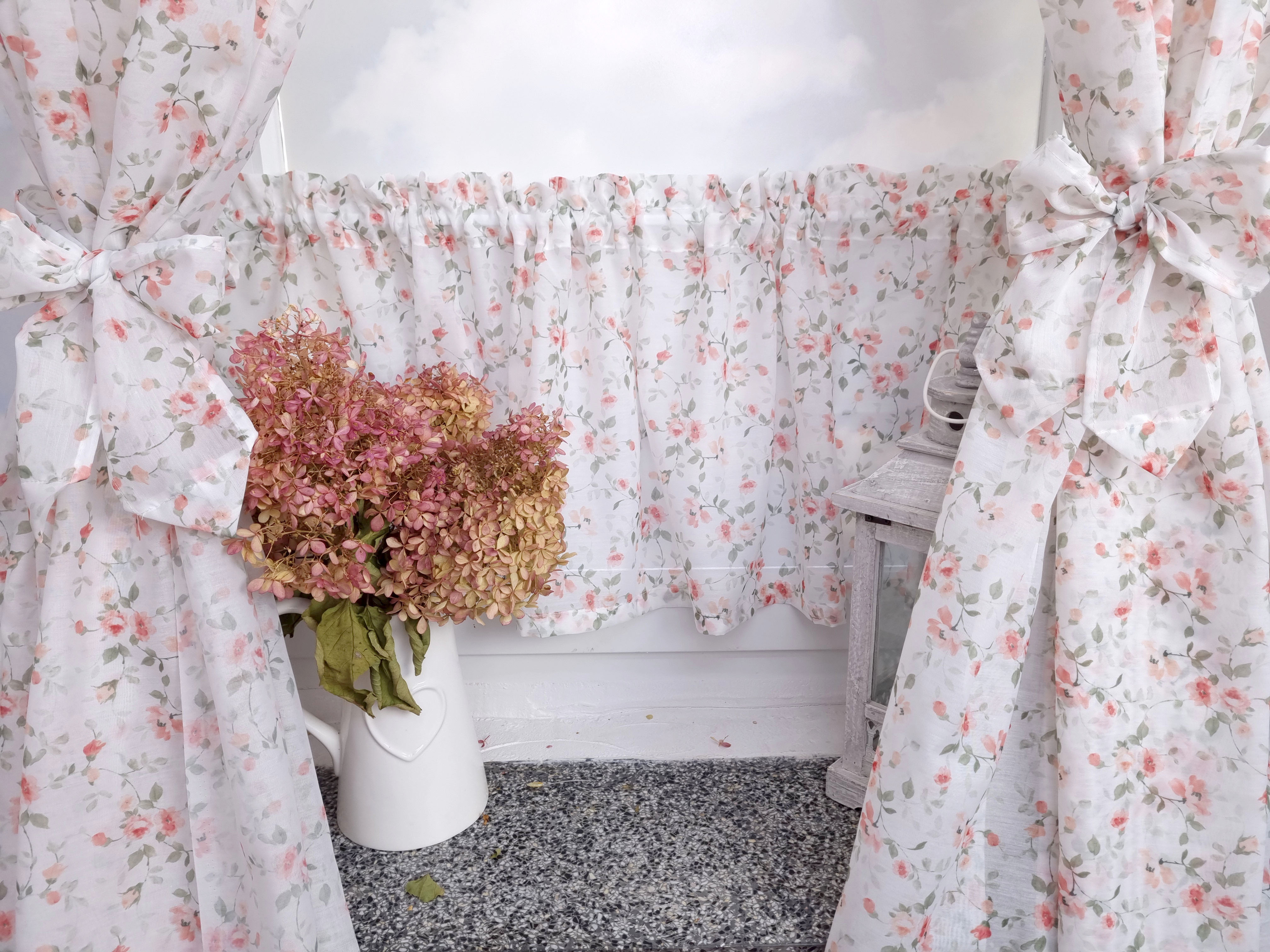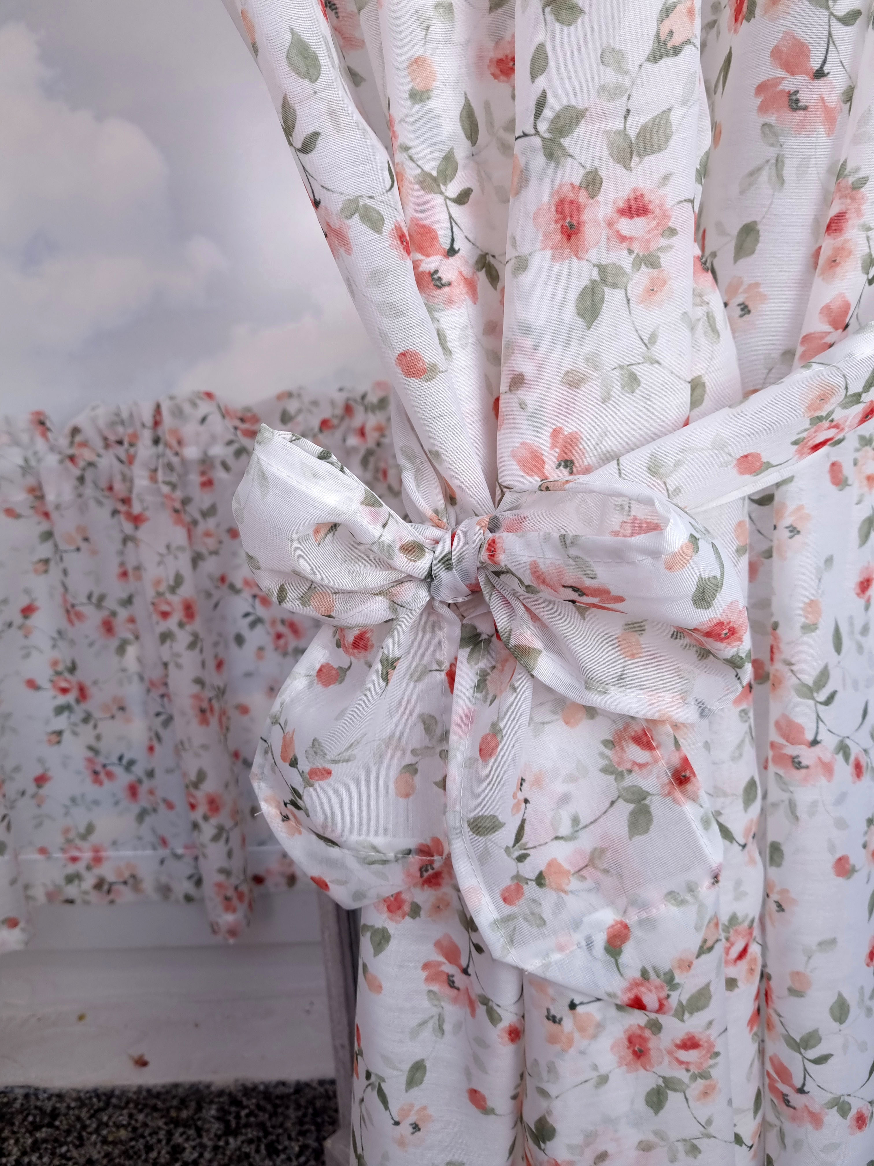 Komplet to dwie zasłonki na boki z wiązaniami oraz zazdrostka.