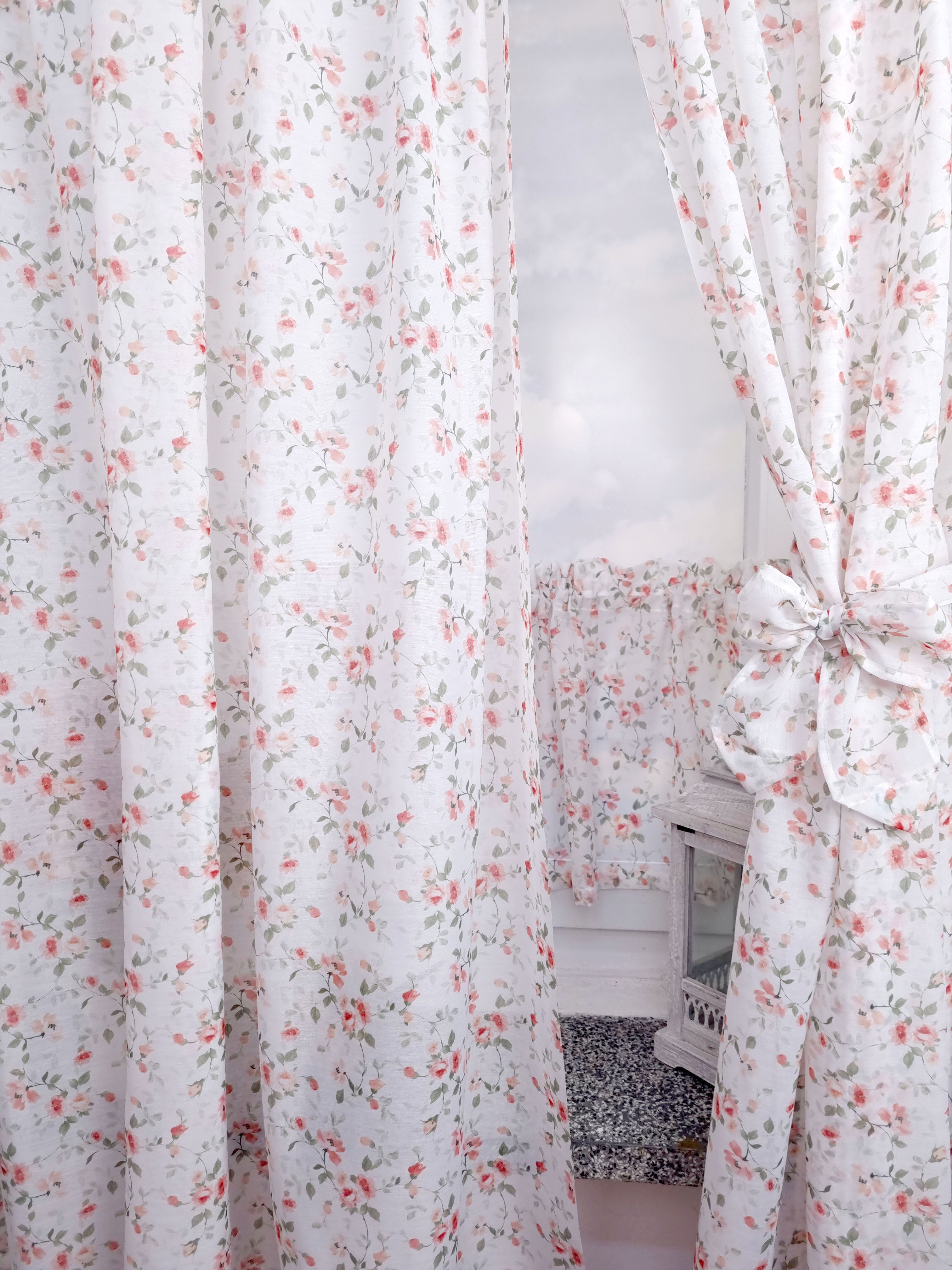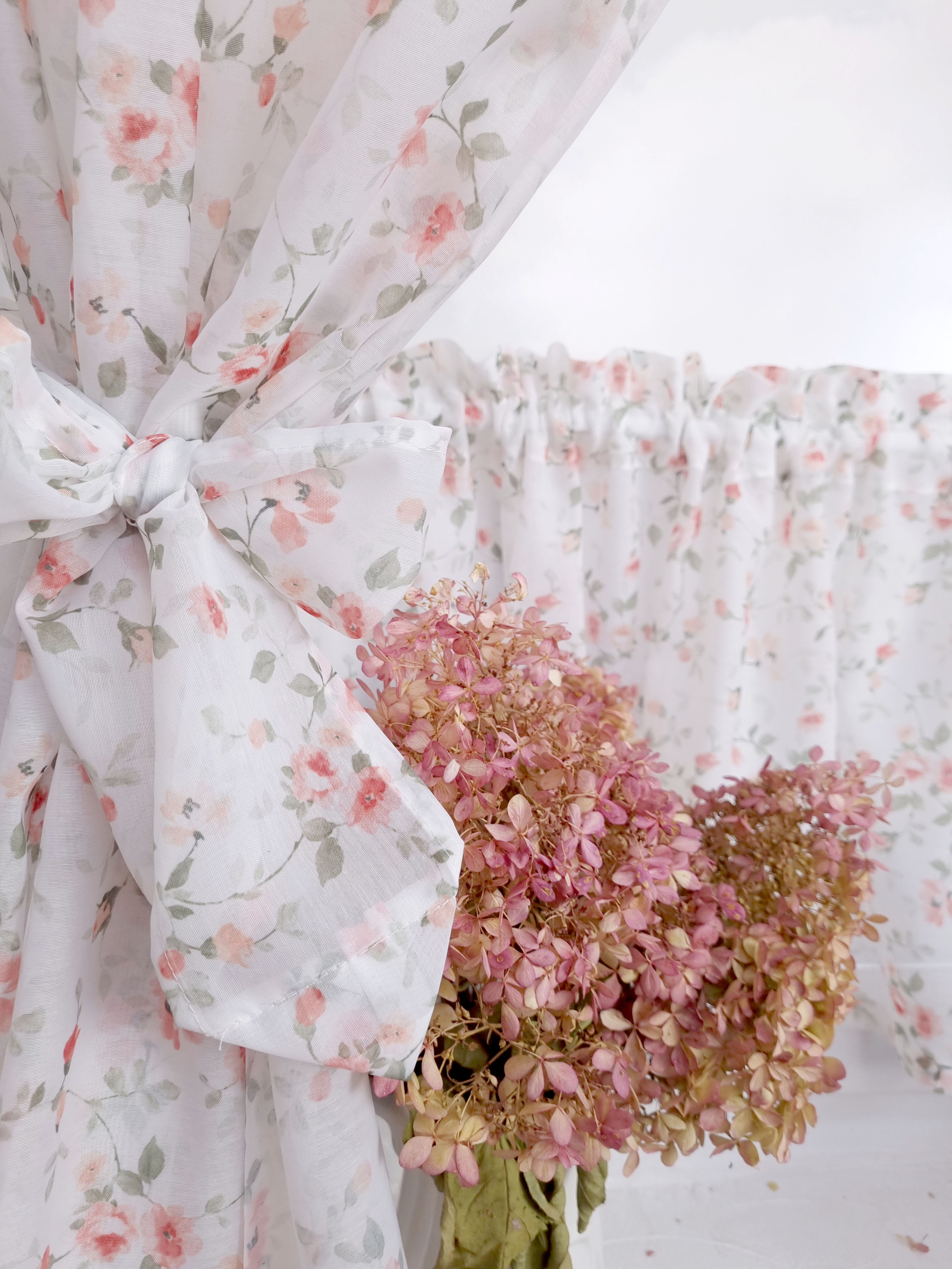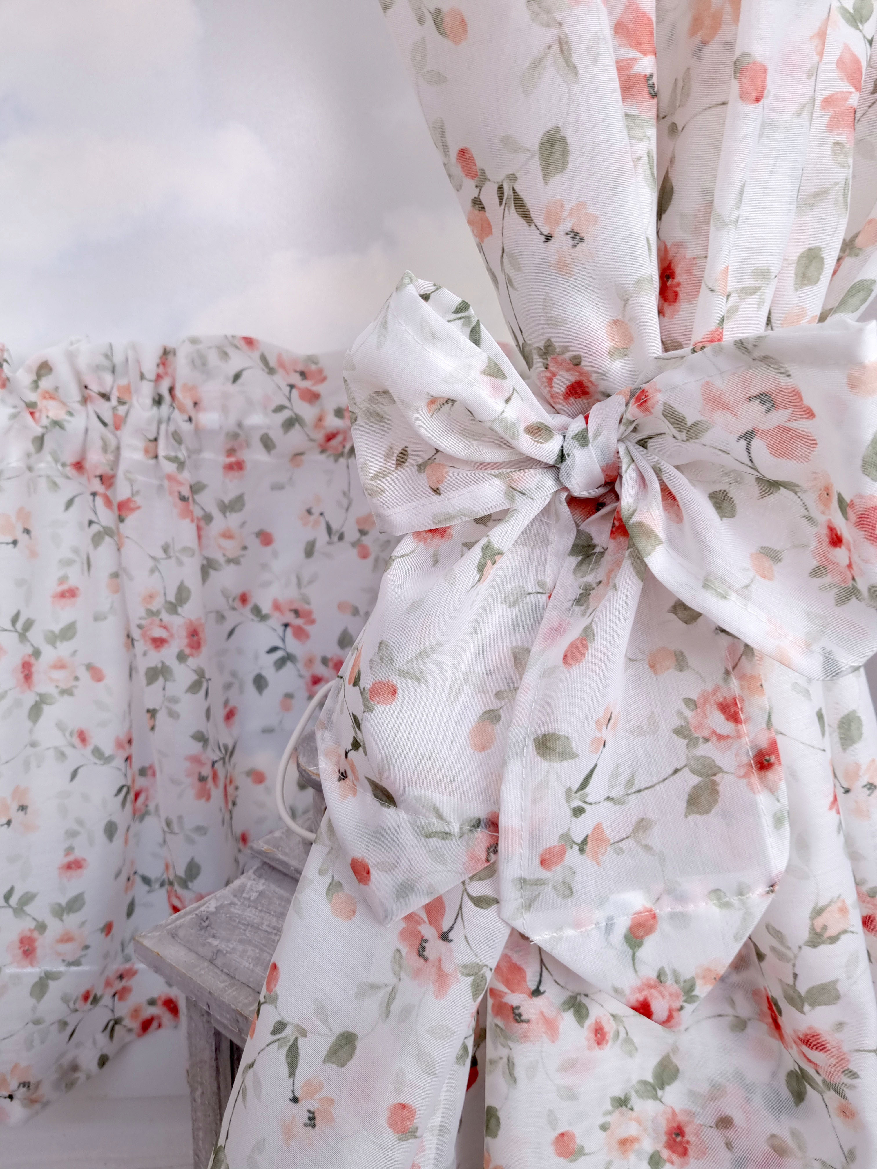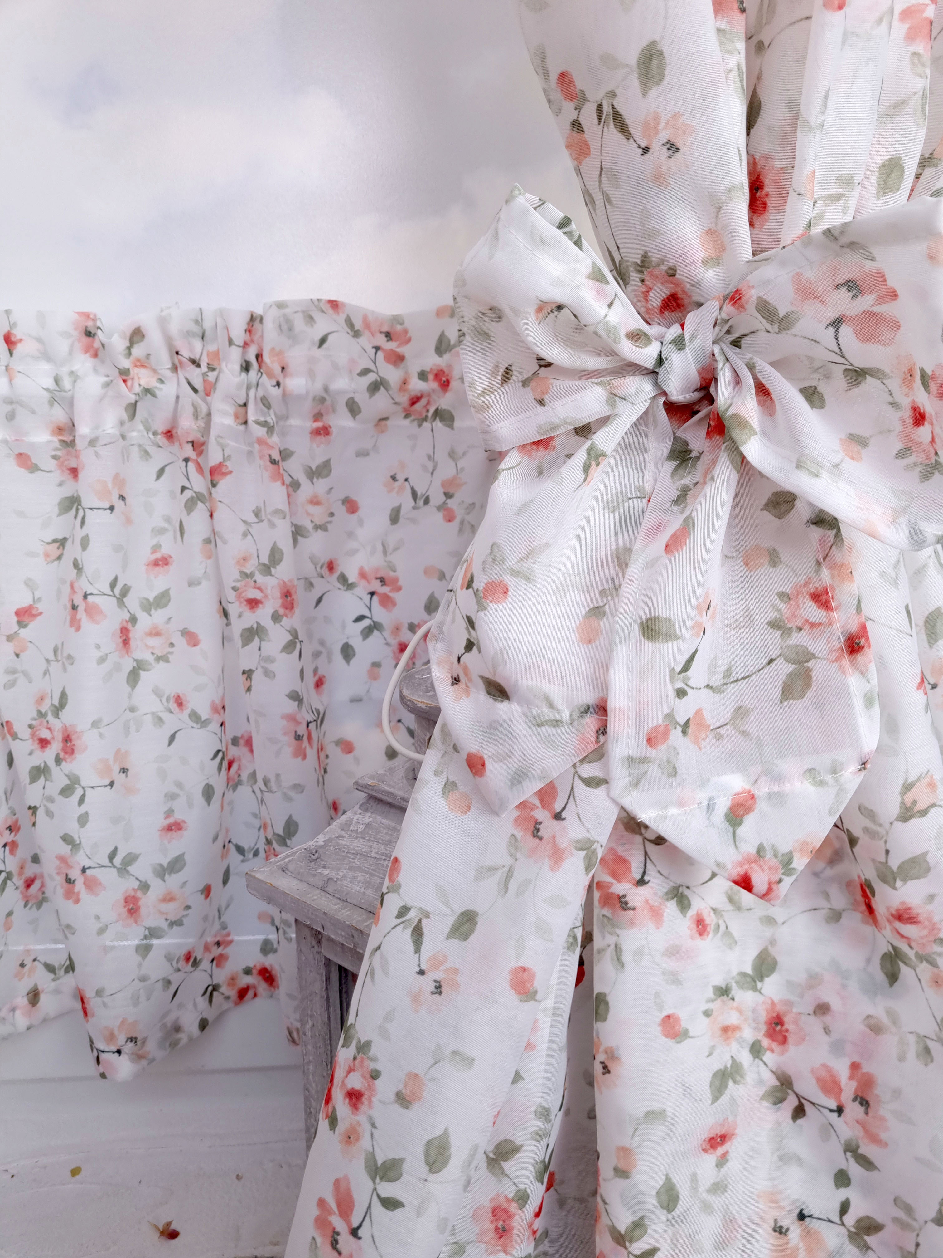 Komplet to dwie zasłonki na boki z wiązaniami oraz zazdrostka.