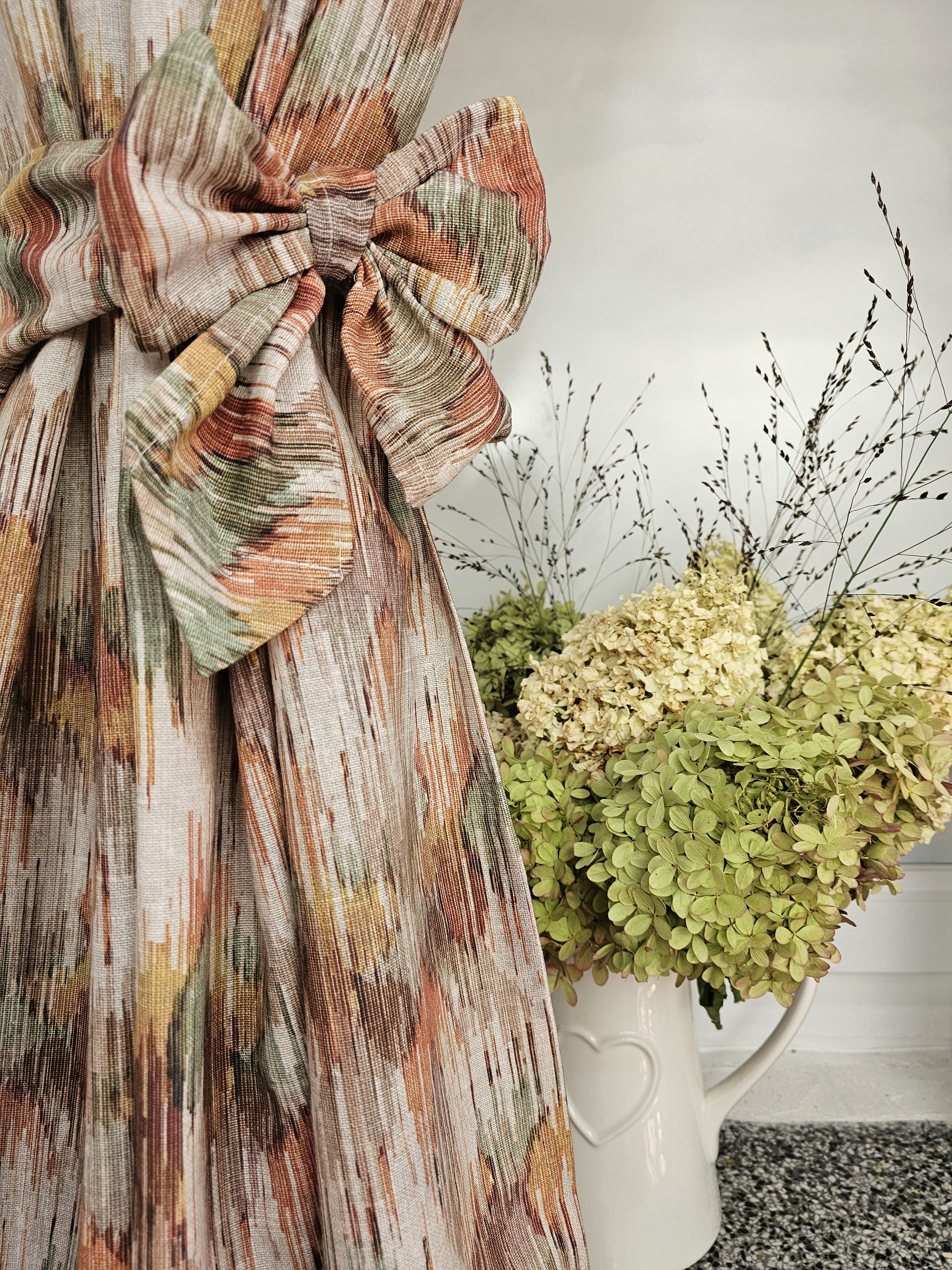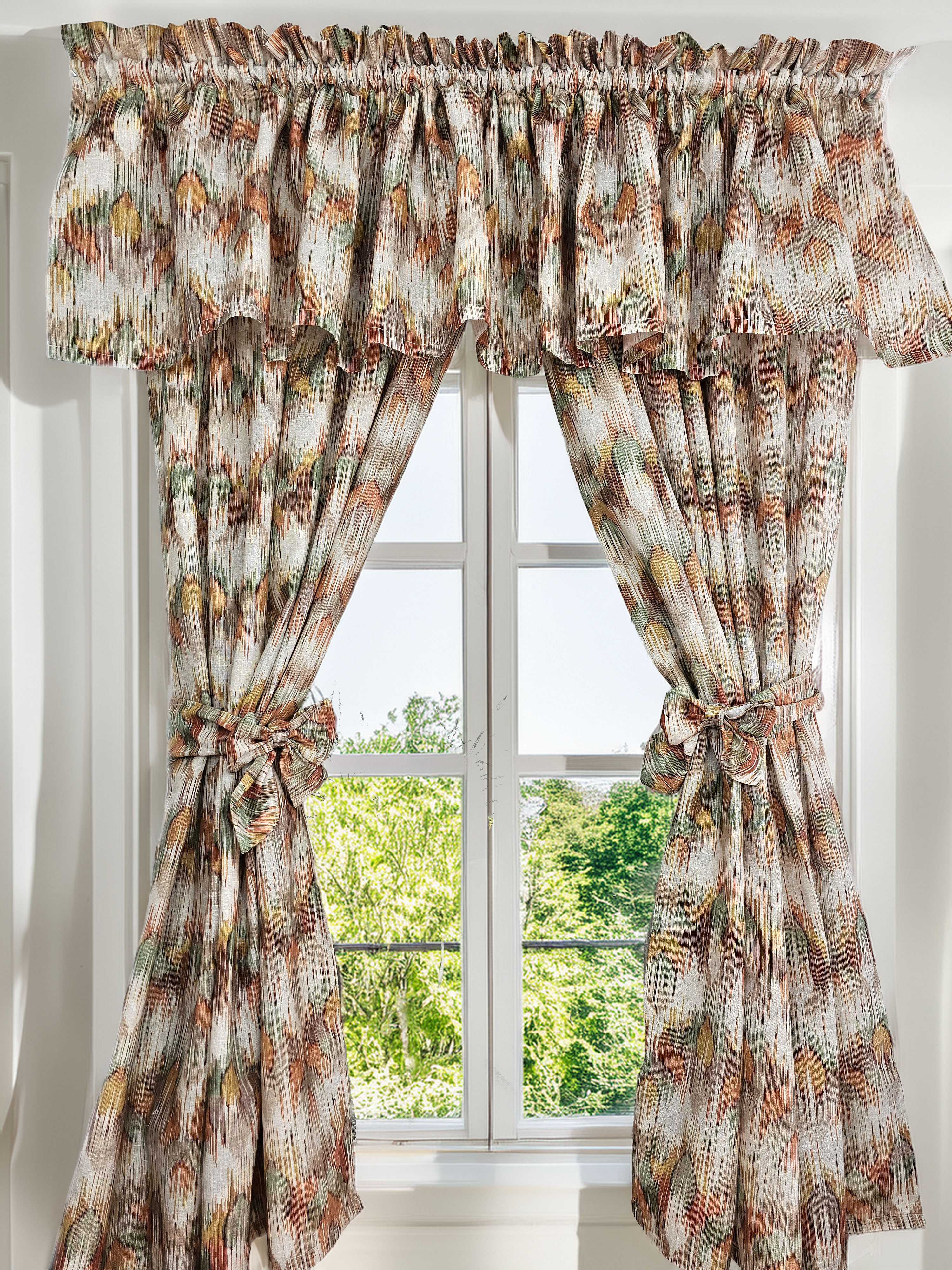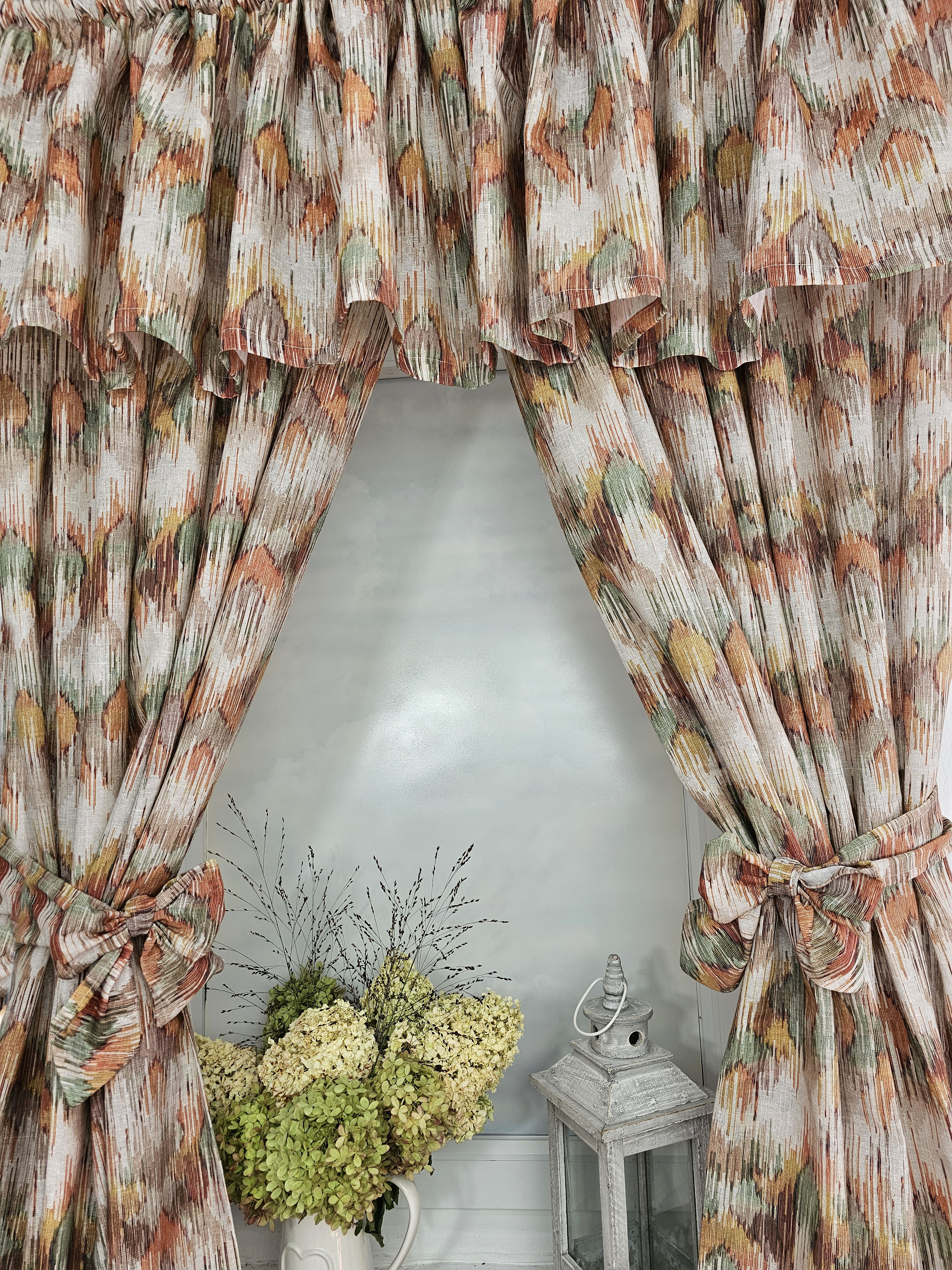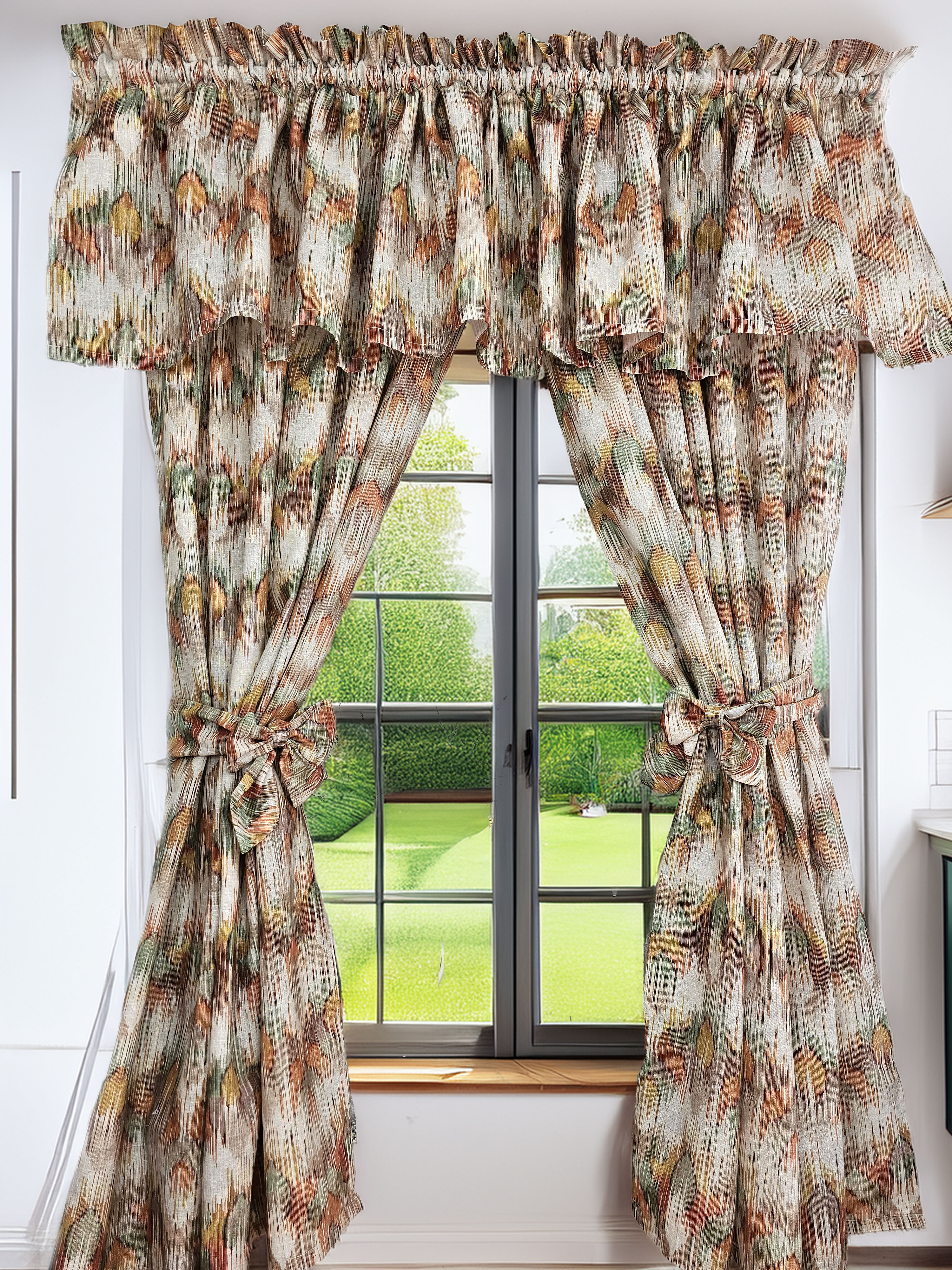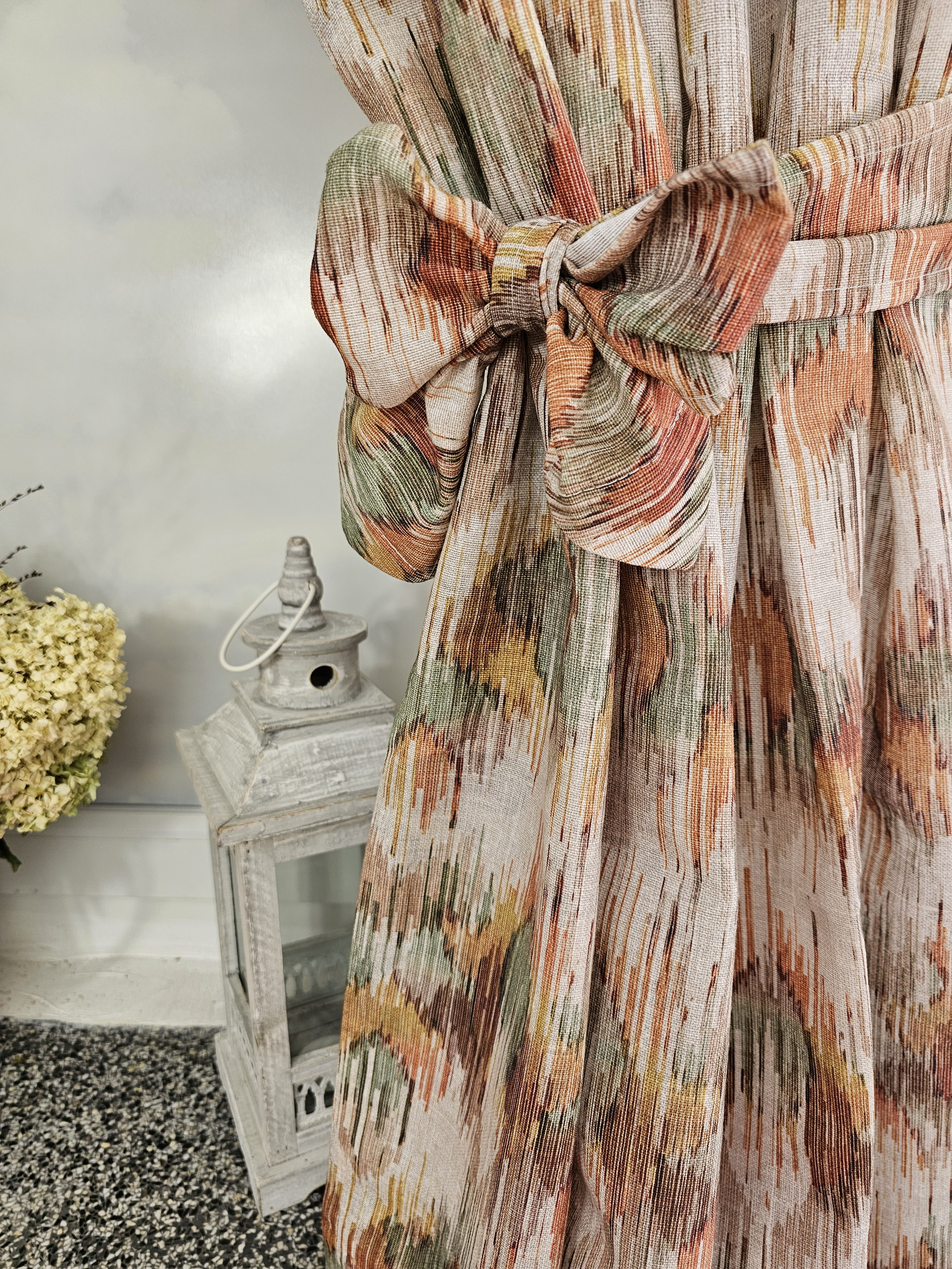 Komplet to dwie zasłonki na boki z wiązaniami oraz lambrekin.