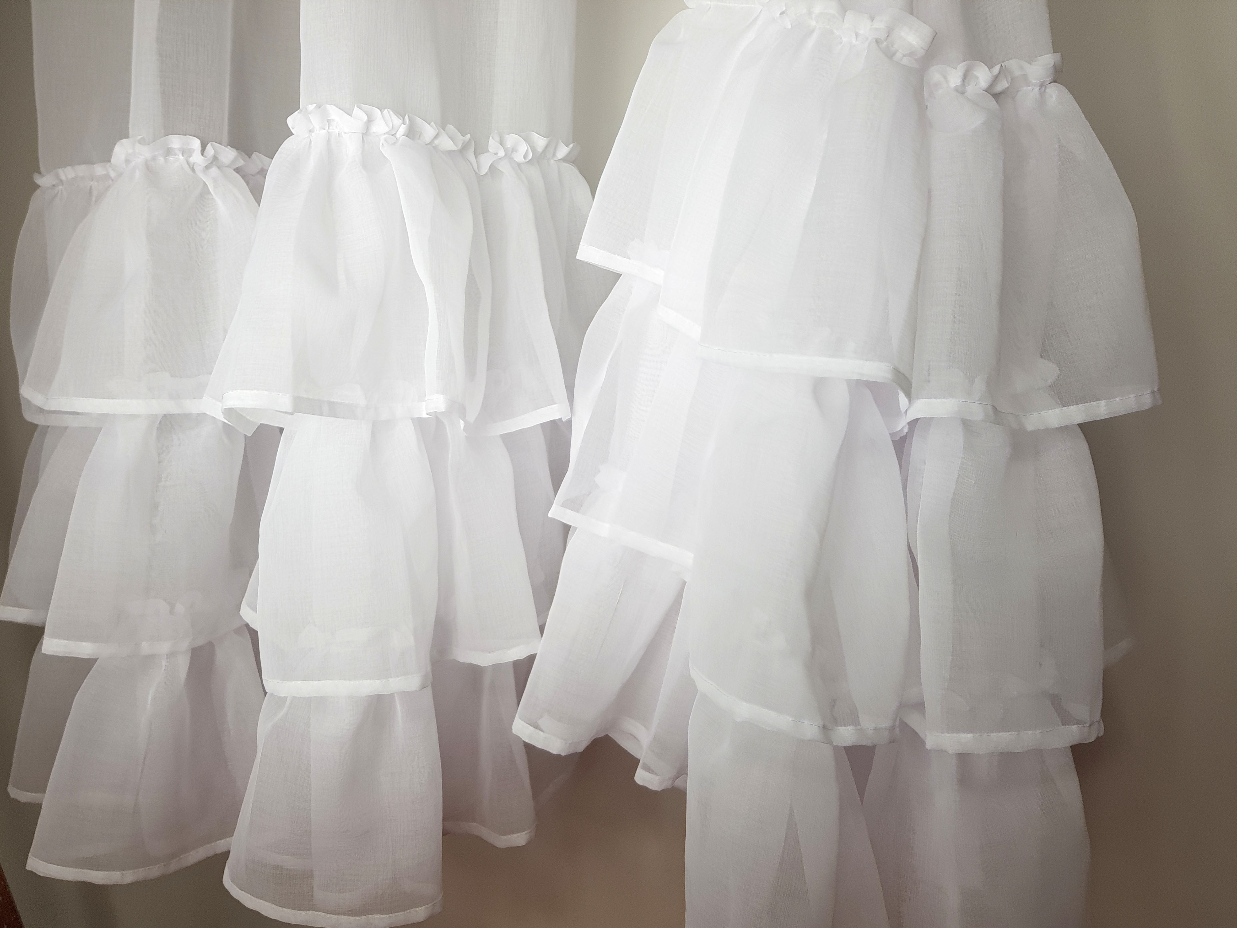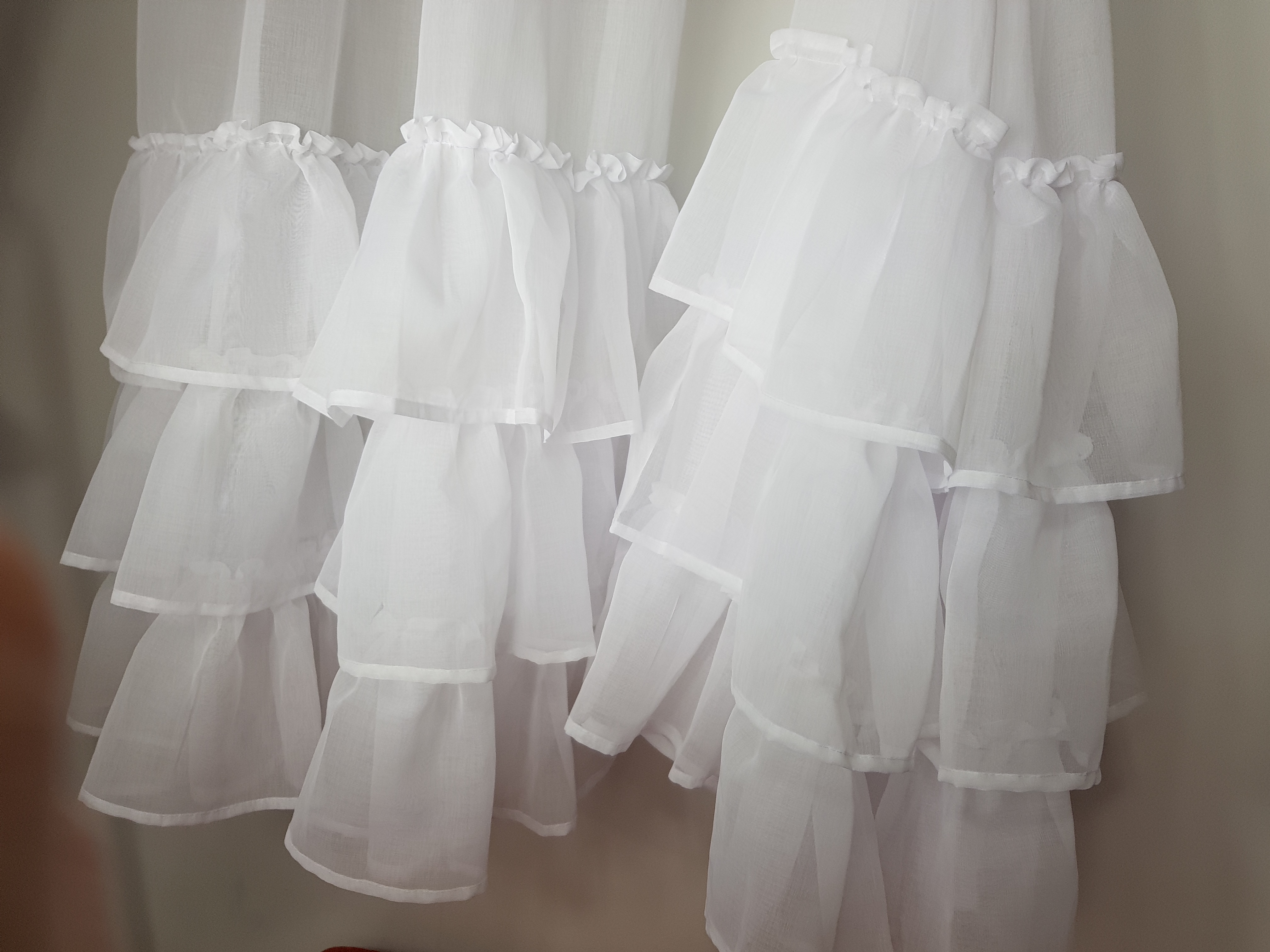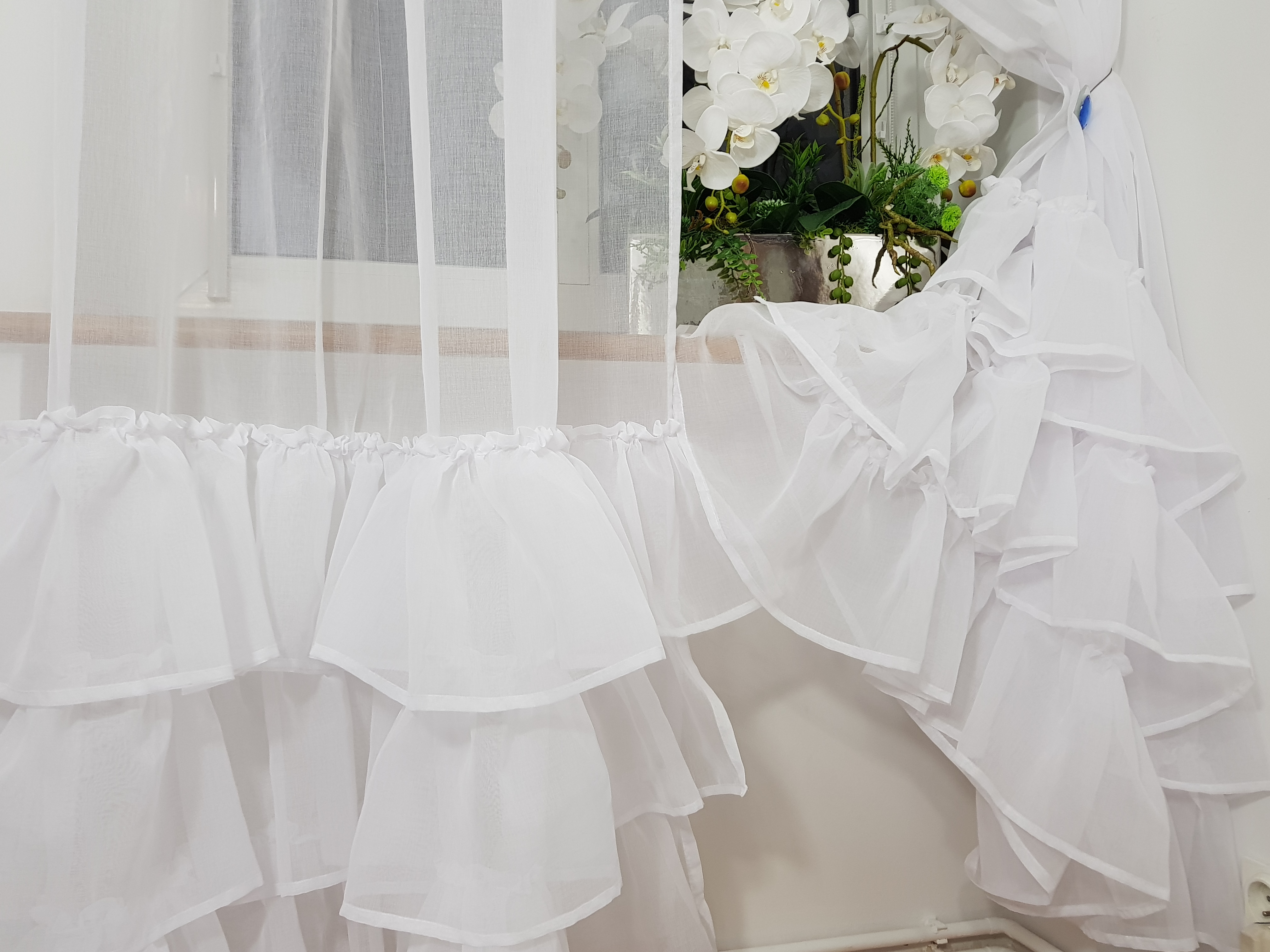 Firana ma trzy falbany dołem i jedną falbanę pod taśmą marszczacą.