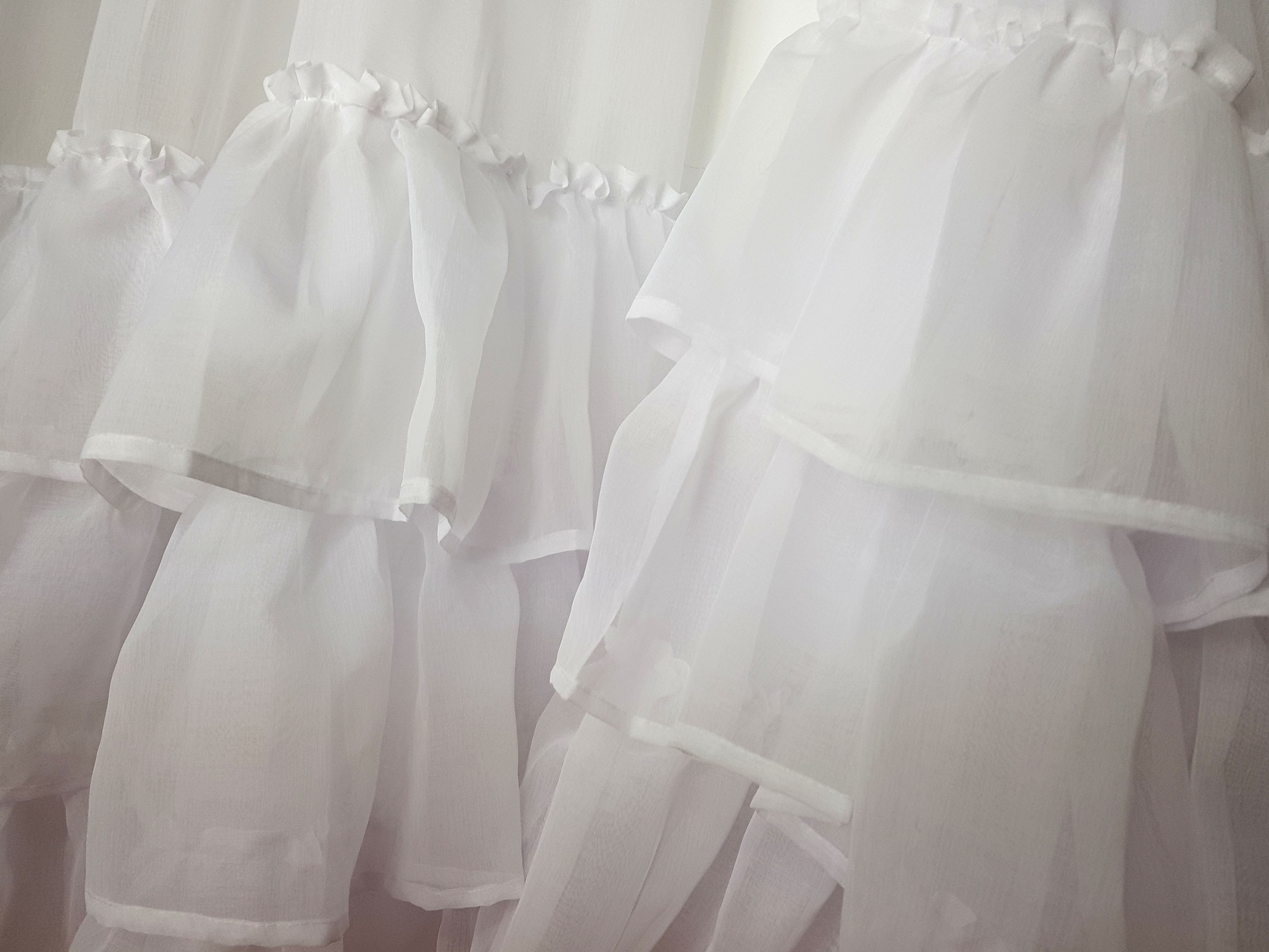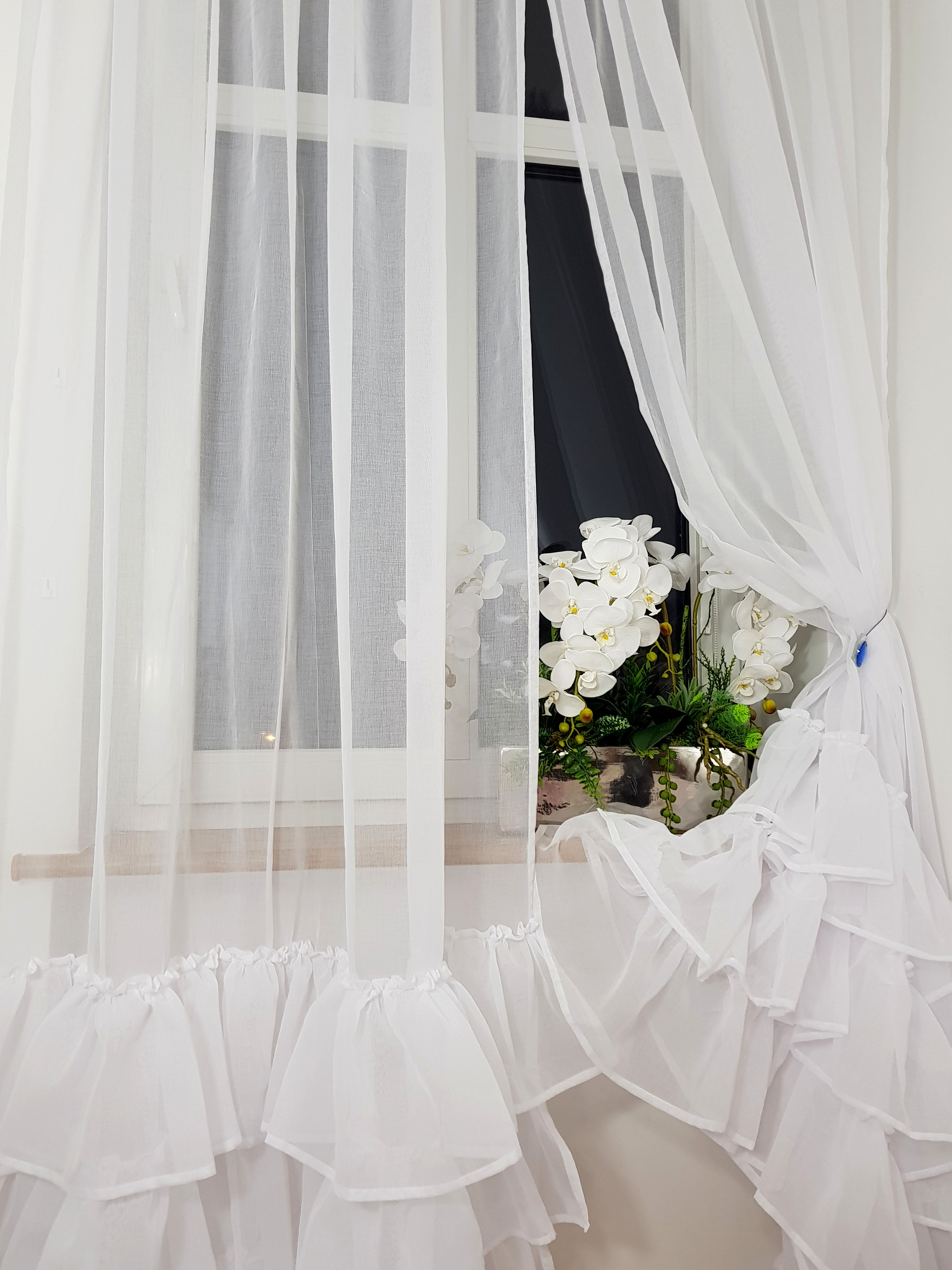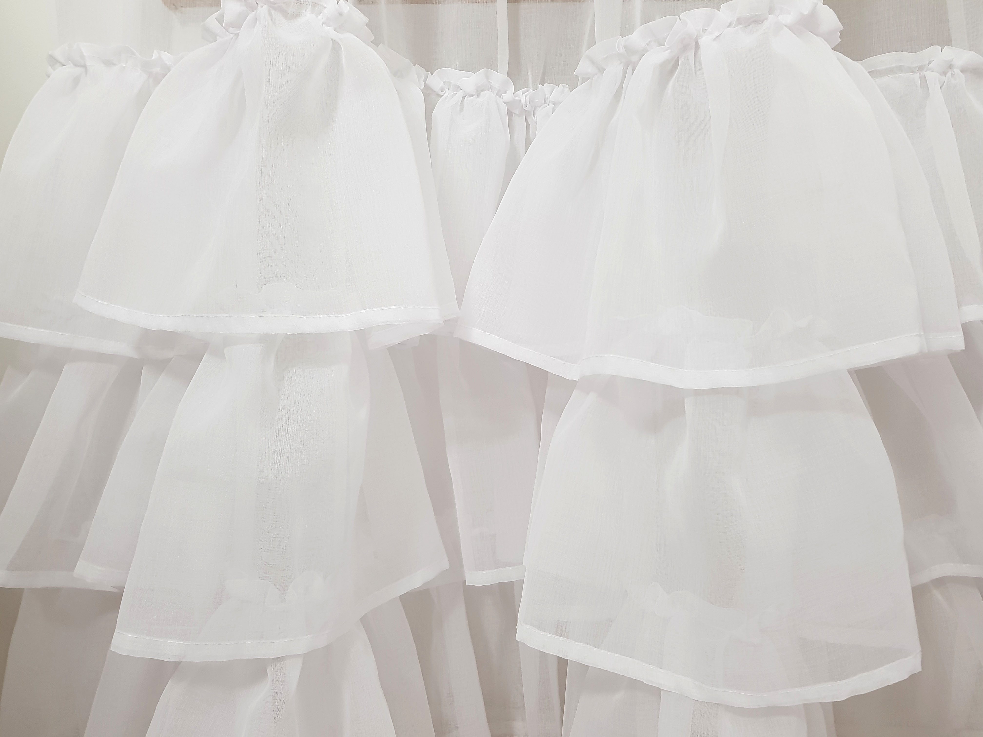 Firana ma trzy falbany dołem i jedną falbanę pod taśmą marszczacą.