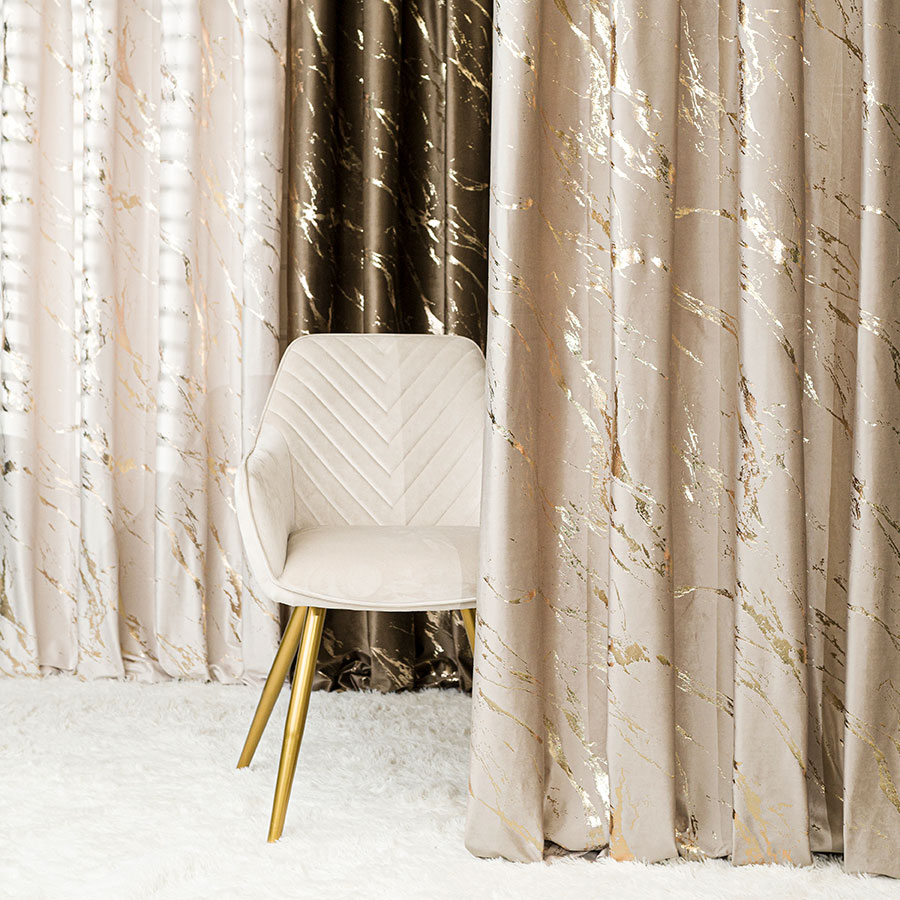 Zasłona półzaciemniająca w kolorach do wyboru, z nadrukiem złotym lub srebrnym.