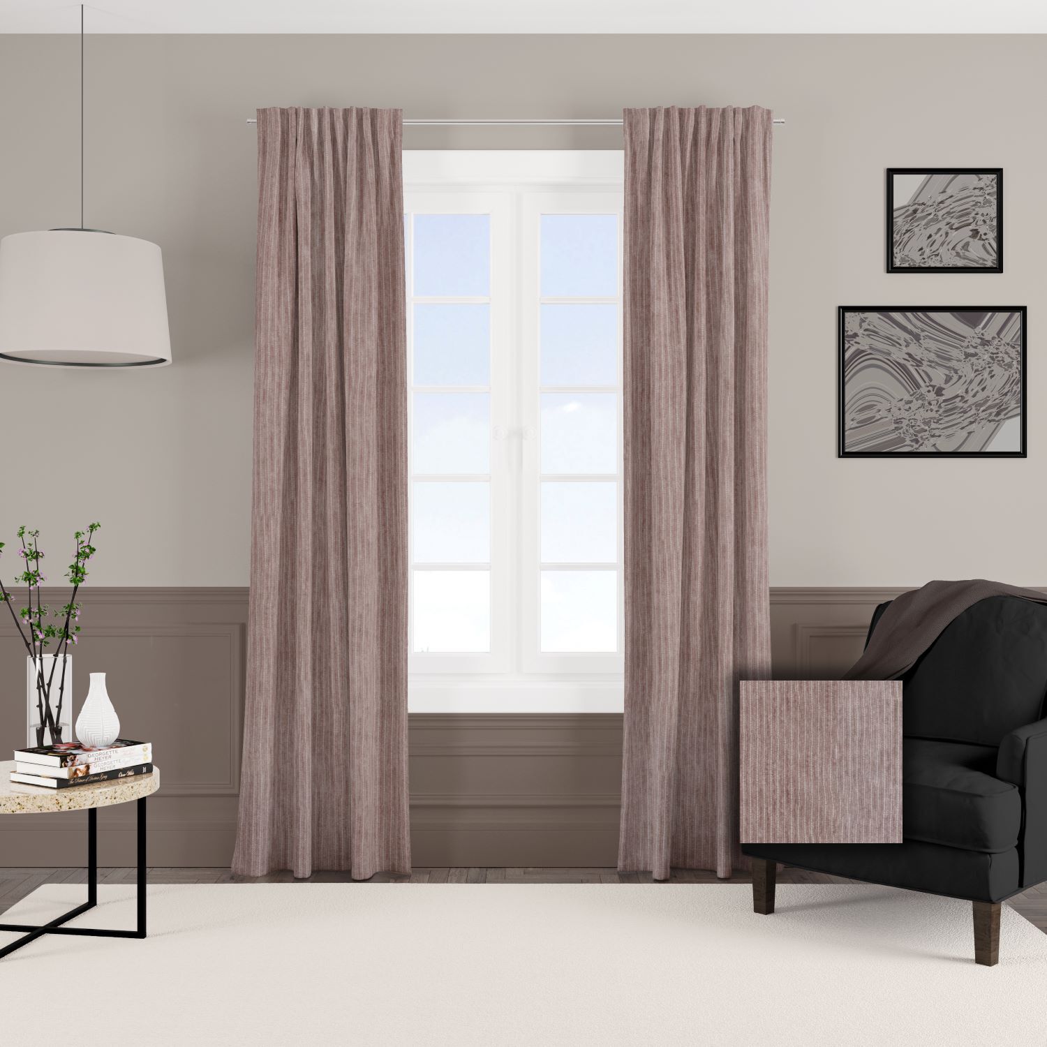 Zasłona z miękkiej tkaniny półzaciemniającej przypominjącej sztruks. Tkanina jest dość ciężka przez co bardzo fajnie się układa, jej dodatkową zaletą jest to że prawie sie nie gniecie. Bardzo przyjemna w dotyku więc nadaje sie też na poszewki i inne dekoracje.