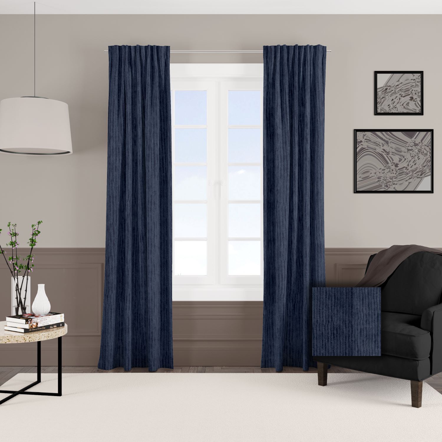Zasłona z miękkiej tkaniny półzaciemniającej przypominjącej sztruks. Tkanina jest dość ciężka przez co bardzo fajnie się układa, jej dodatkową zaletą jest to że prawie sie nie gniecie. Bardzo przyjemna w dotyku więc nadaje sie też na poszewki i inne dekoracje.