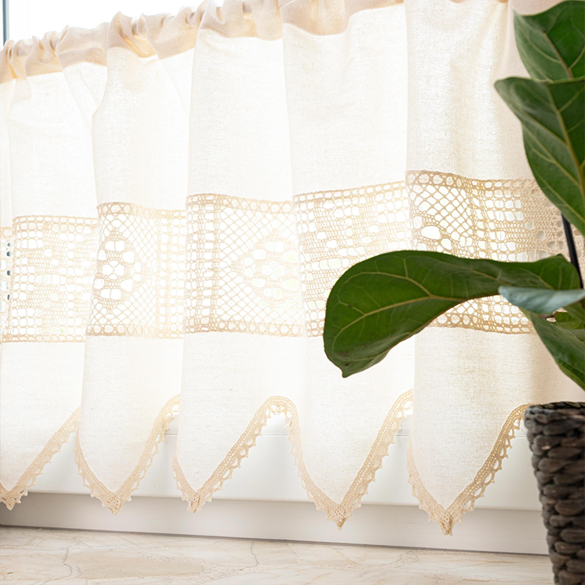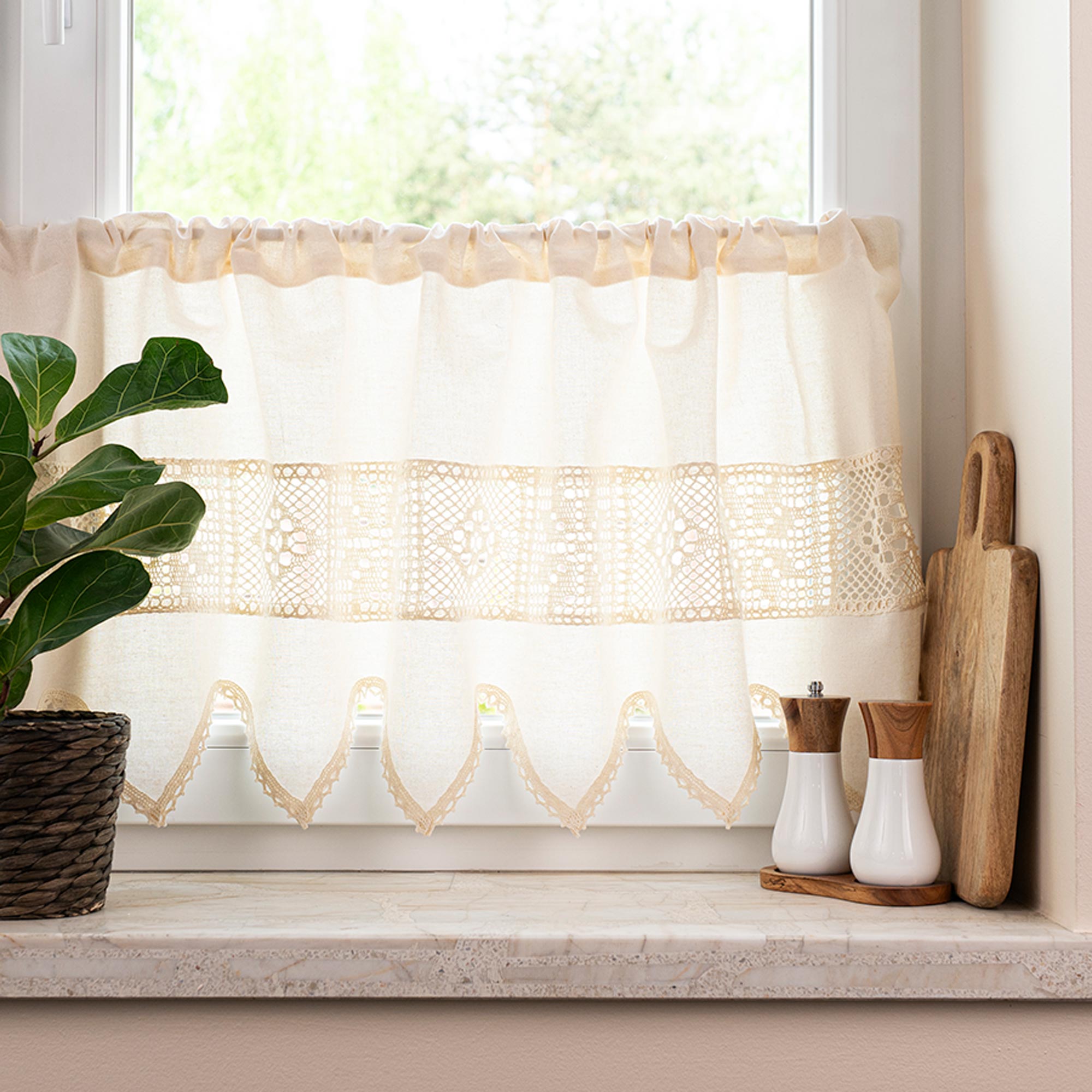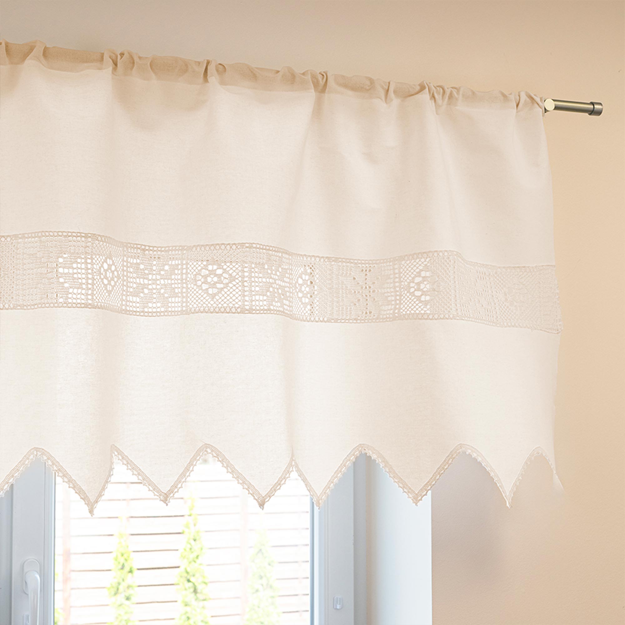 Zazdrostka kuchenna z ażurem doskonale sprawdzi się jako ozdoba okna w kuchni. Delikatna koroneczka z chwostem wprowadzi do kuchni nutę romantyzmu i przytulności, tworząc klimat.