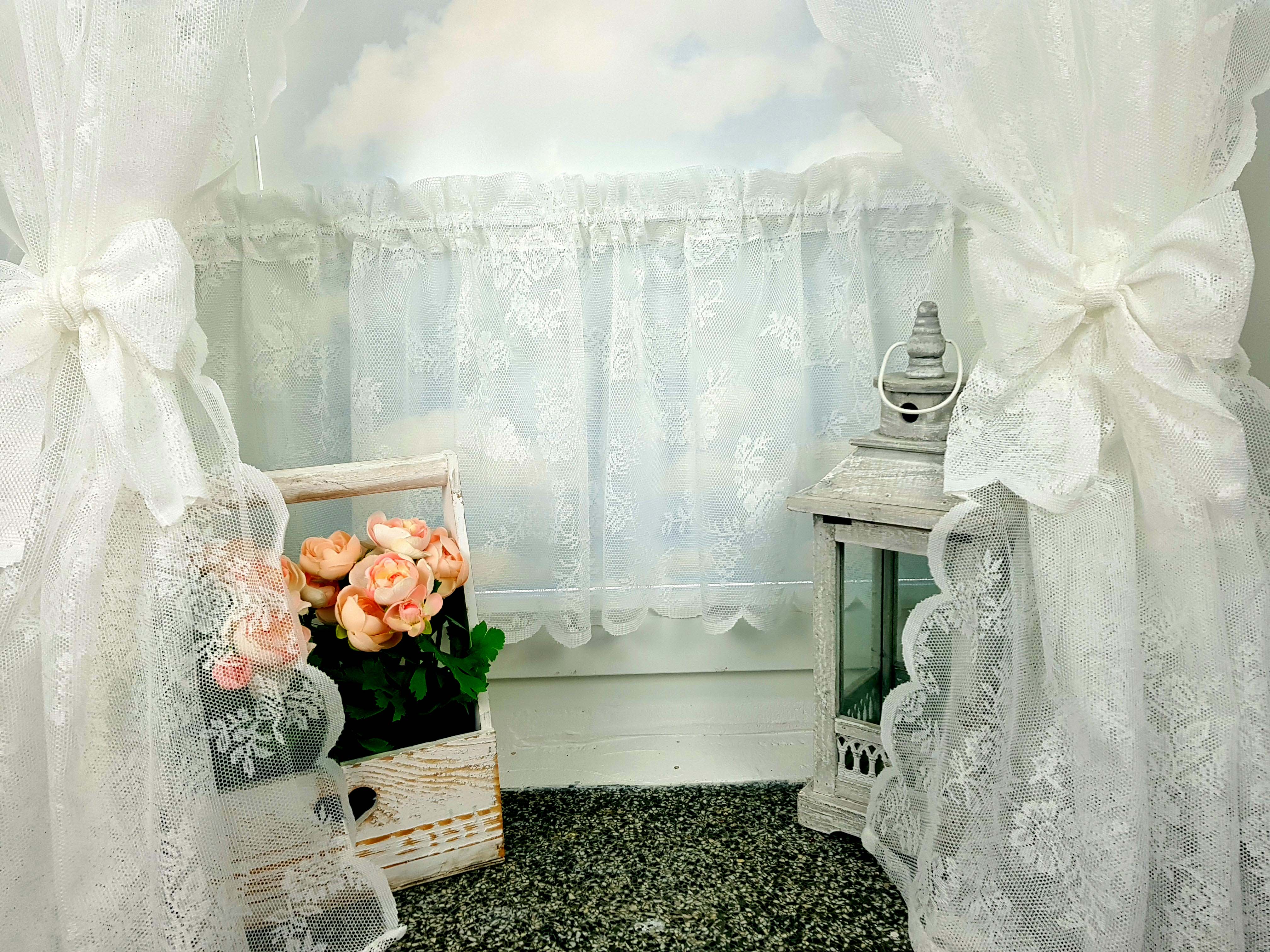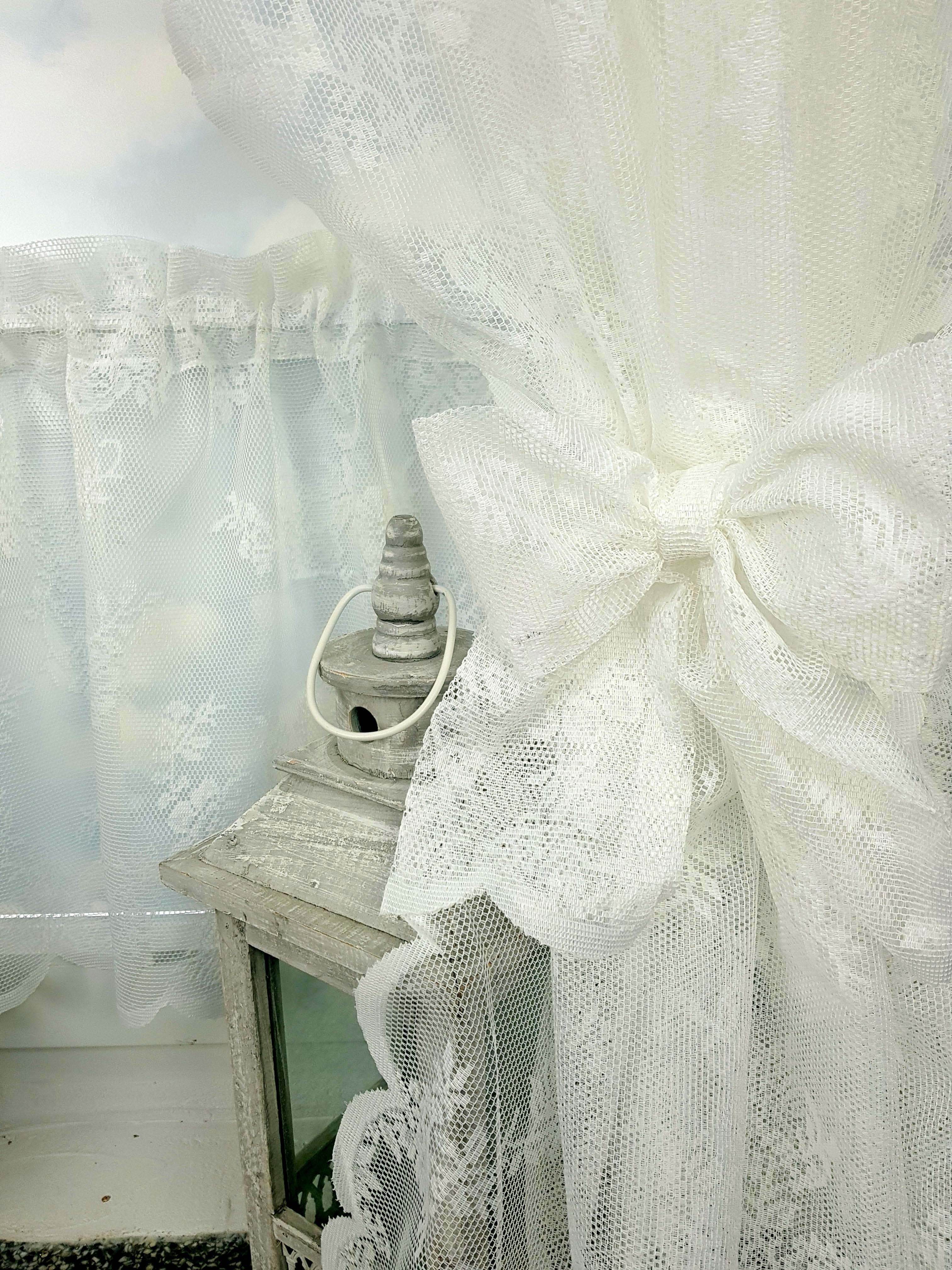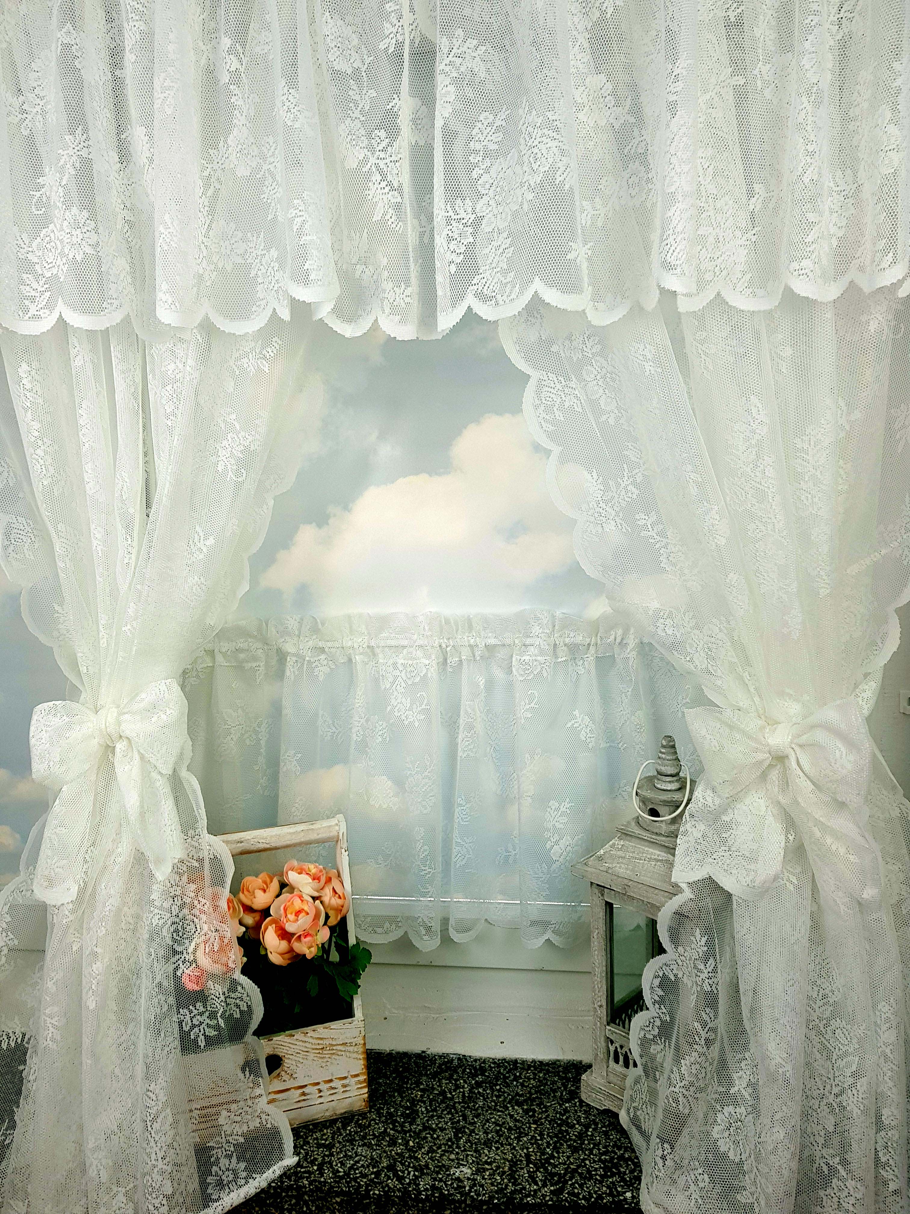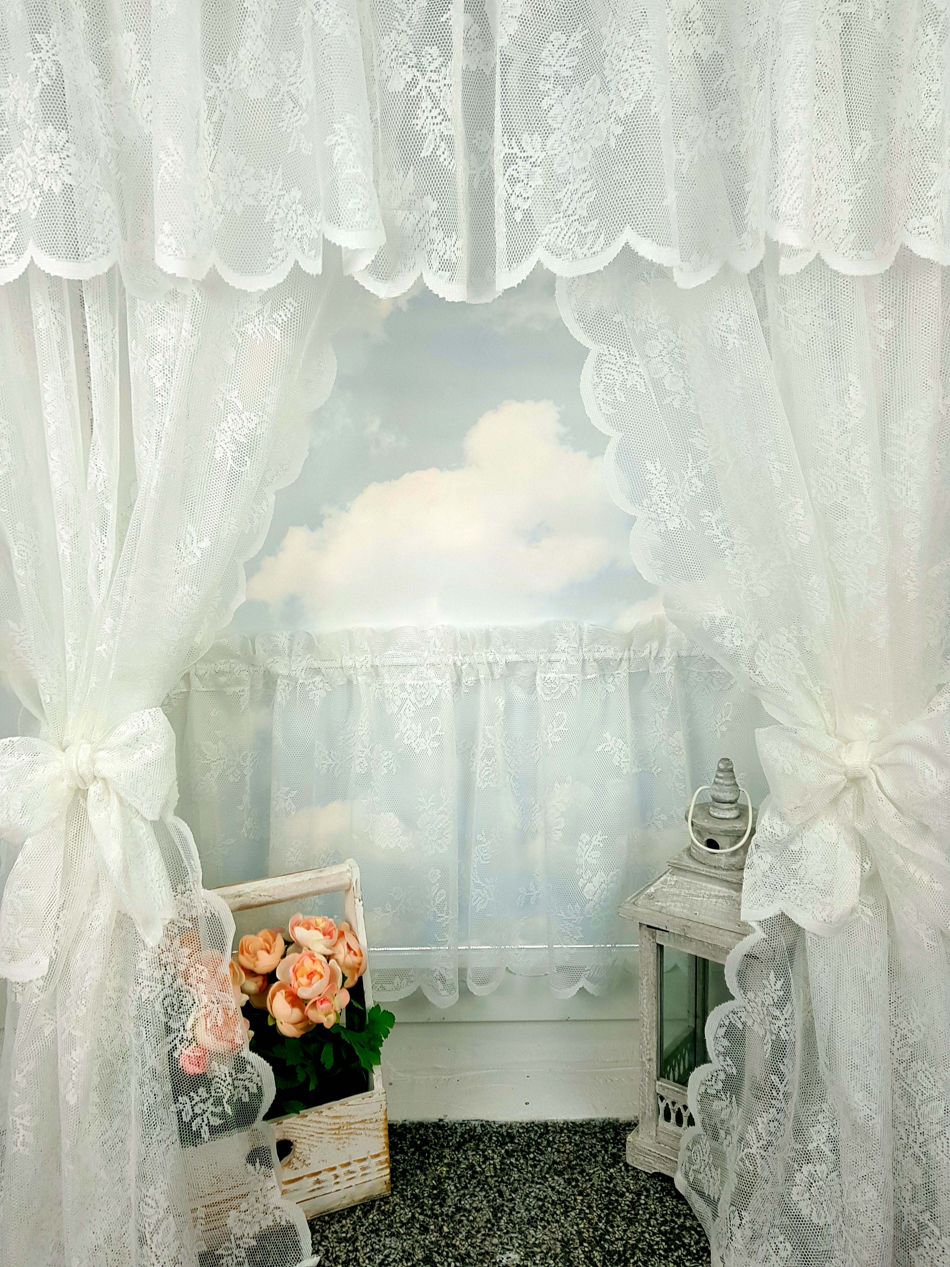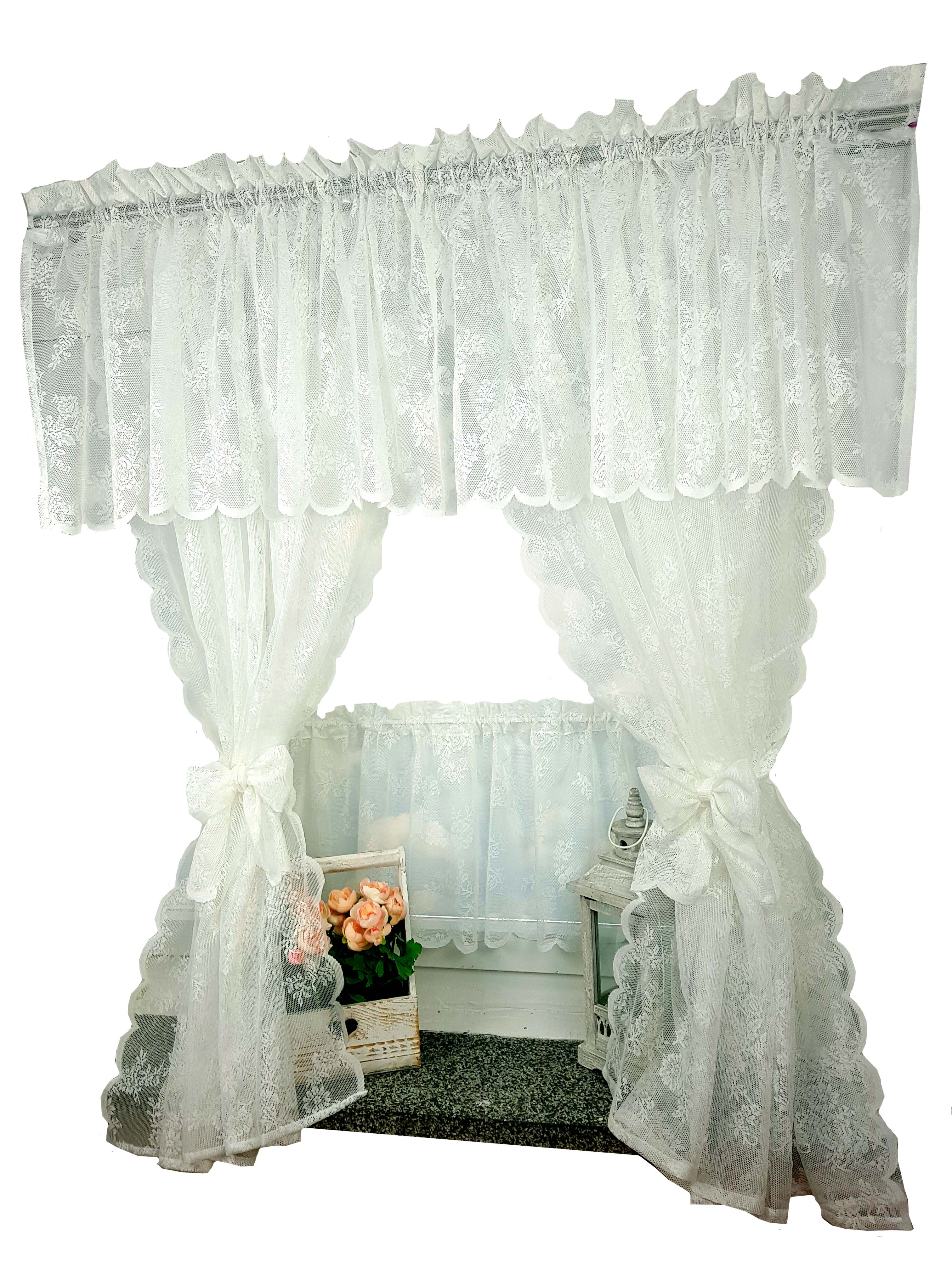 Komplet to lambrekin, dwie zasłonki na boki z wiązaniami oraz zazdrostka.