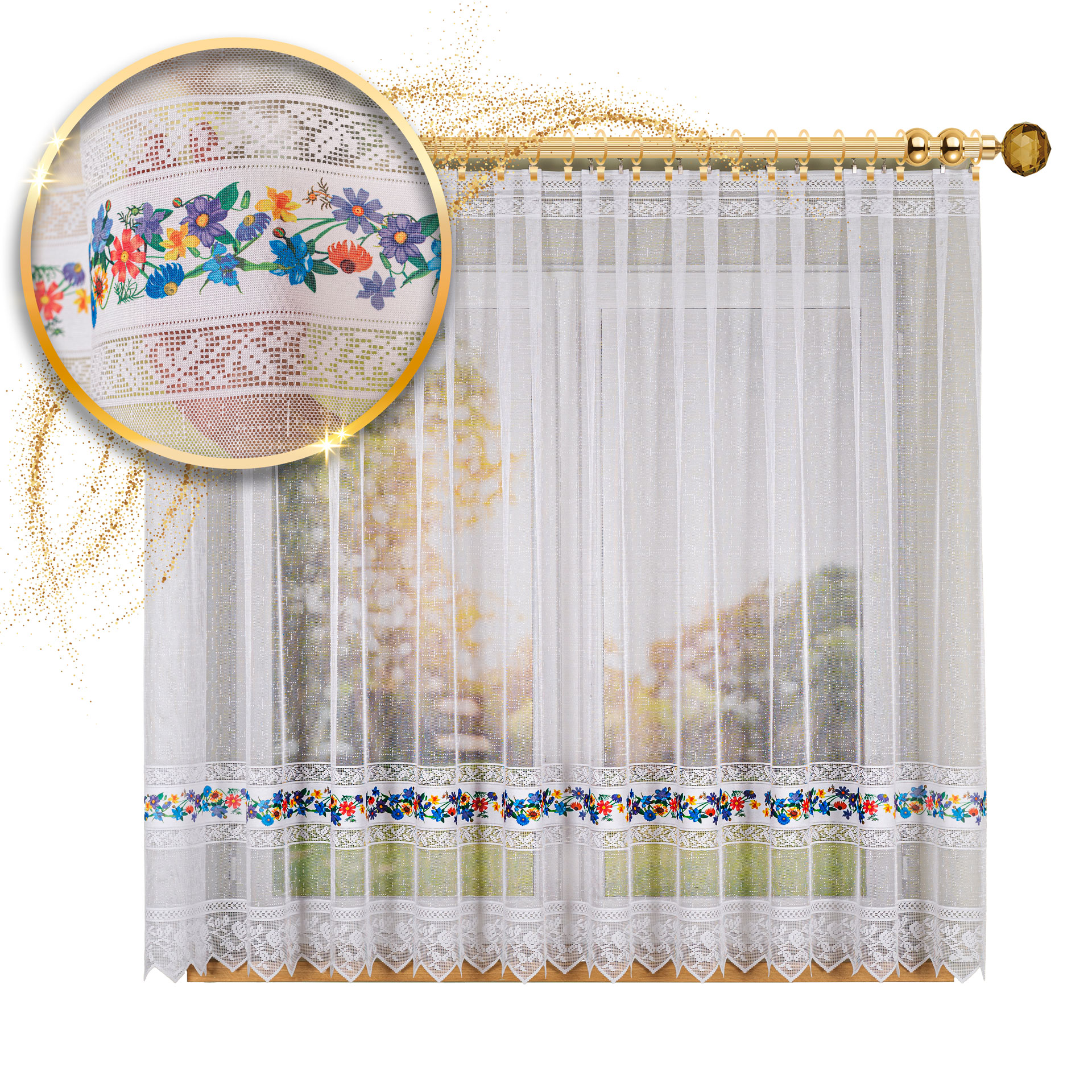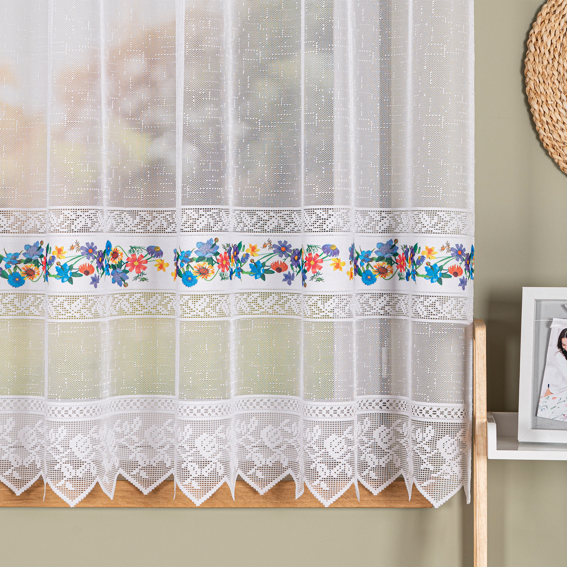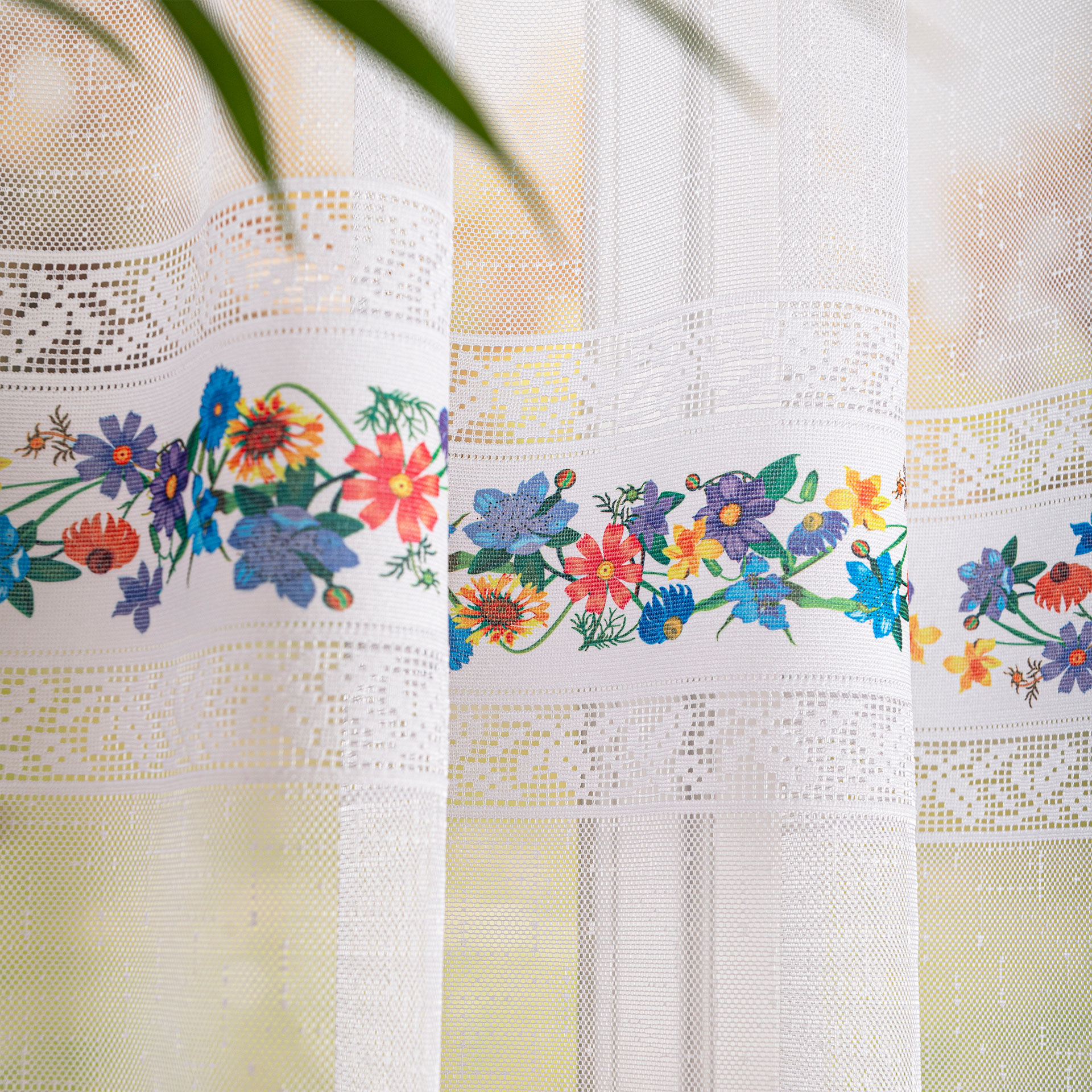Firana przezroczysta żakardowa z kwiatowym nadrukiem.