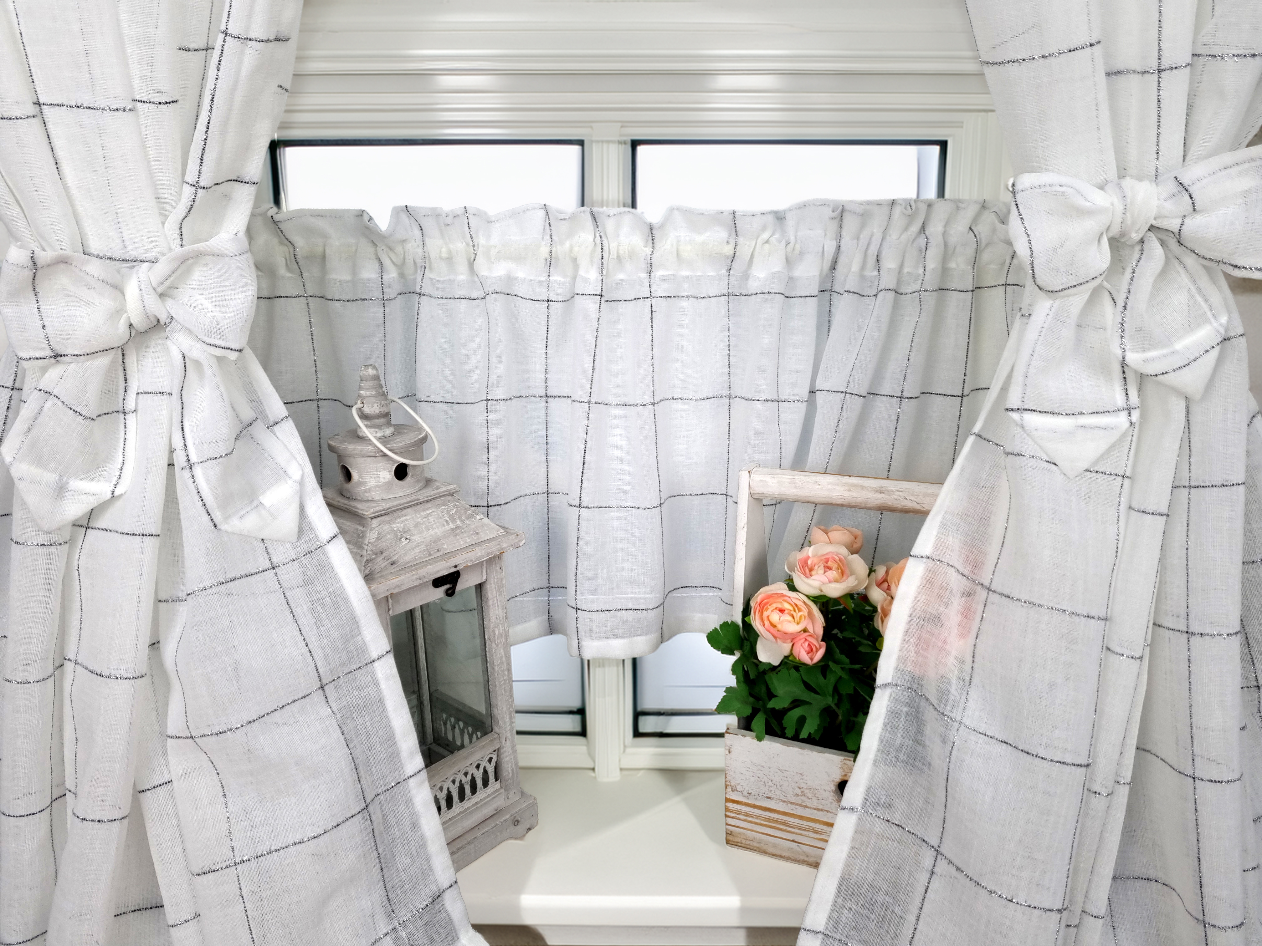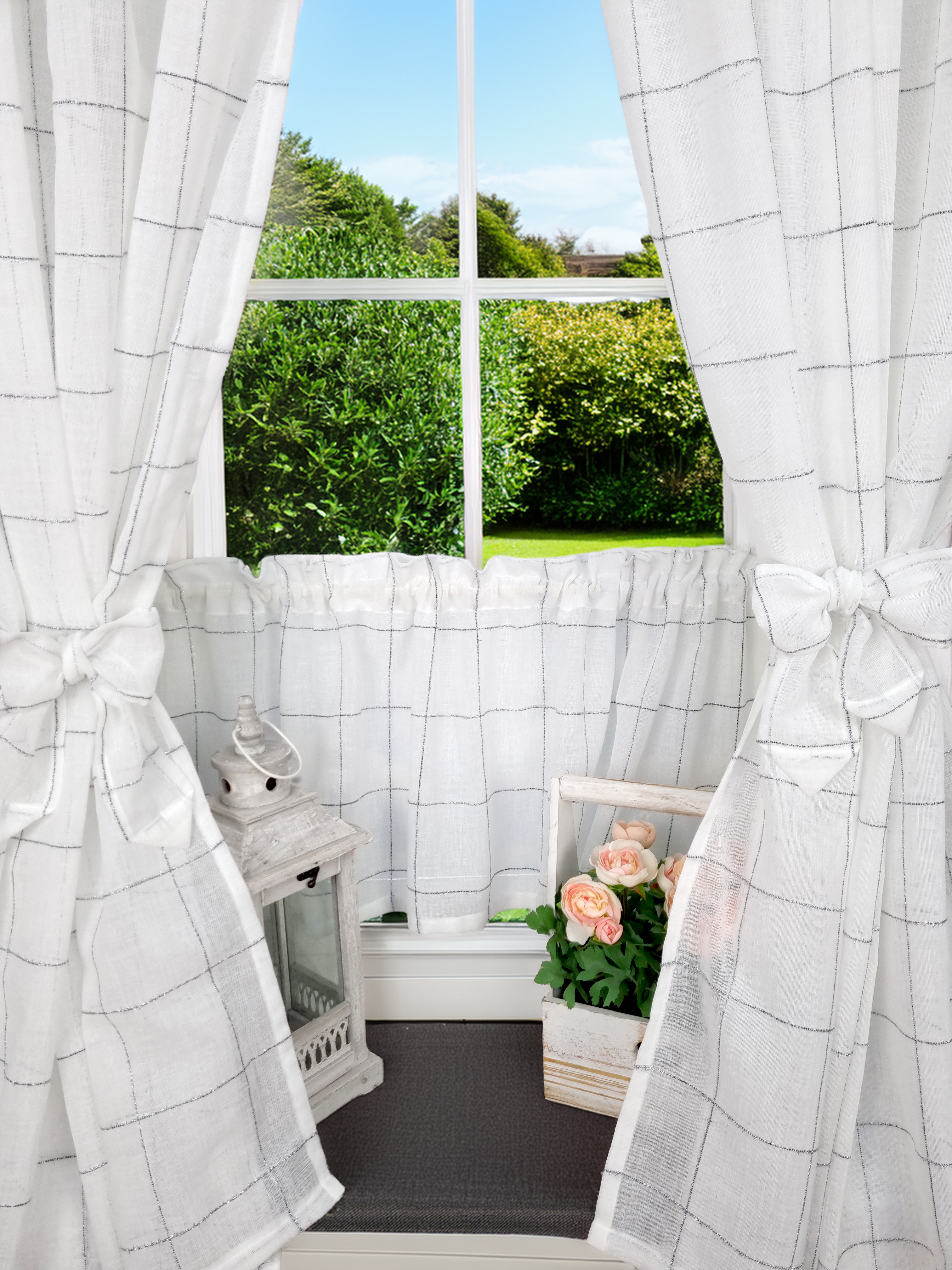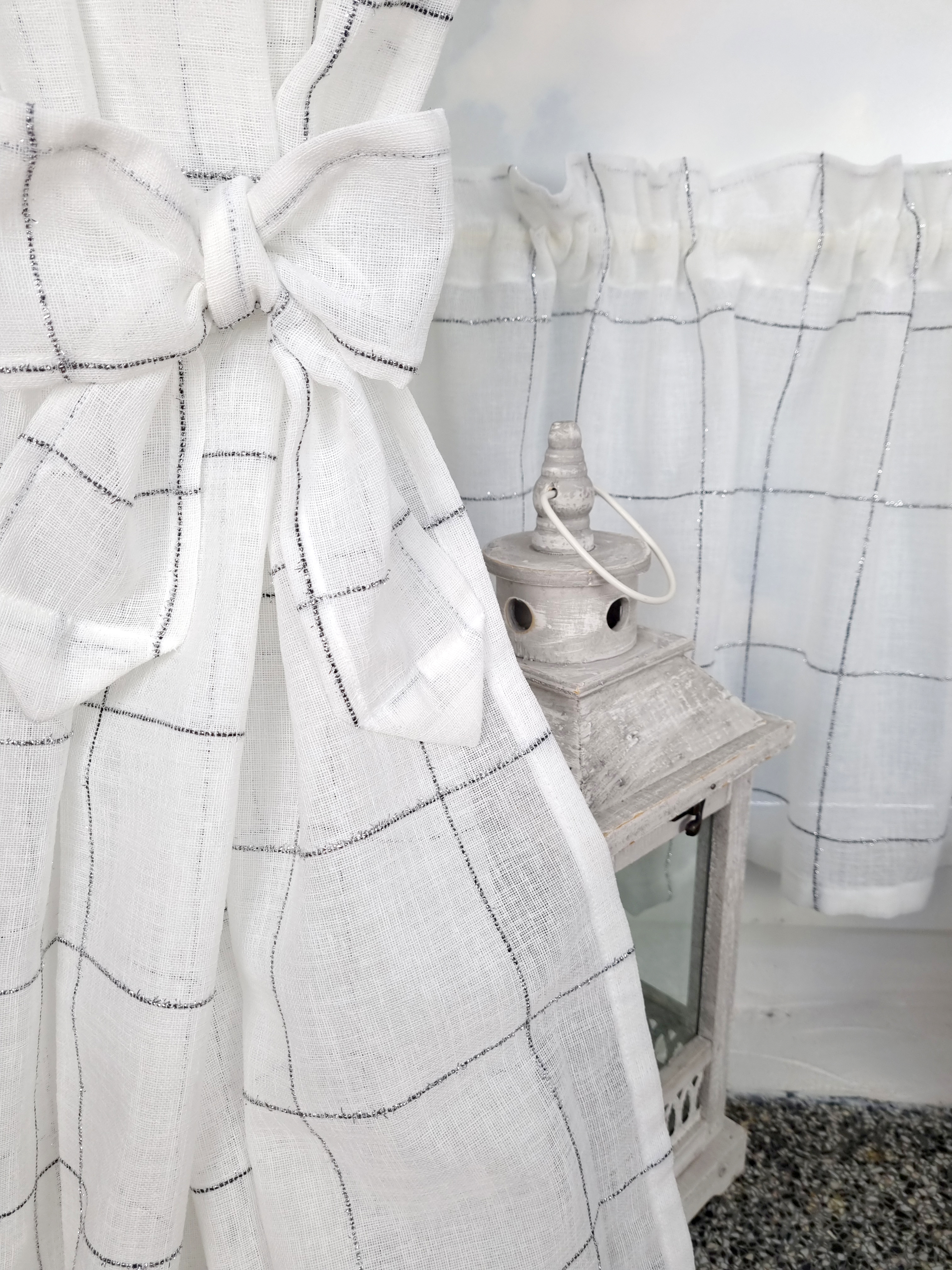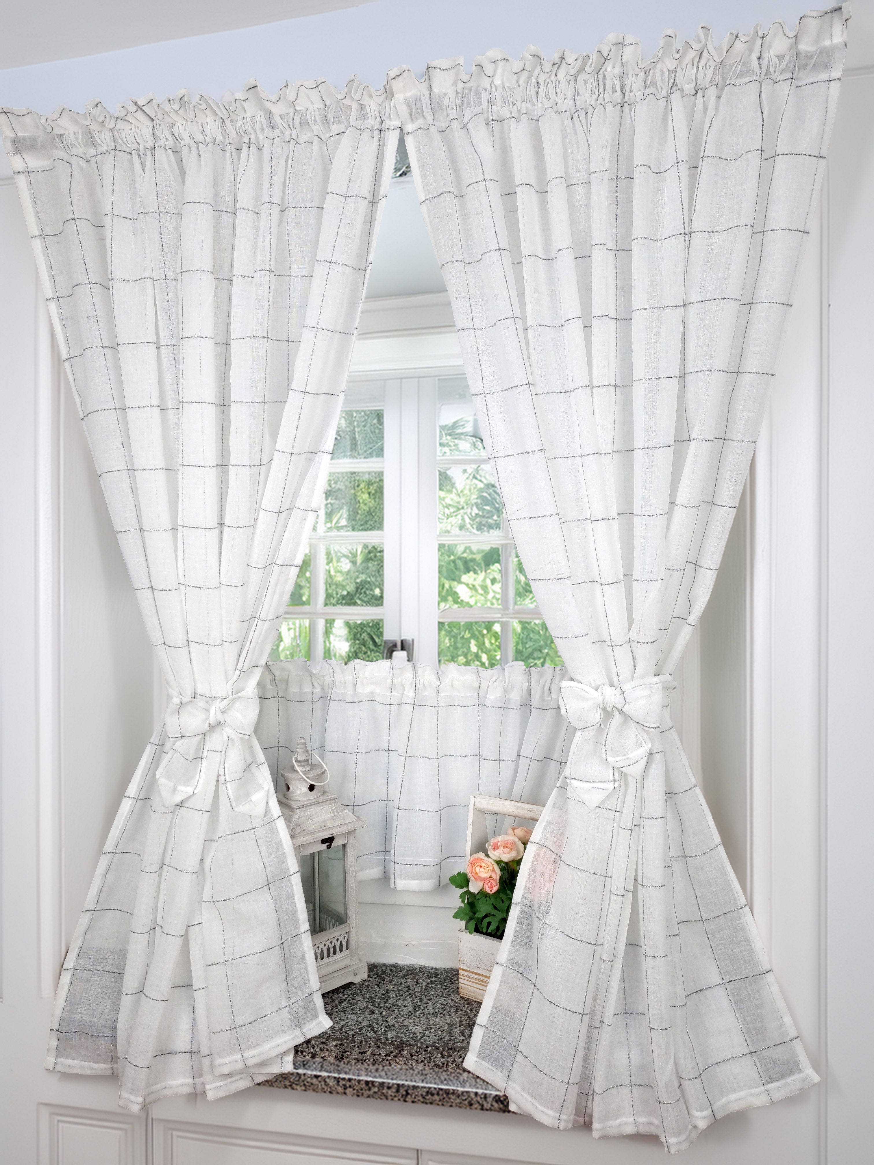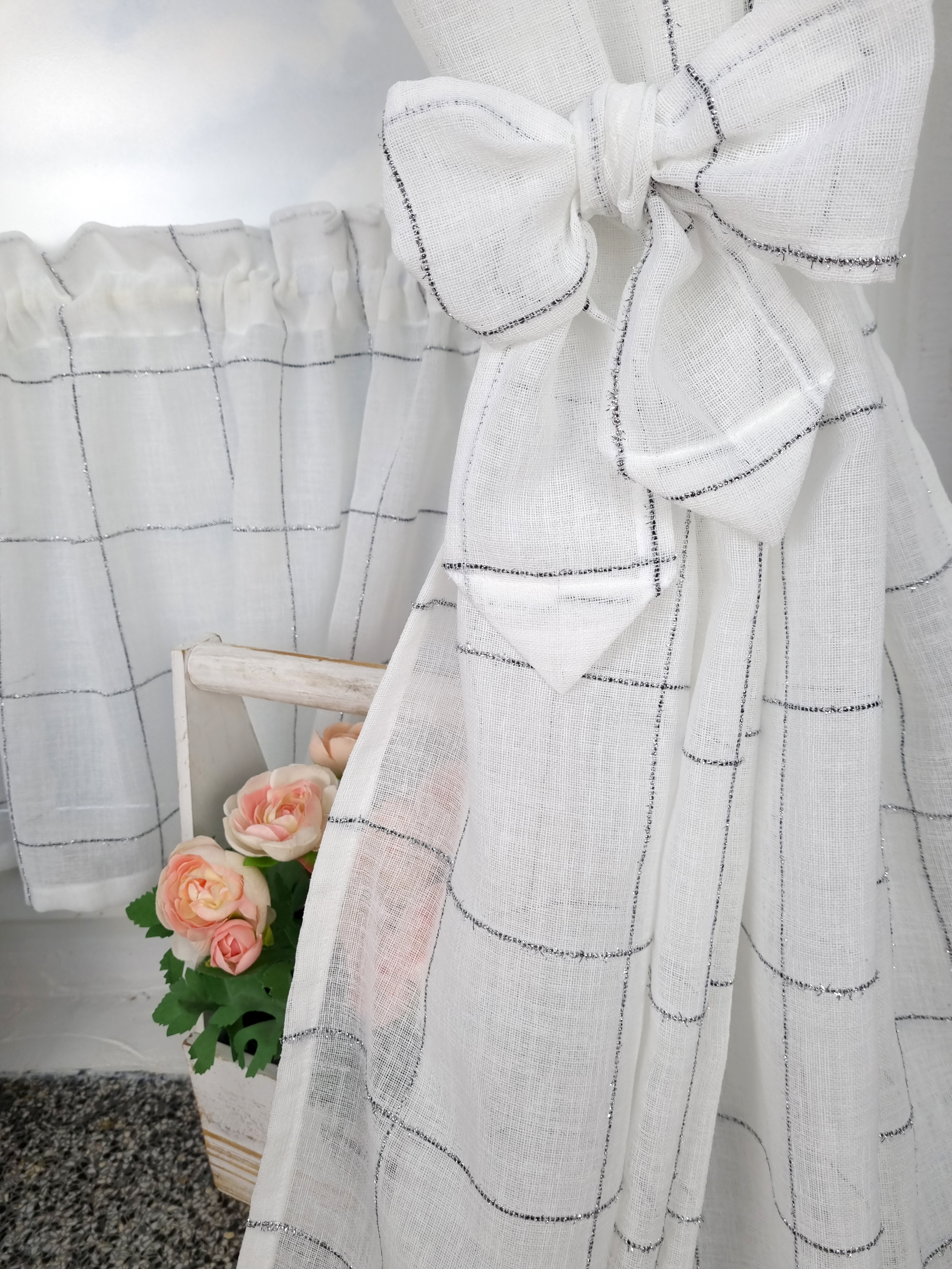 Komplet to dwie zasłonki na boki z wiązaniami oraz zazdrostka.
