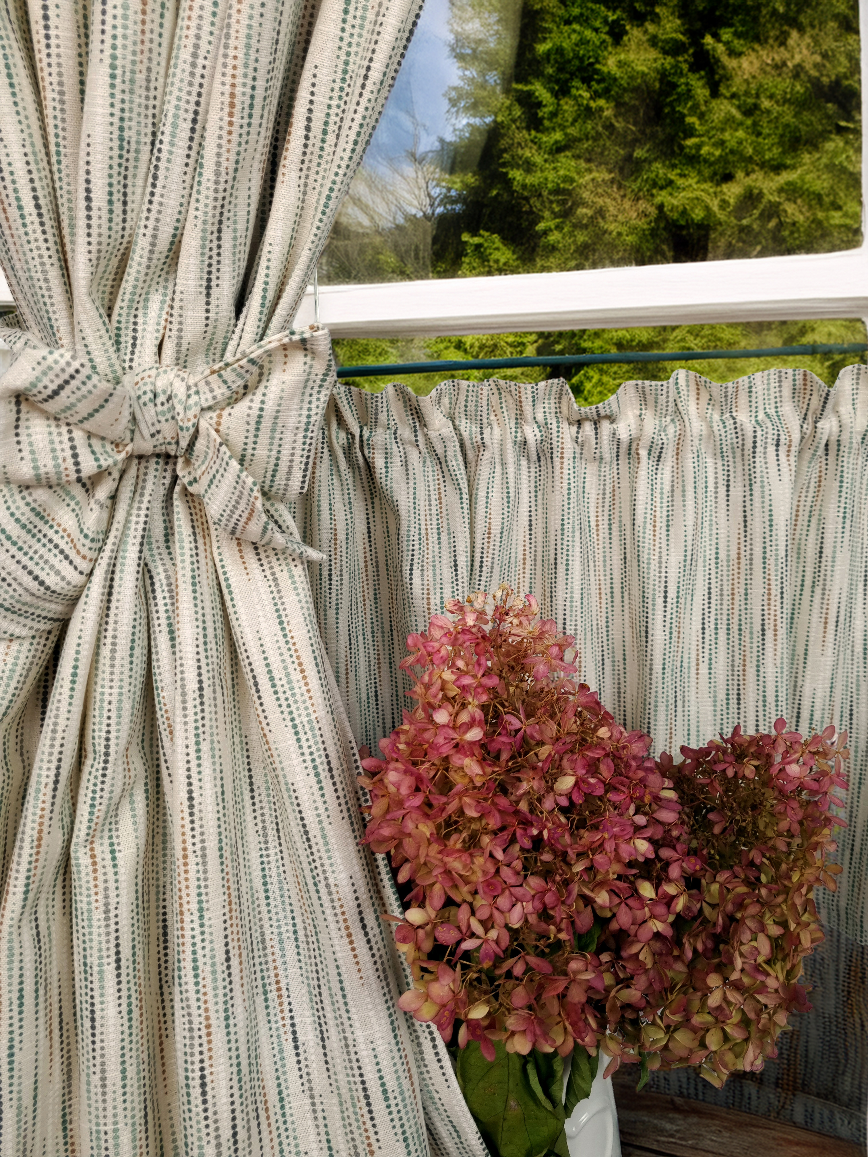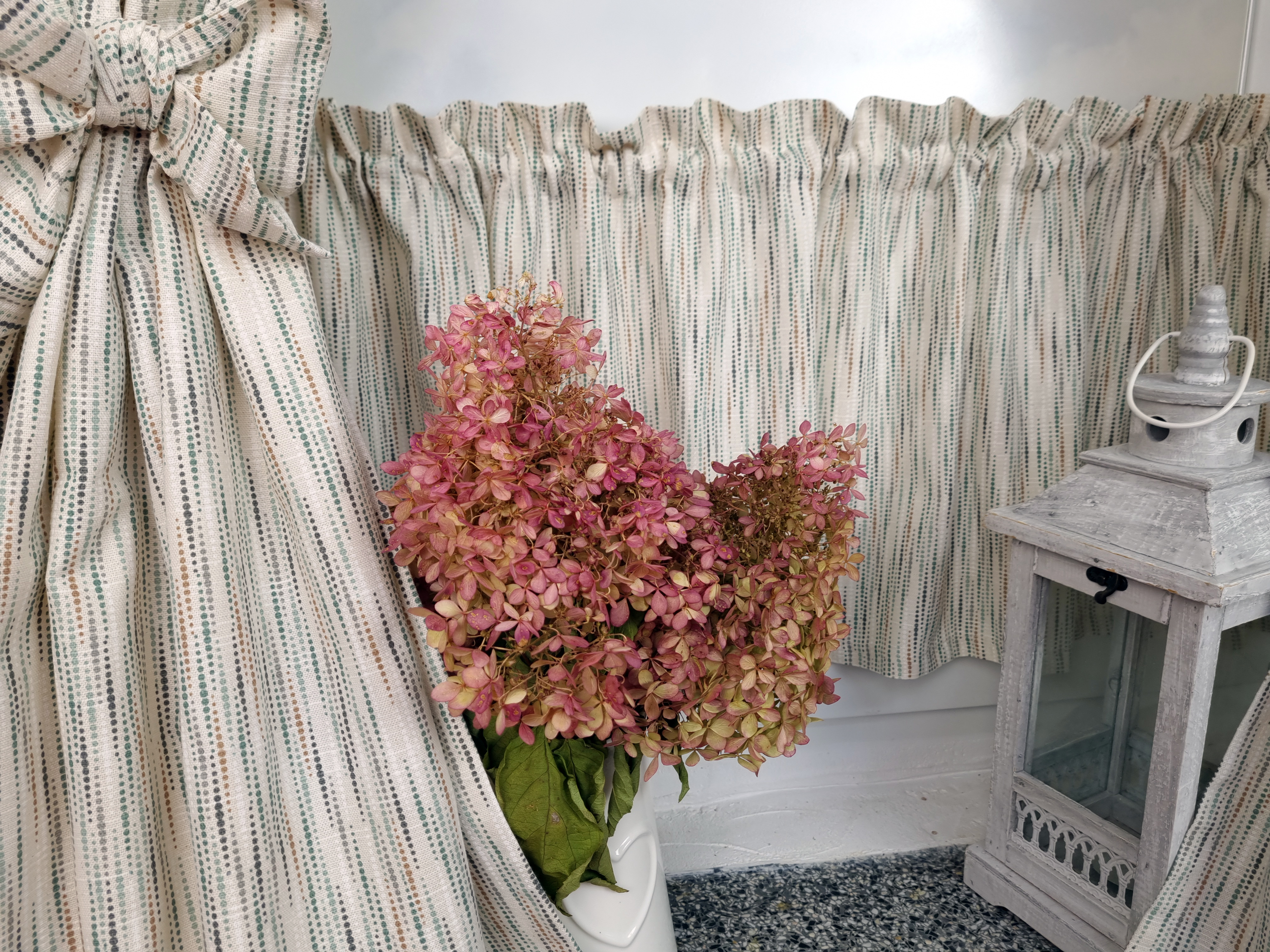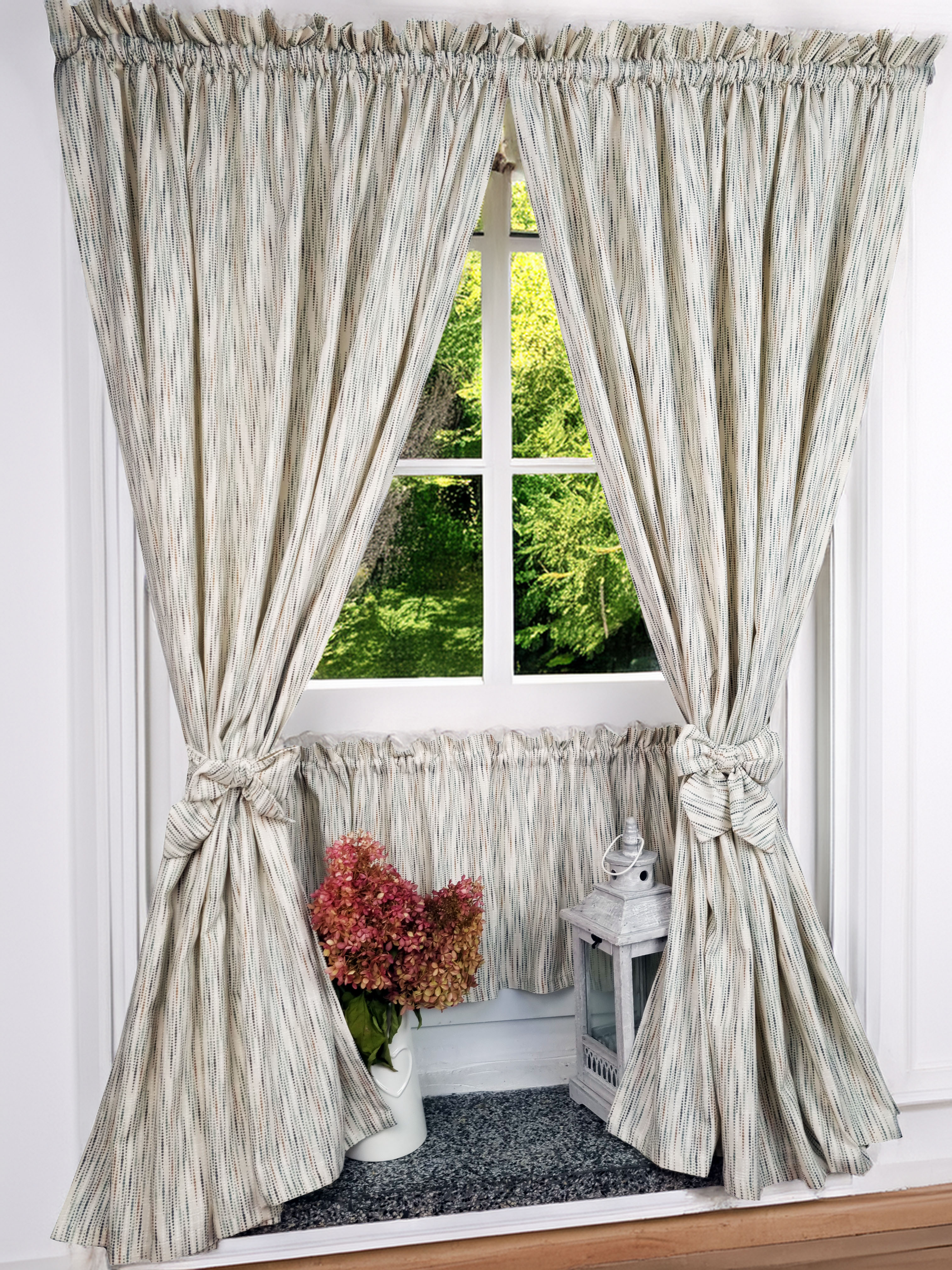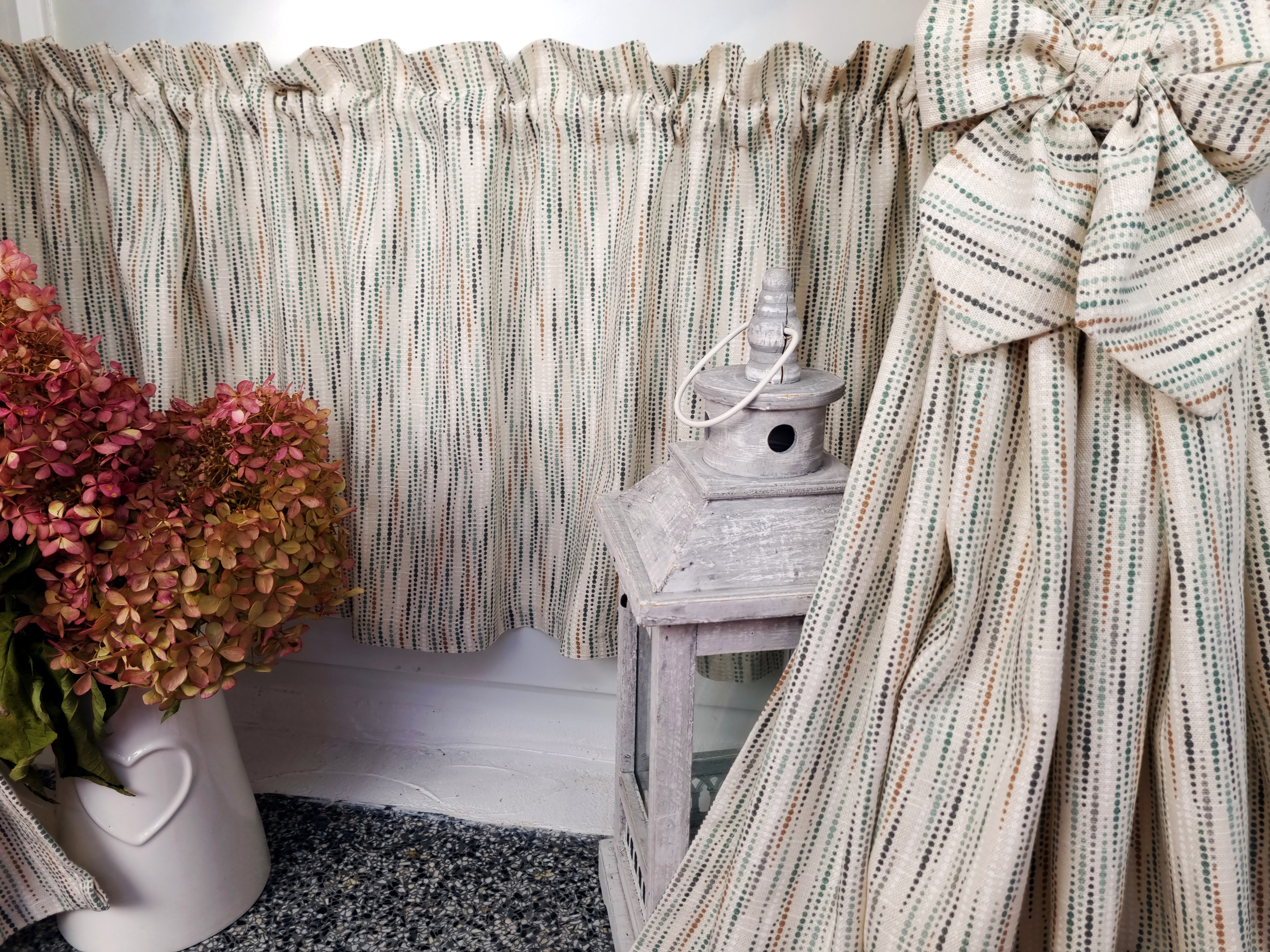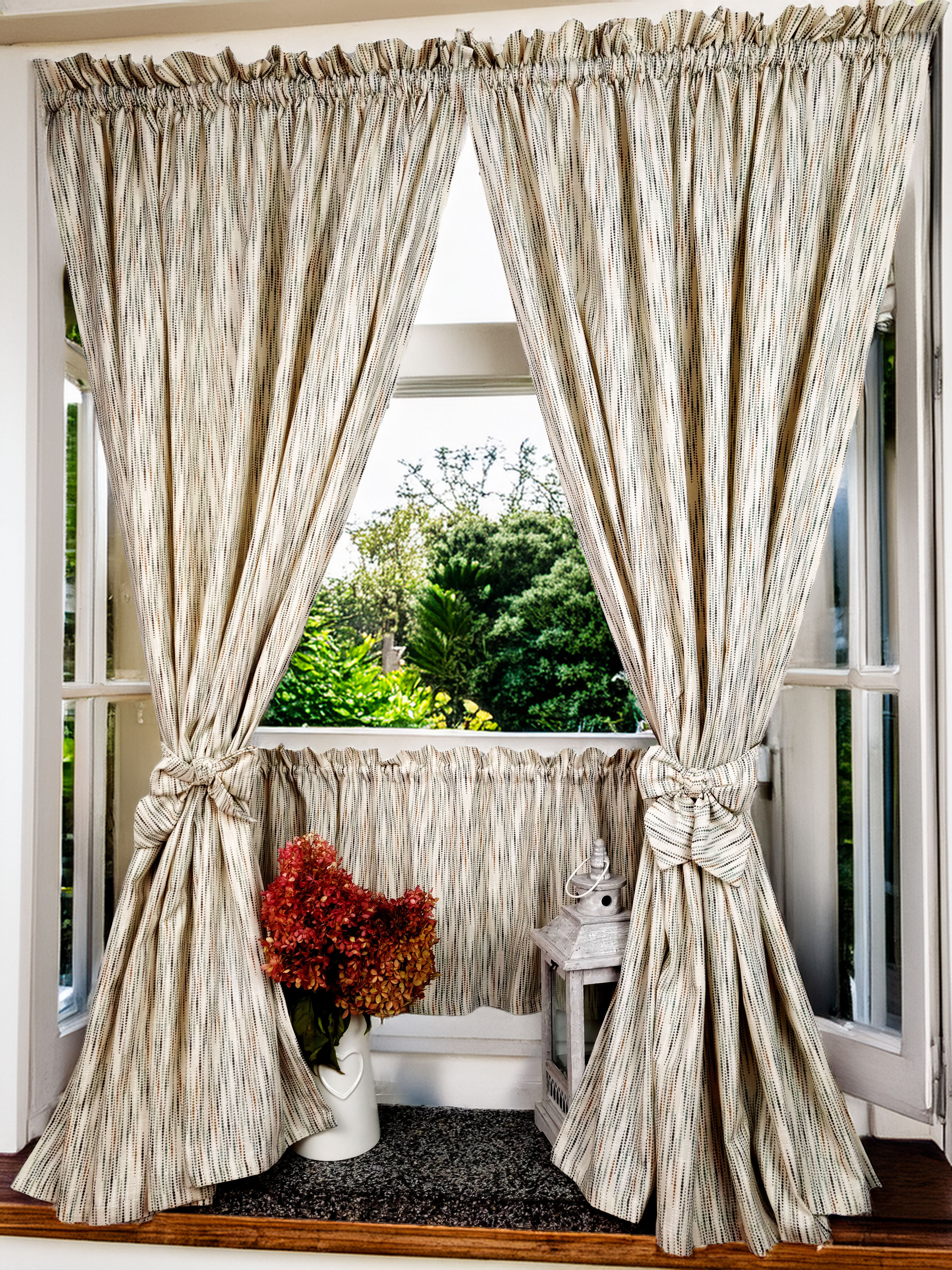 Komplet to dwie zasłonki na boki z wiązaniami oraz zazdrostka.