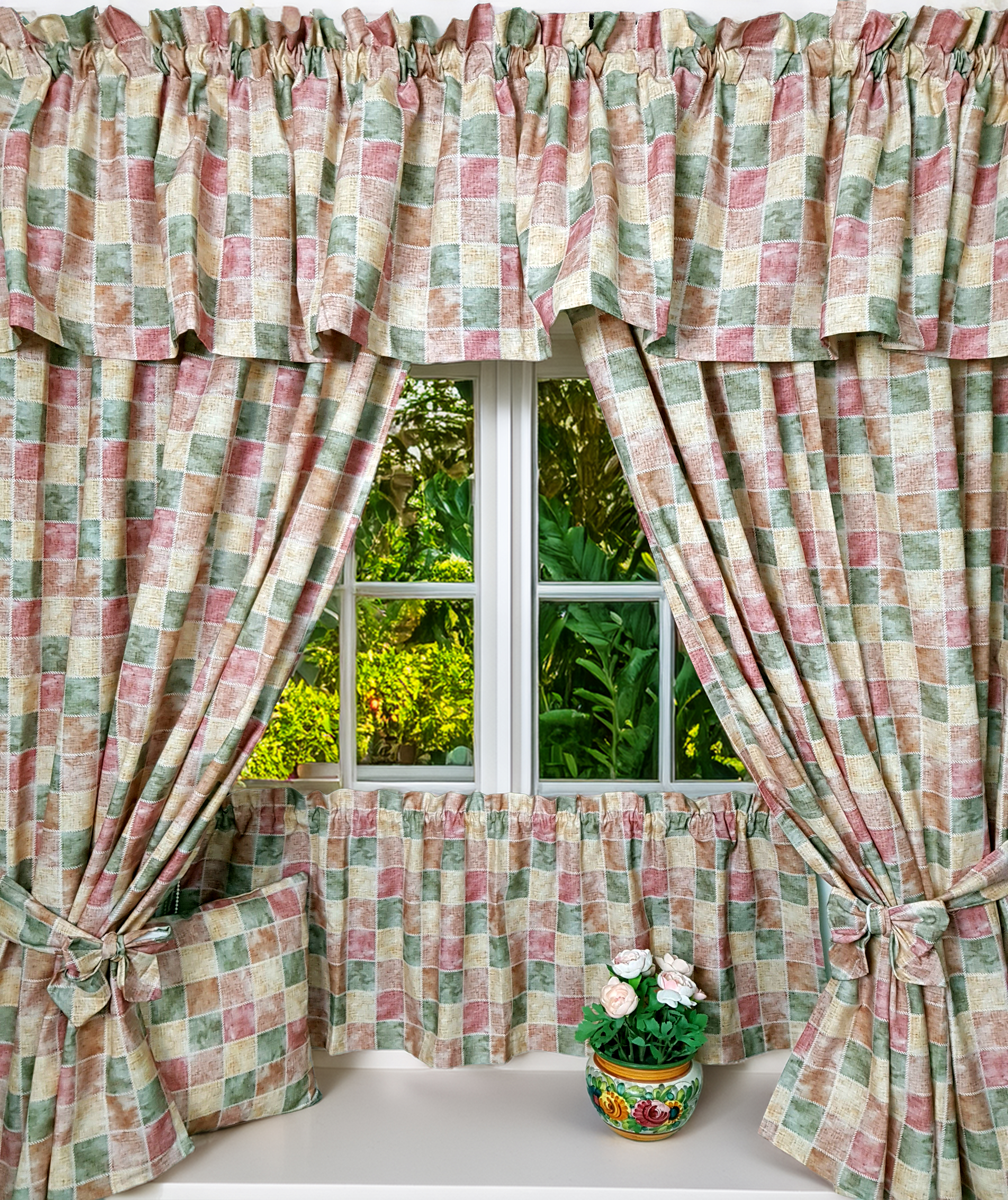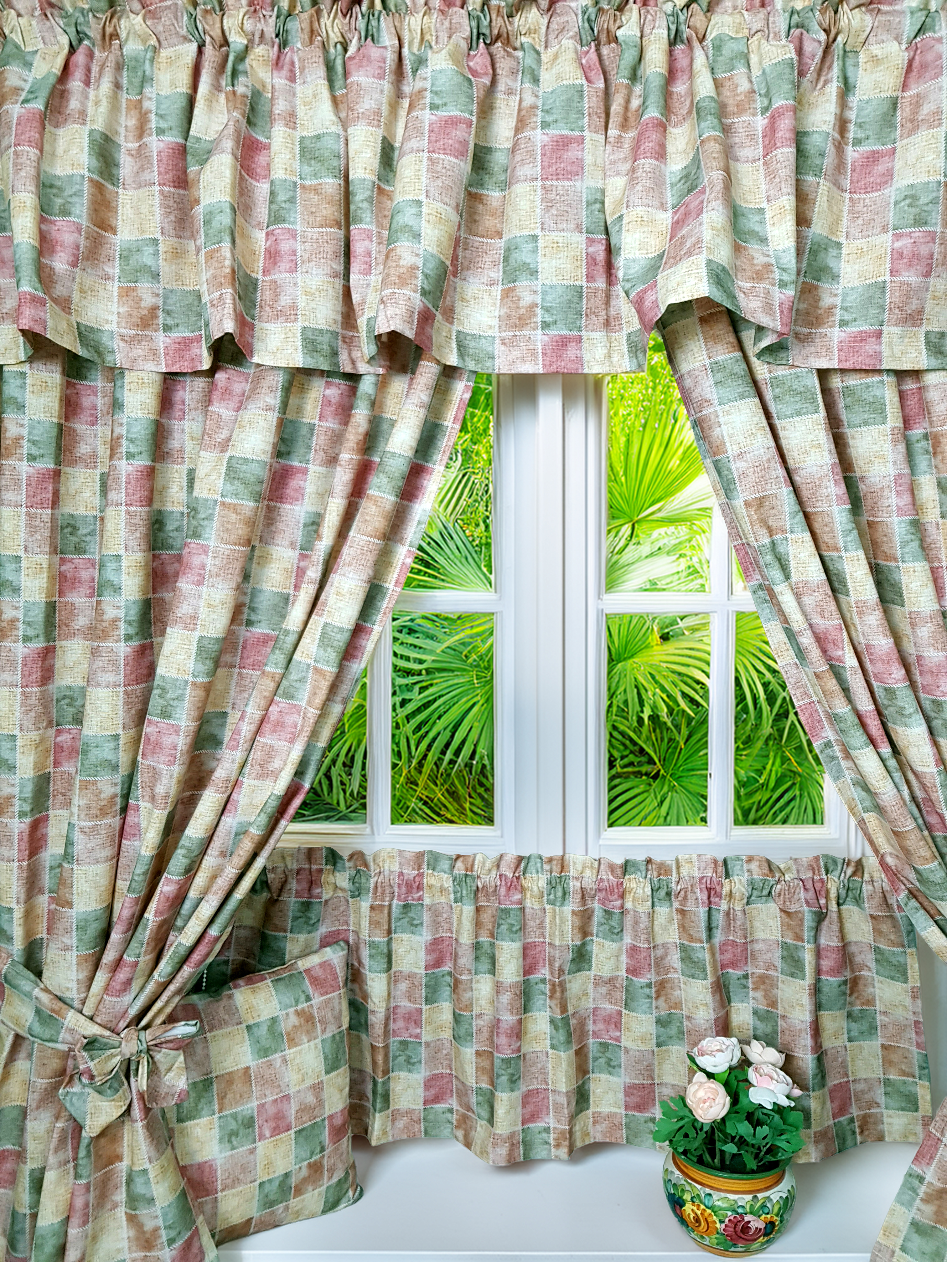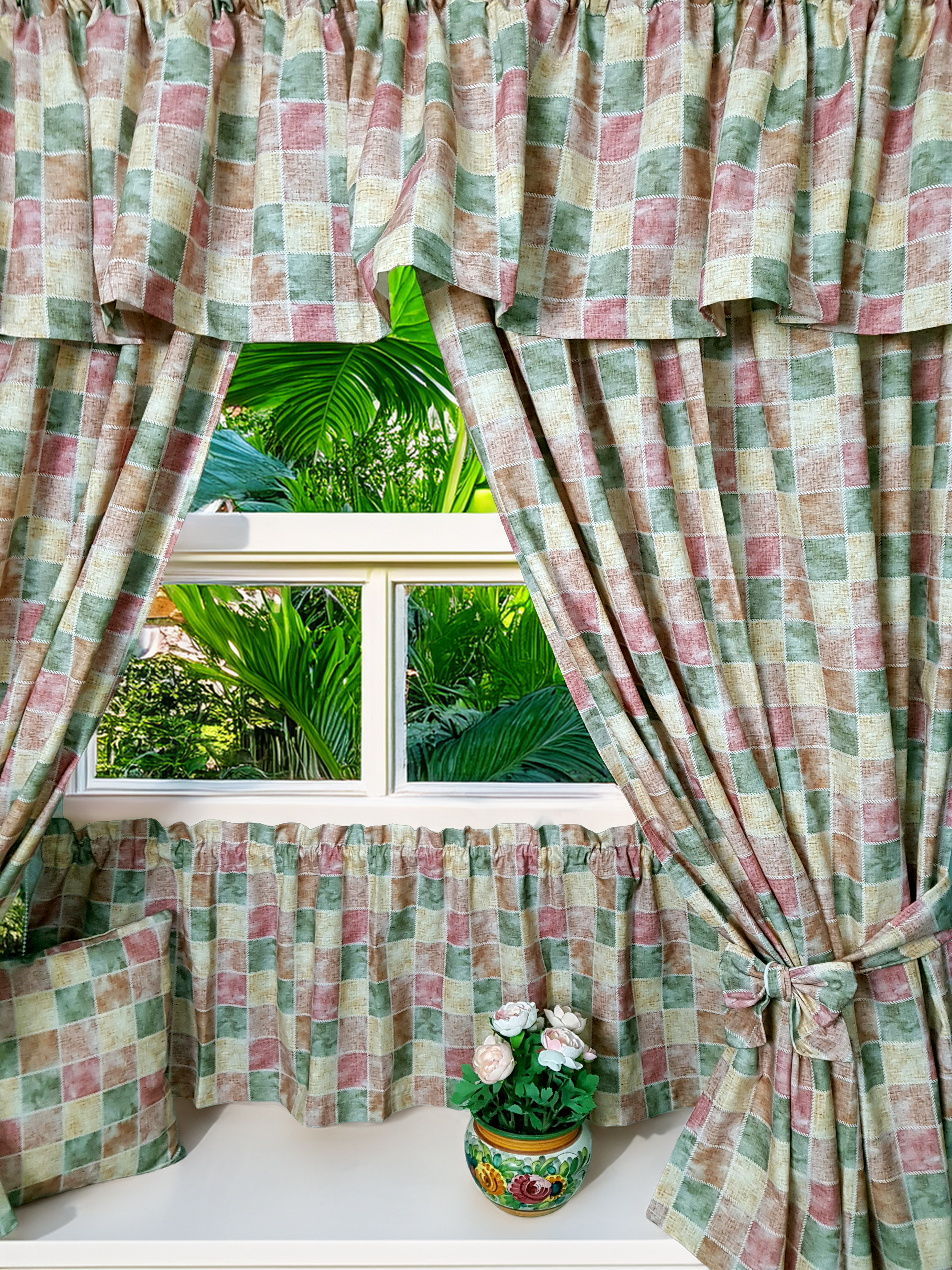 Komplet to 2 sztuki zasłonek oraz wstążki do wiązania zasłonek plus lambrekin i zazdrostka.
