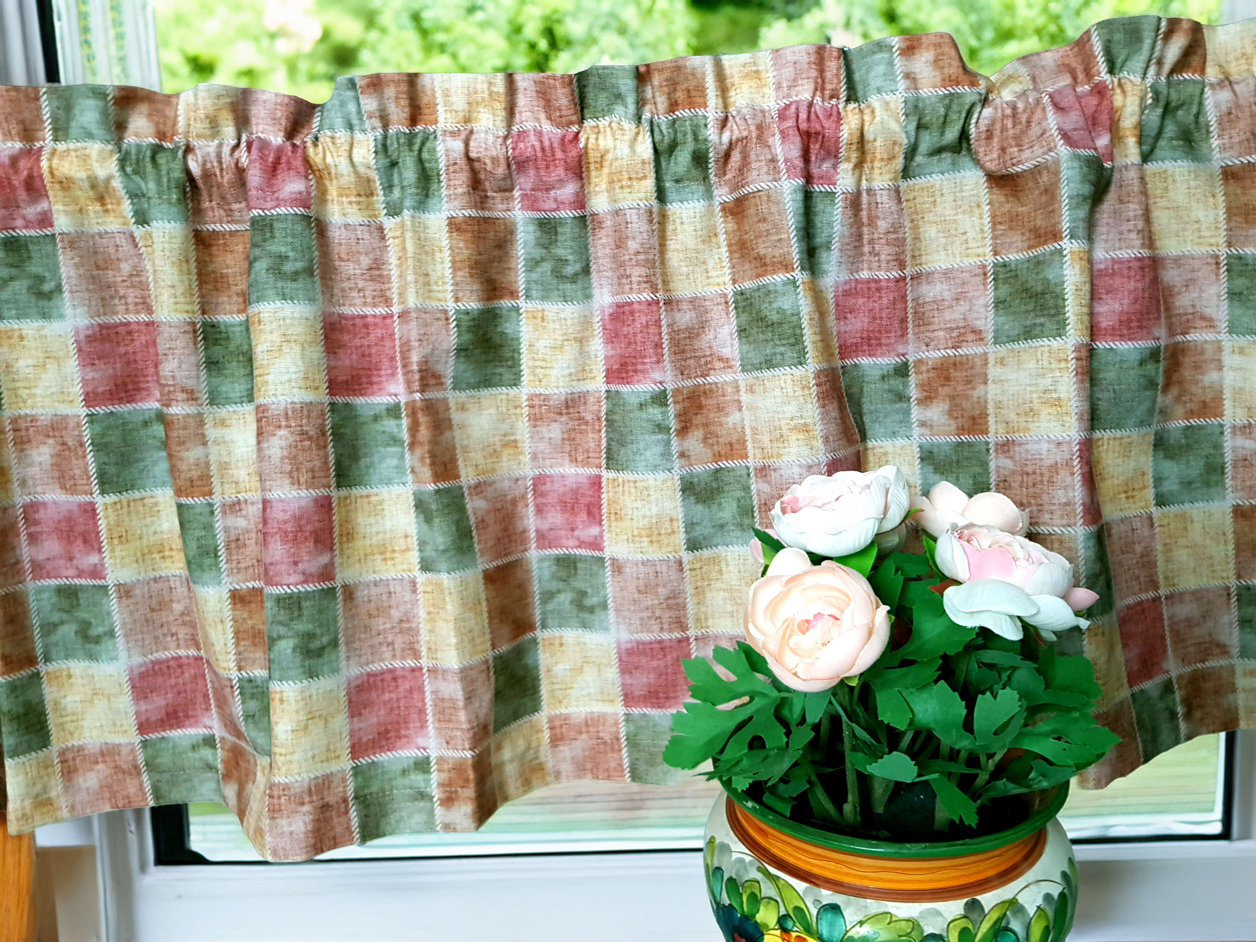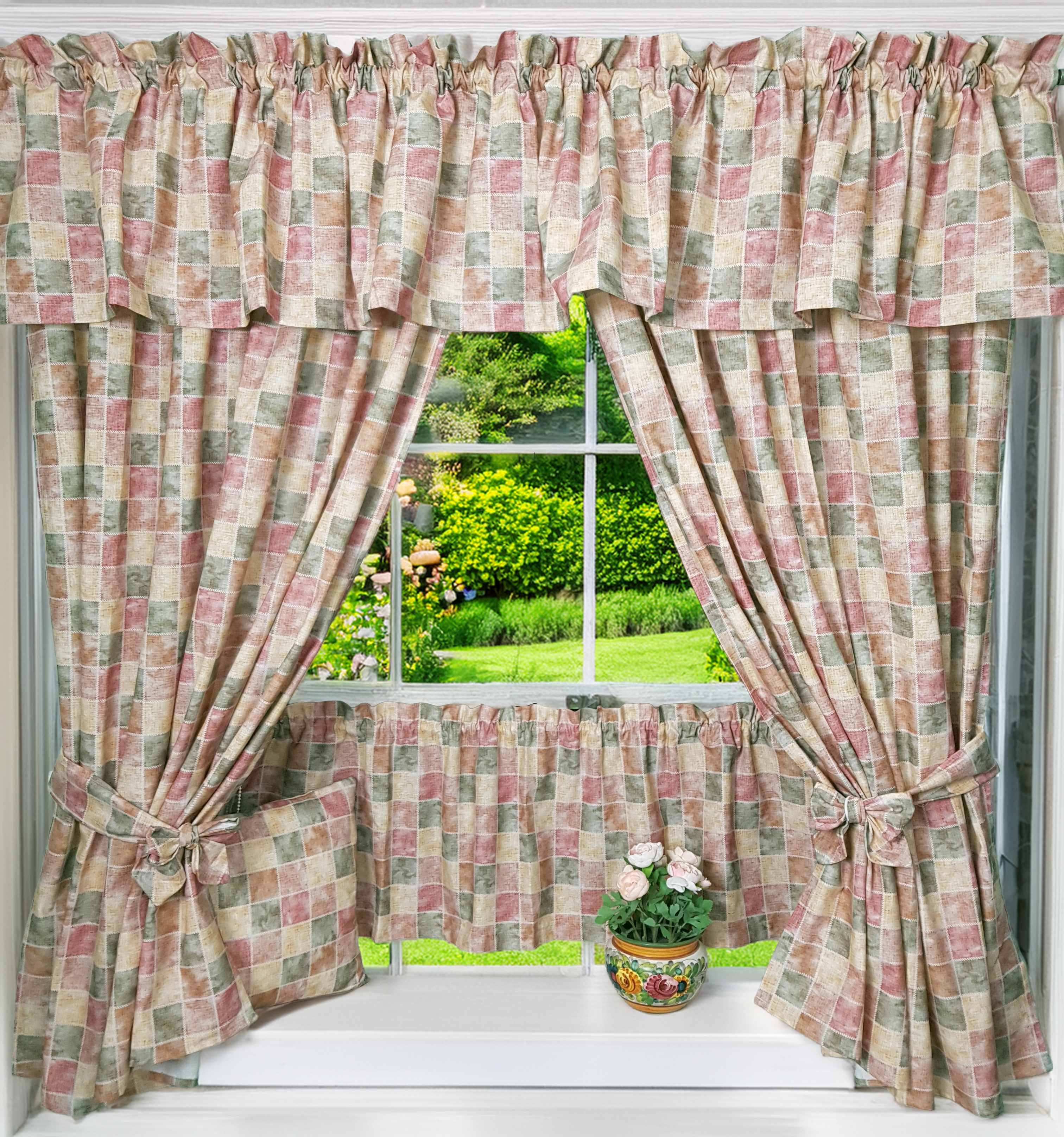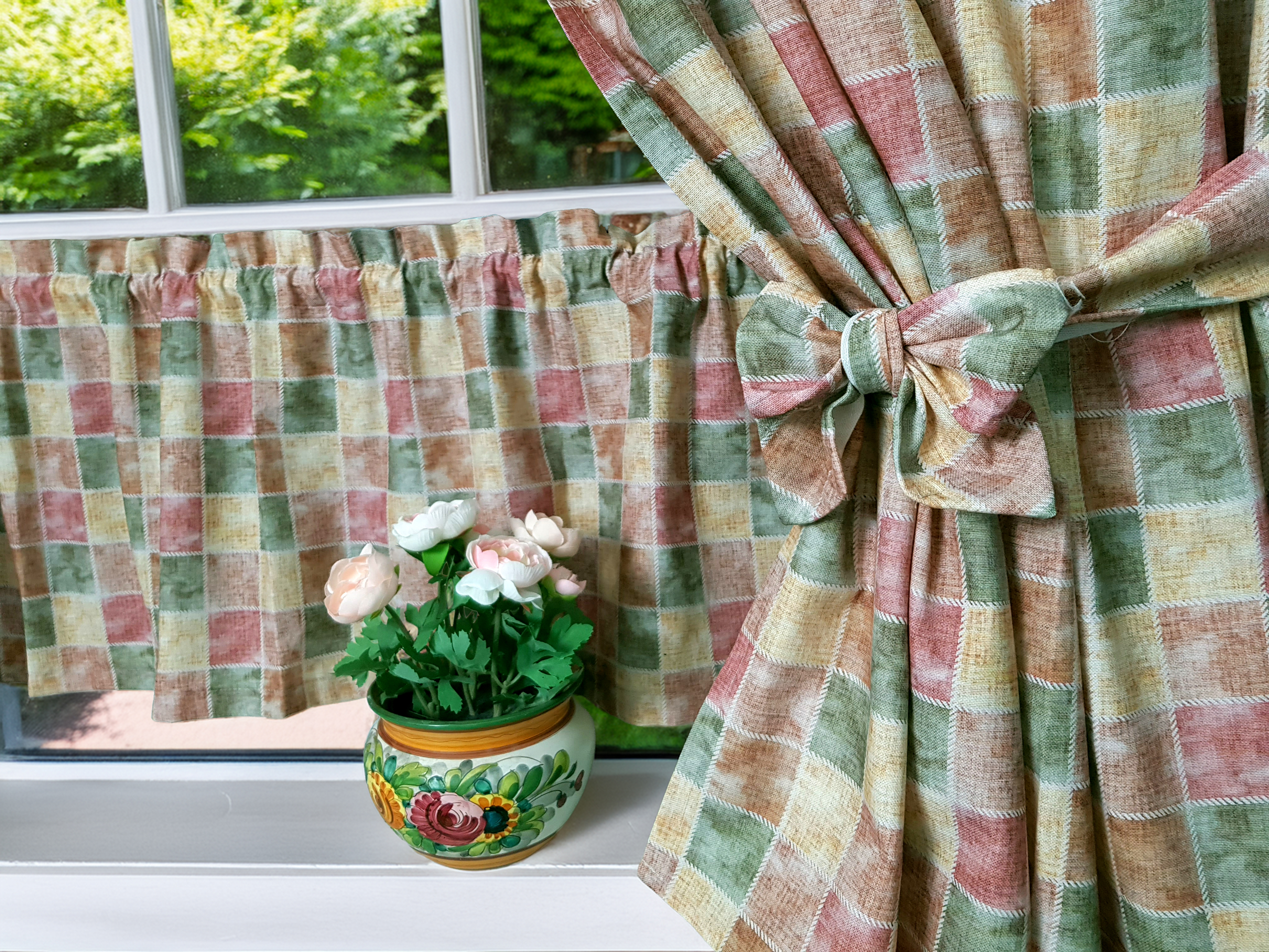 Komplet to 2 sztuki zasłonek oraz wstążki do wiązania zasłonek plus lambrekin i zazdrostka.