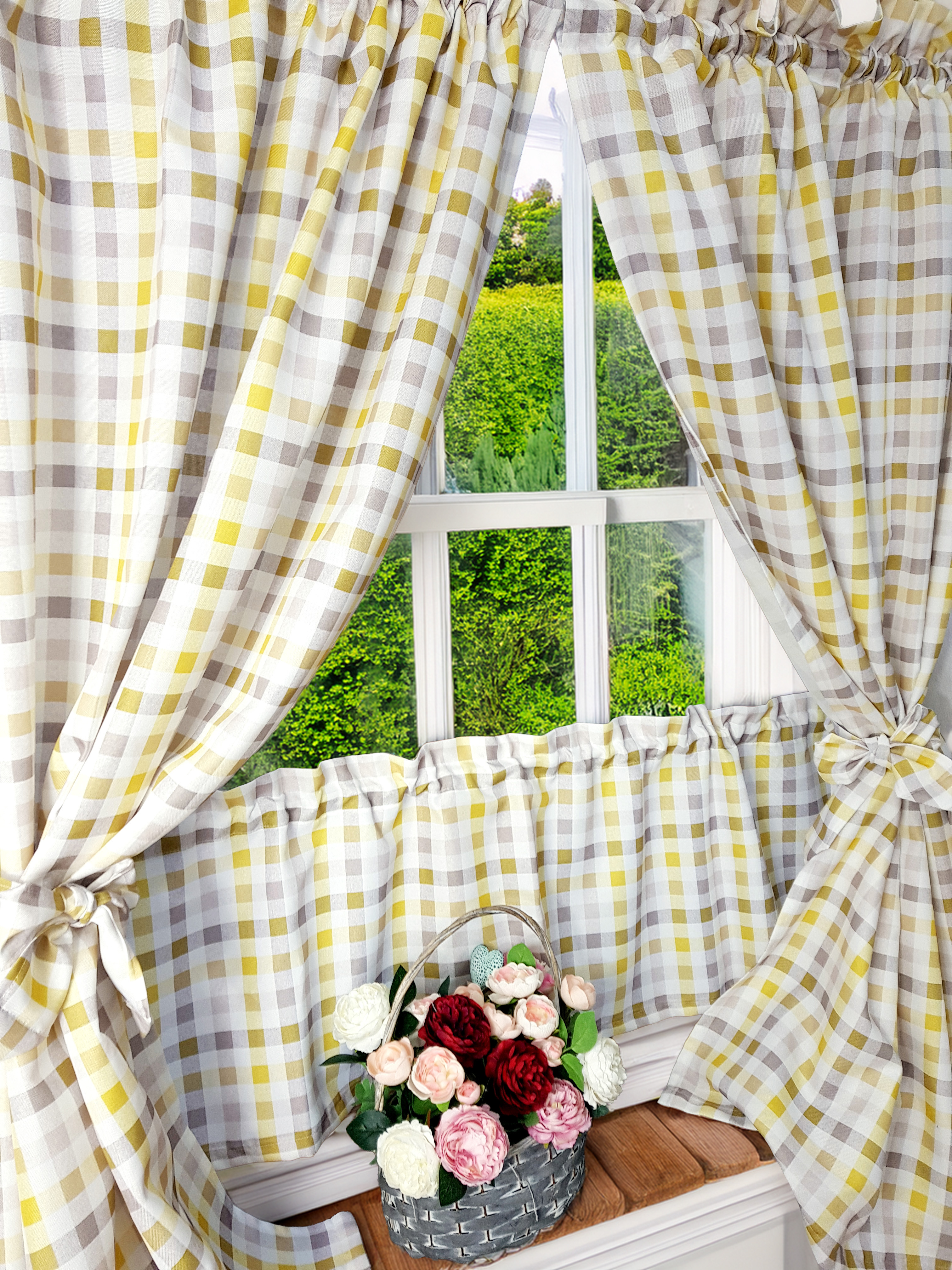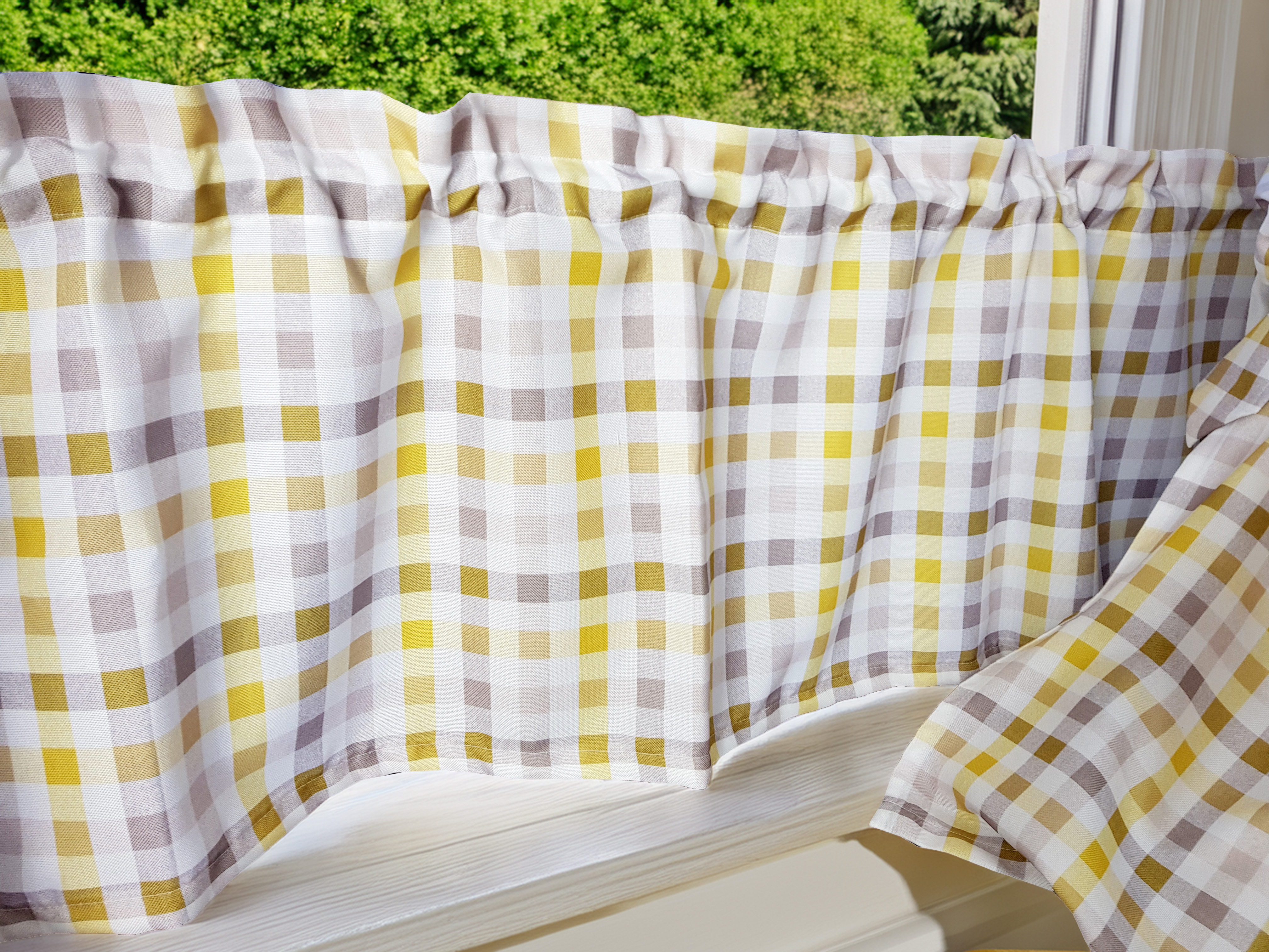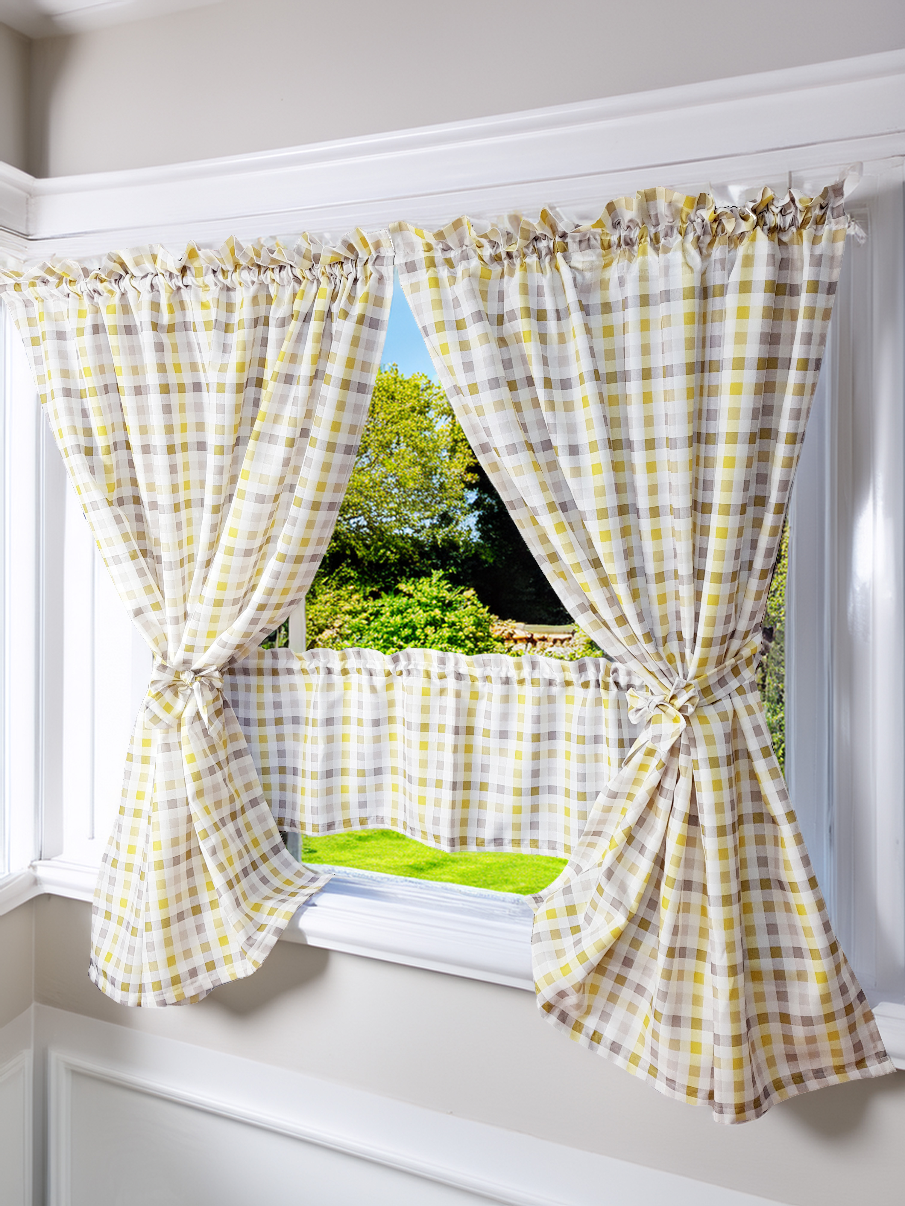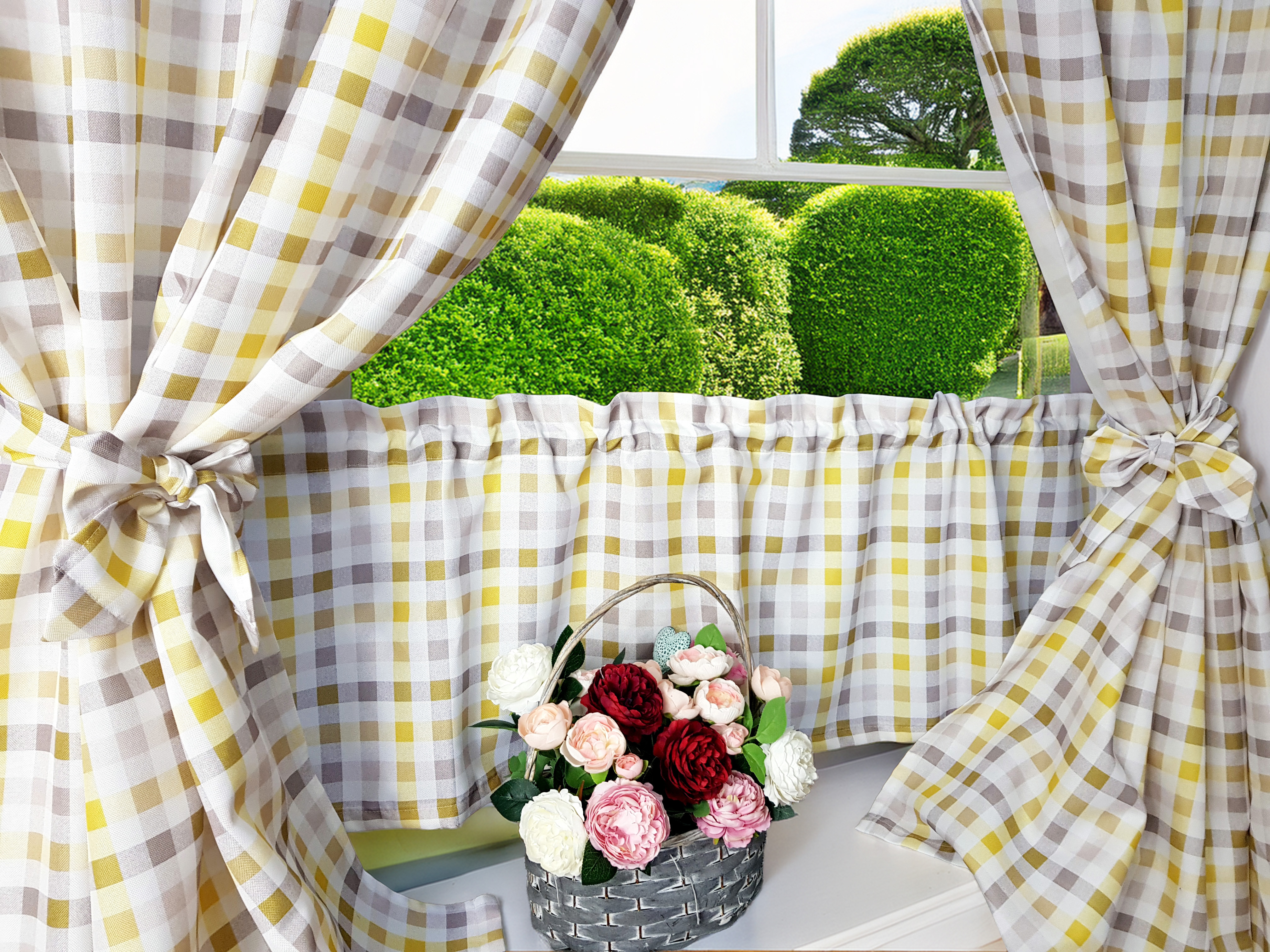 Komplet to dwie zasłonki na boki z wiązaniami oraz zazdrostka.