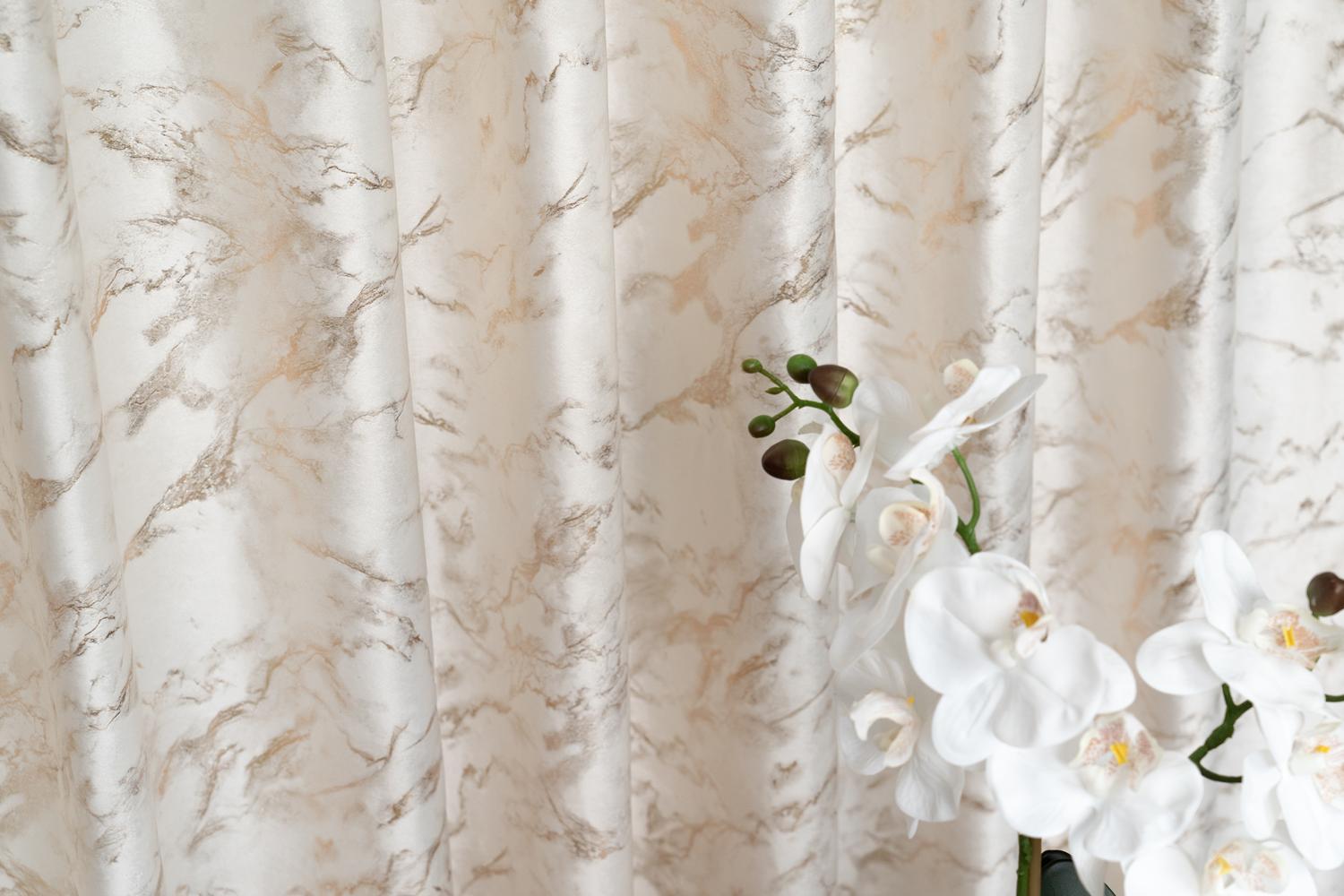 Zasłona półzaciemniająca w kolorach do wyboru, z nadrukiem złotym lub srebrnym.