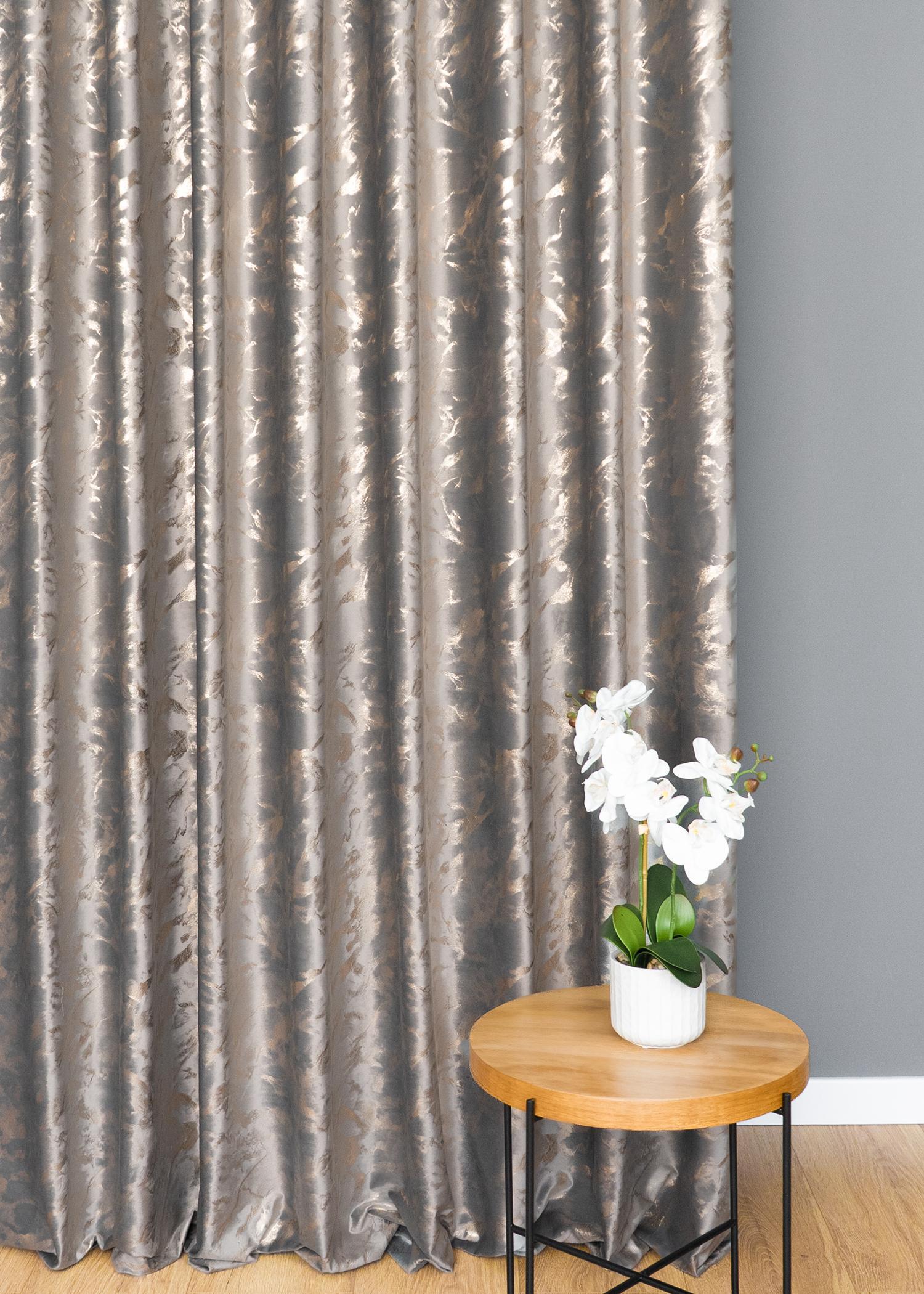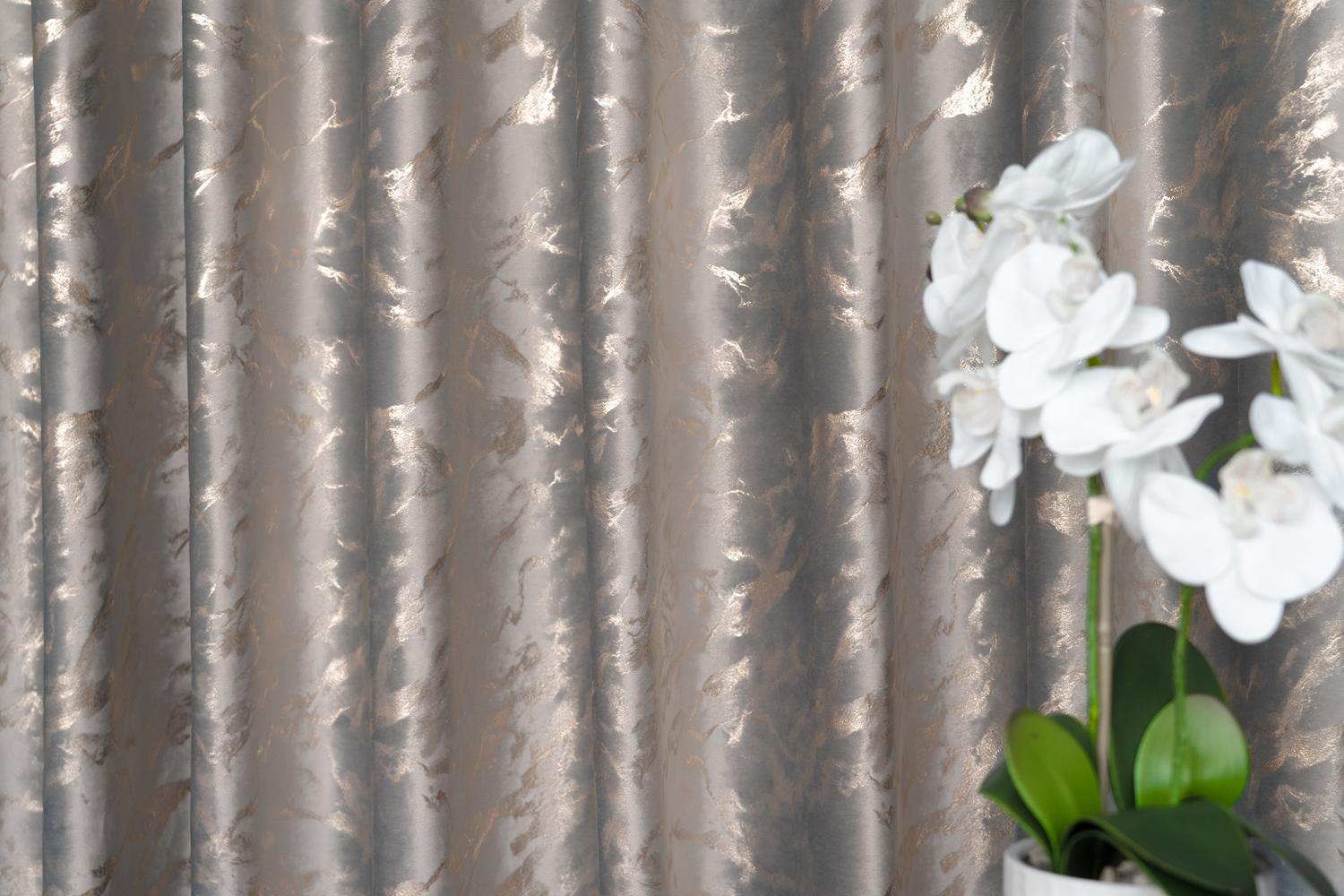 Zasłona półzaciemniająca w kolorach do wyboru, z nadrukiem złotym lub srebrnym.