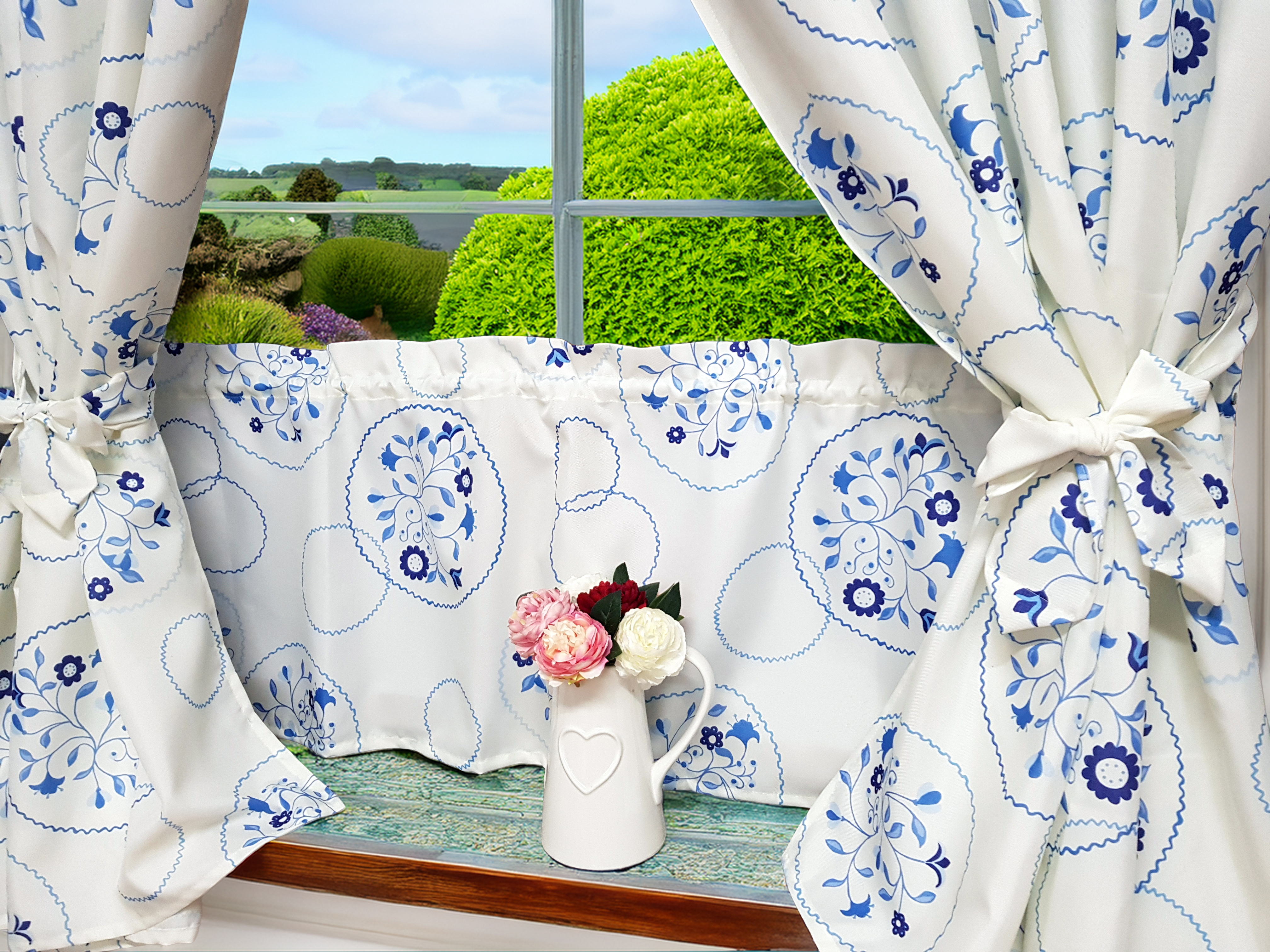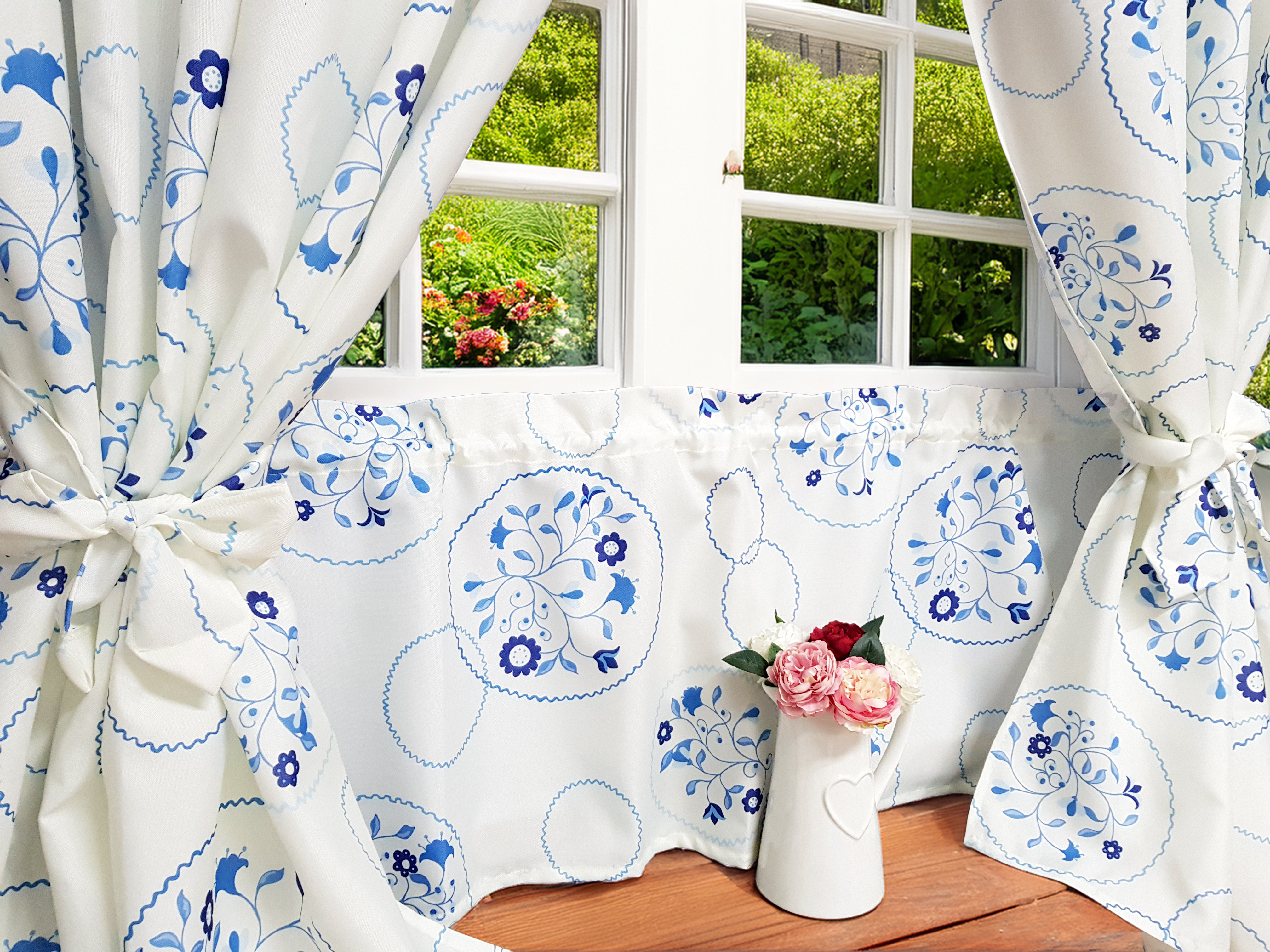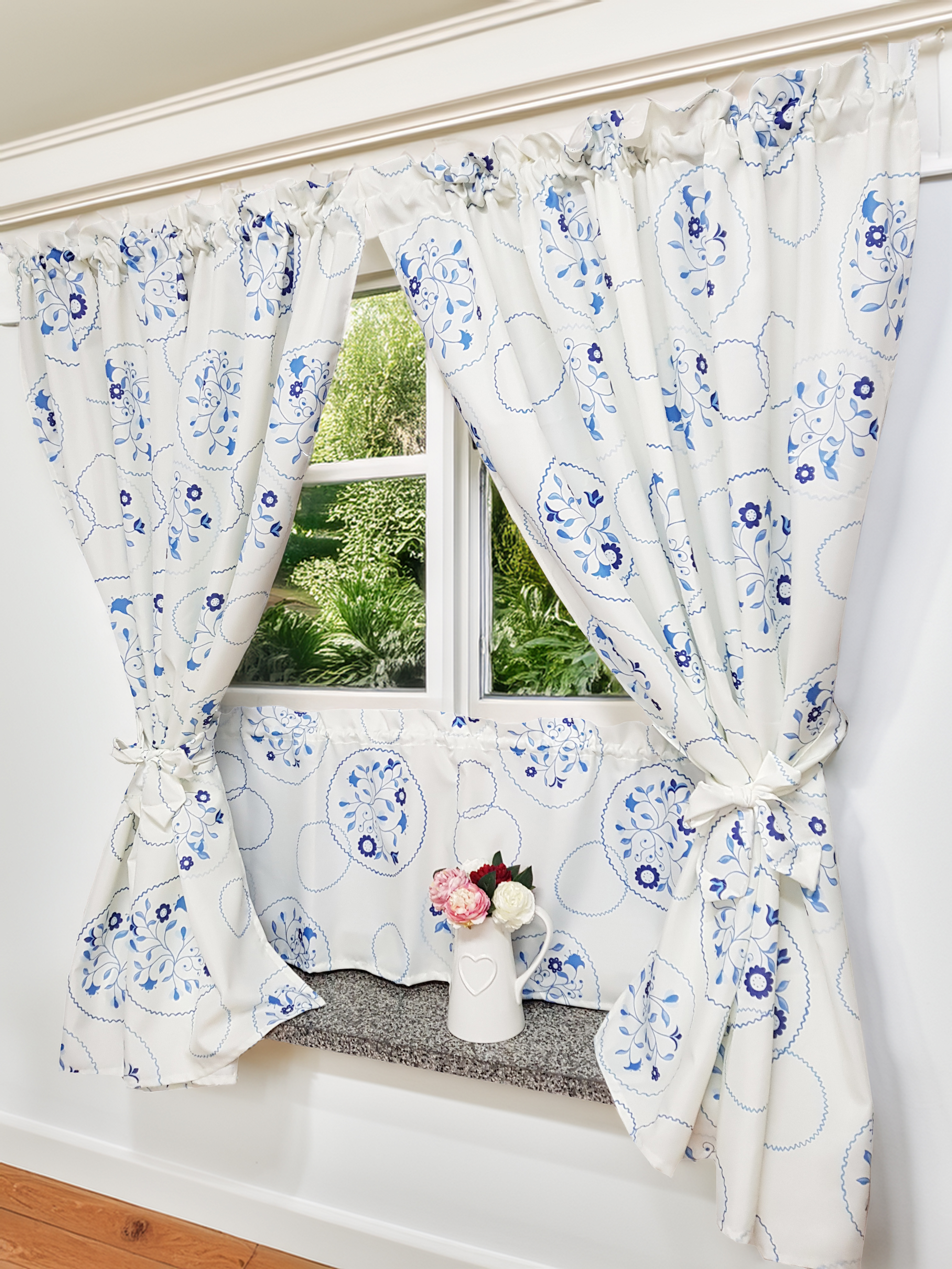 Komplet to dwie zasłonki na boki z wiązaniami oraz zazdrostka.