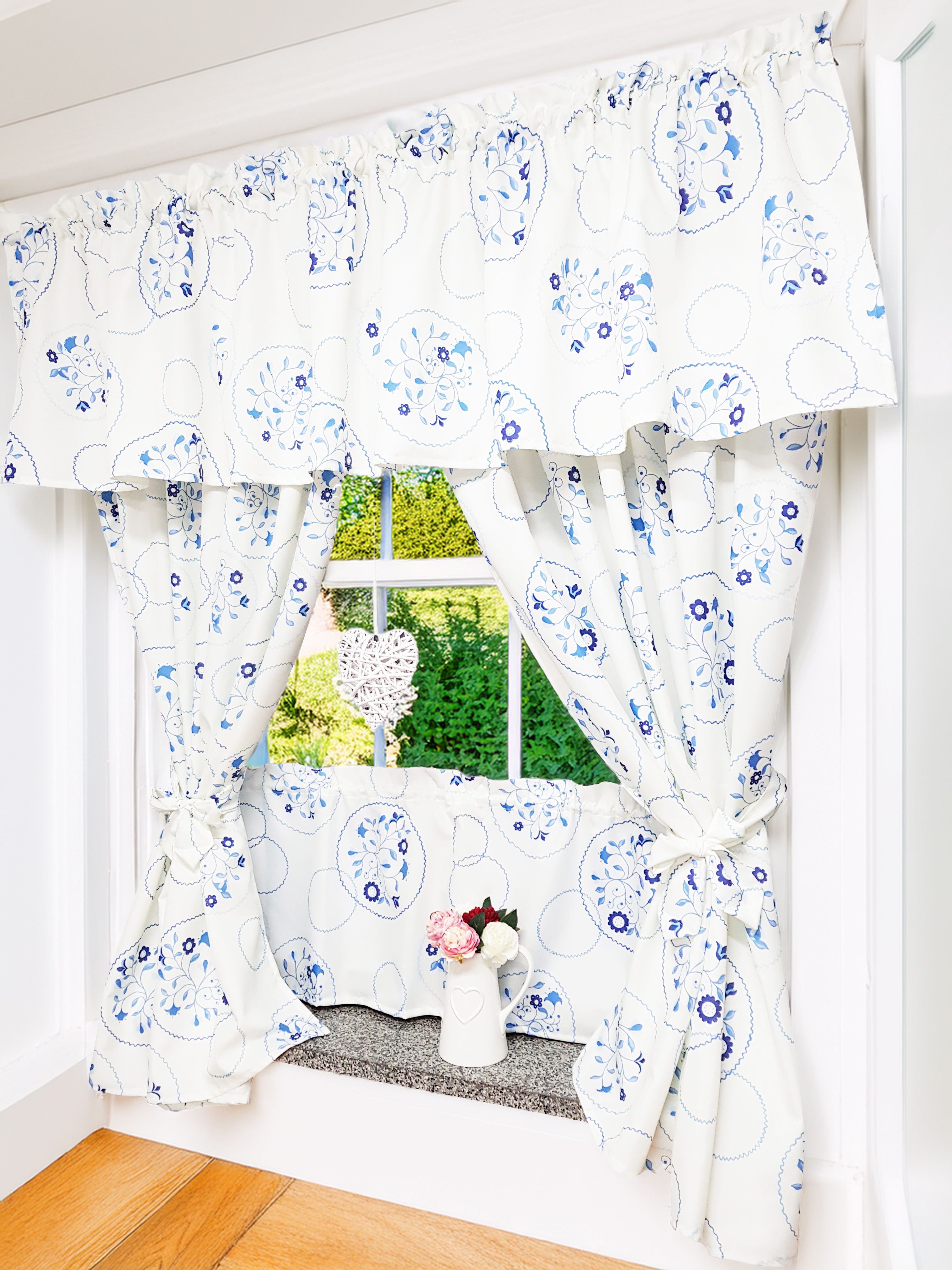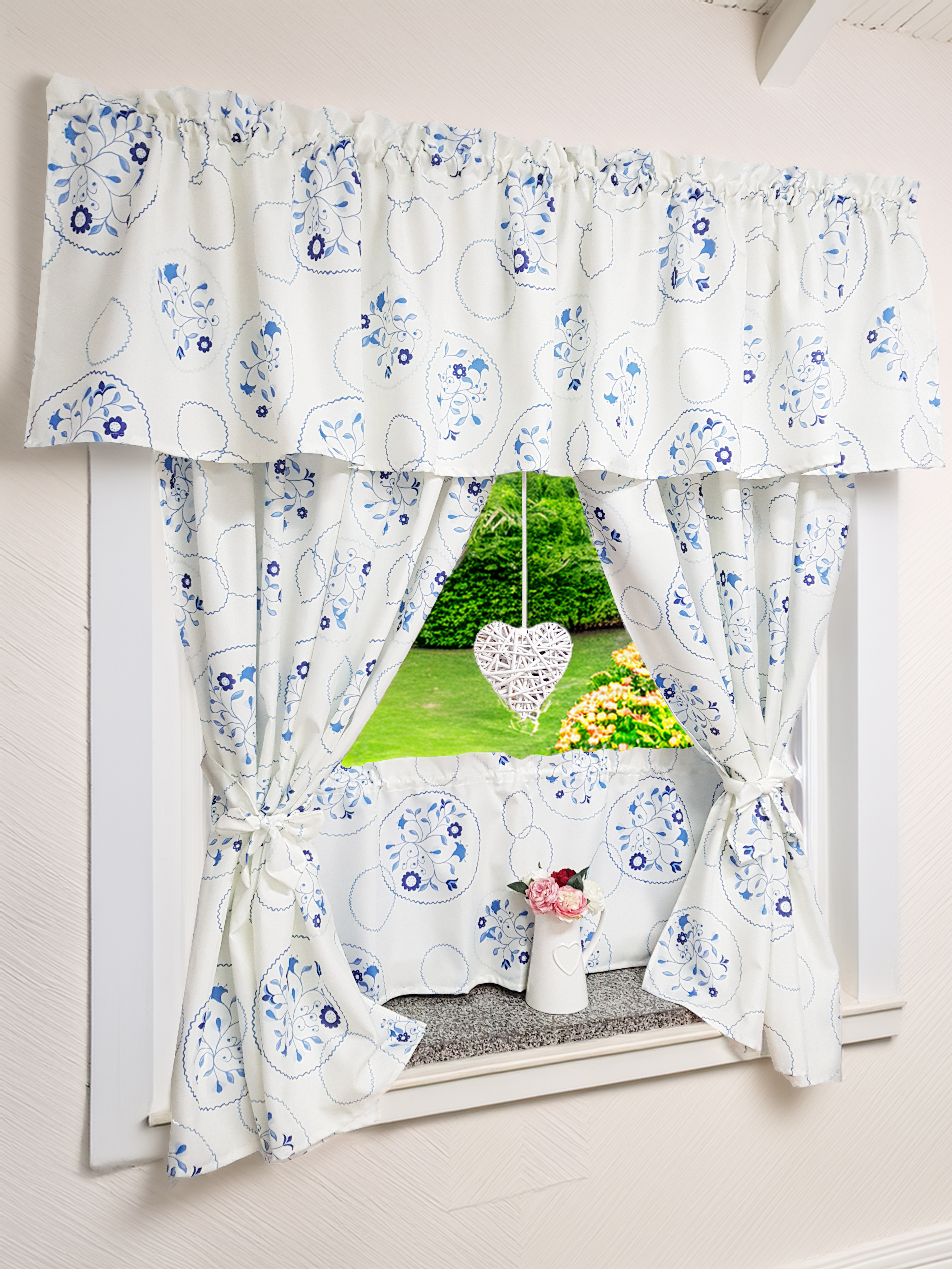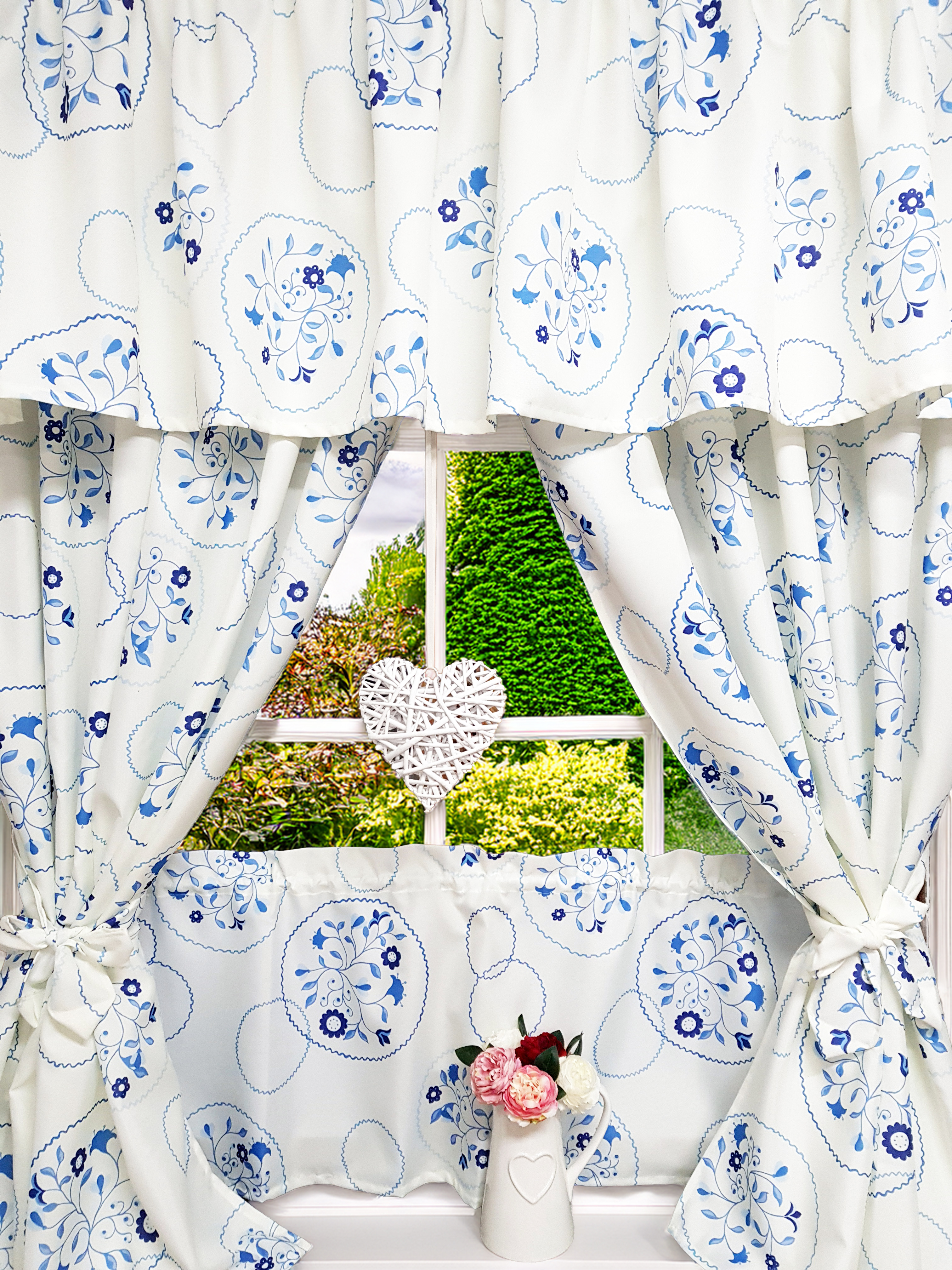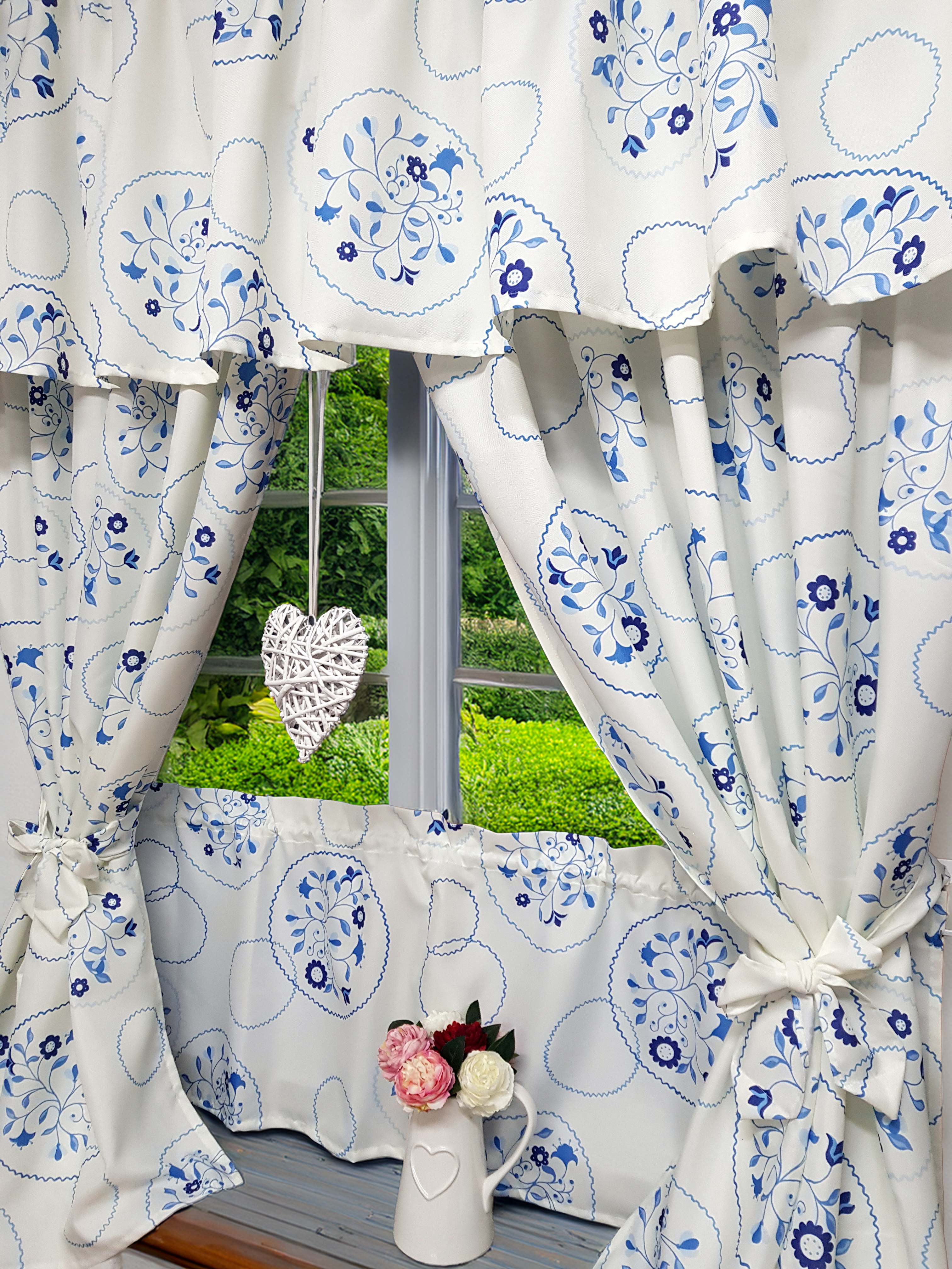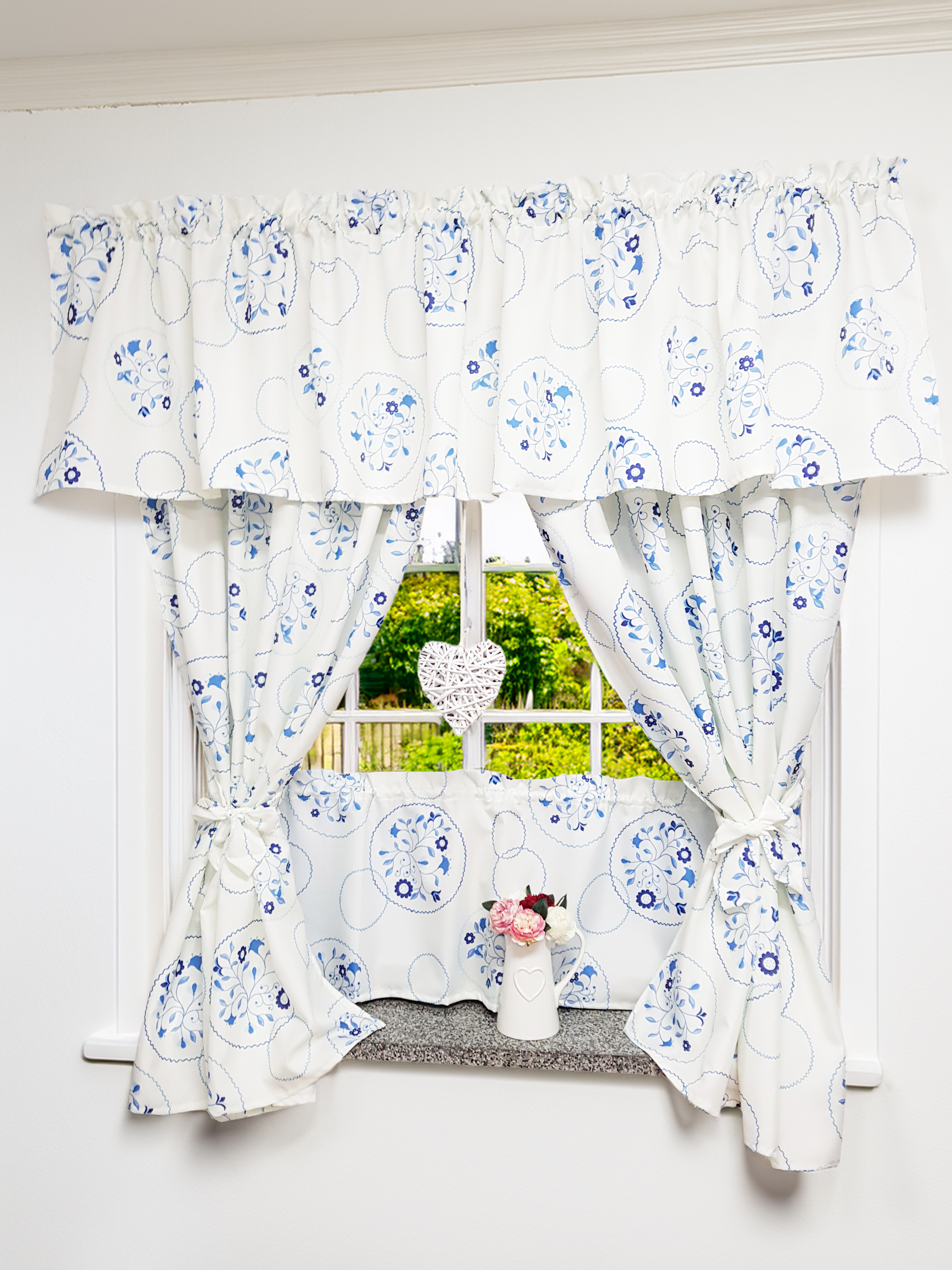 Komplet to 2 sztuki zasłonek oraz wstążki do wiązania zasłonek plus lambrekin i zazdrostka.