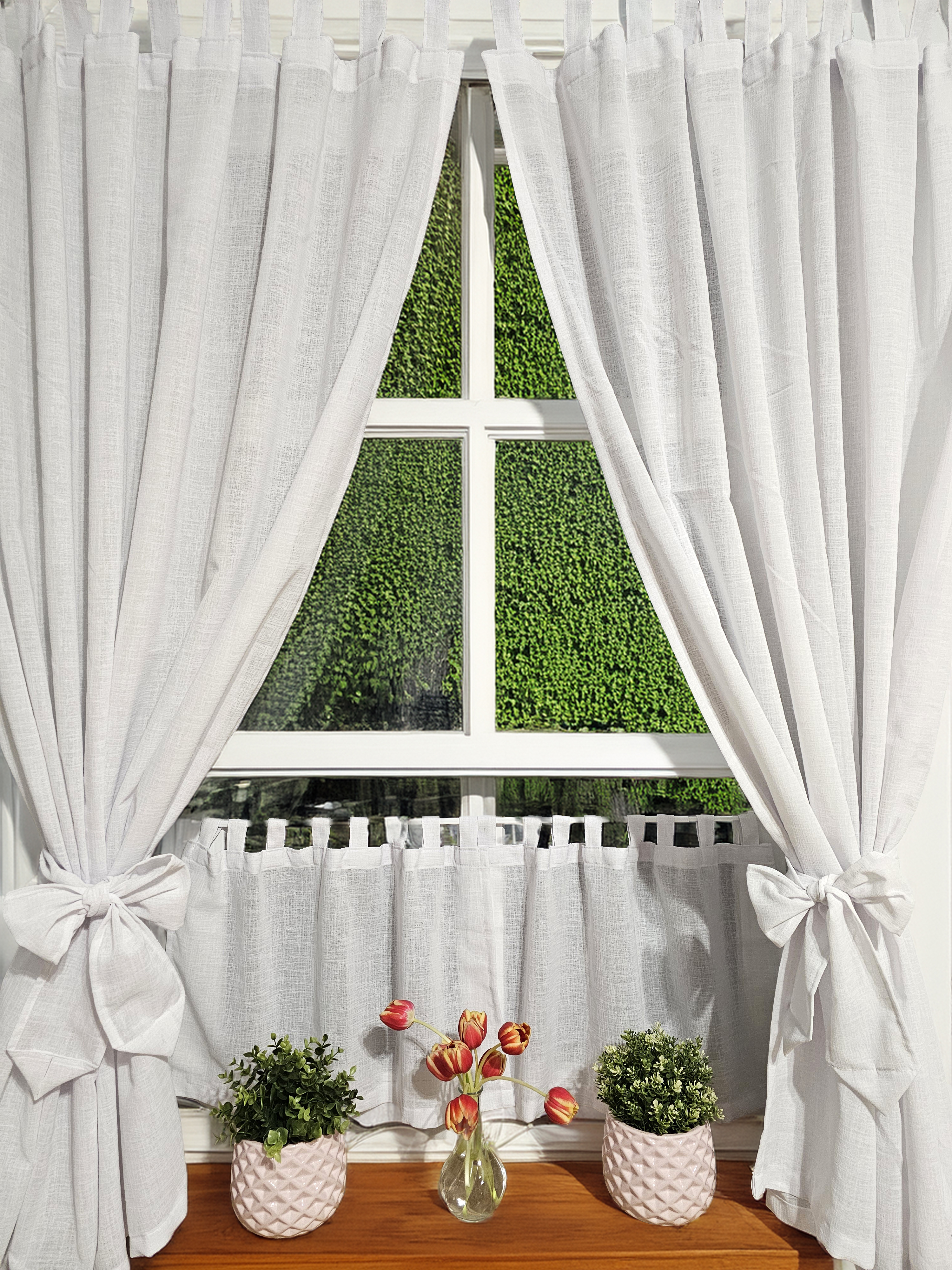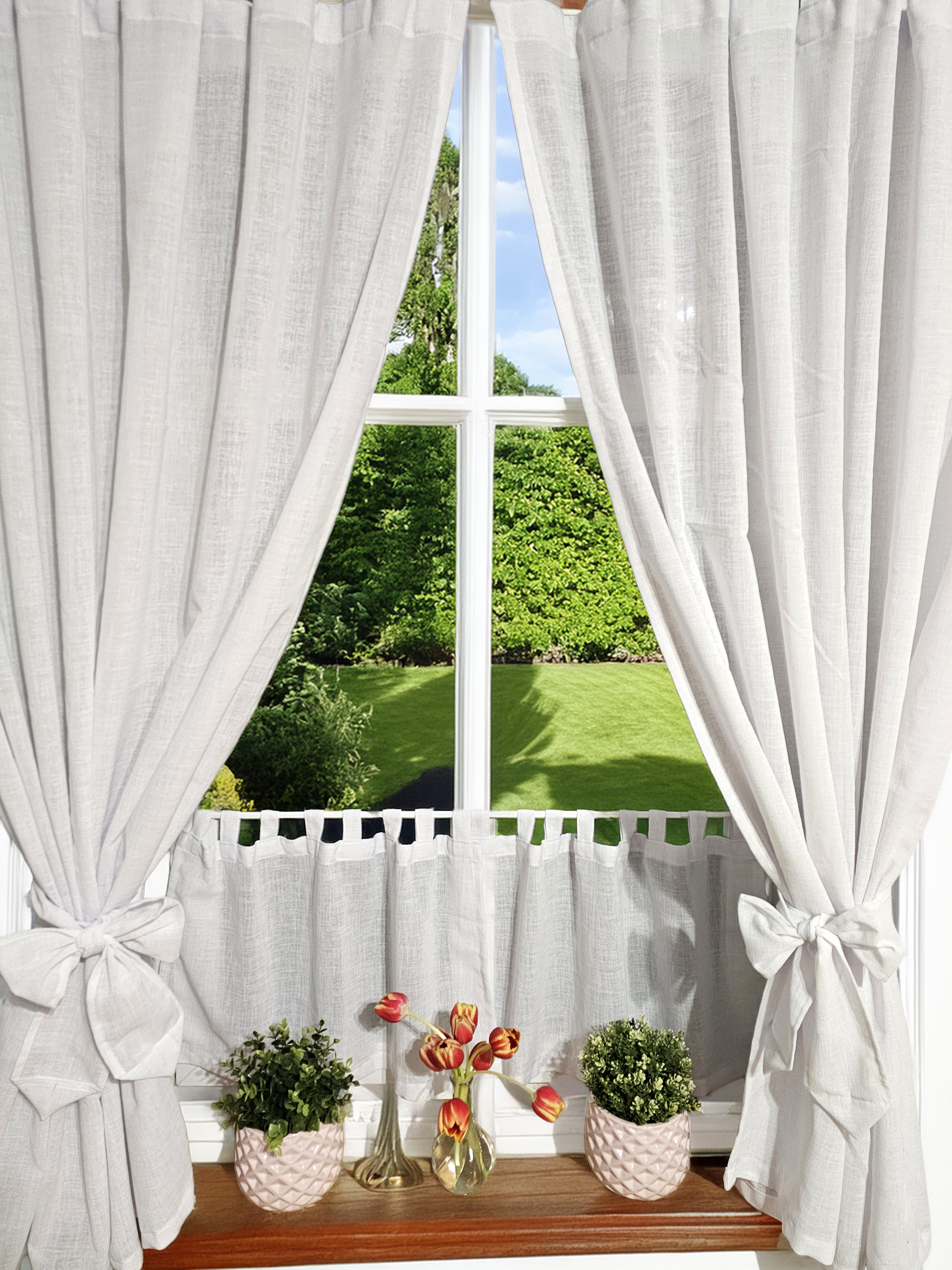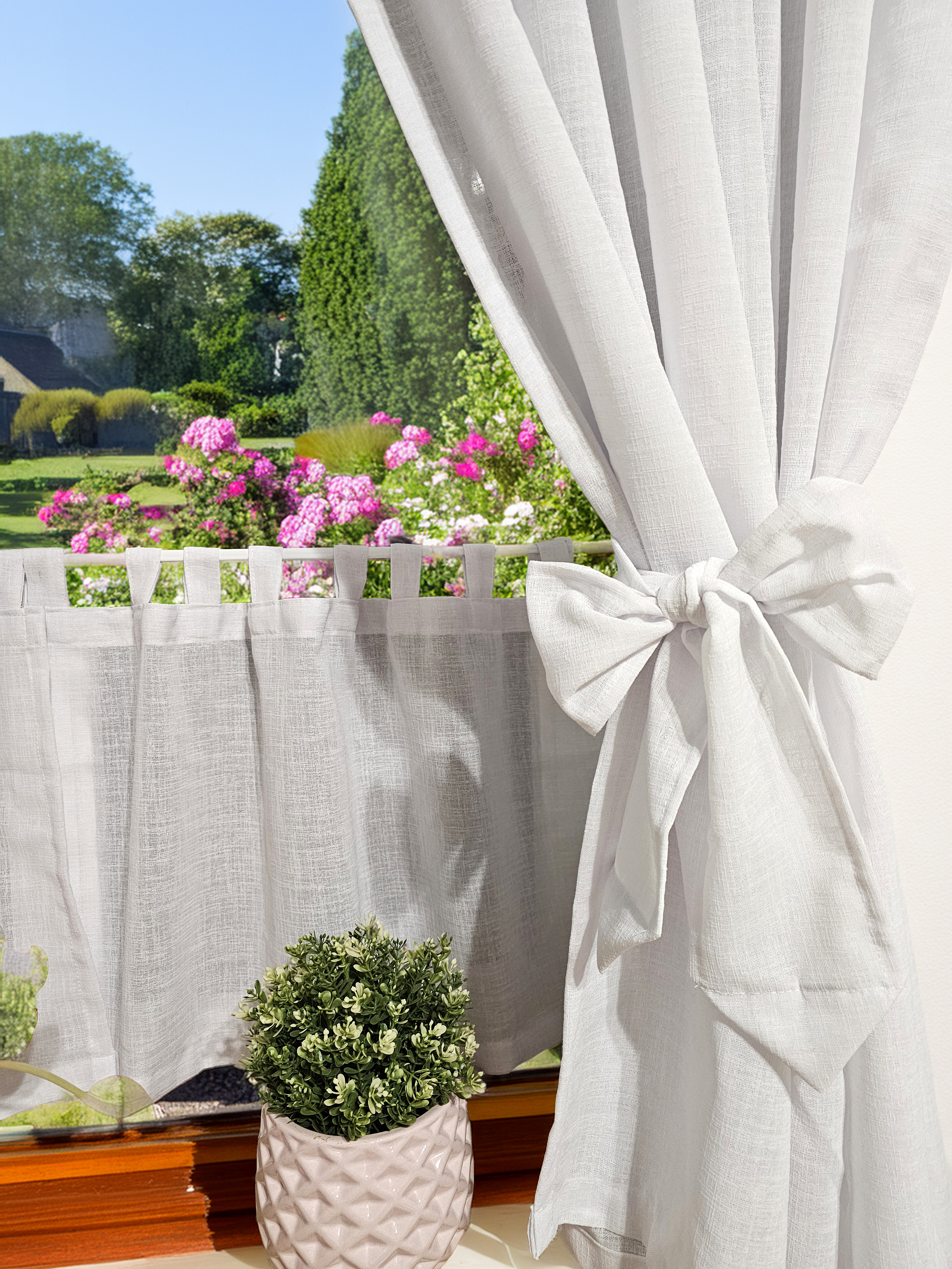 Komplet to dwie zasłonki na boki z wiązaniami oraz zazdrostka.