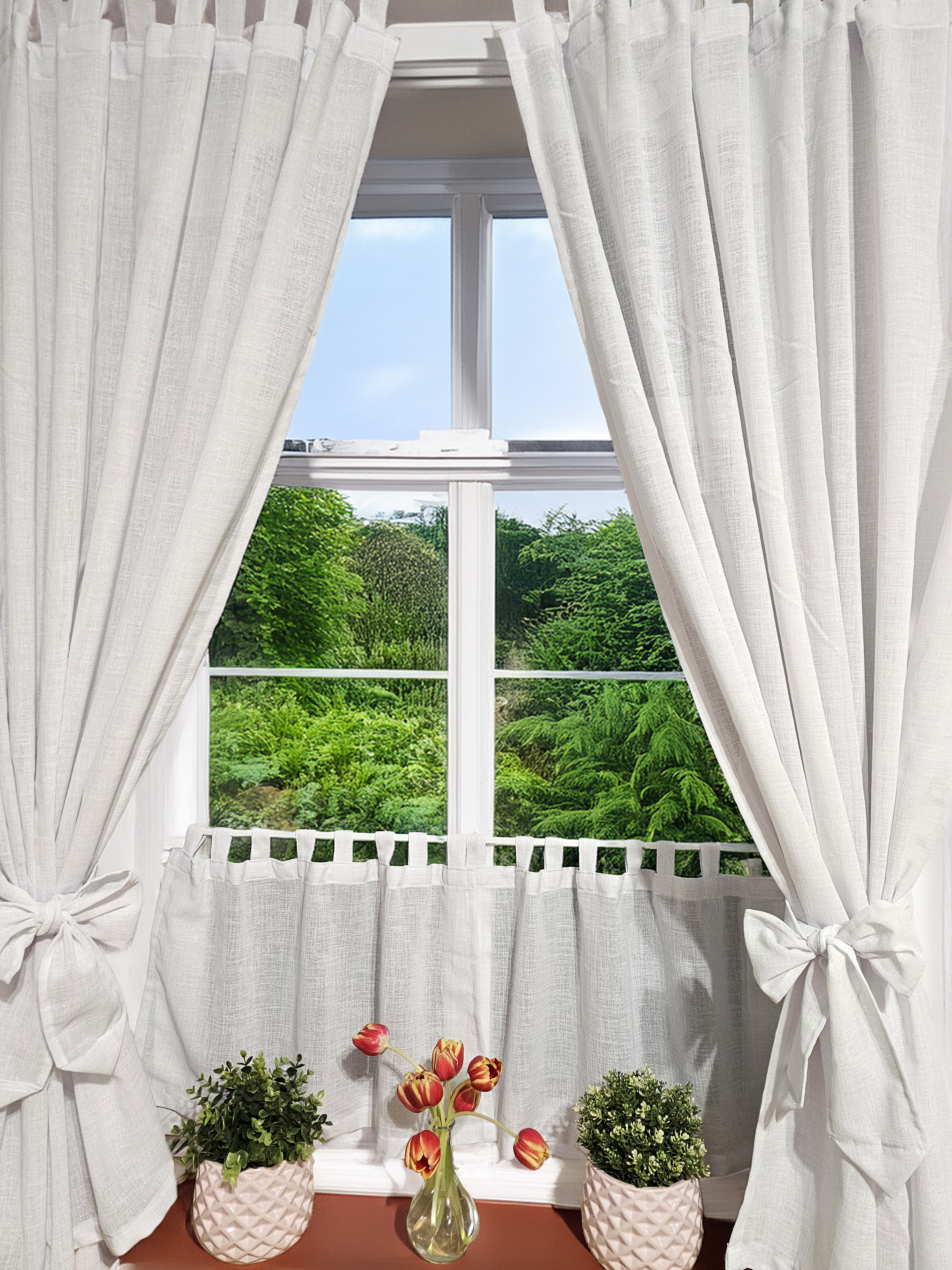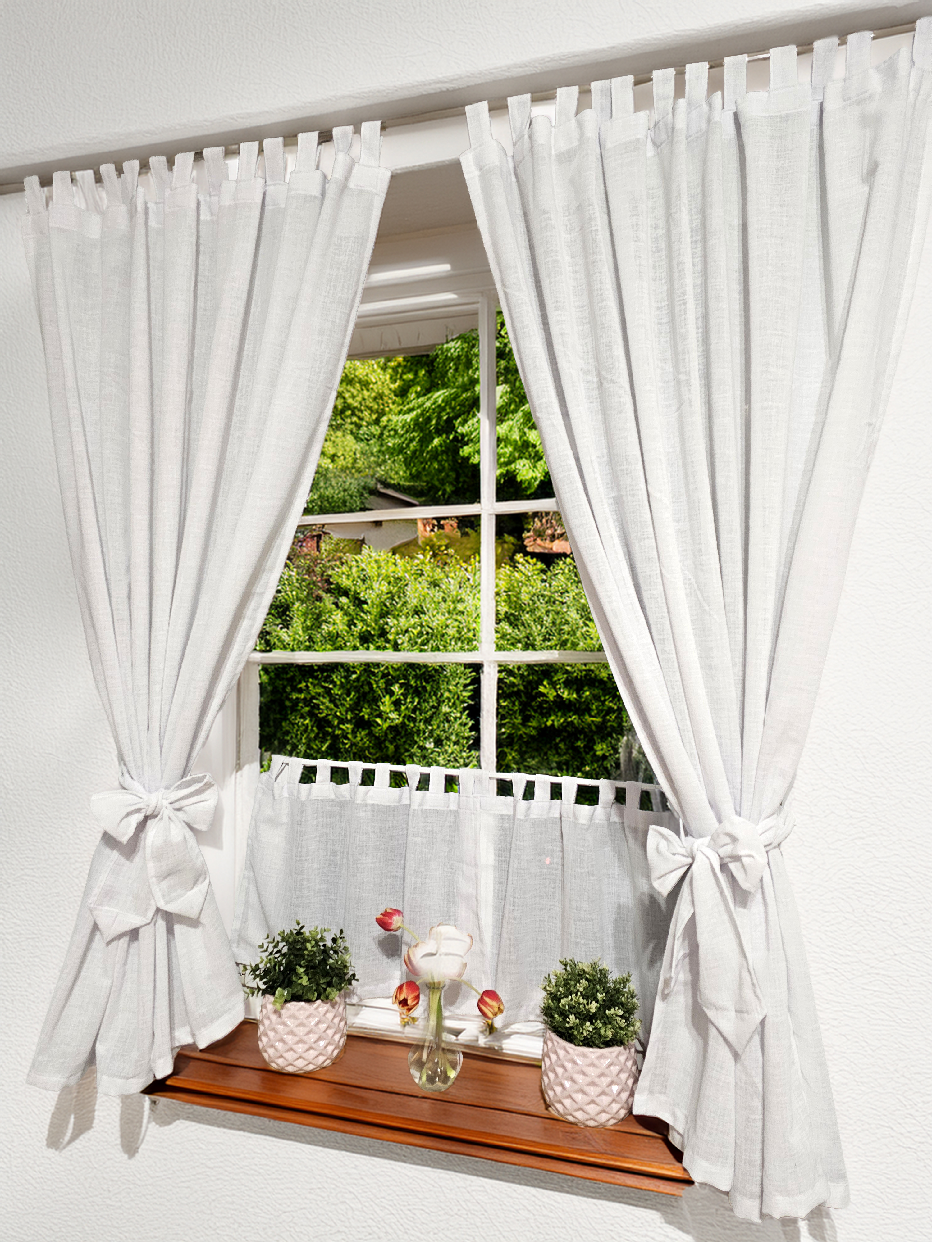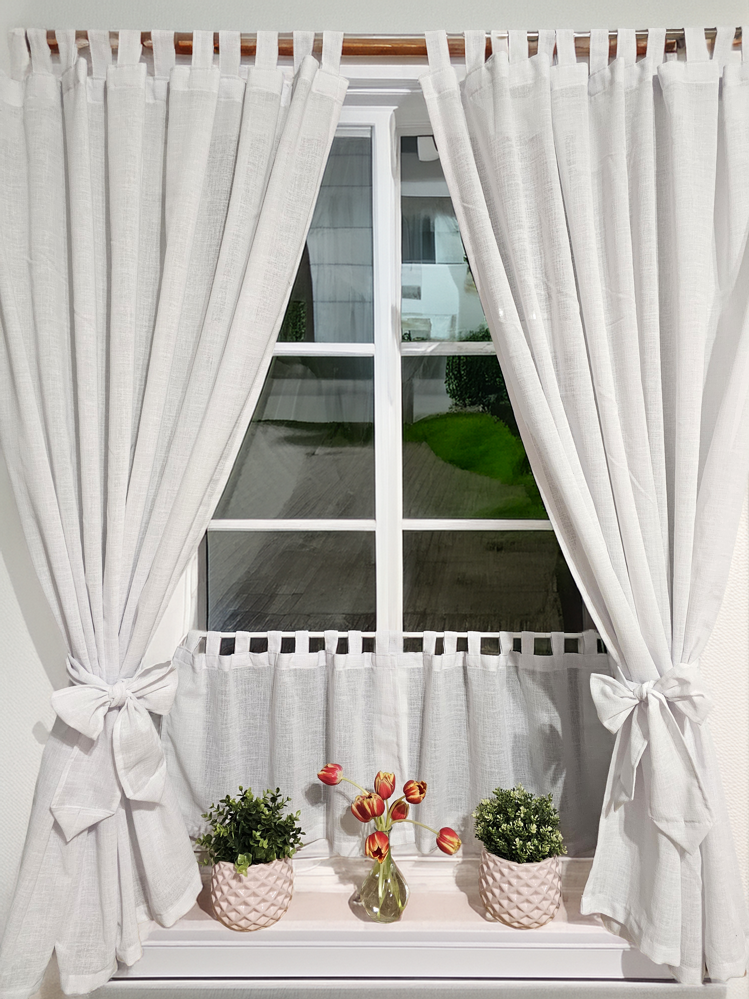 Komplet to dwie zasłonki na boki z wiązaniami oraz zazdrostka.