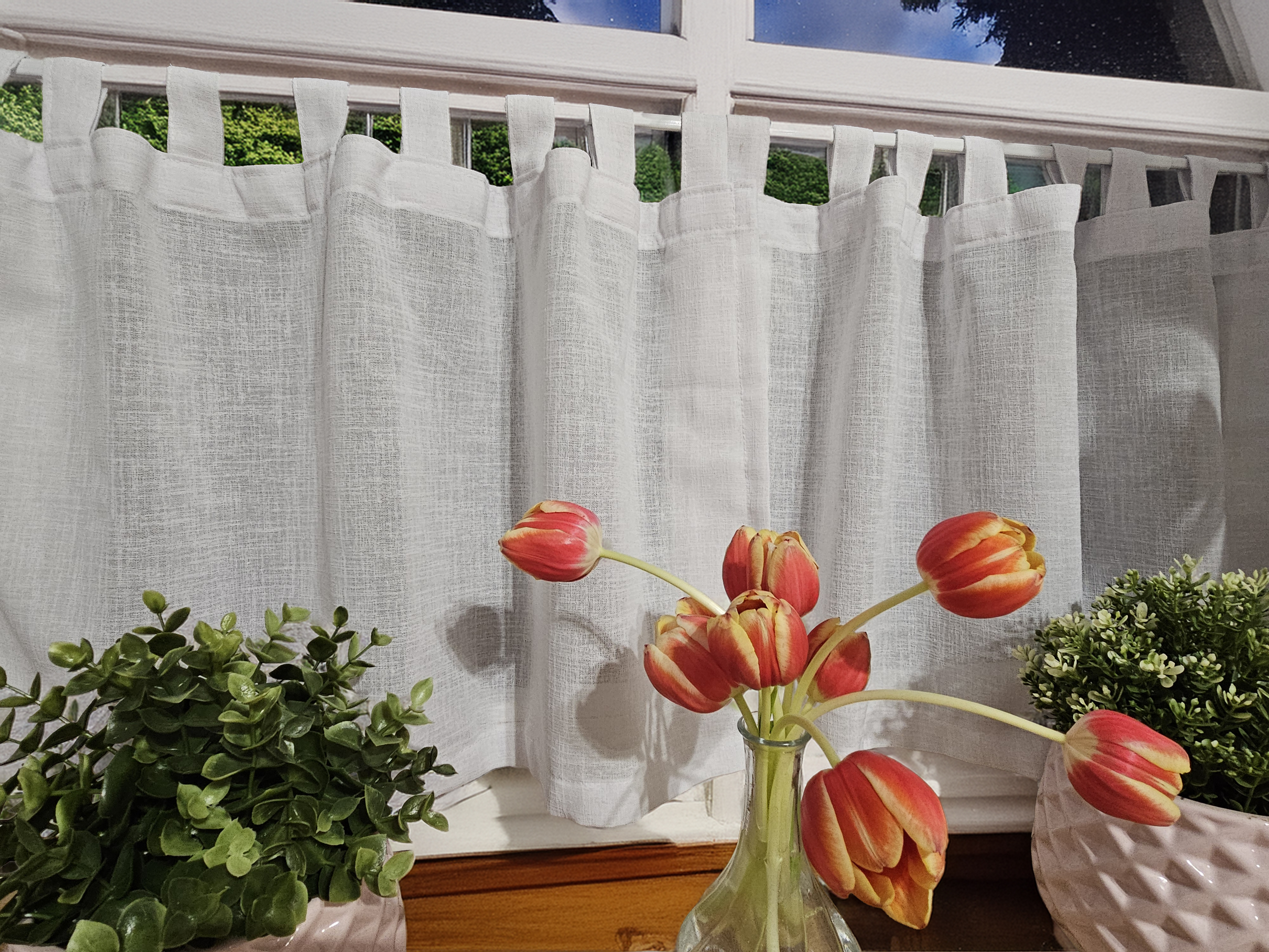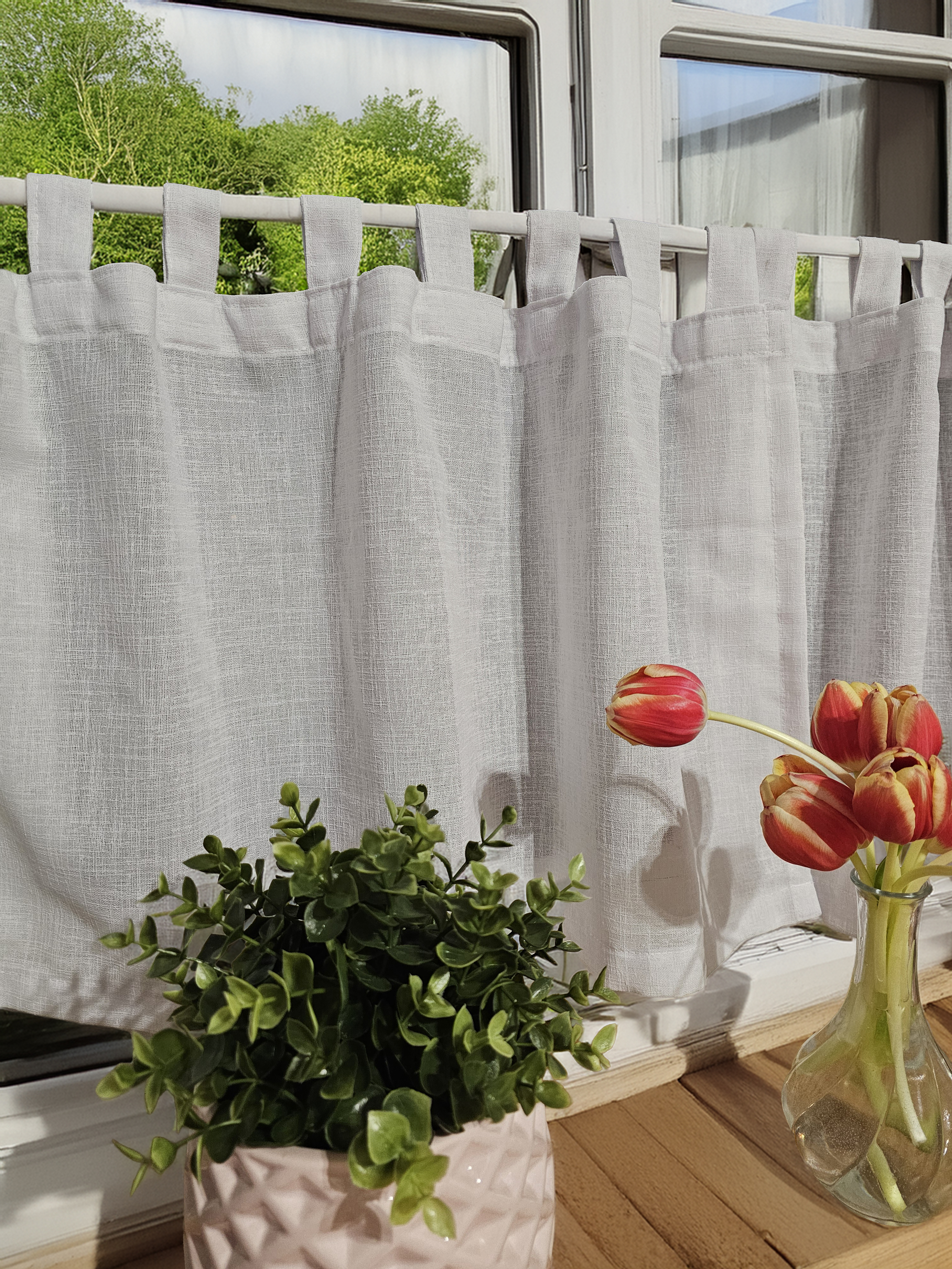 Tkanina bardzo dobrej jakości imitująca len ale bardzo łatwa w prasowaniu. Zawieszenie SZELKI.