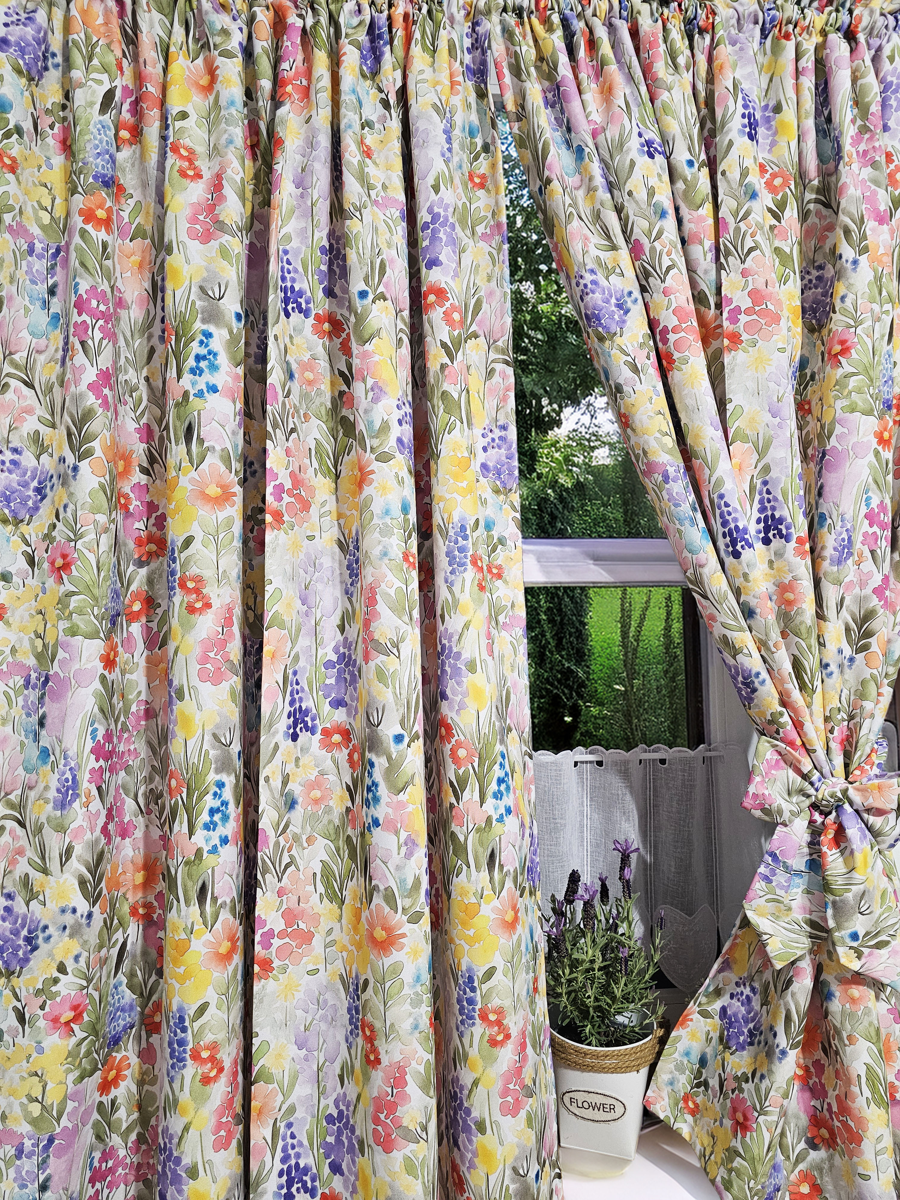 Rozmiar zasłony podajemy na płasko, czyli przed zmarszczeniem. Tkanina jest umarszczona w stosunku 1 : 2 co oznacza, że szerokość 140 cm po zmarszczeniu będzie wynosiła